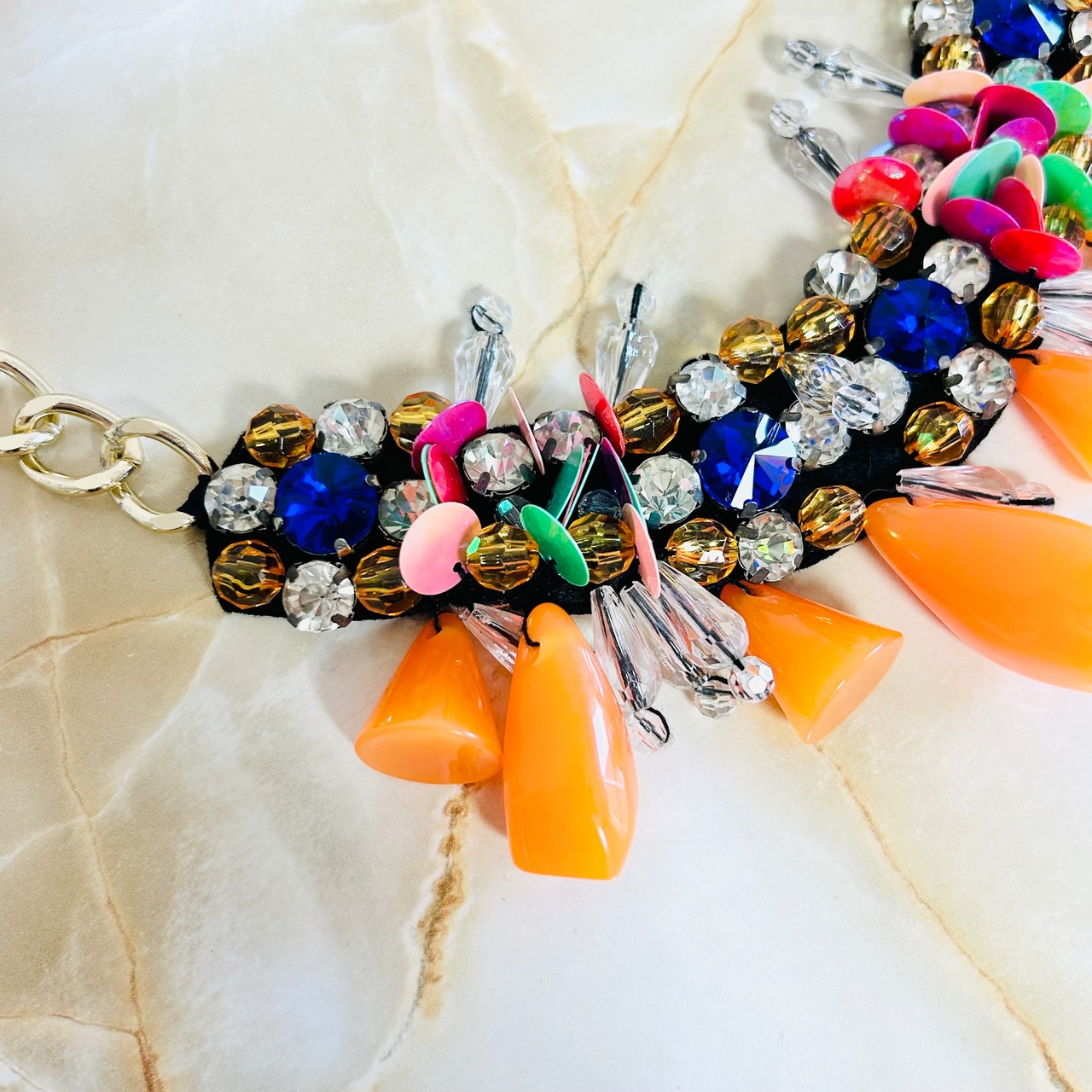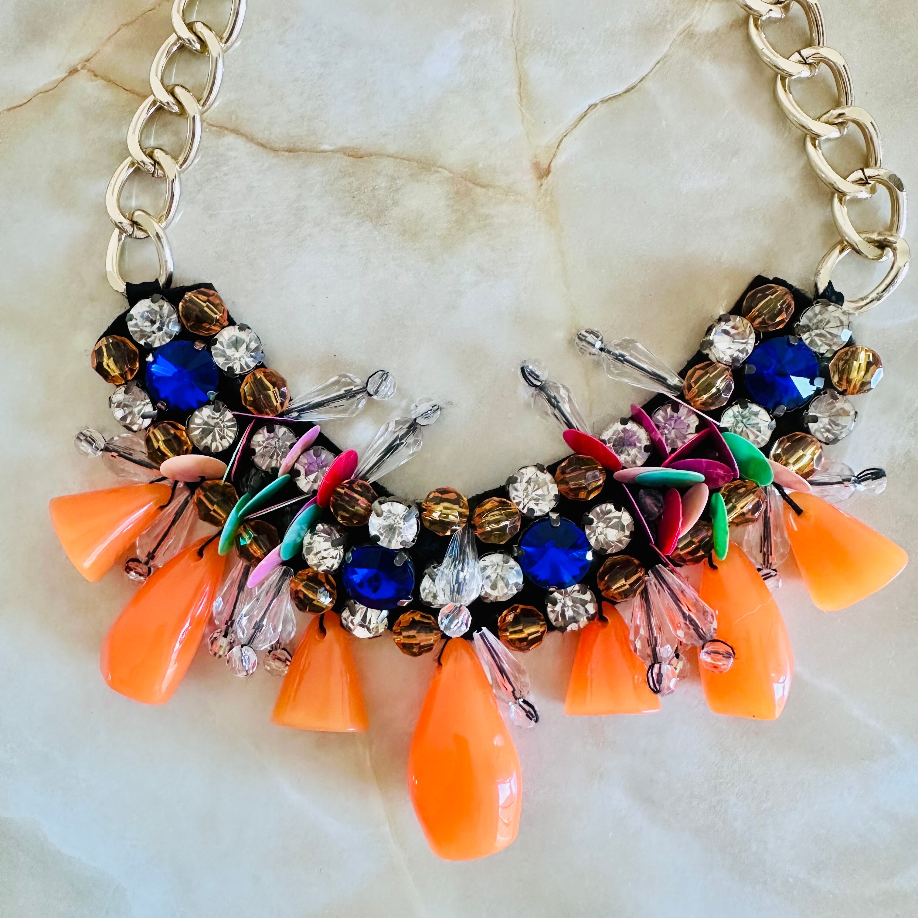 様々なカラーのラインストーンとオレンジやクリアのアクリルパーツを組み合わせたデザインです。
