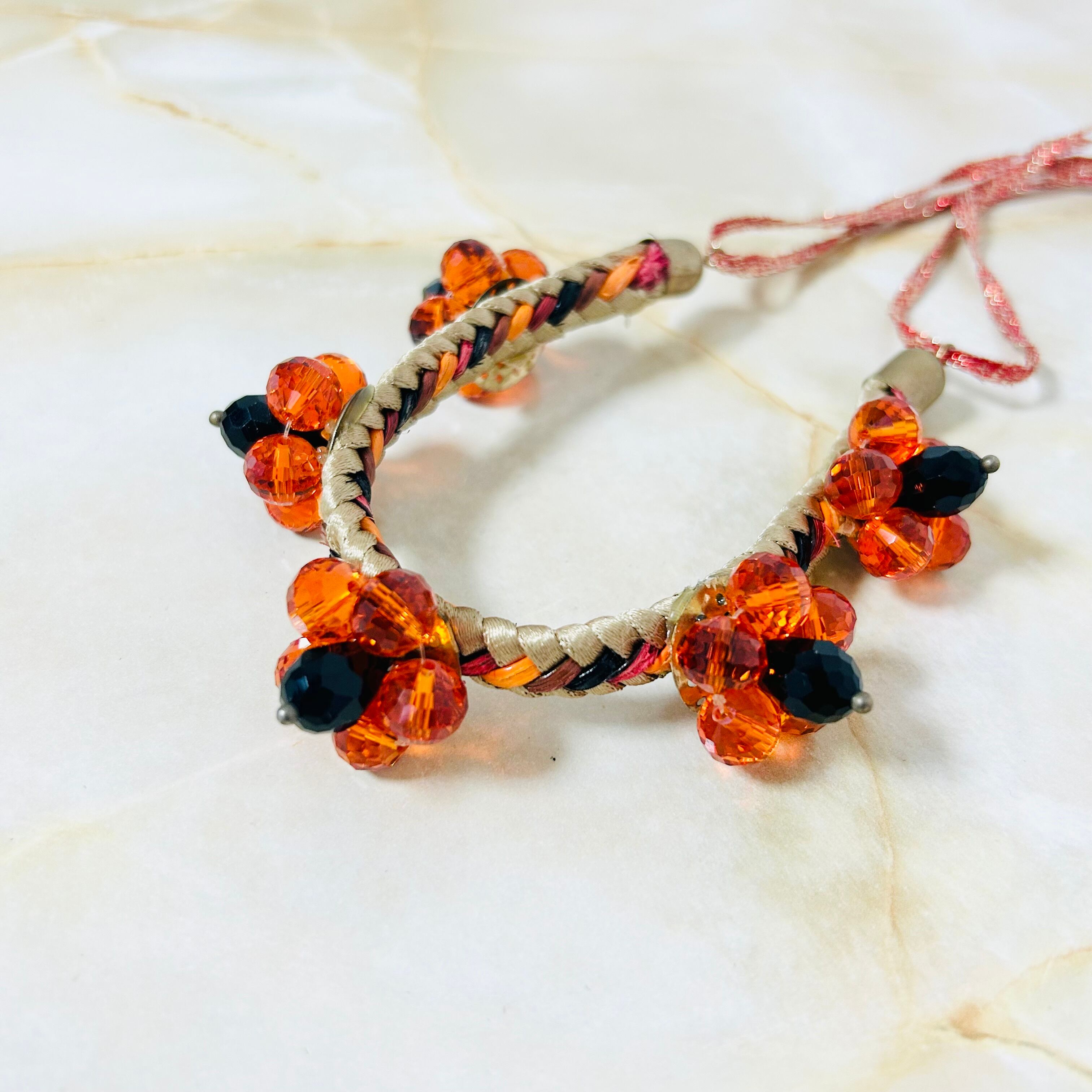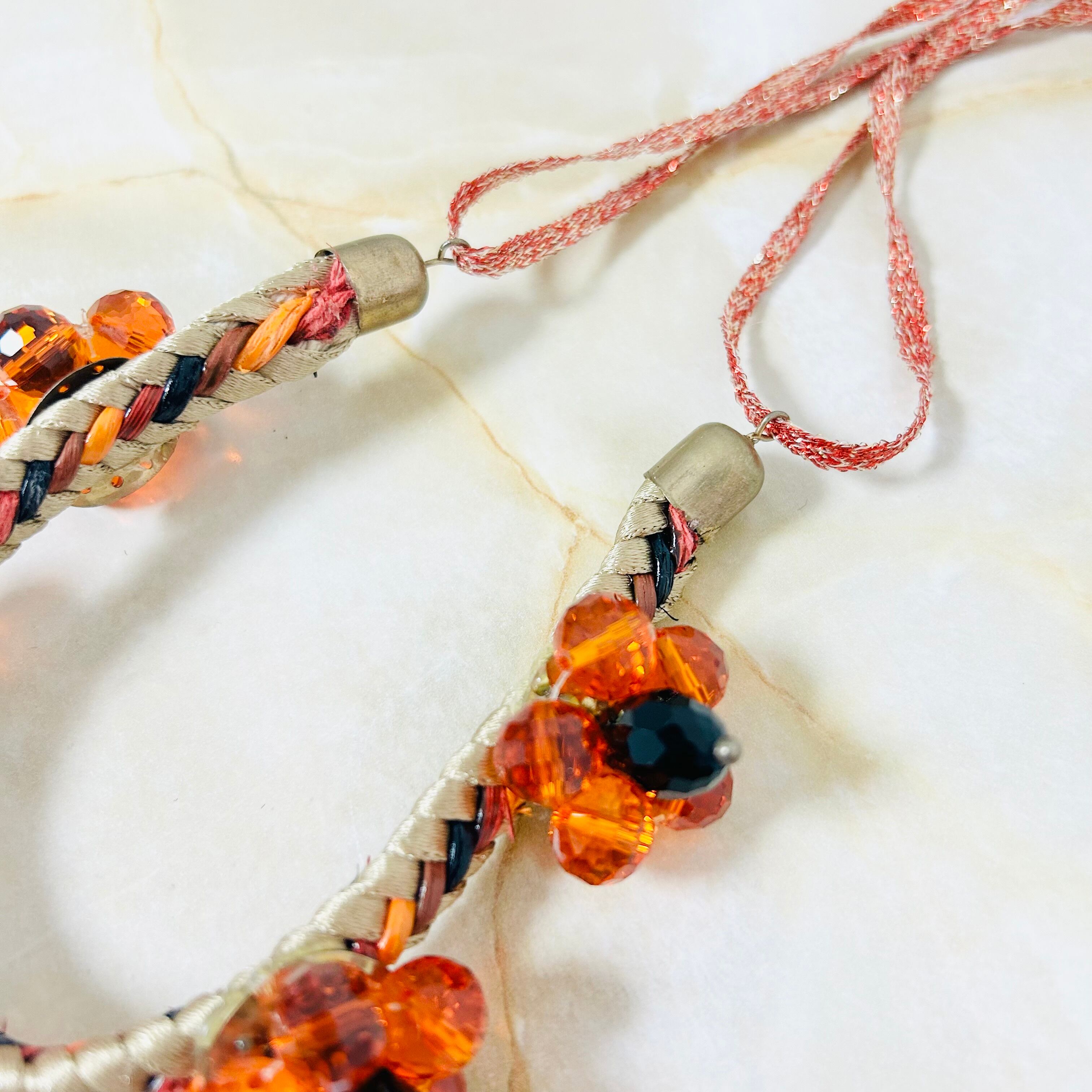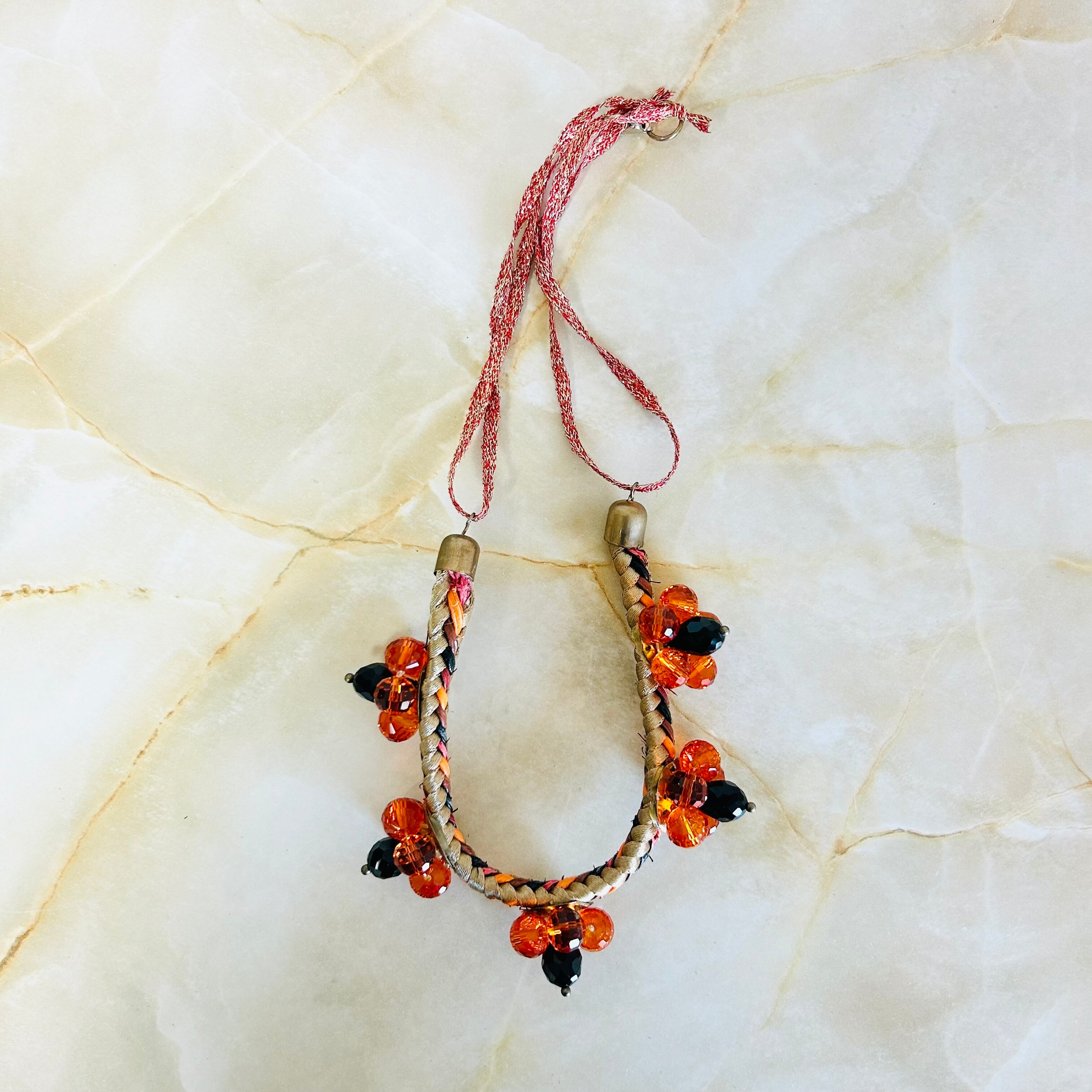 オレンジとブラックのクリスタルビーズを使用したフラワーモチーフと、編み込みのコードを組み合わせたデザインです。