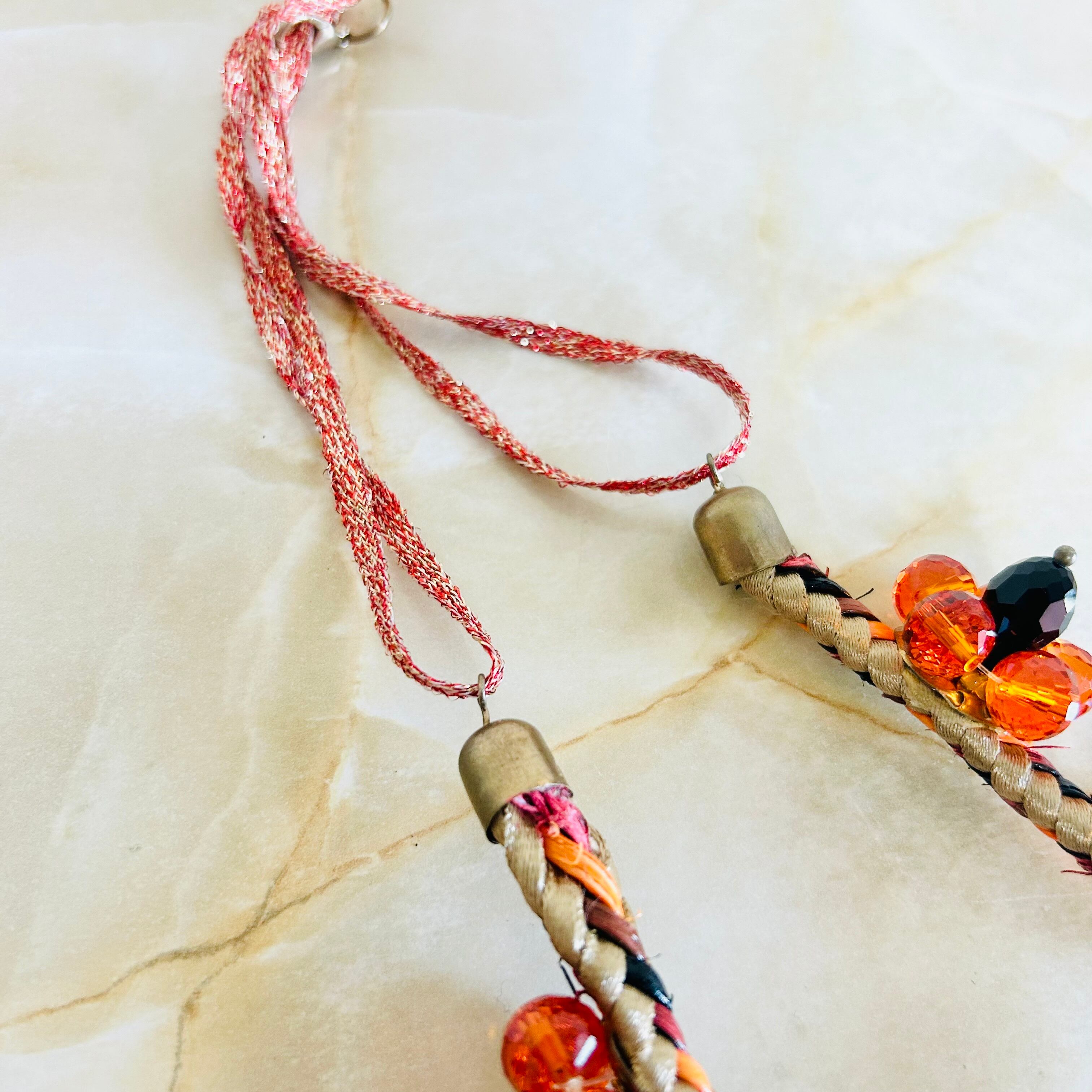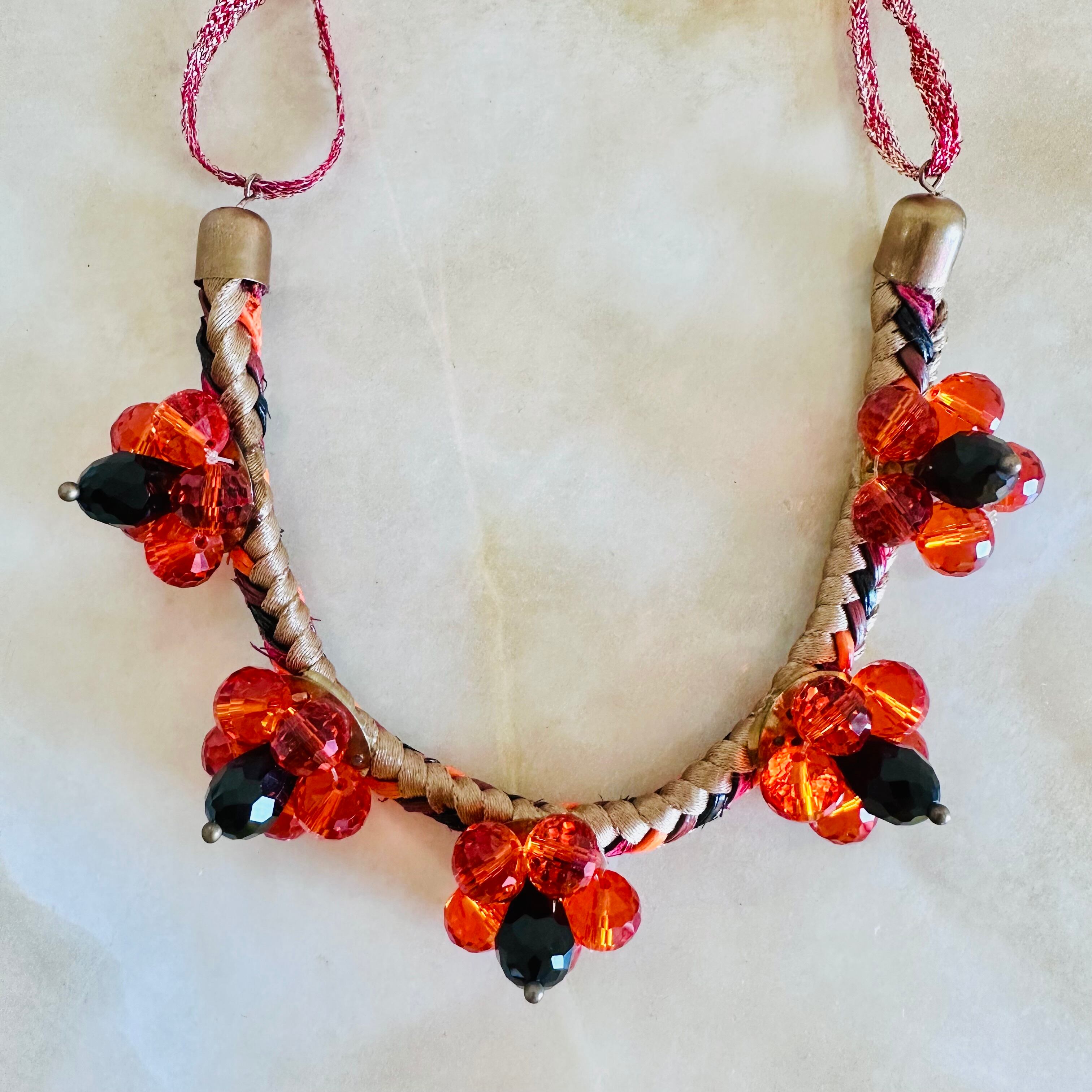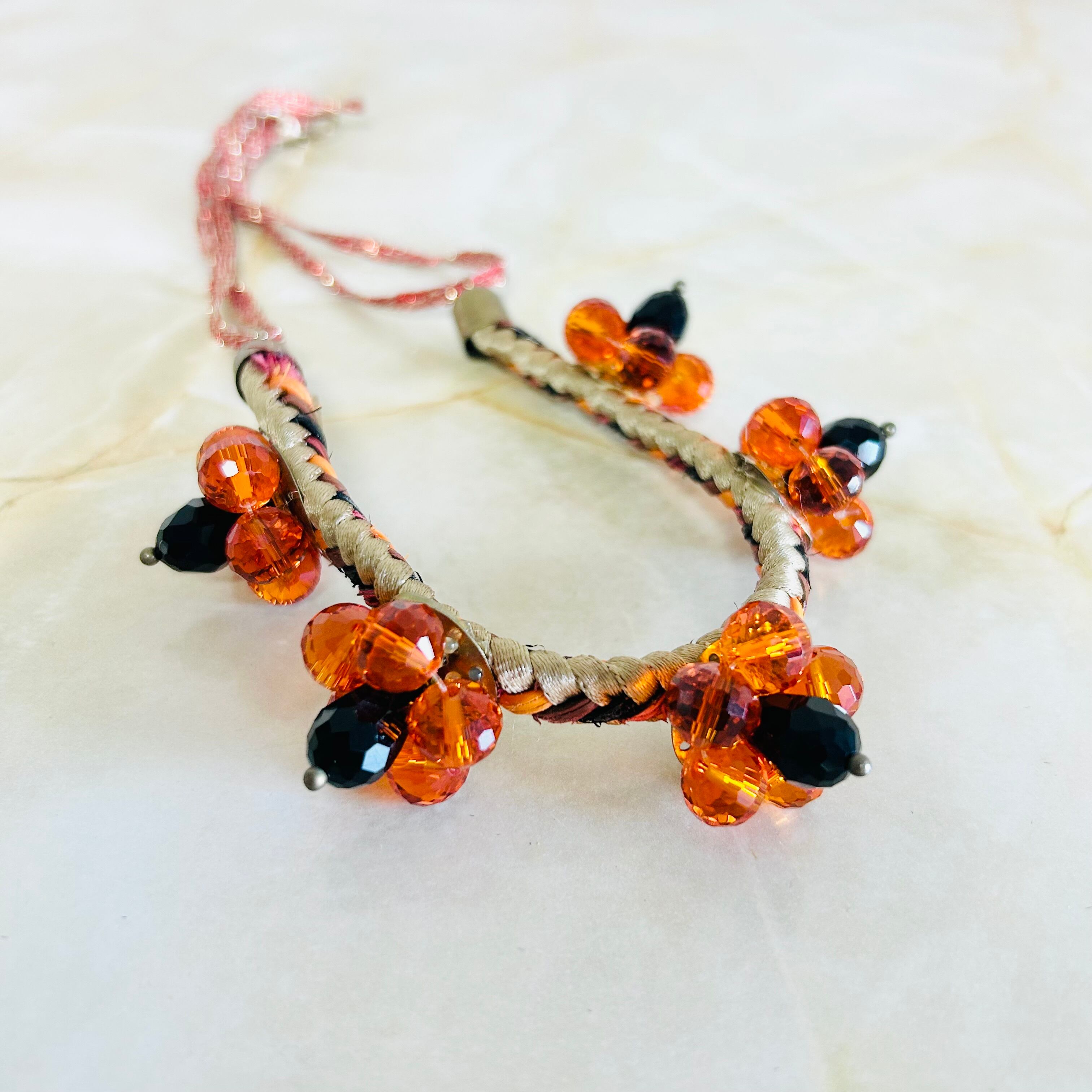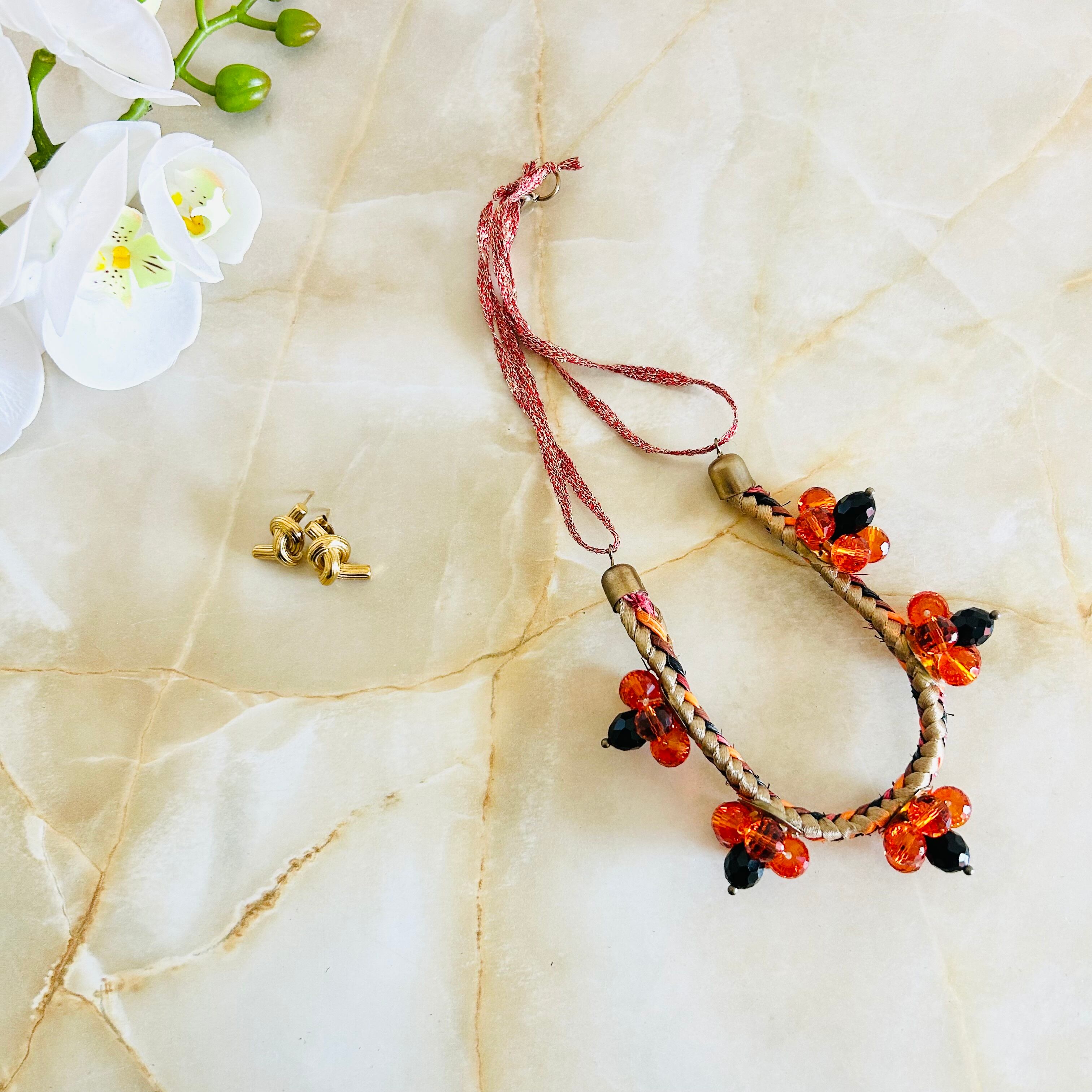 オレンジとブラックのクリスタルビーズを使用したフラワーモチーフと、編み込みのコードを組み合わせたデザインです。