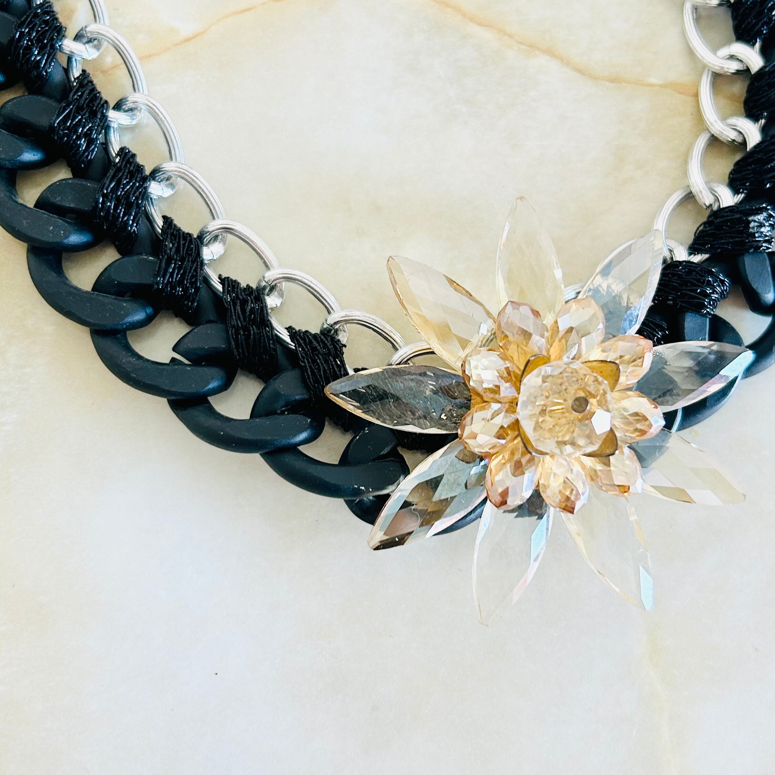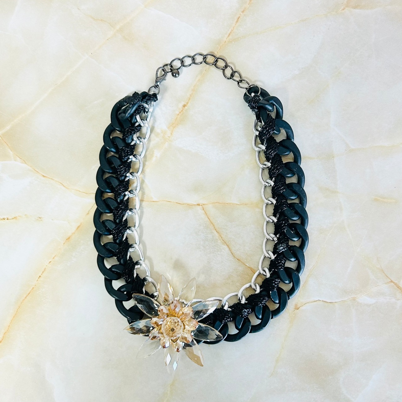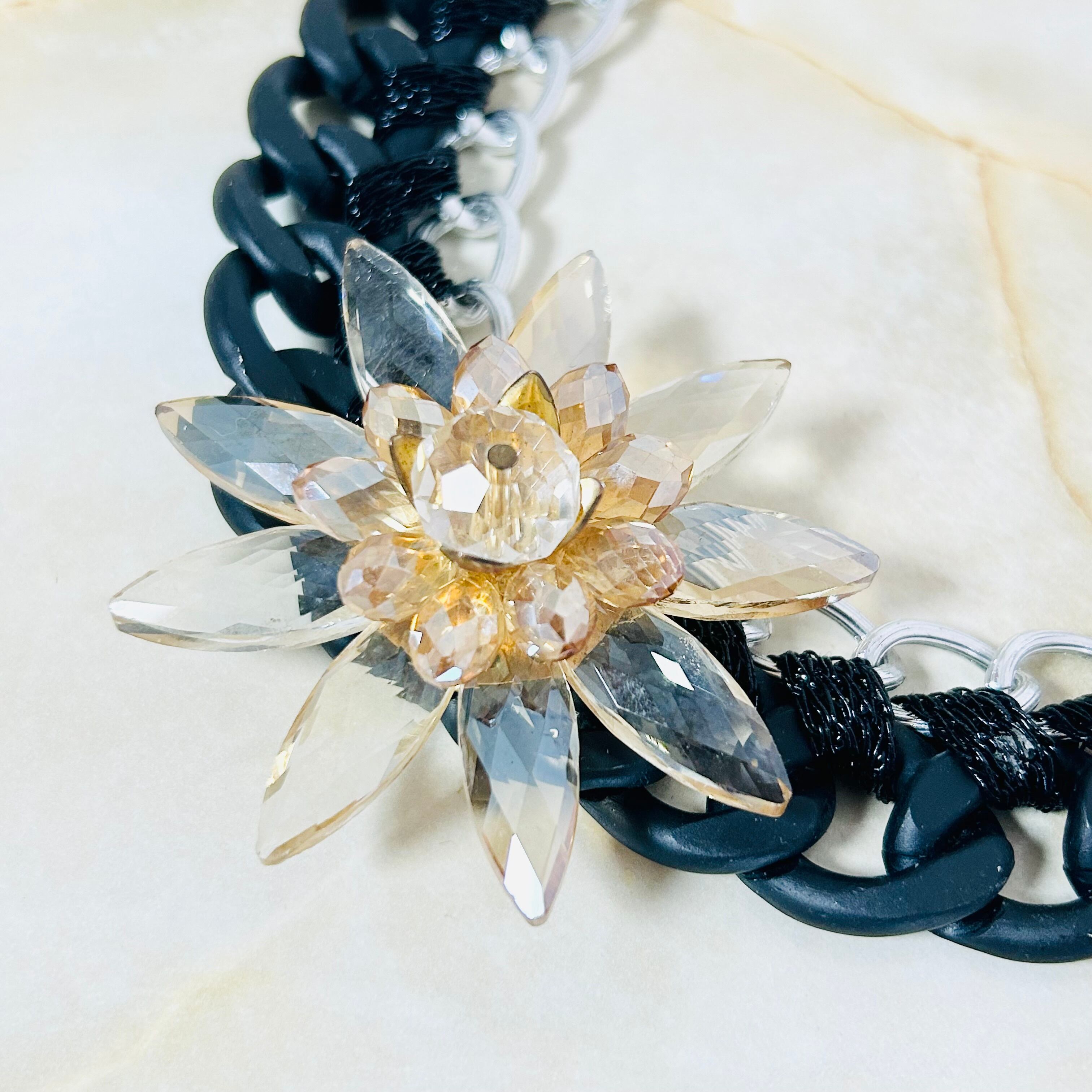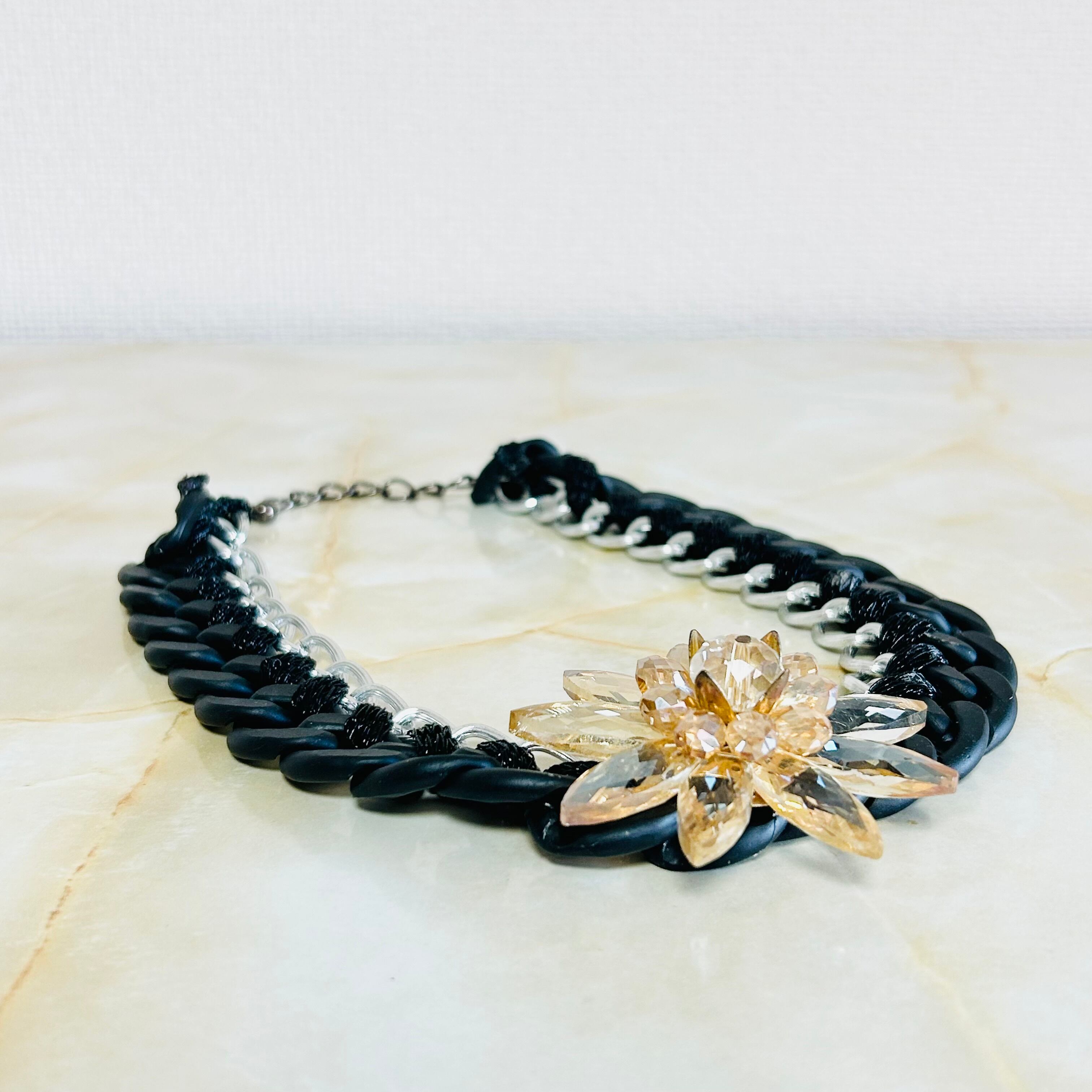 太めのチャンキーチェーンにクリスタルパーツで作られたフラワーモチーフを組み合わせた華やかなデザインです。