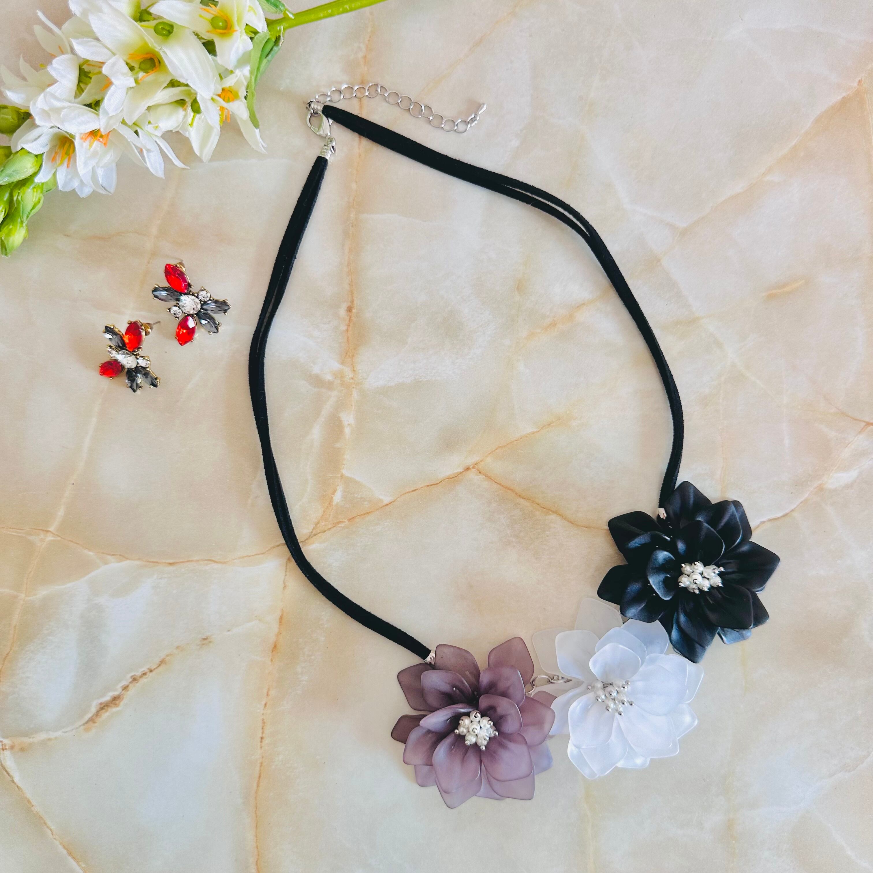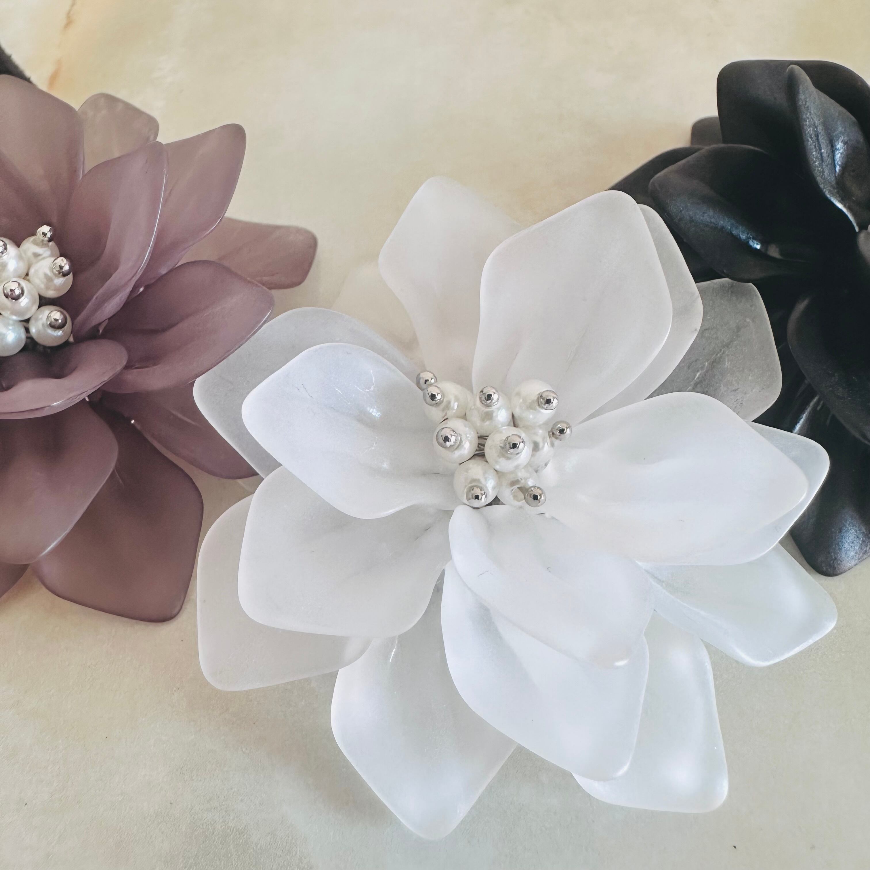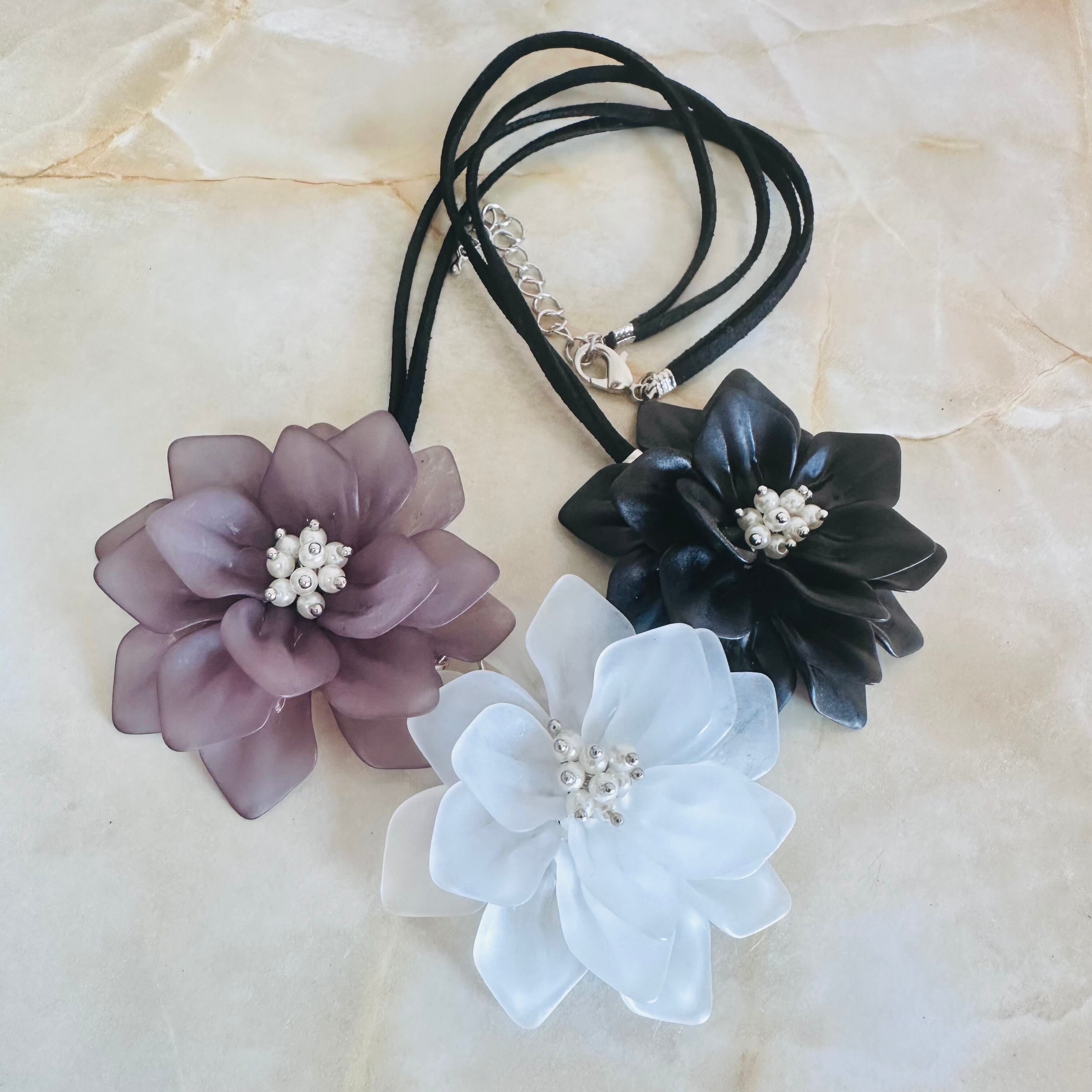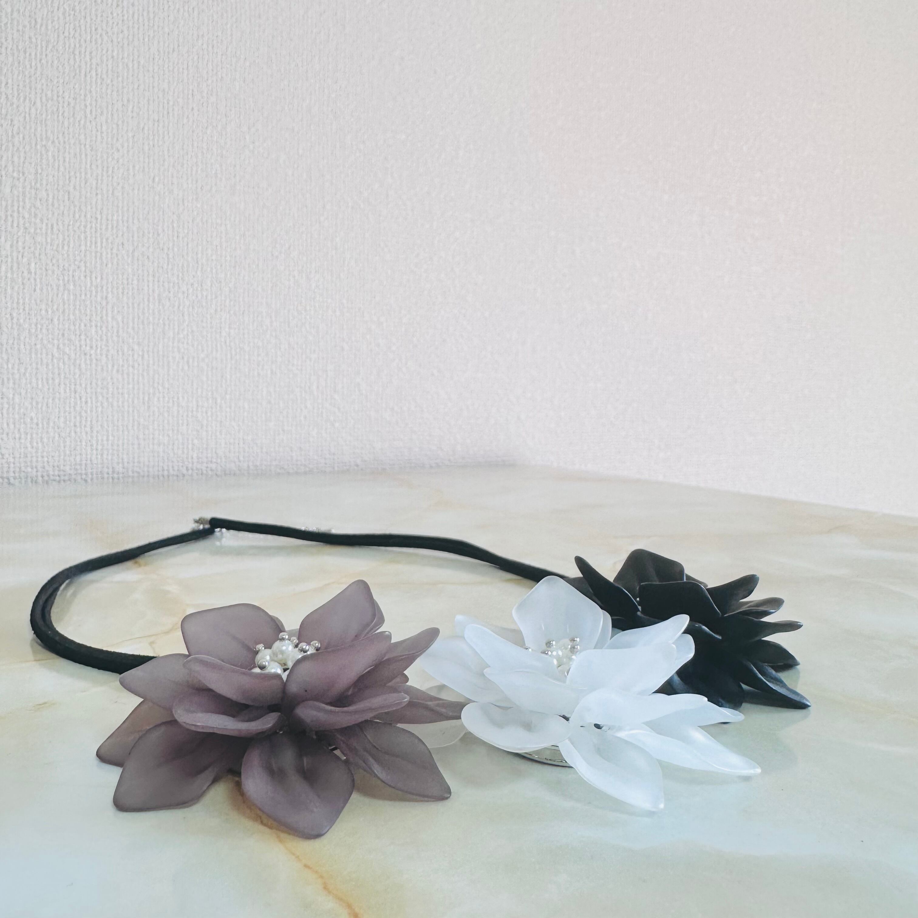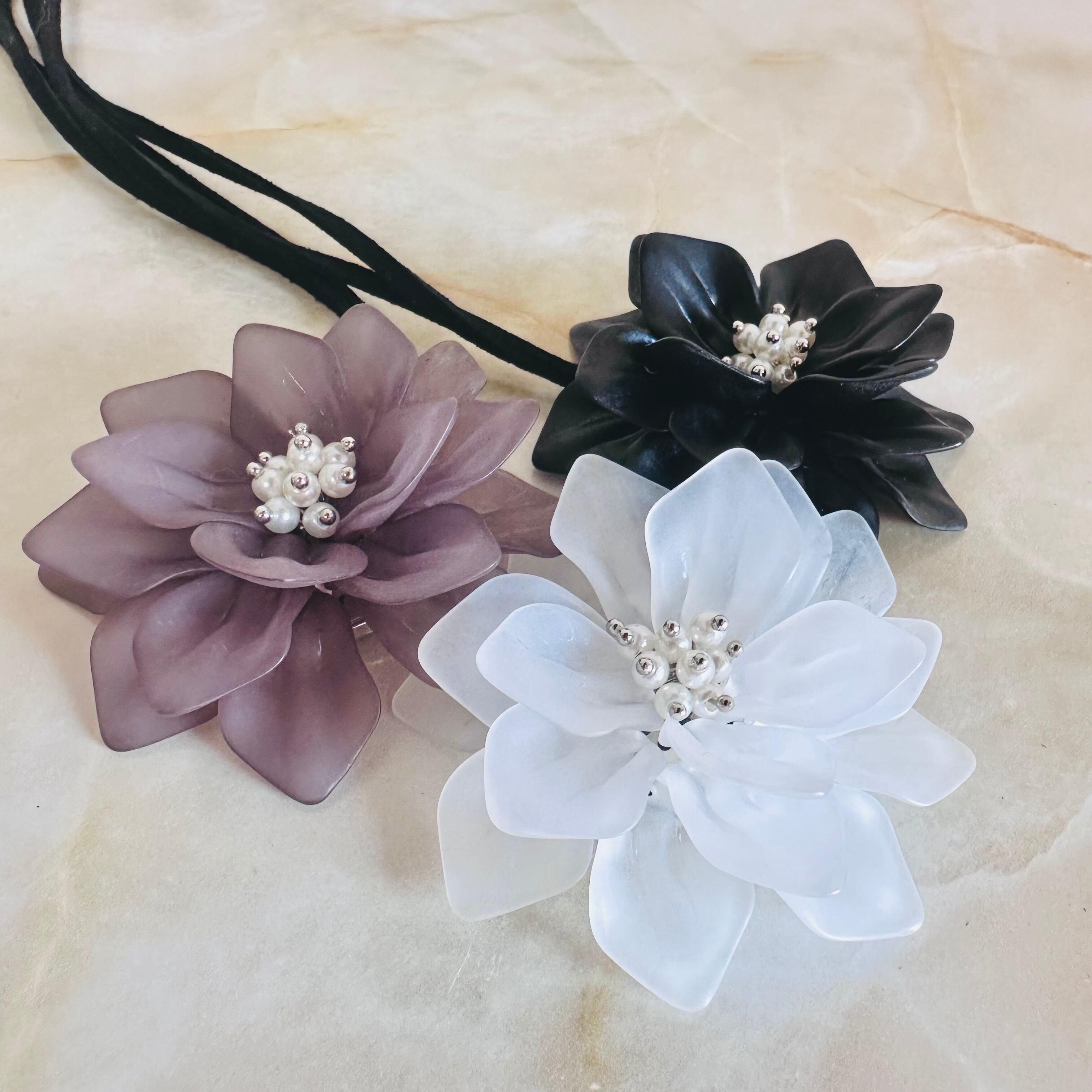 半透明の樹脂素材とパールを使用した3色のフラワーモチーに、スウェードコードを組み合わせたデザインです。