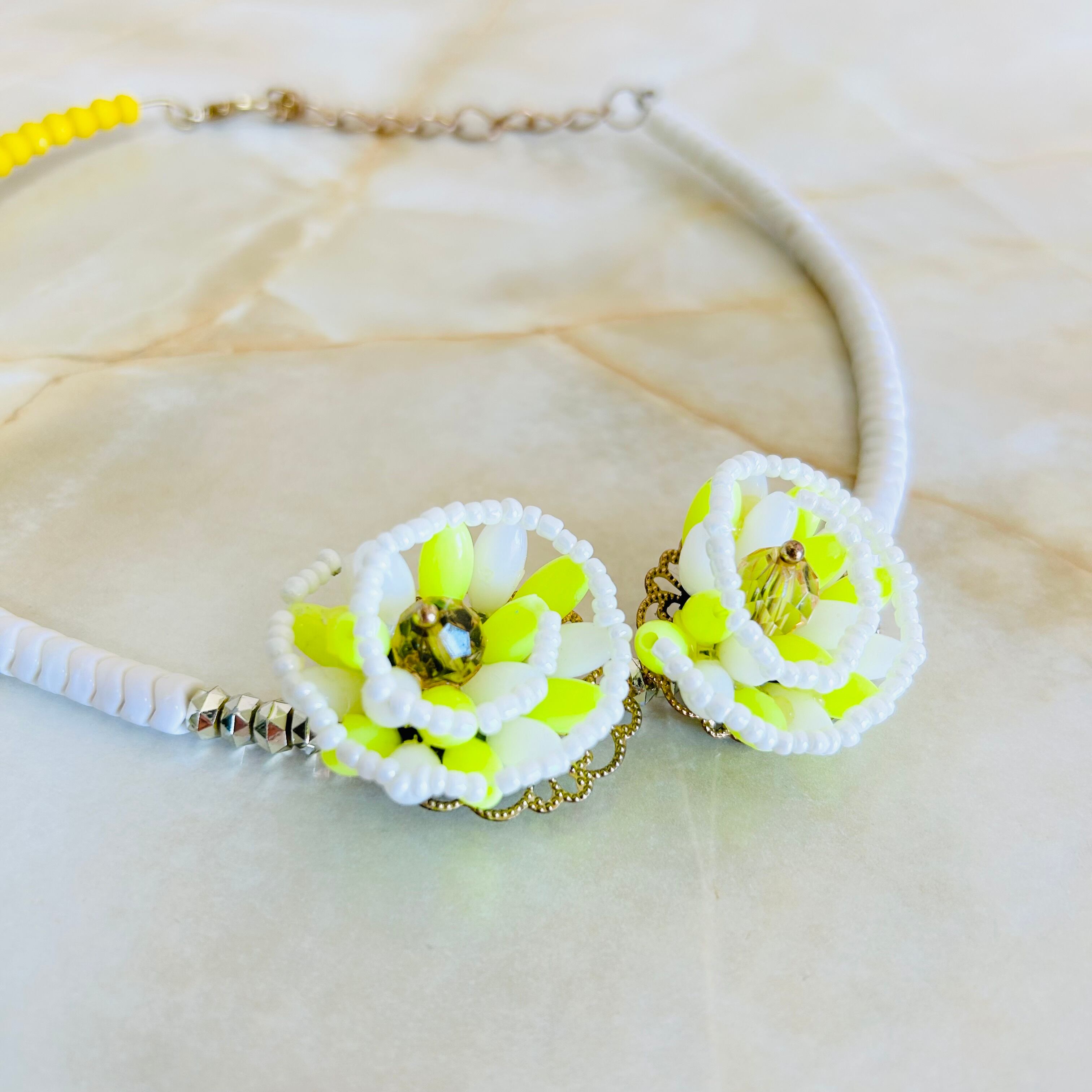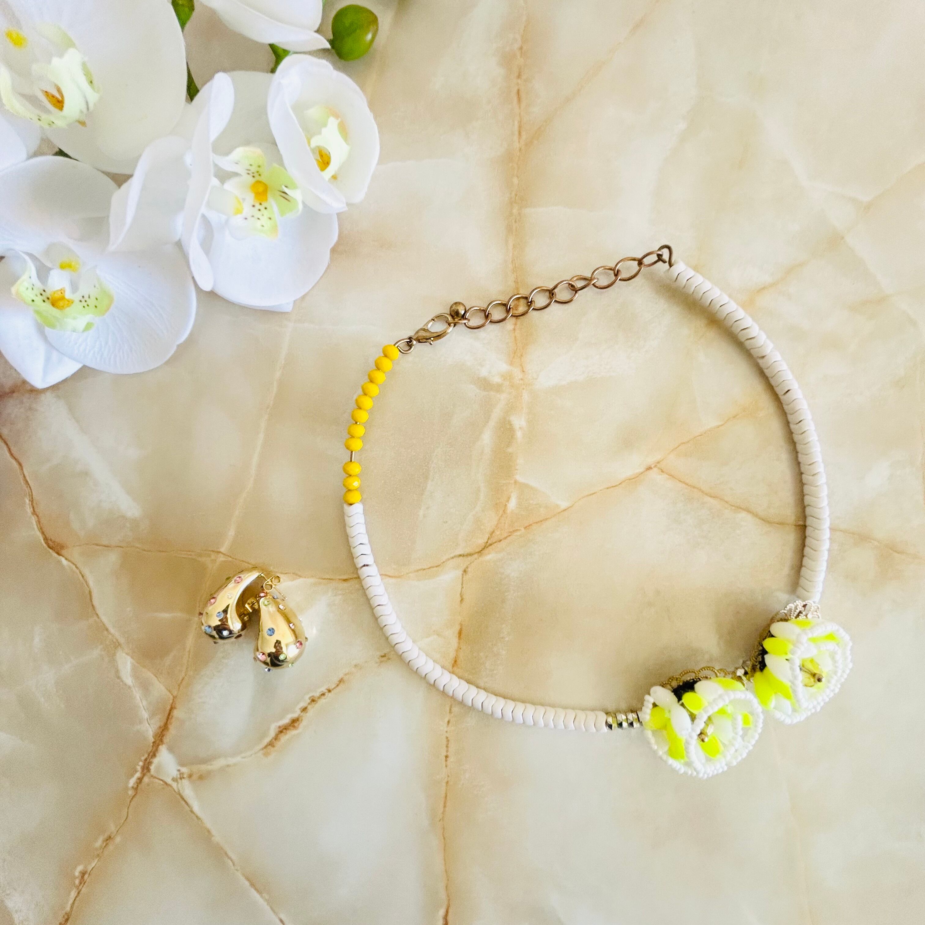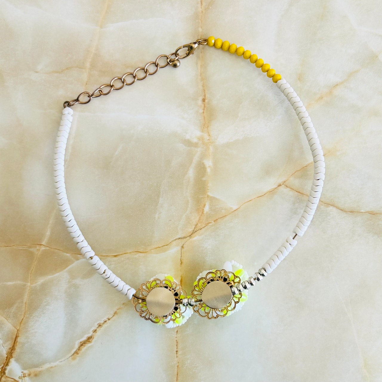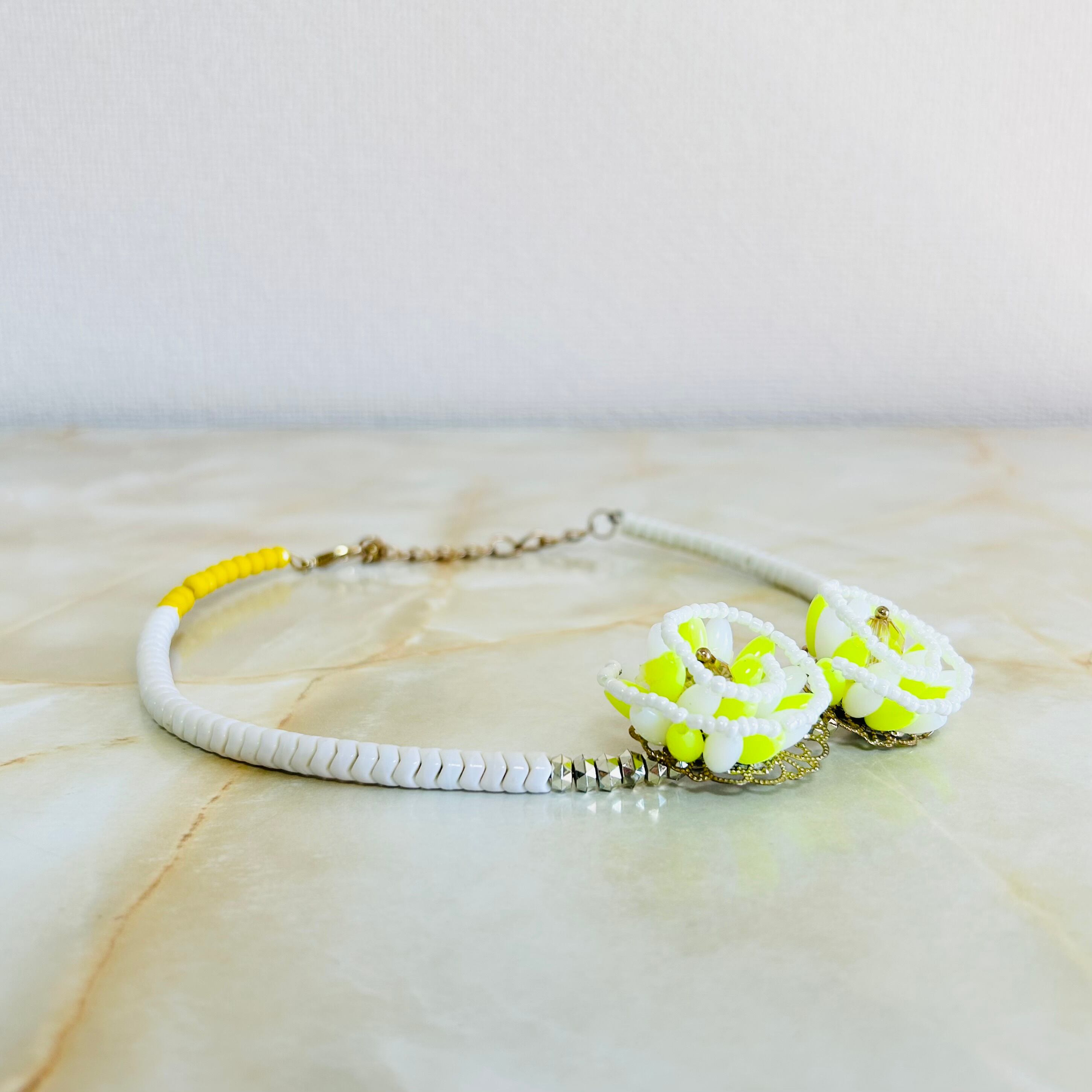 レモンイエロー、ホワイトカラー✖️アンティークゴールドカラーのネックレスです。