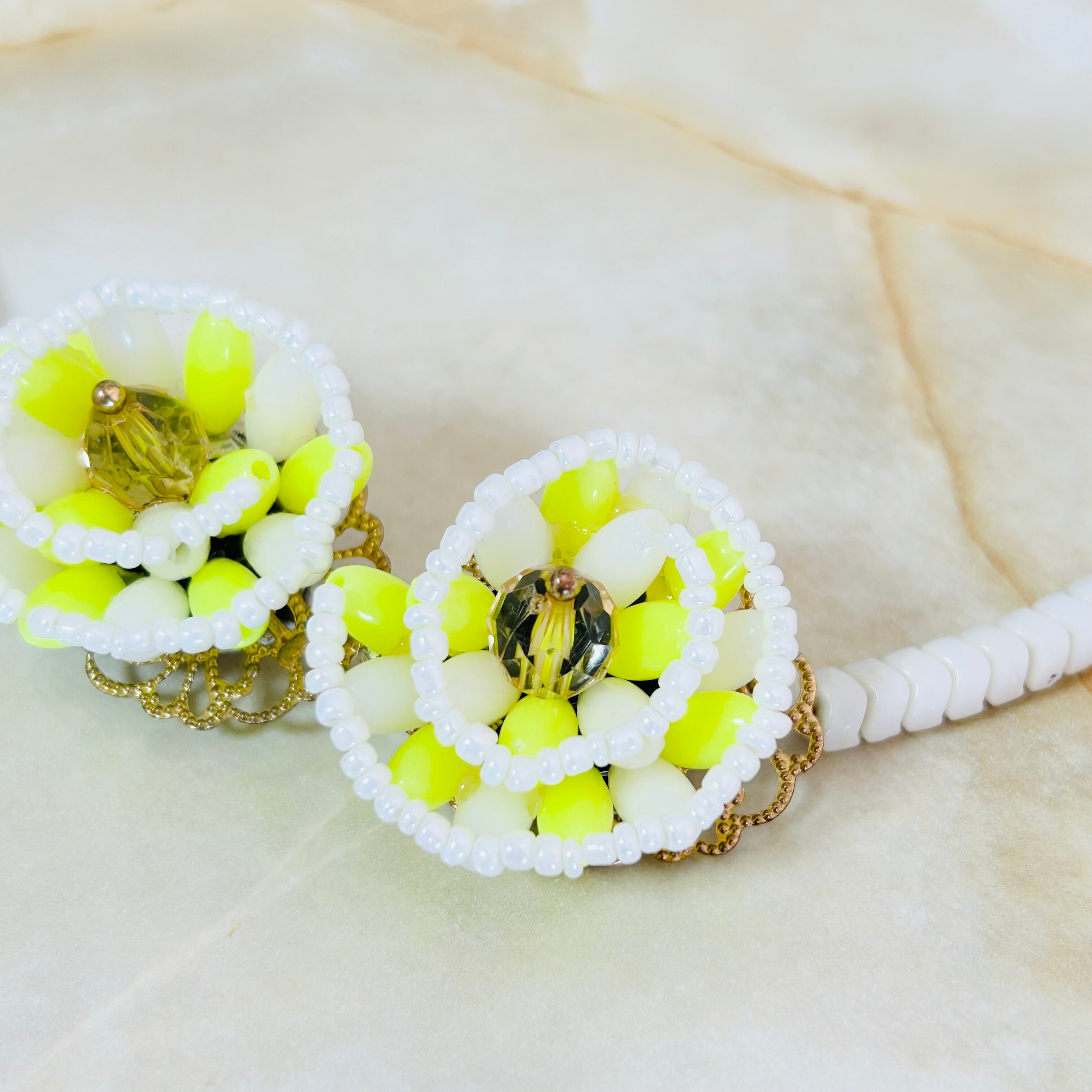 ワイヤーに白のビーズを通し、ユニークなフラワーモチーフを取り付けたデザインです。