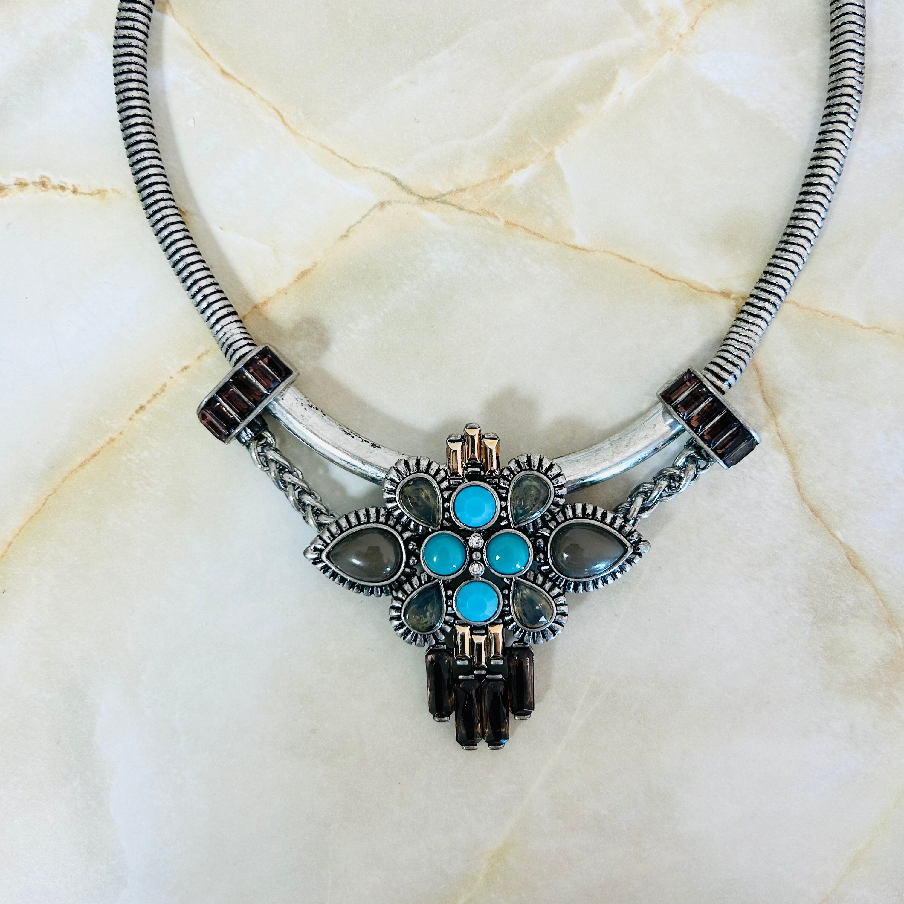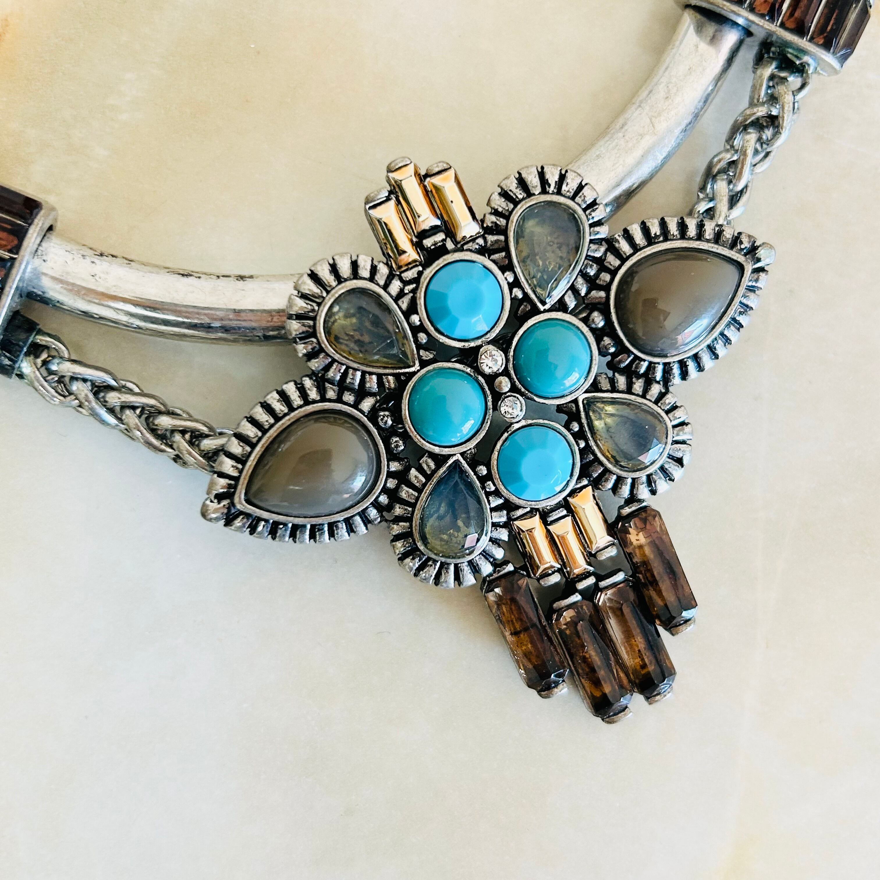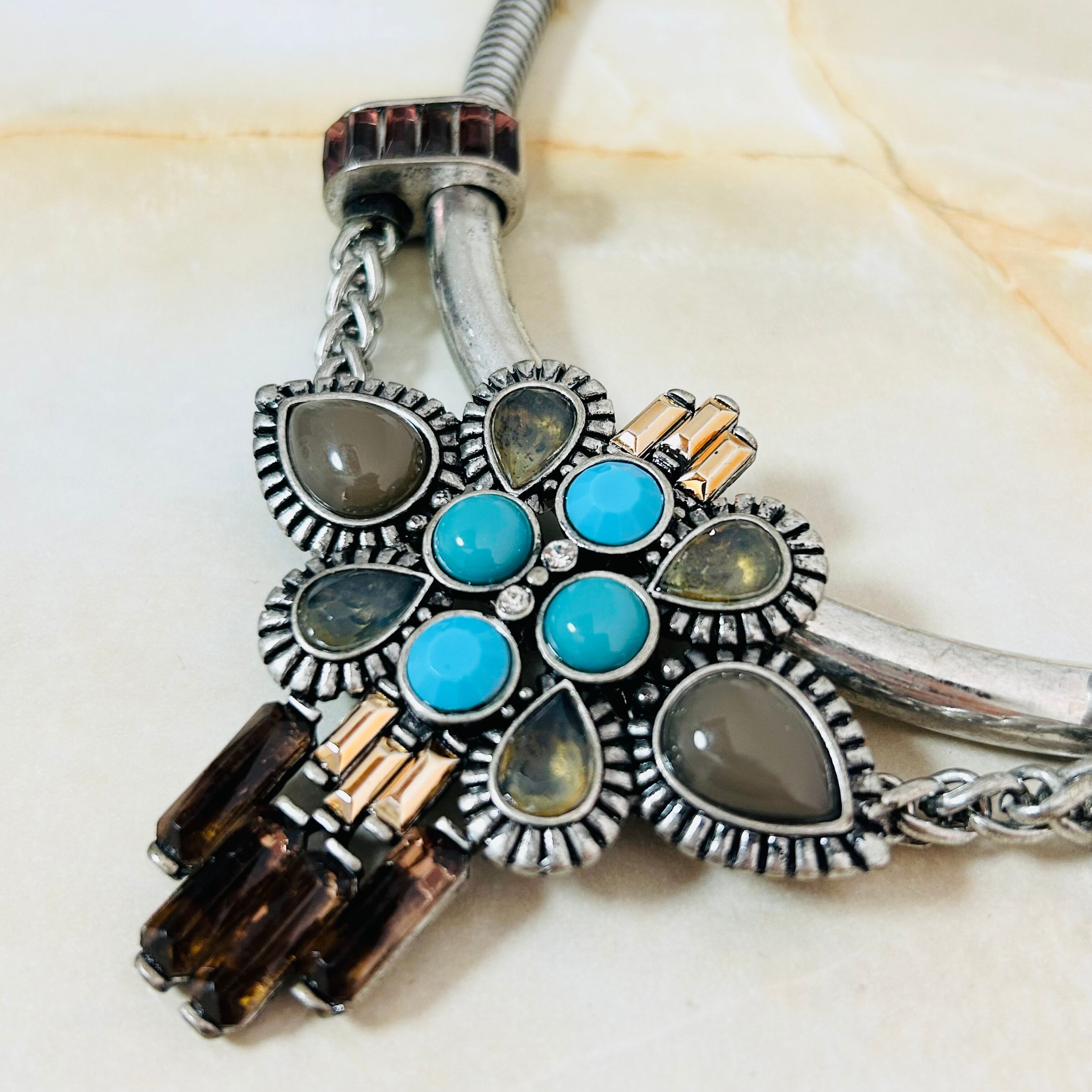 ブルーやブラウンなどさまざまなカラーのパーツを使用したトップをアンティークシルバーと組み合わせたデザインです。