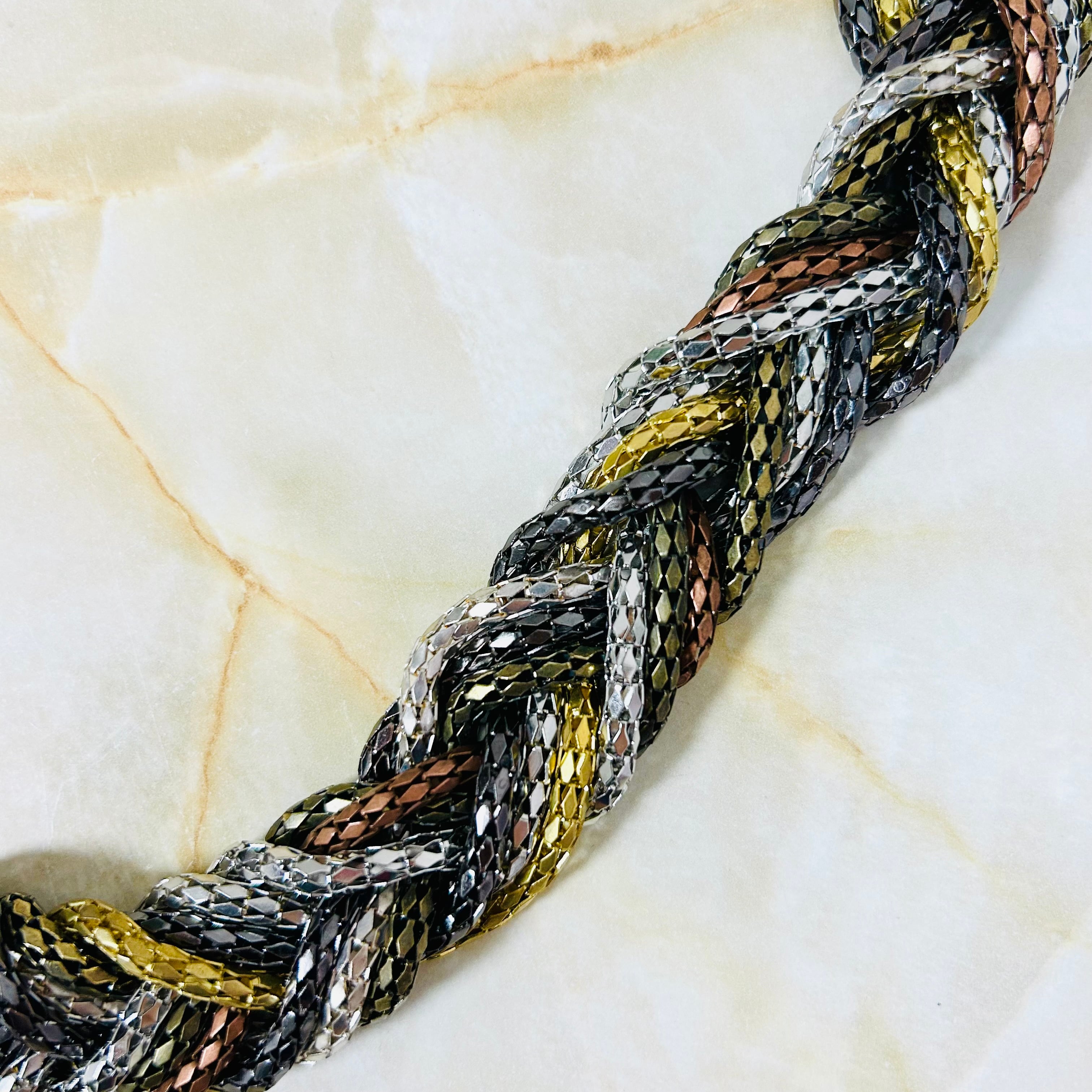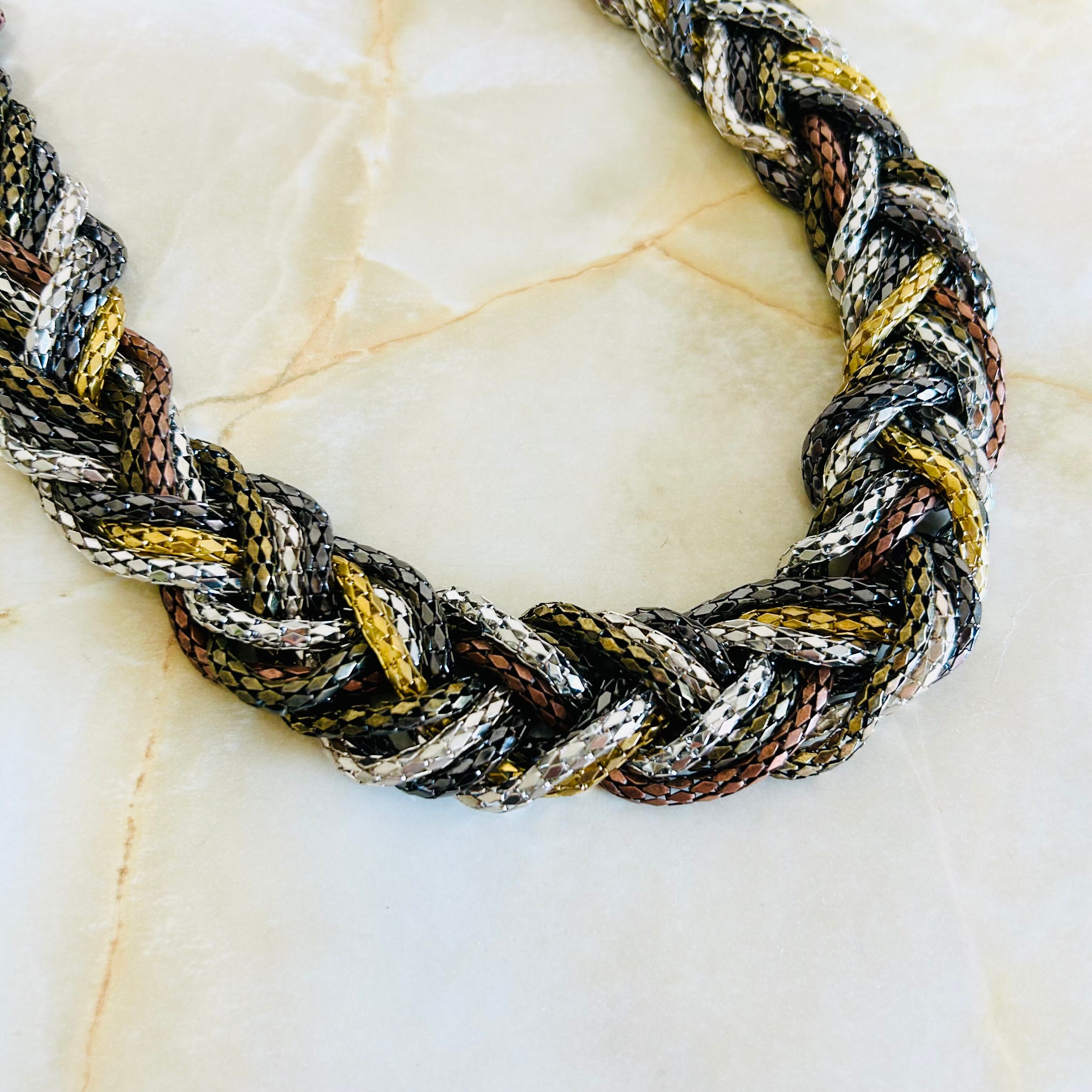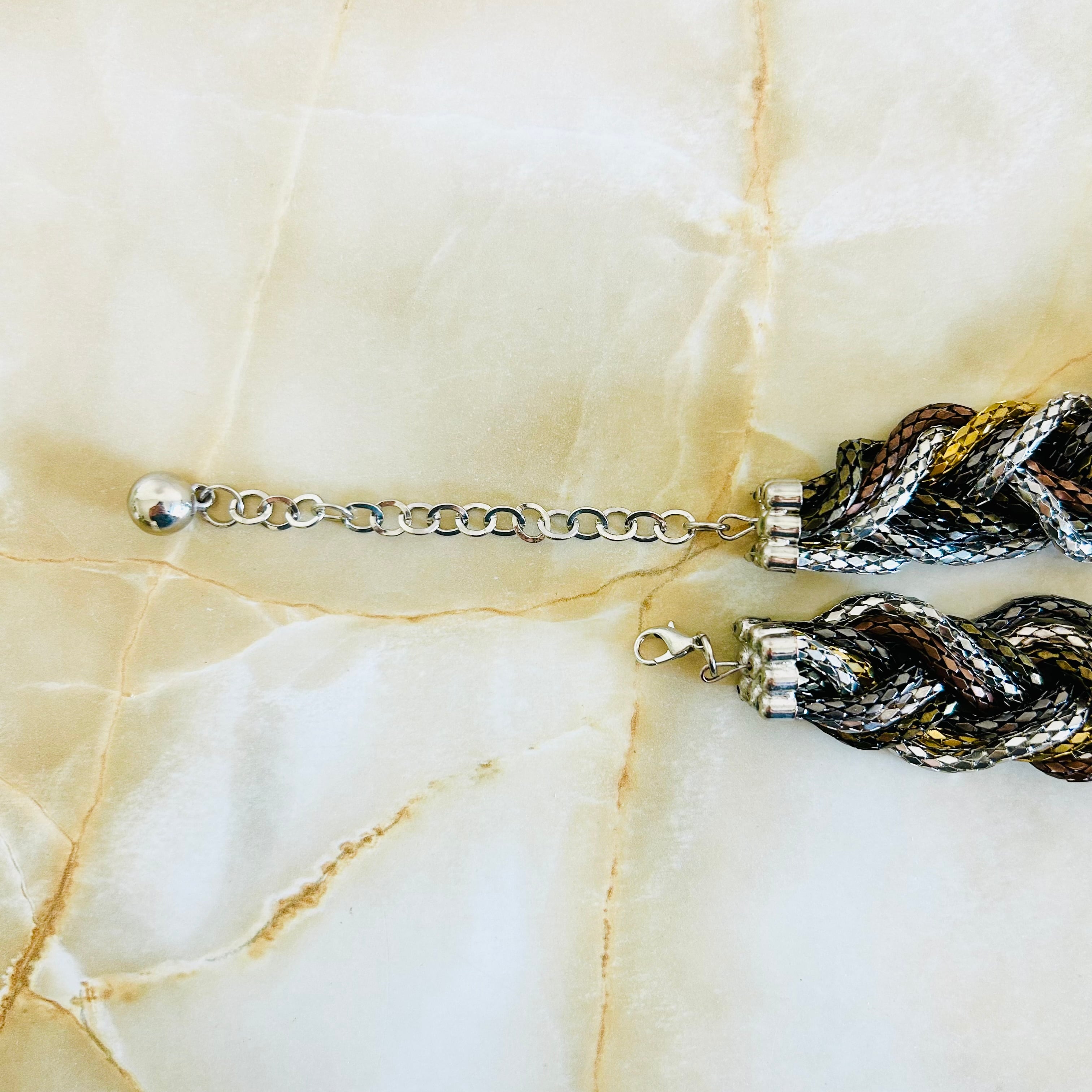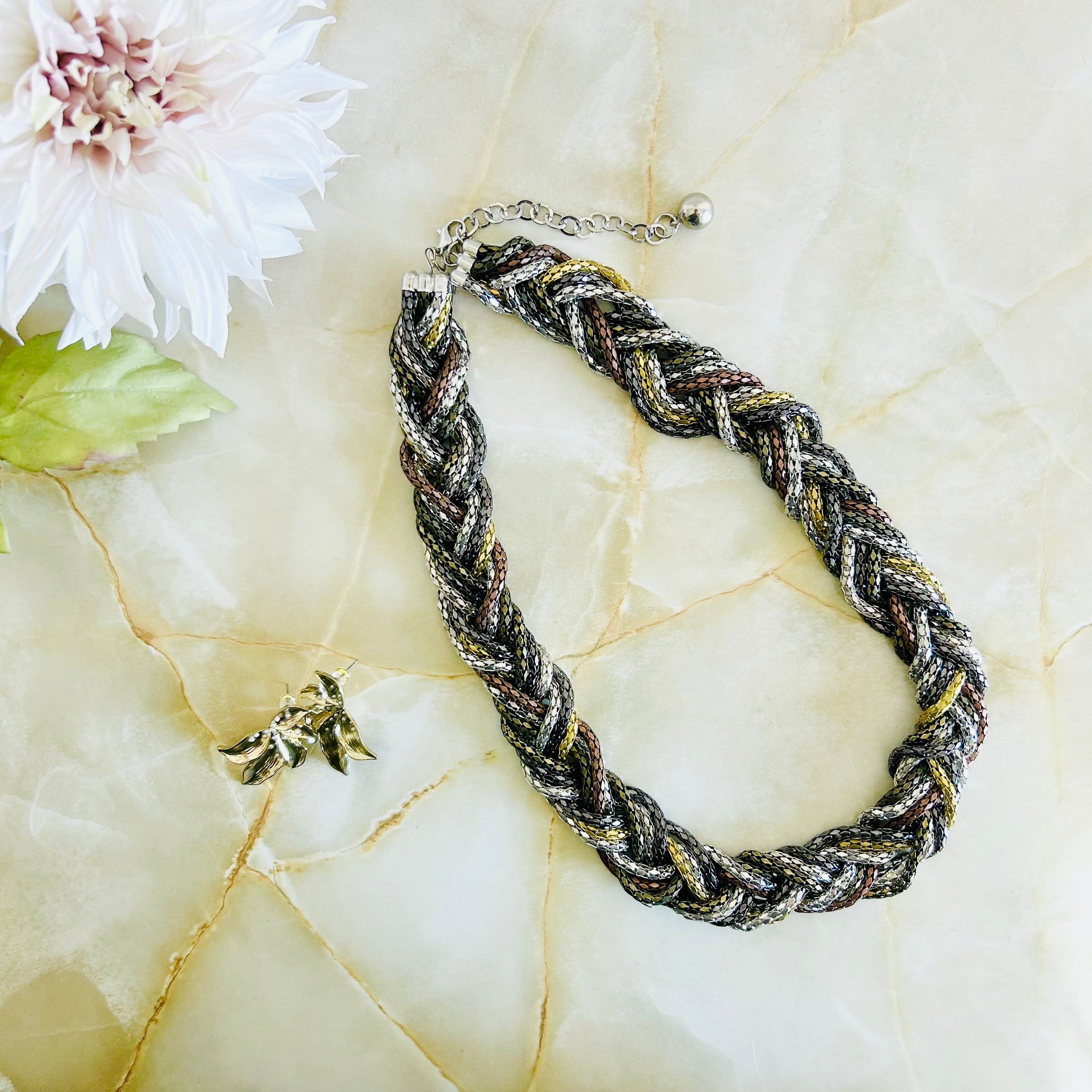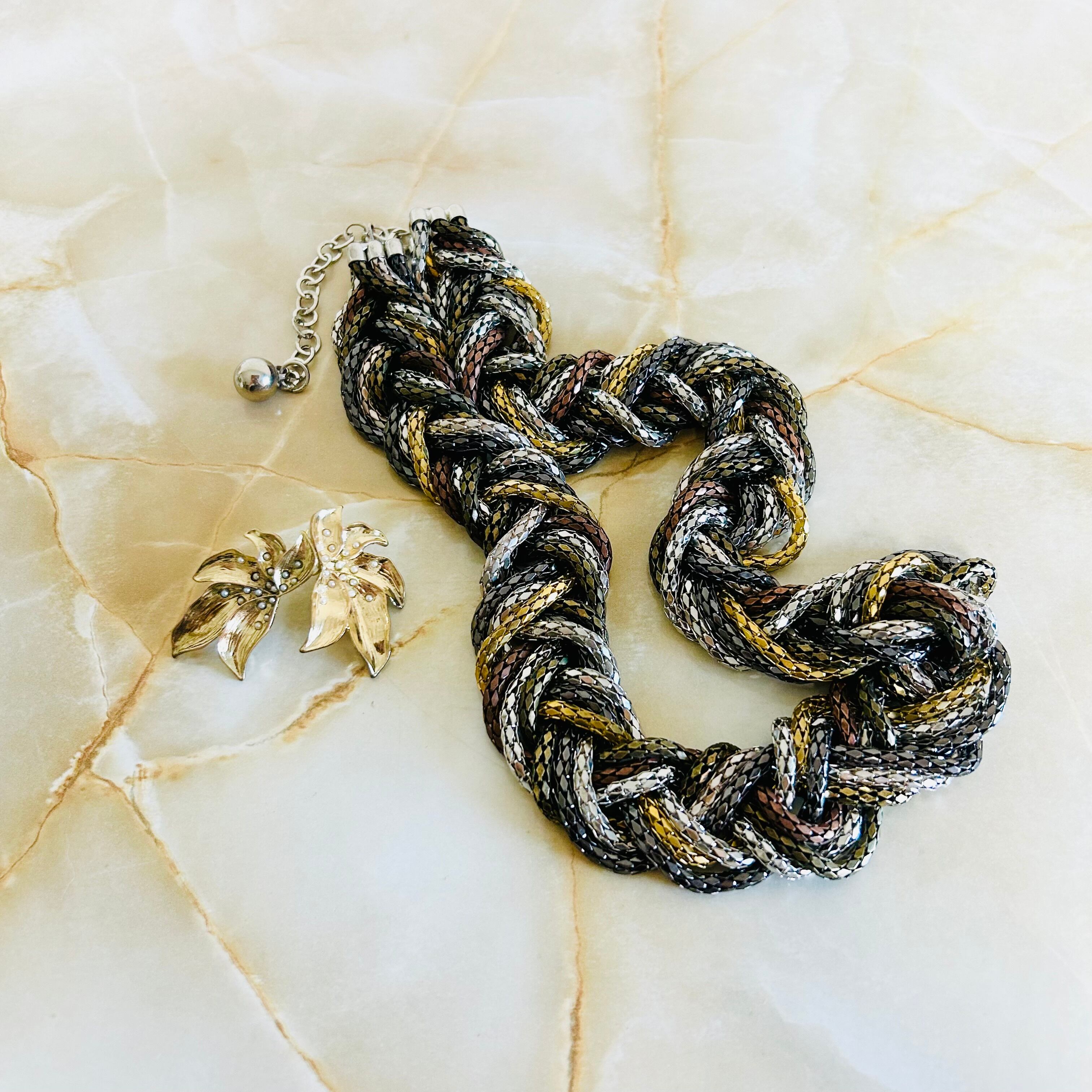 さまざまなカラーのチェーンを編み込んだクールなデザインのネックレスと、アンティークゴールドに小粒パールをあしらったフラワーデザインのピアスとのセット商品です☆