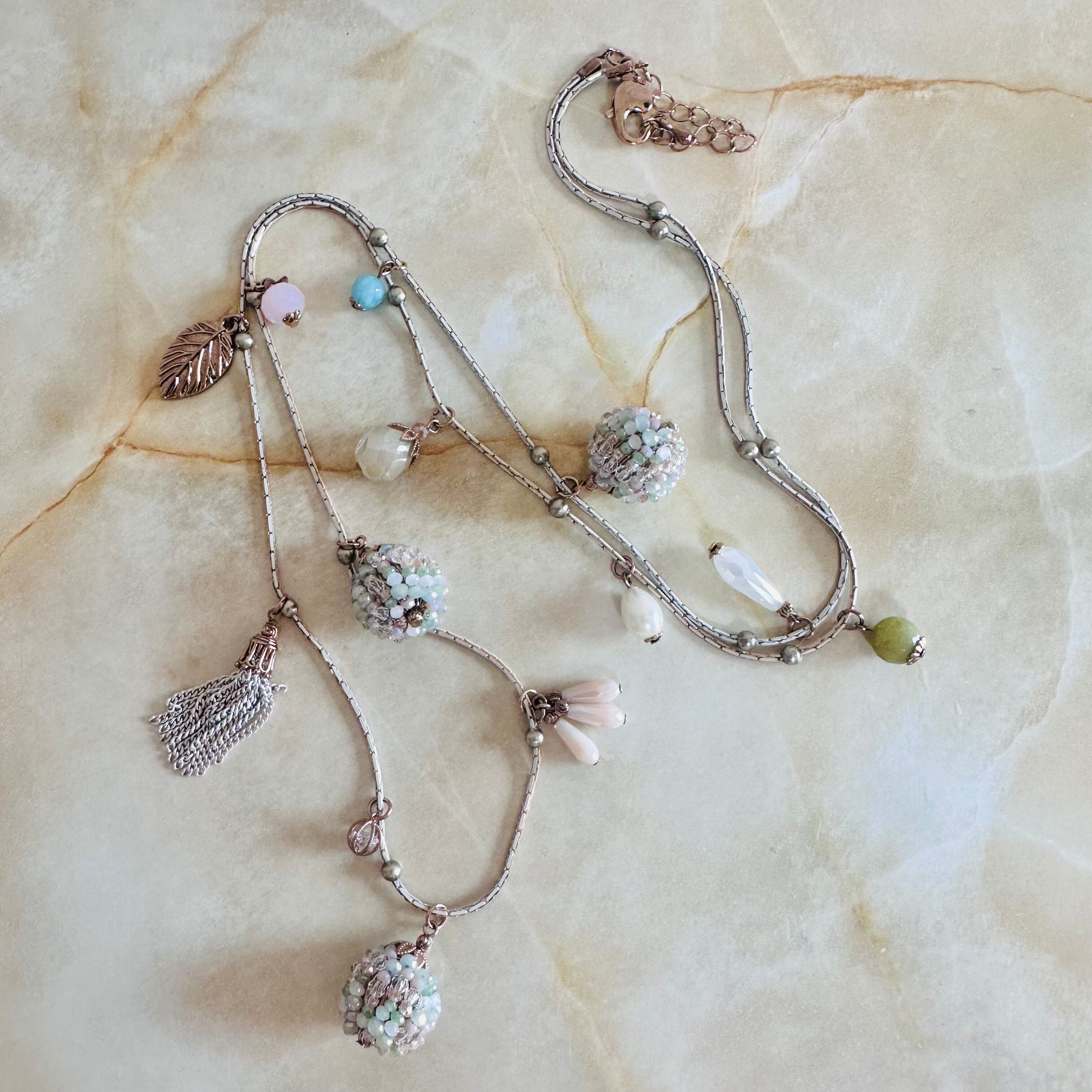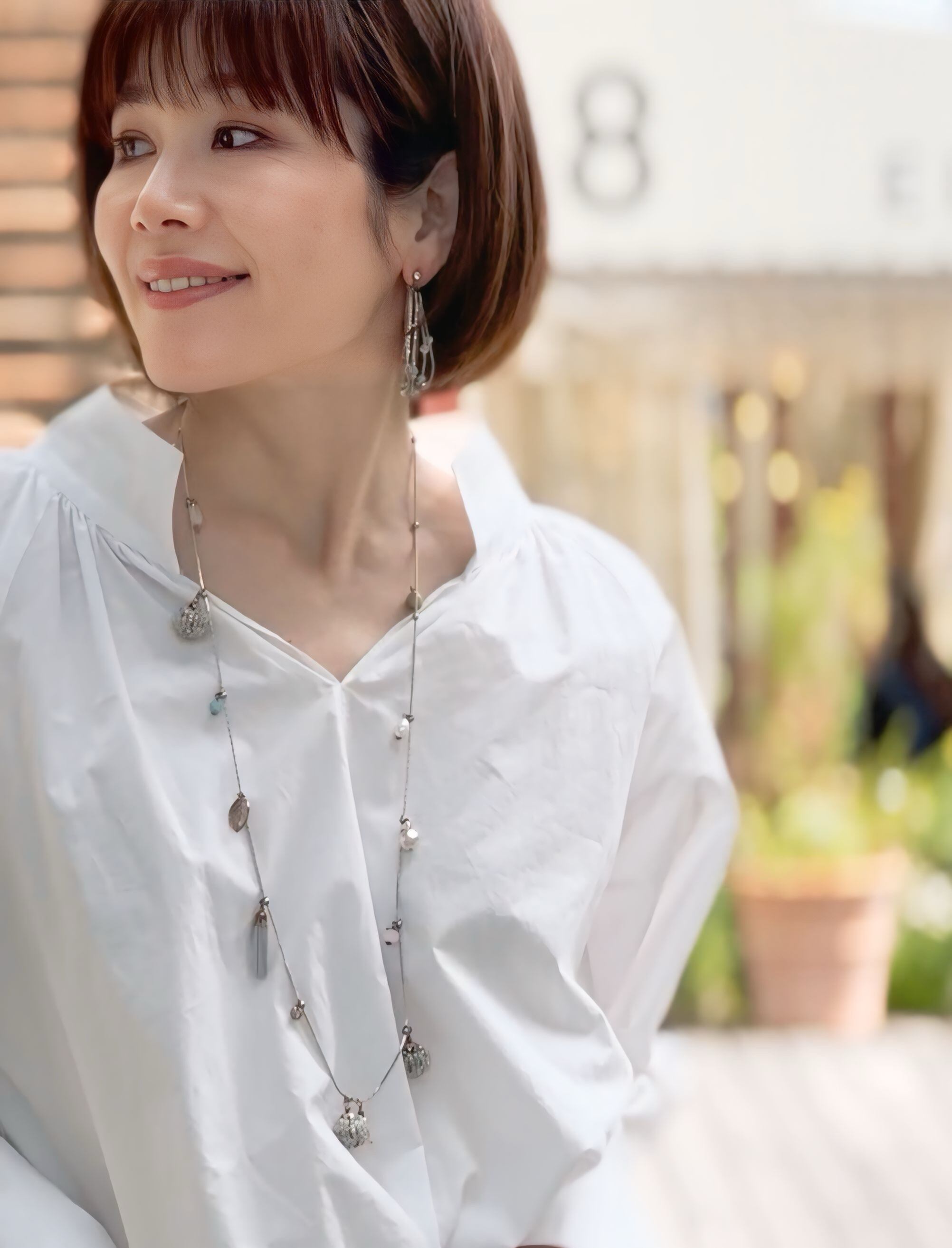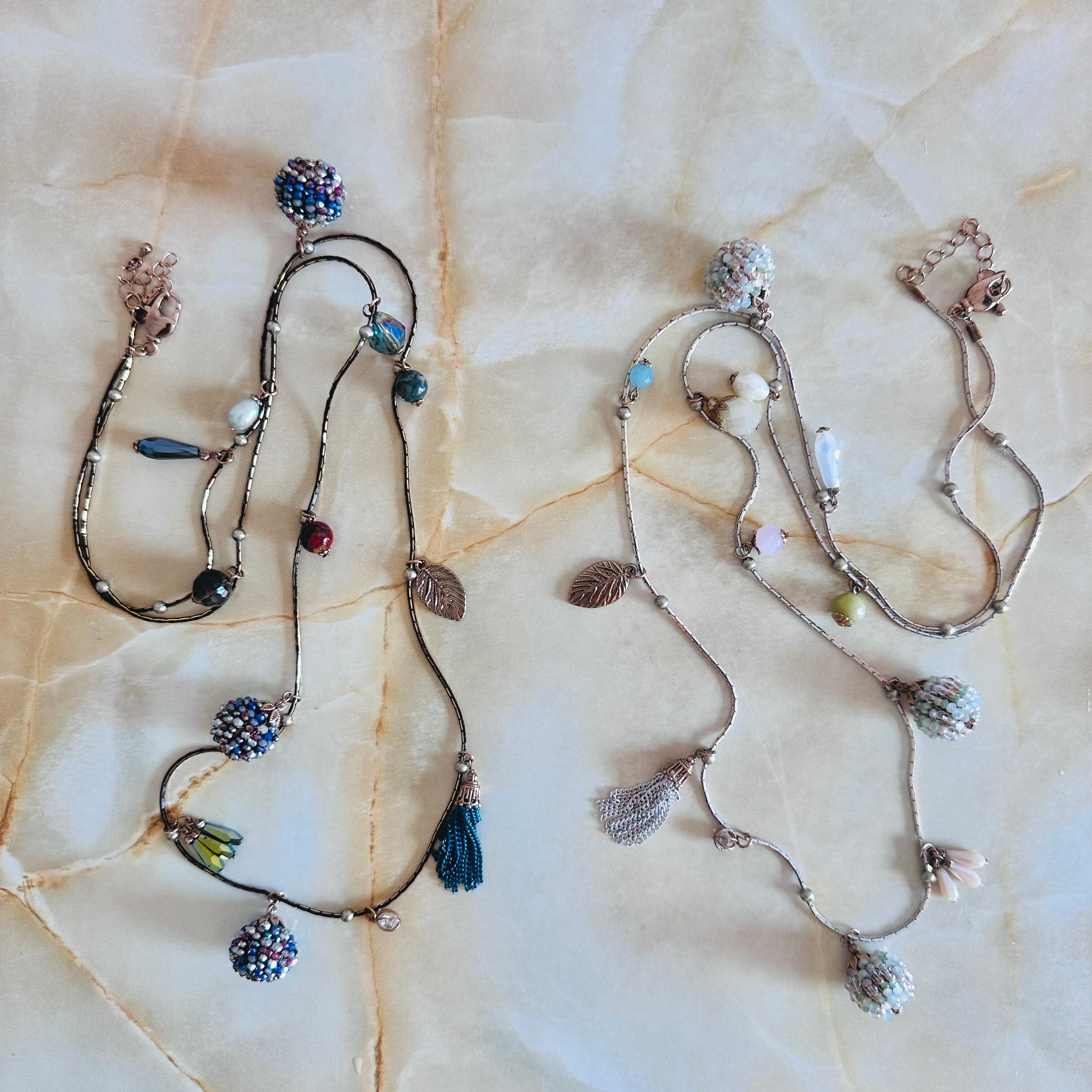 天然石や淡水パール、チェコビーズをメインにひとつひとつ異なるチャームを華奢なチェーンに連ねたロングネックレスです。