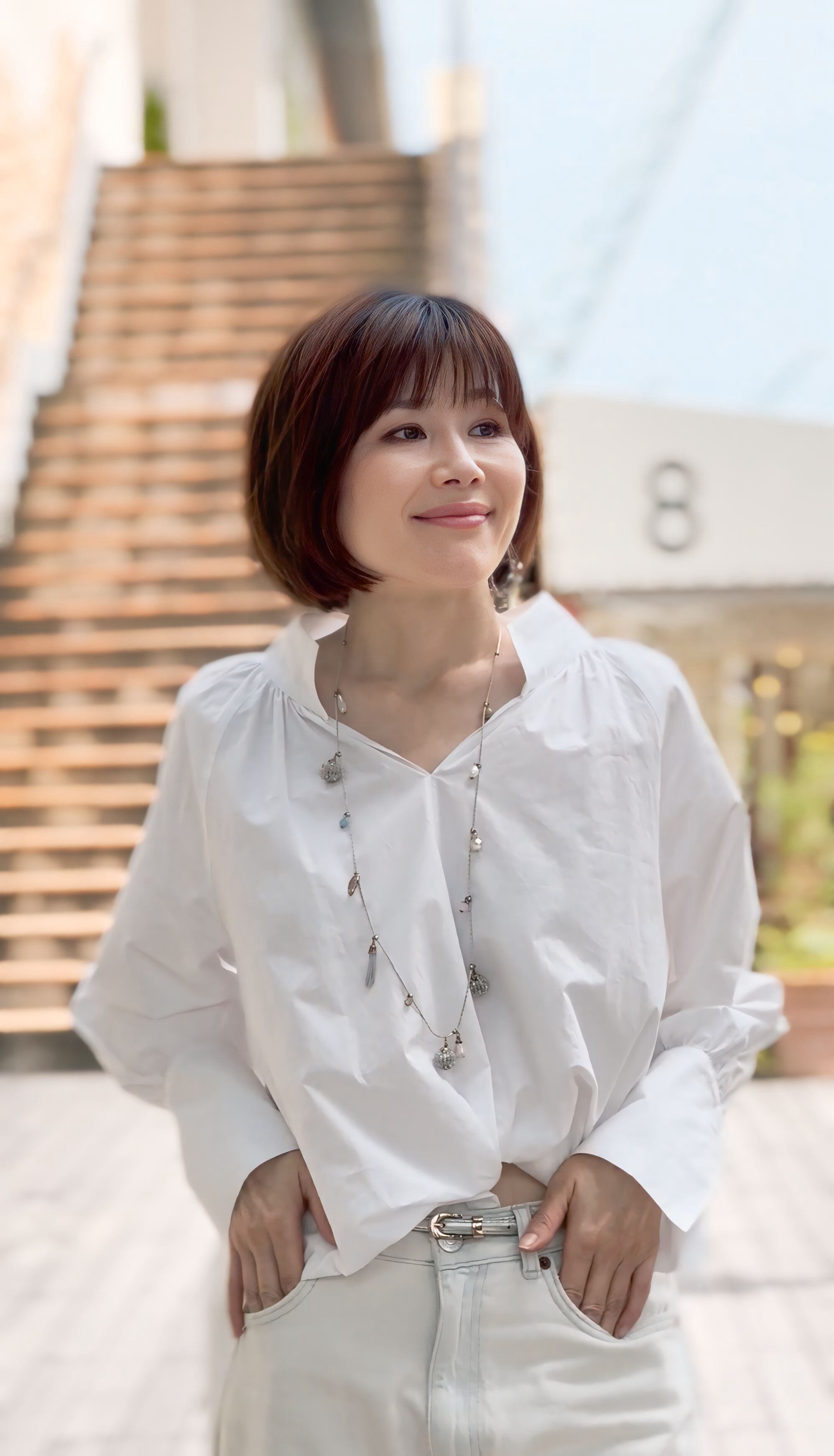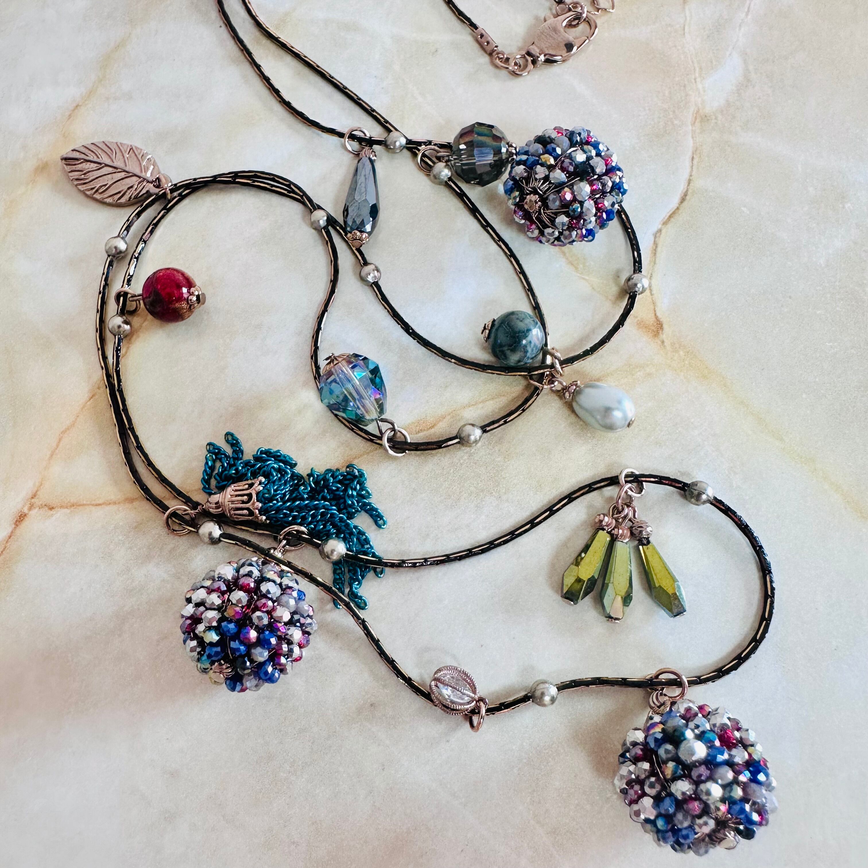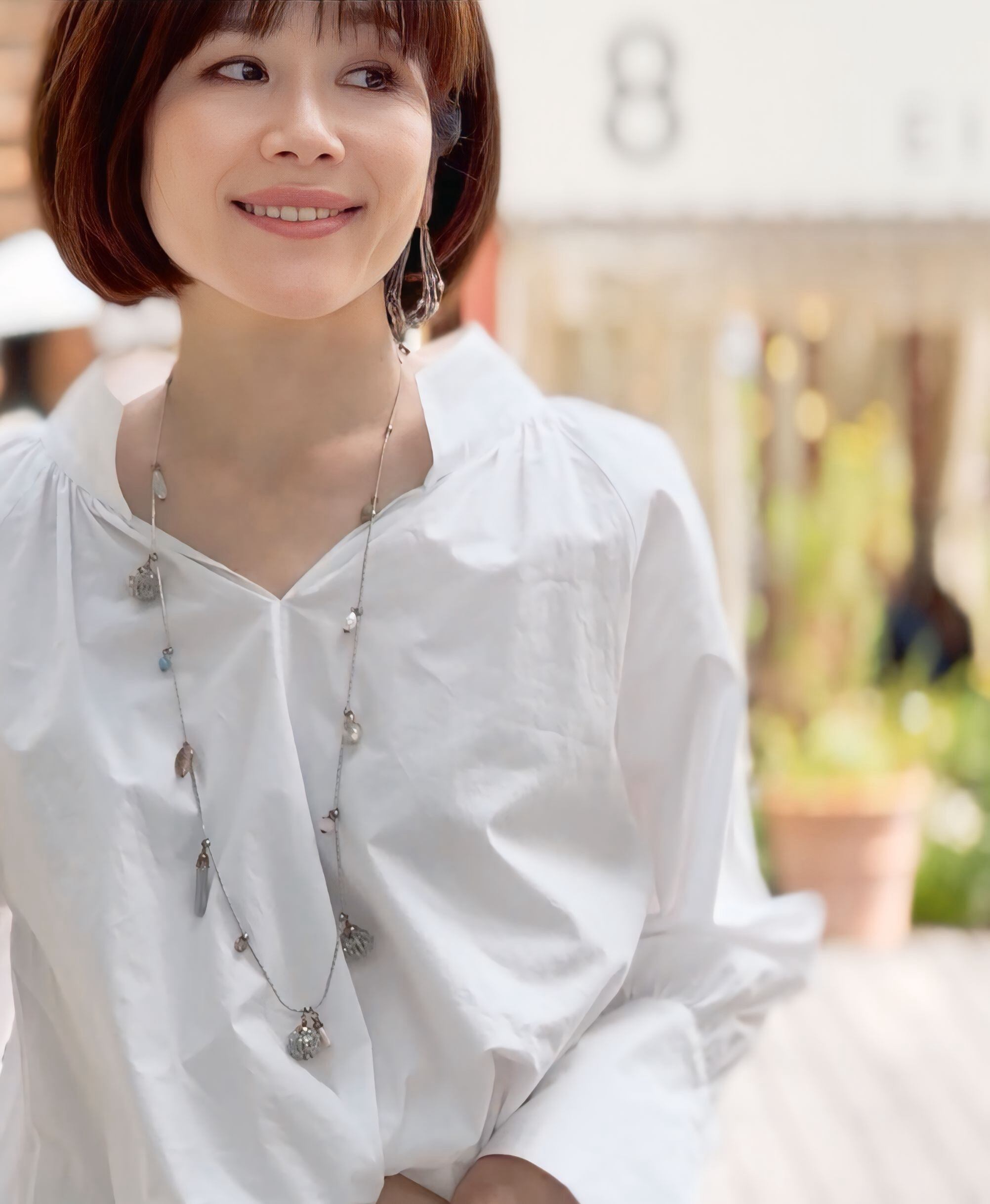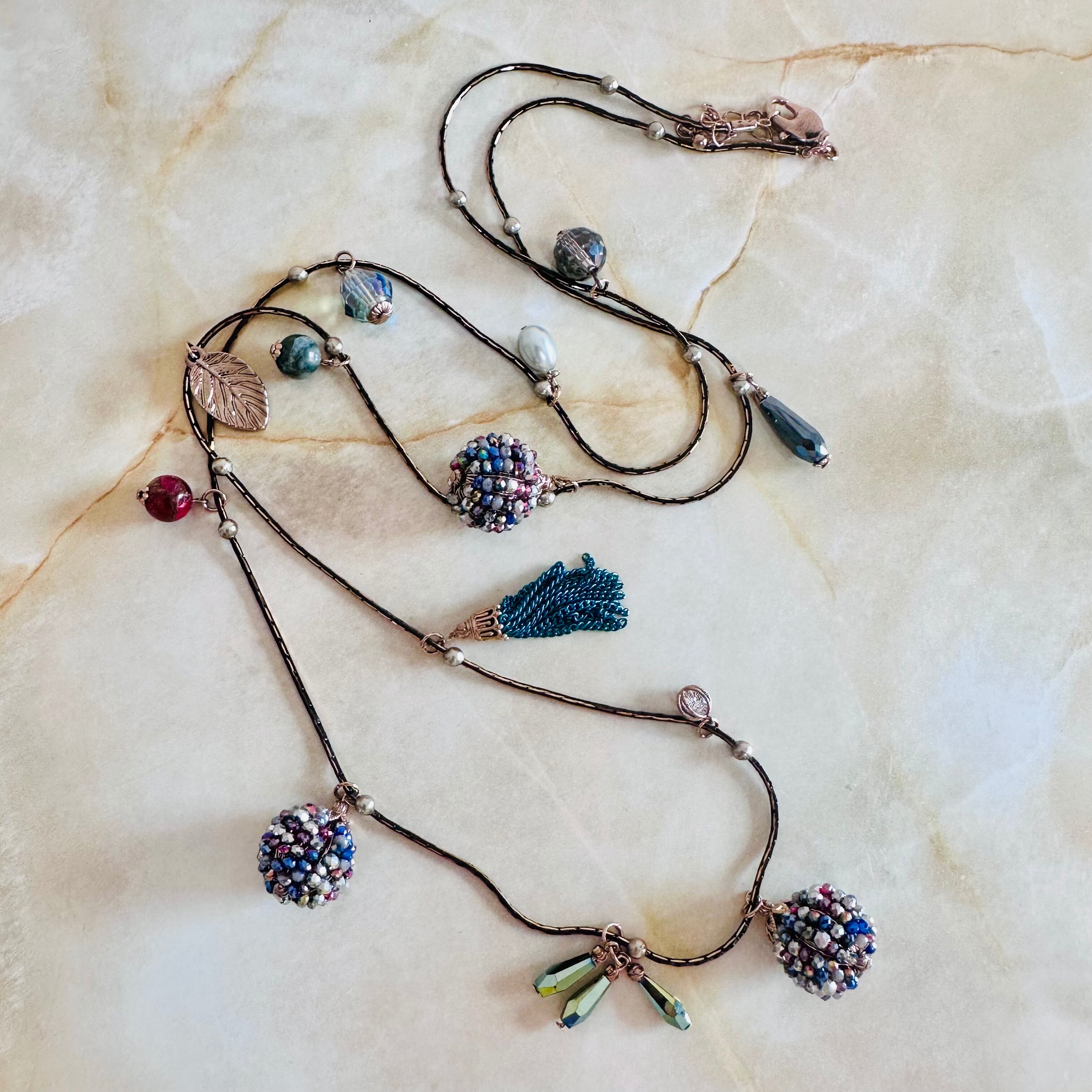 天然石や淡水パール、チェコビーズをメインにひとつひとつ異なるチャームを華奢なチェーンに連ねたロングネックレスです。