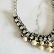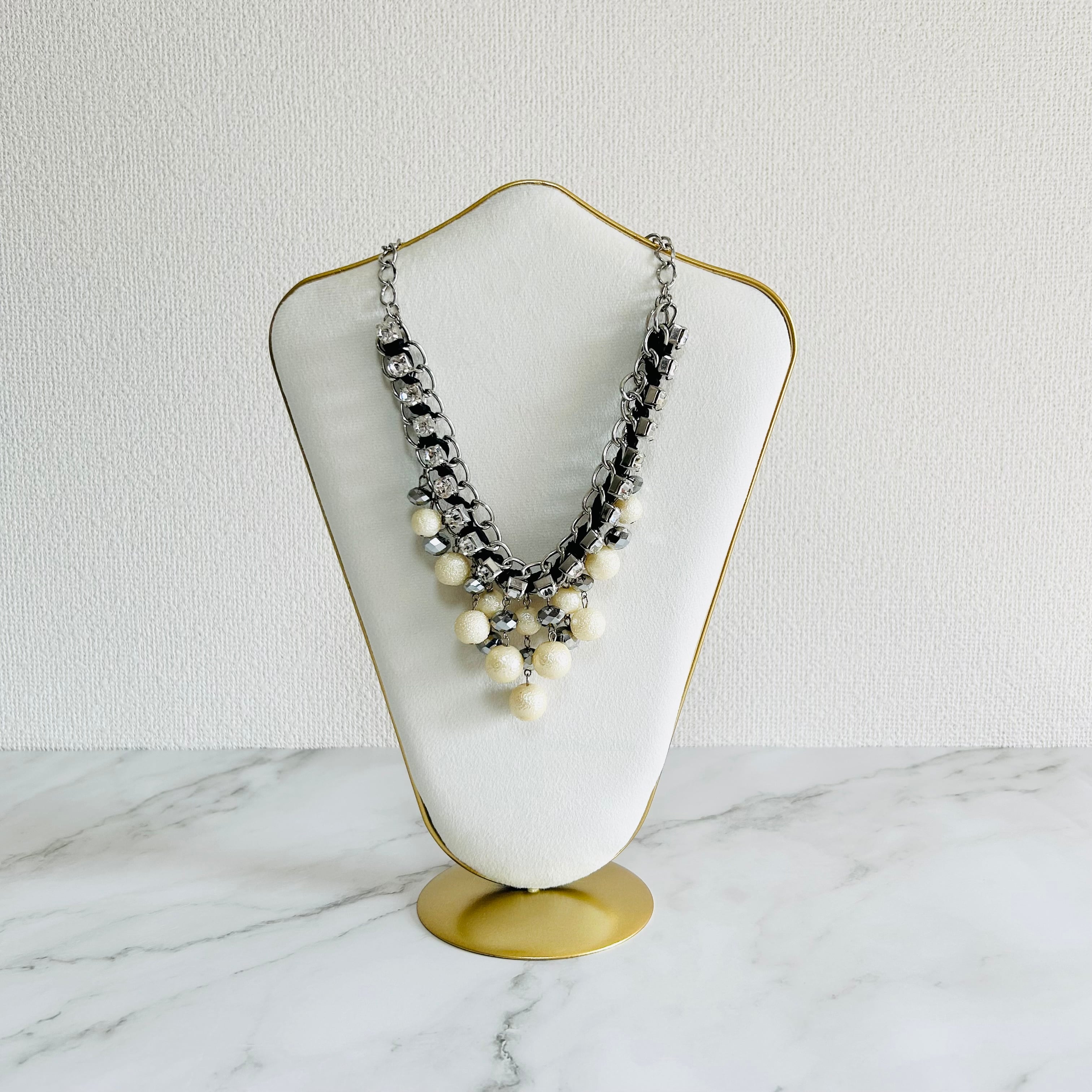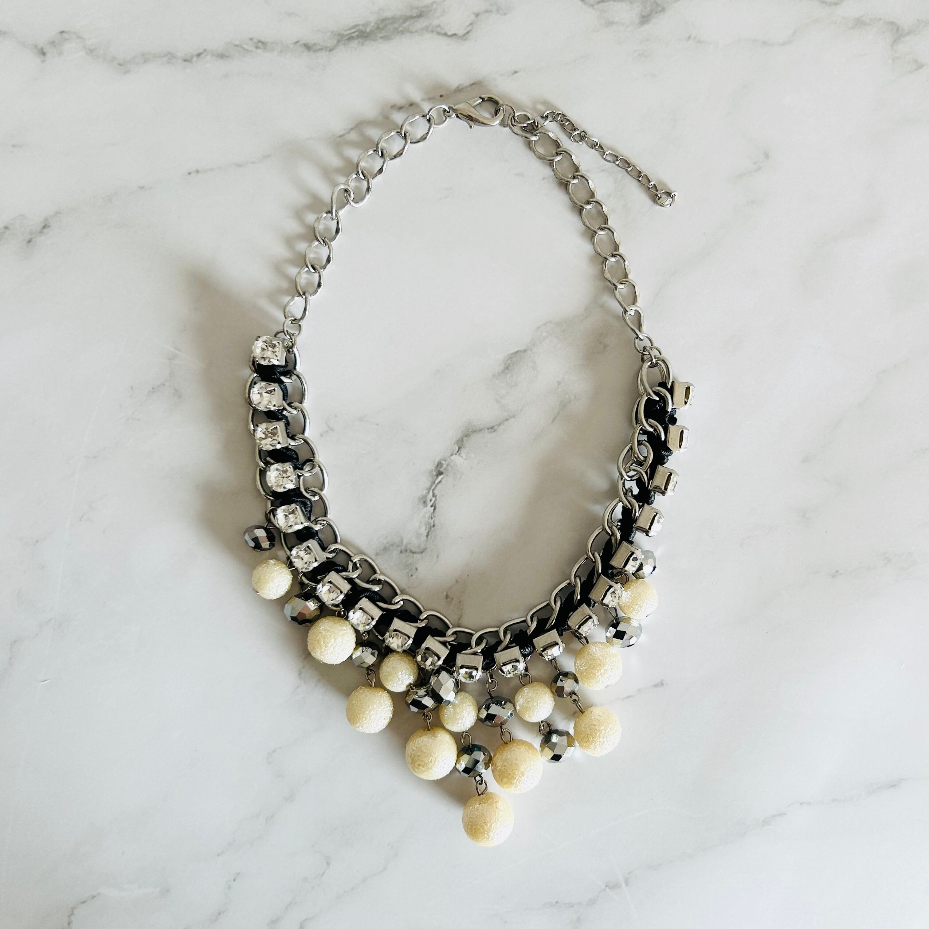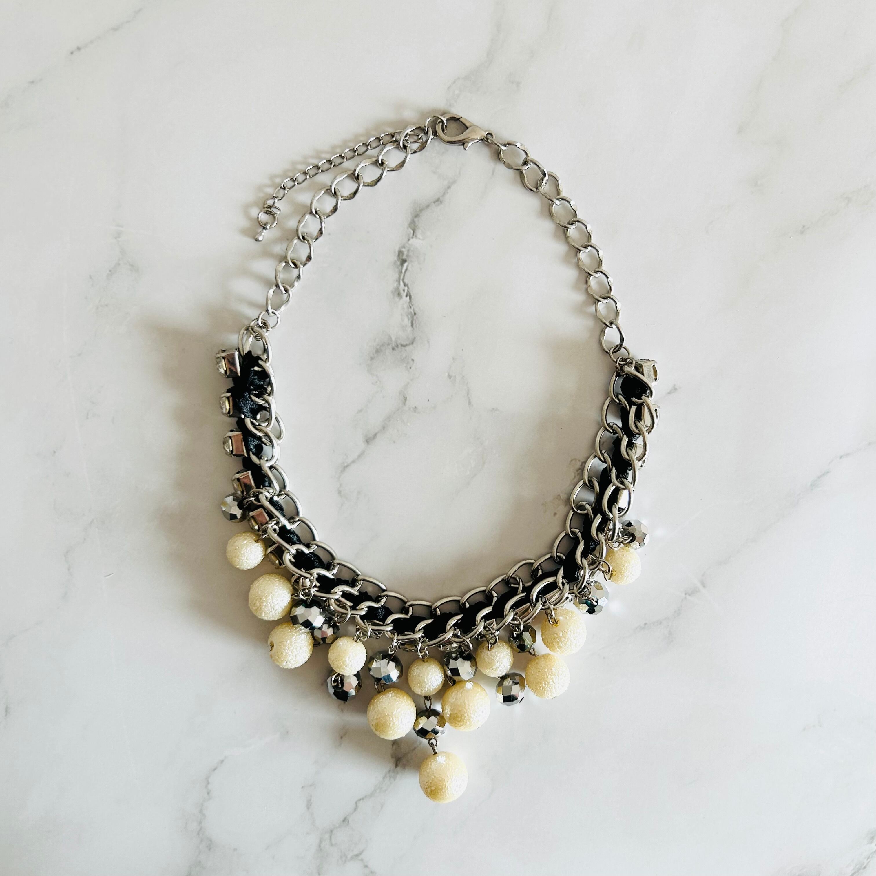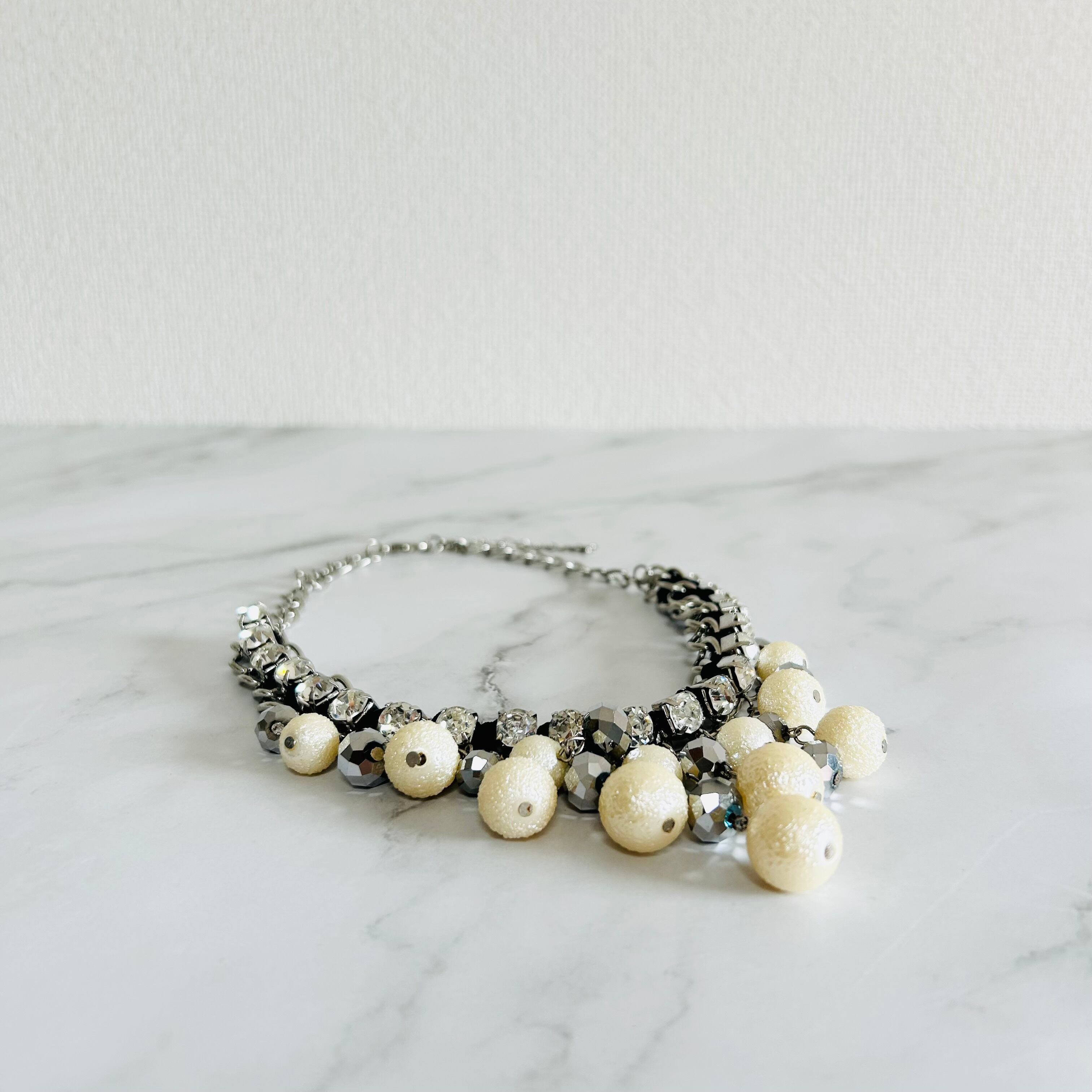 パールカラー、クリアカラー✖️アンティークシルバーカラーのネックレスです。