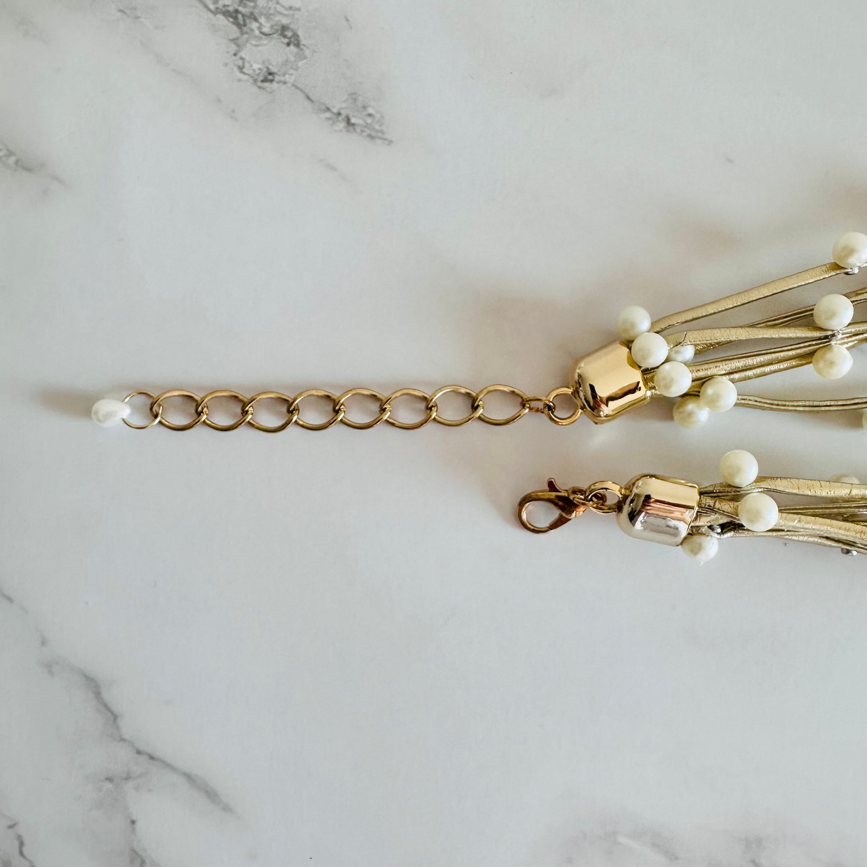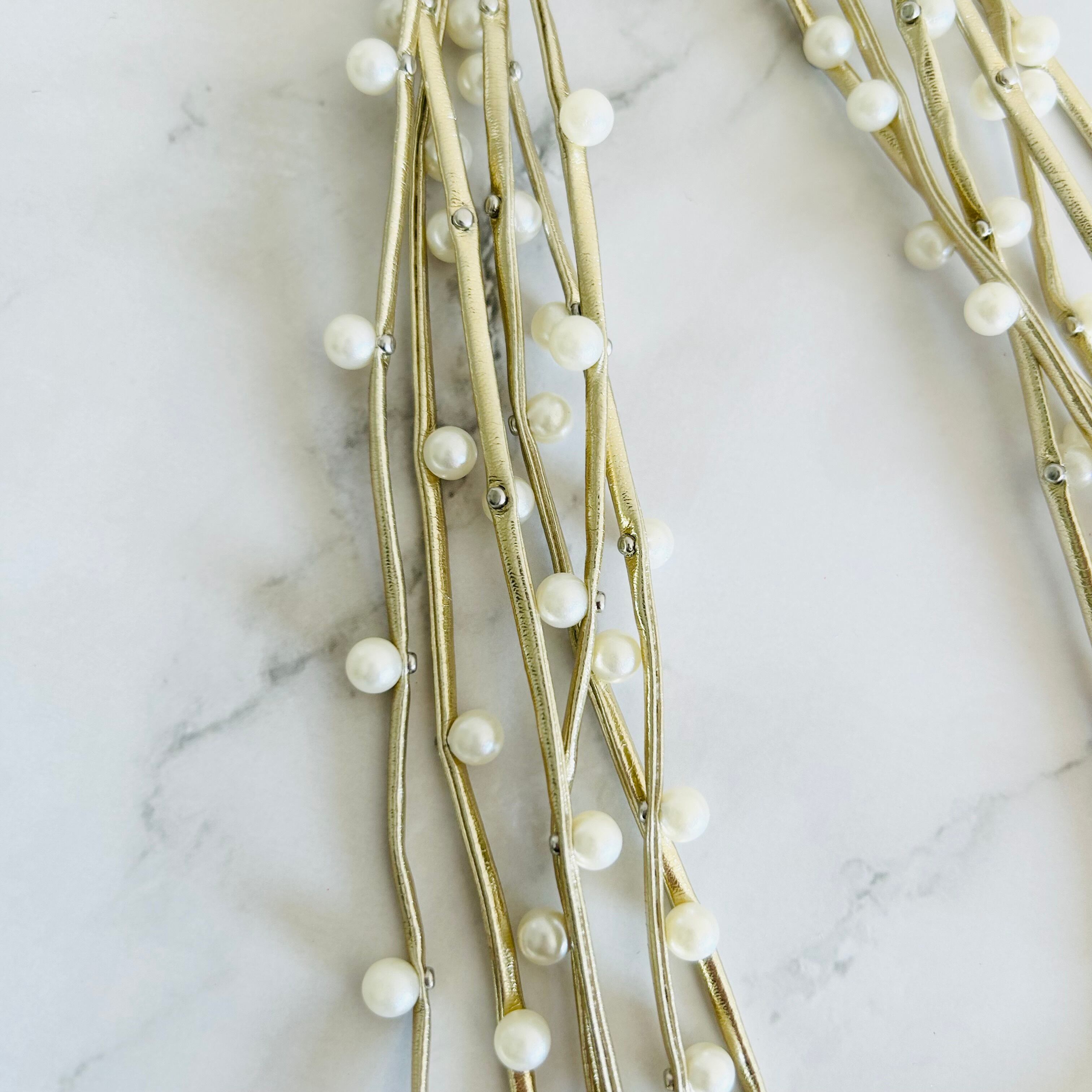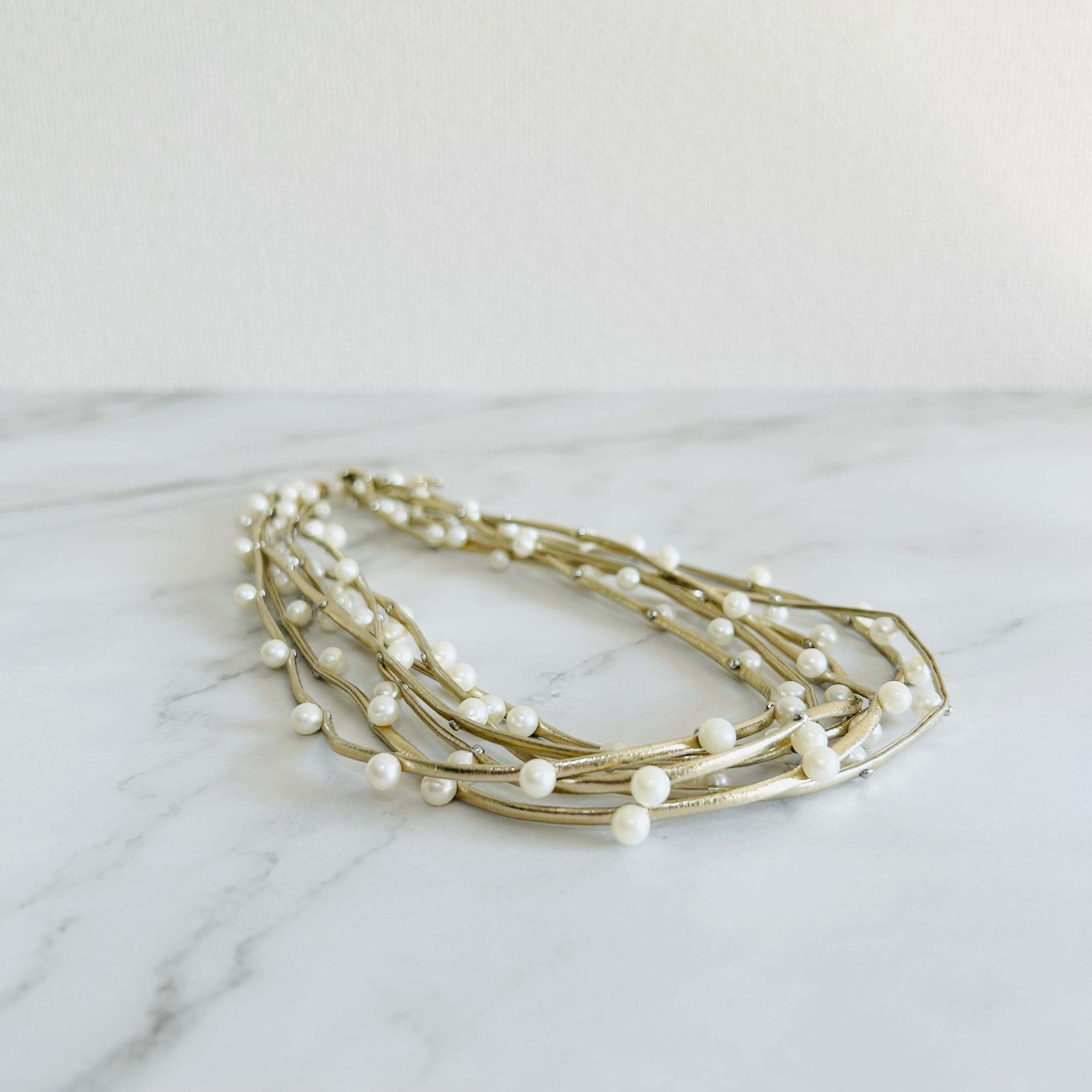 シャンパンゴールドカラーのコードに小ぶりなパールパーツをランダムに取り付け連ねたデザインです。