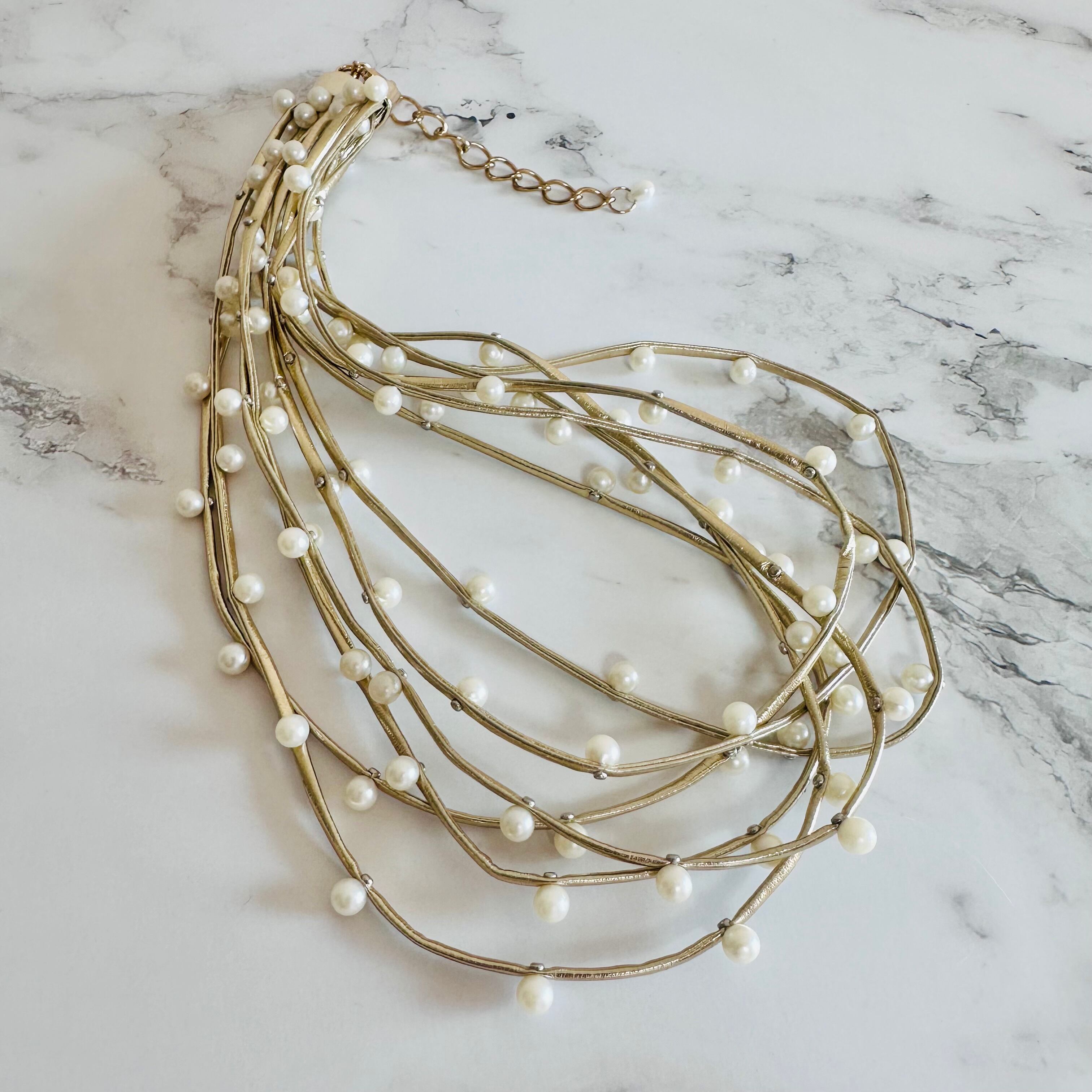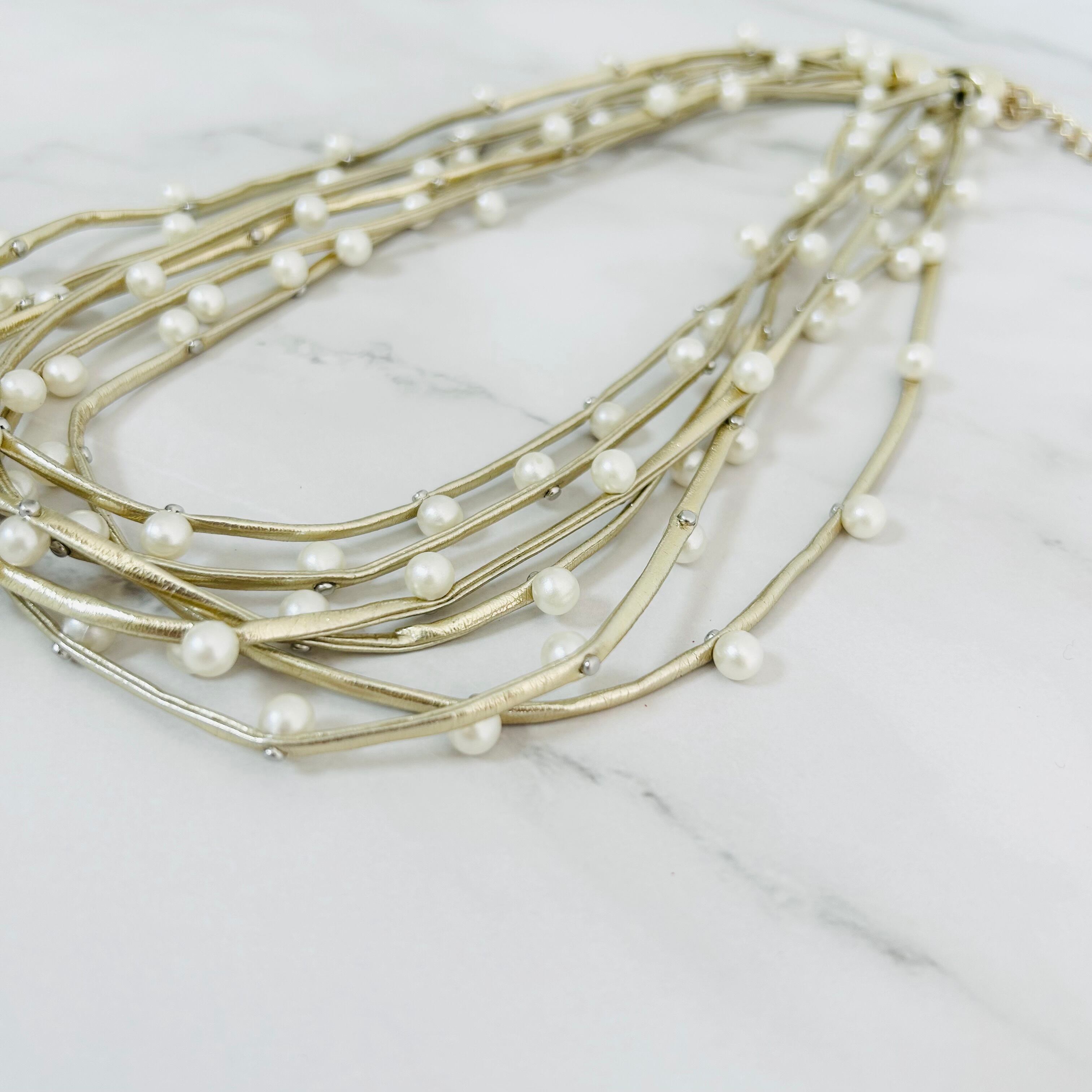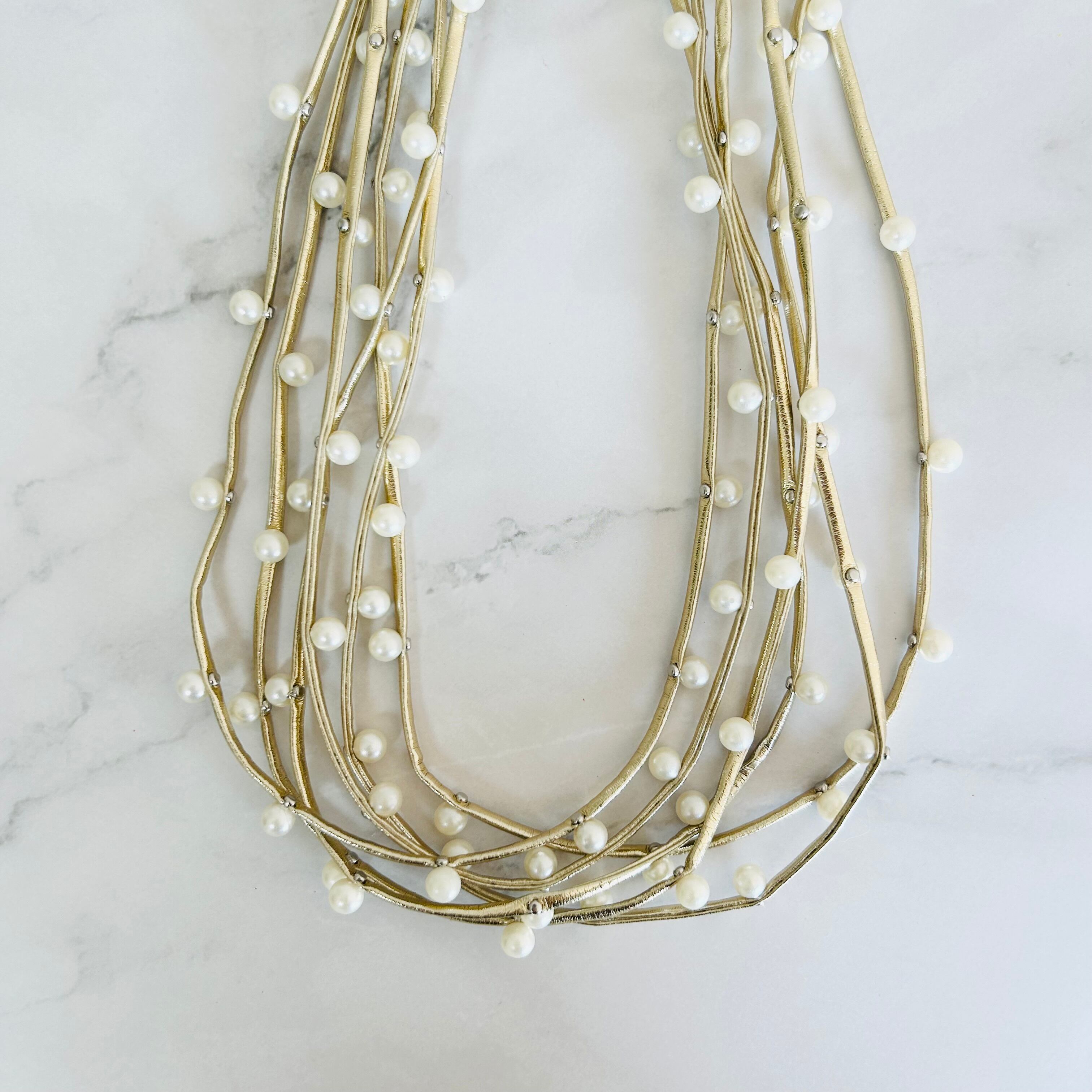 シャンパンゴールドカラーのコードに小ぶりなパールパーツをランダムに取り付け連ねたデザインです。