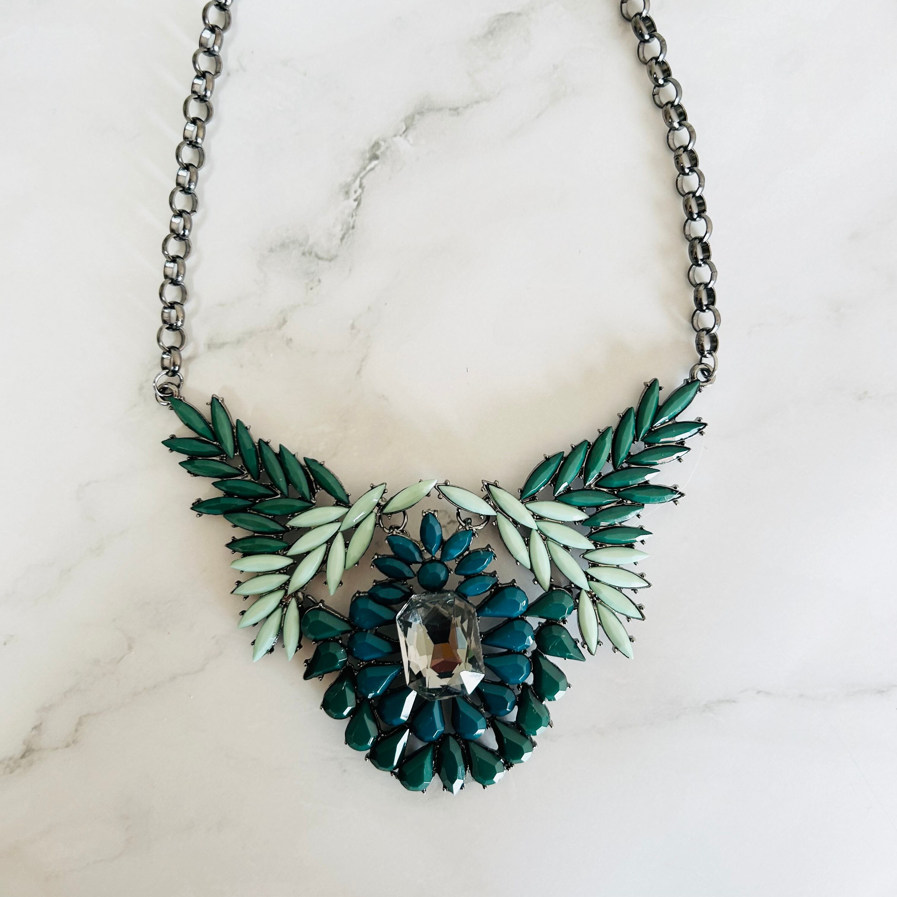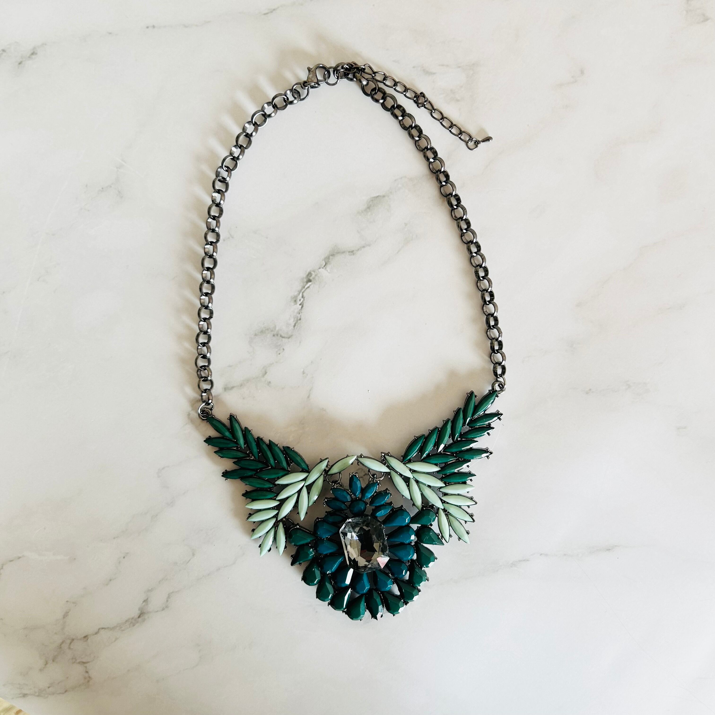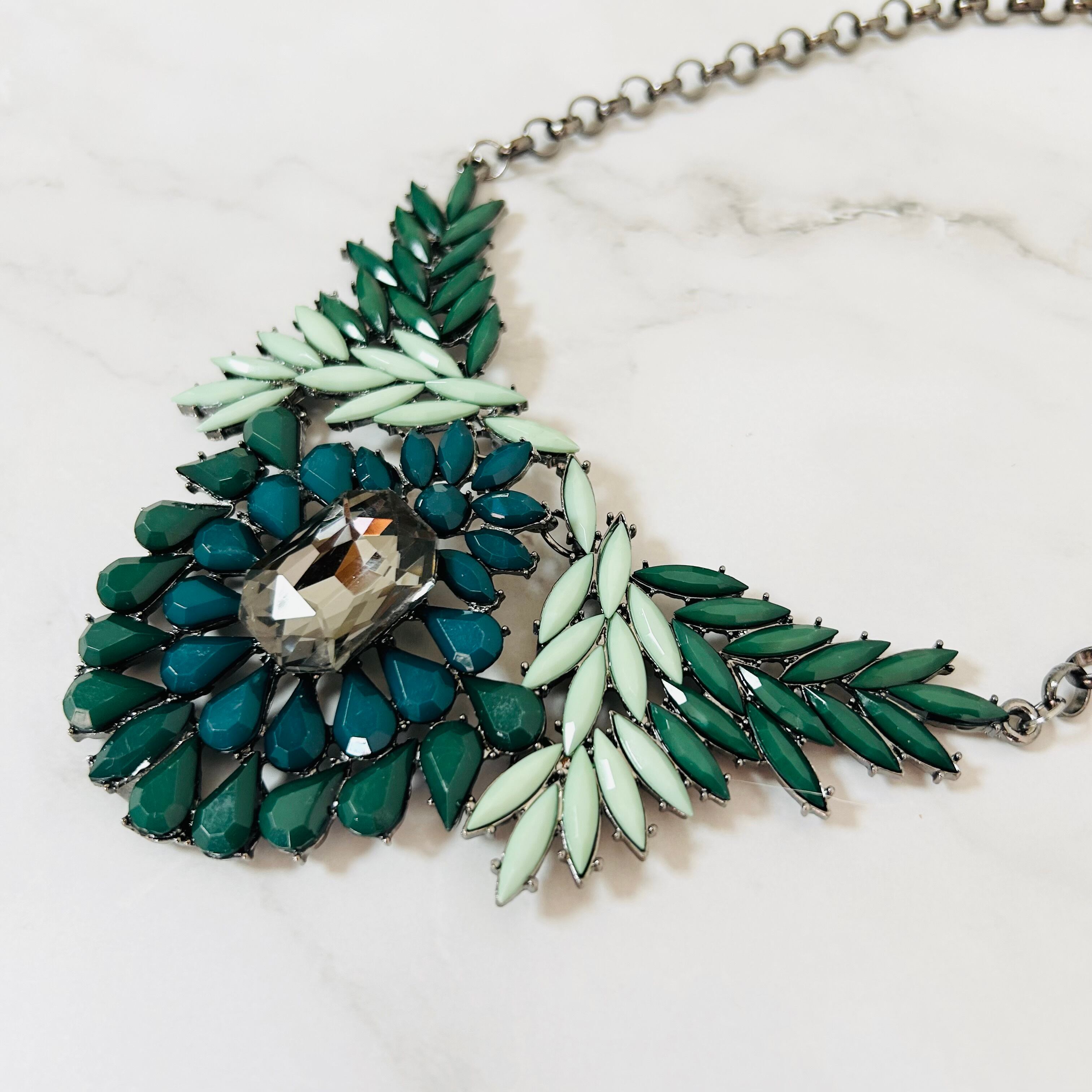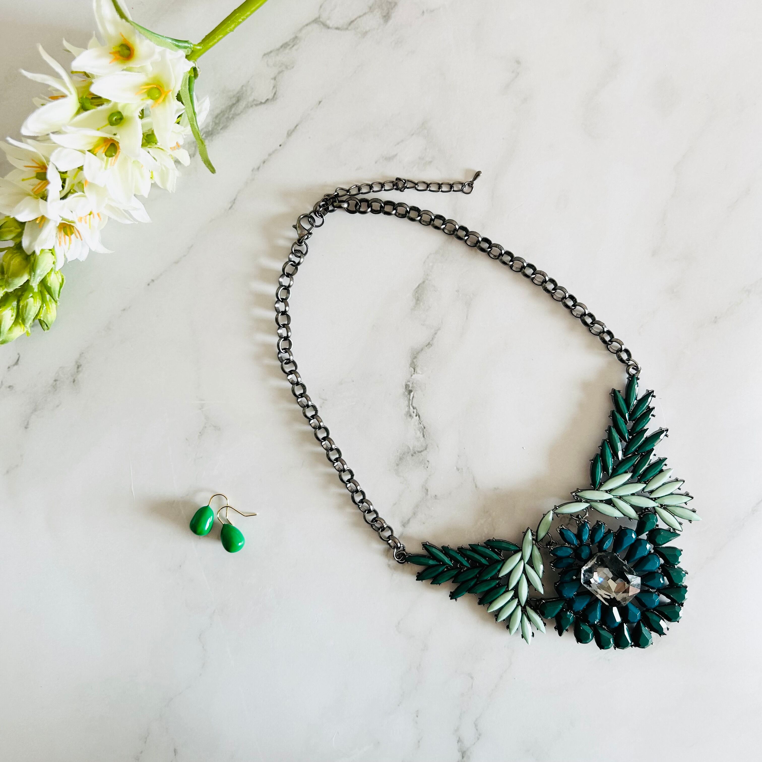 グリーンのアクリルパーツを並べ、トップにはが華やかなクリスタルパーツをプラスしたた立体感のあるデザインです✨