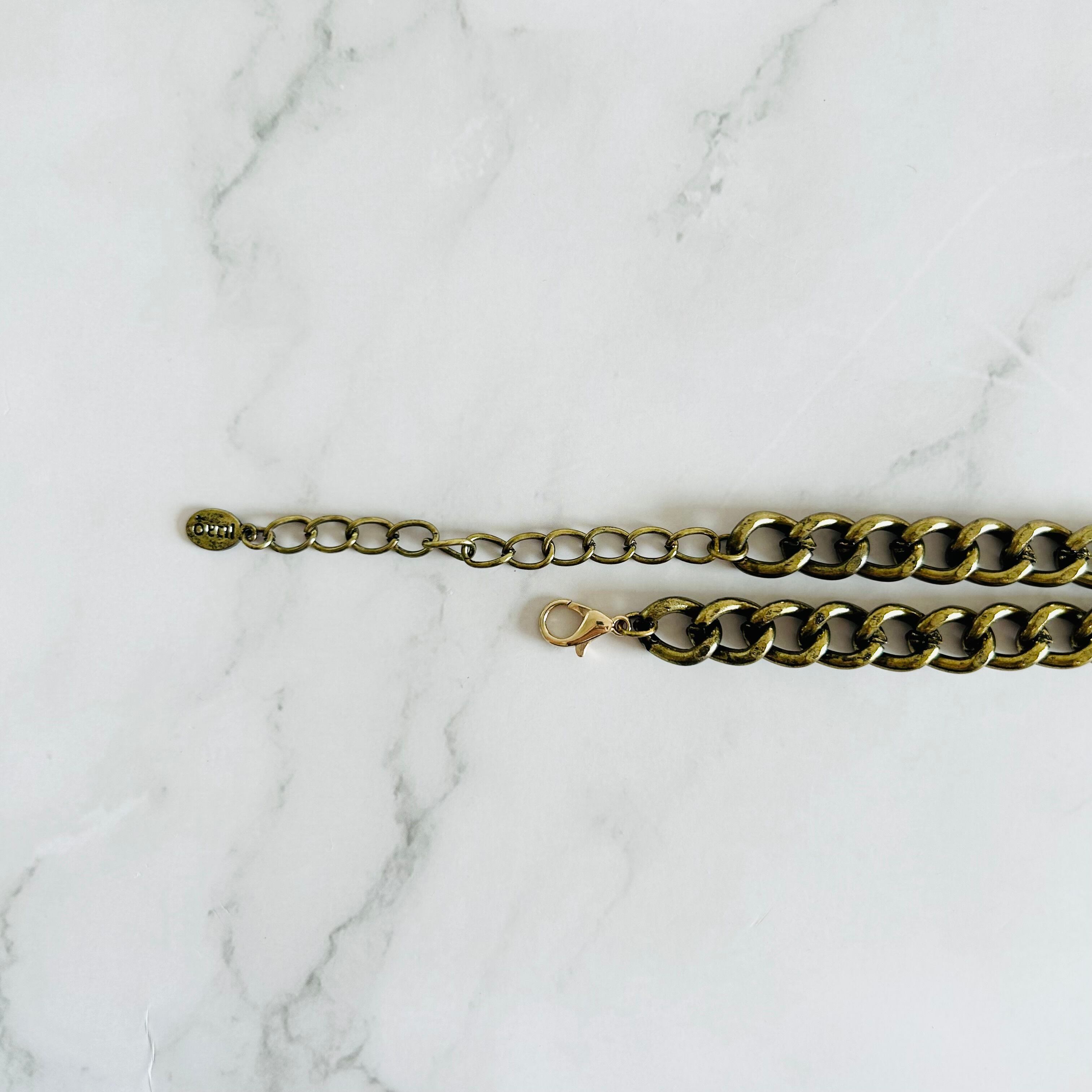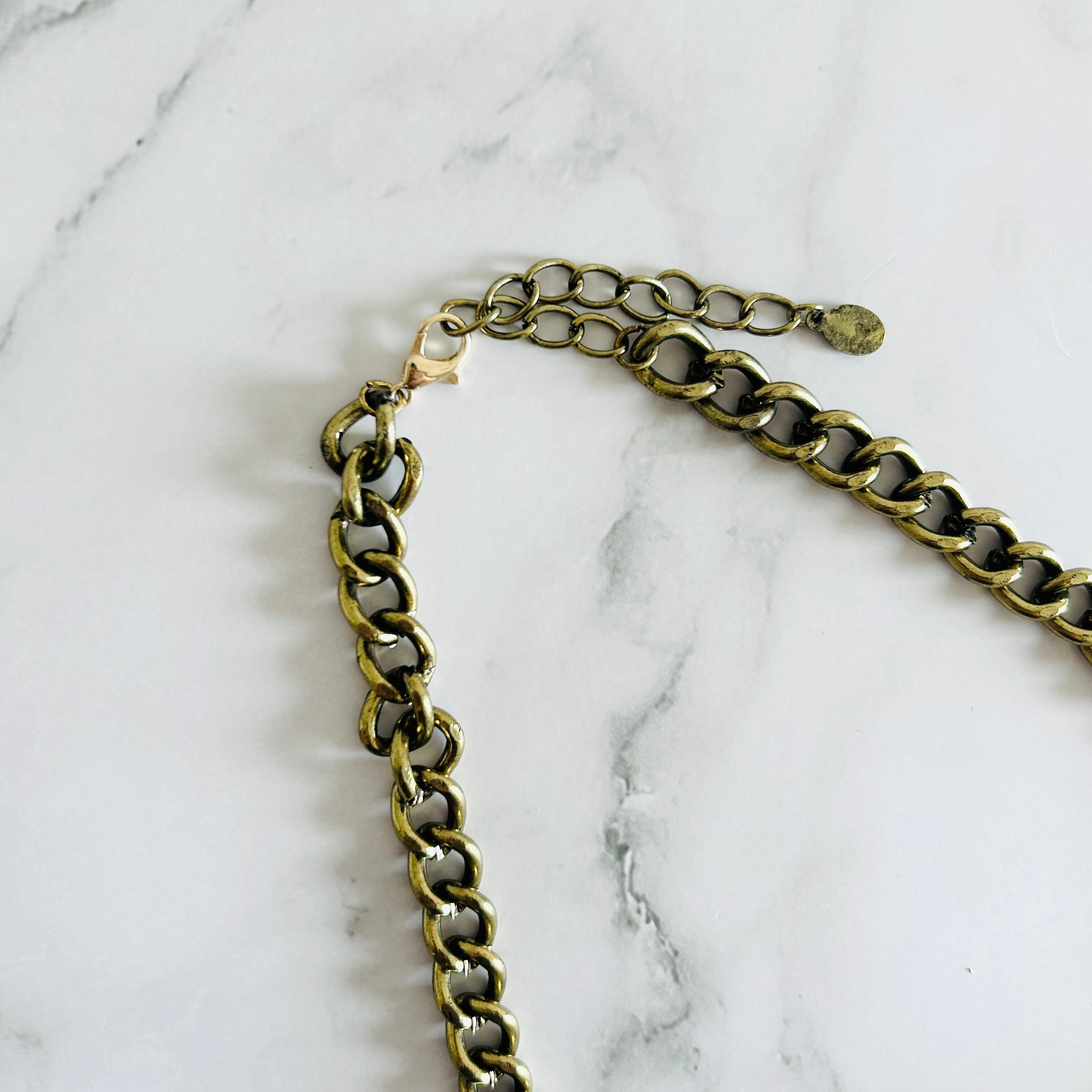 燻したゴールドカラーのチャンキーチェーンにライトグリーンとブラックのアクリルパーツを取り付けたデザインです。