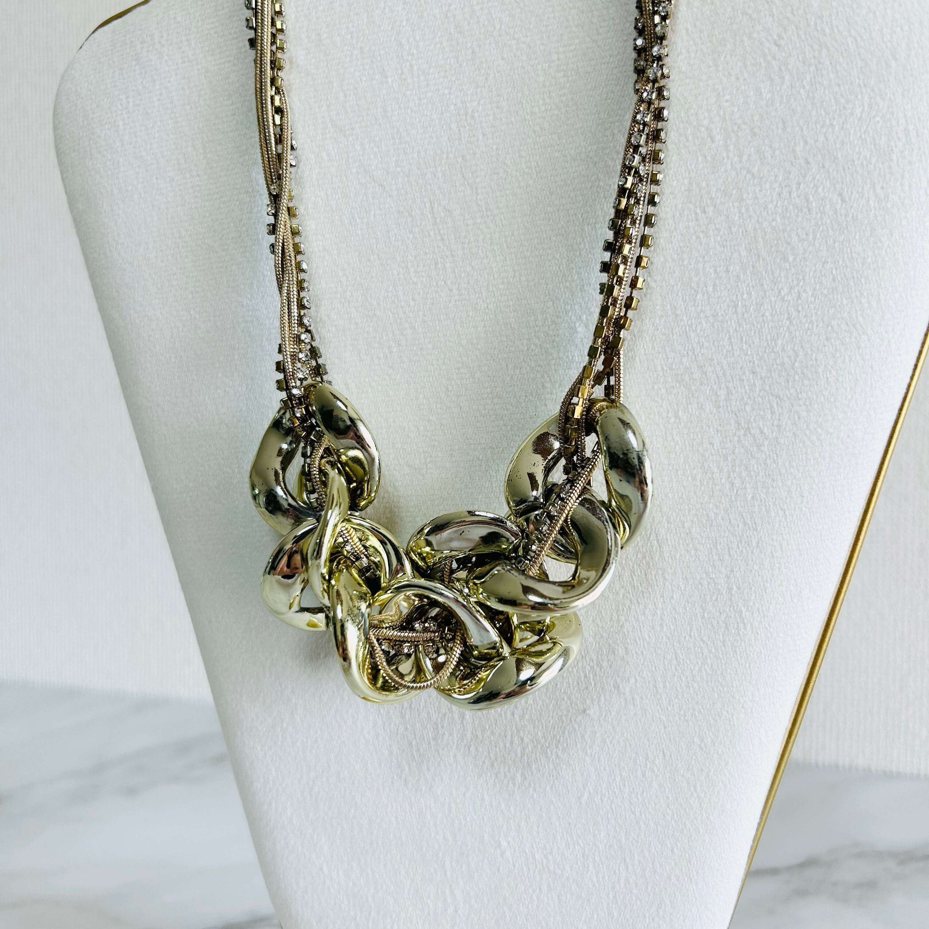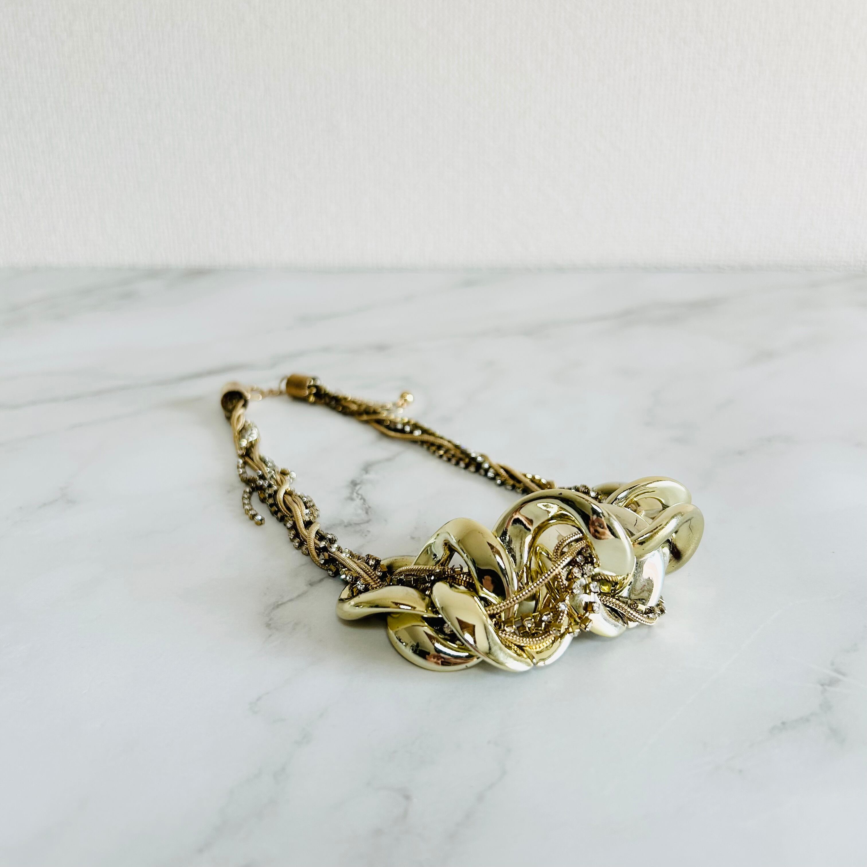 大きなチャンキーチェーンをメインに華奢なチェーンとビジューチェーンを取り付けたスタイリッシュなデザインです。