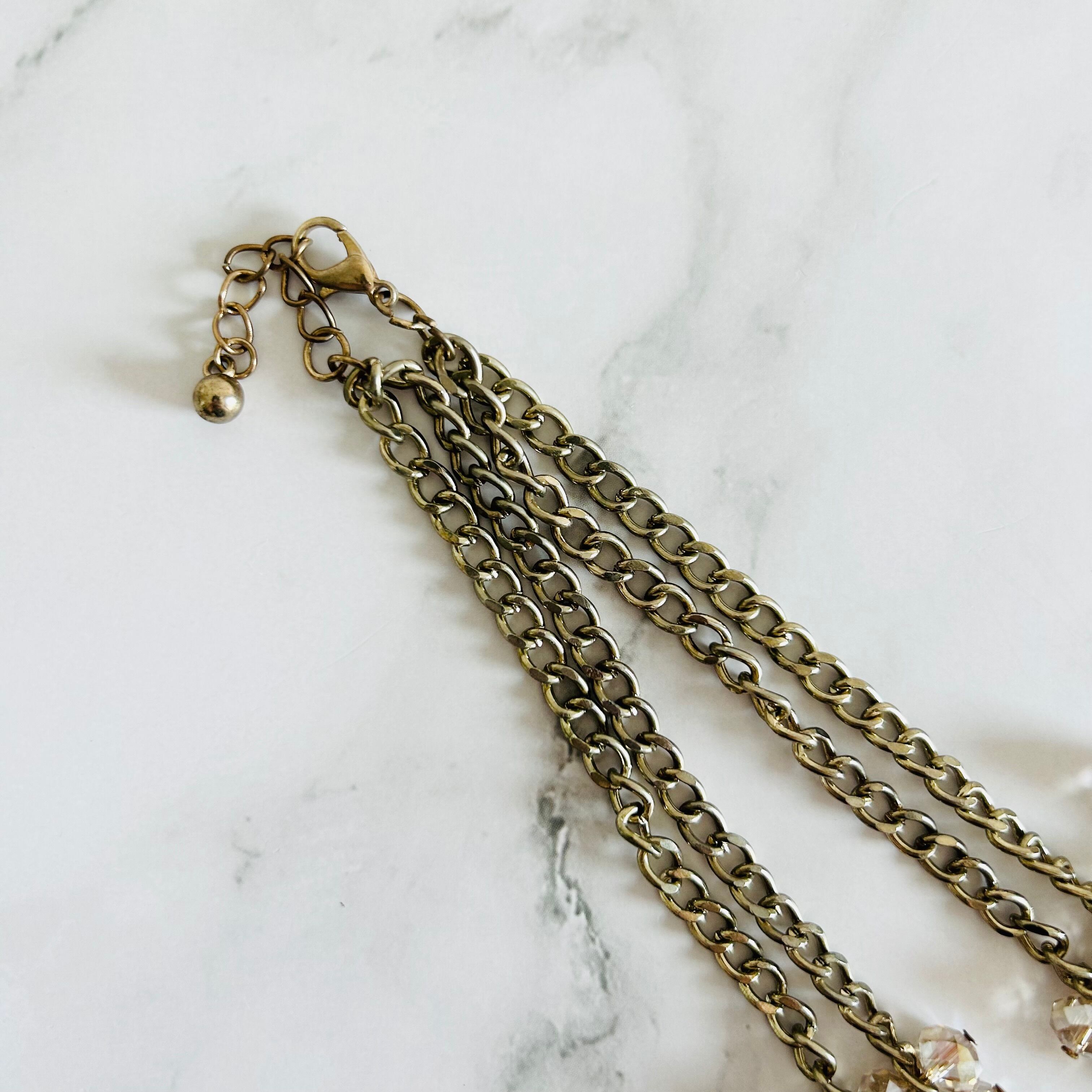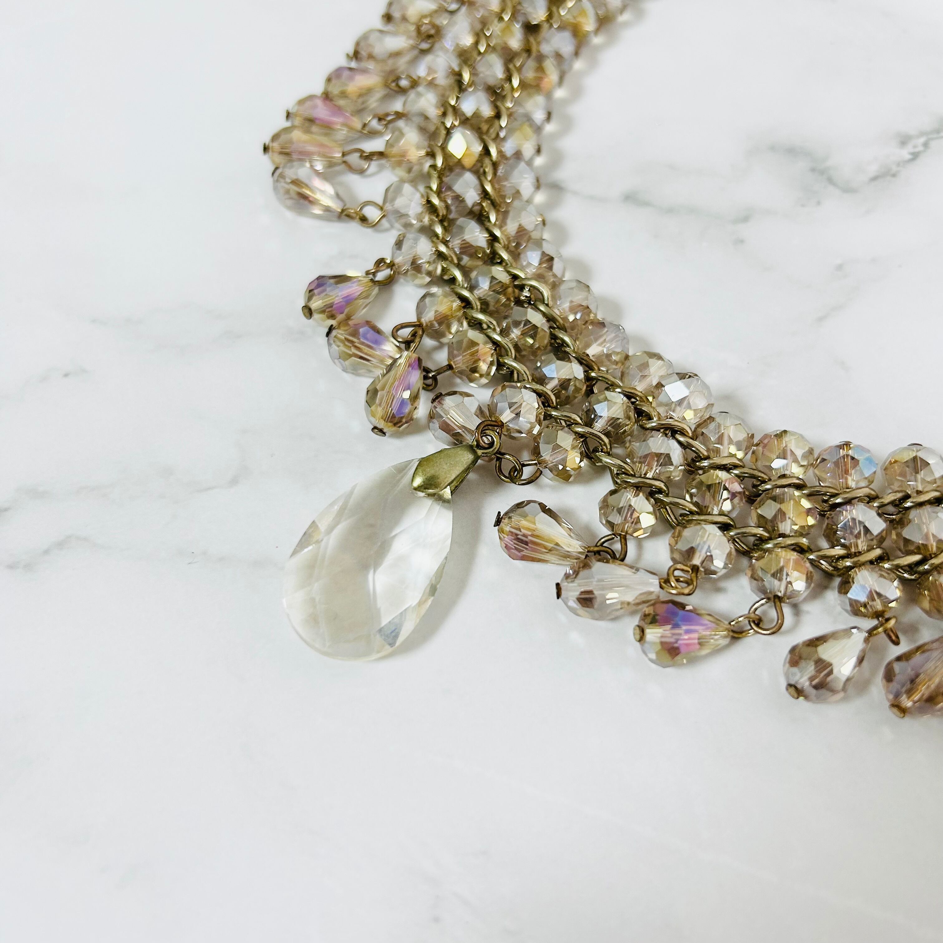 クリスタル素材のオーロラに輝くパーツをふんだんに使用し、アンティークチェーンに繋げあわせたデザインです。
