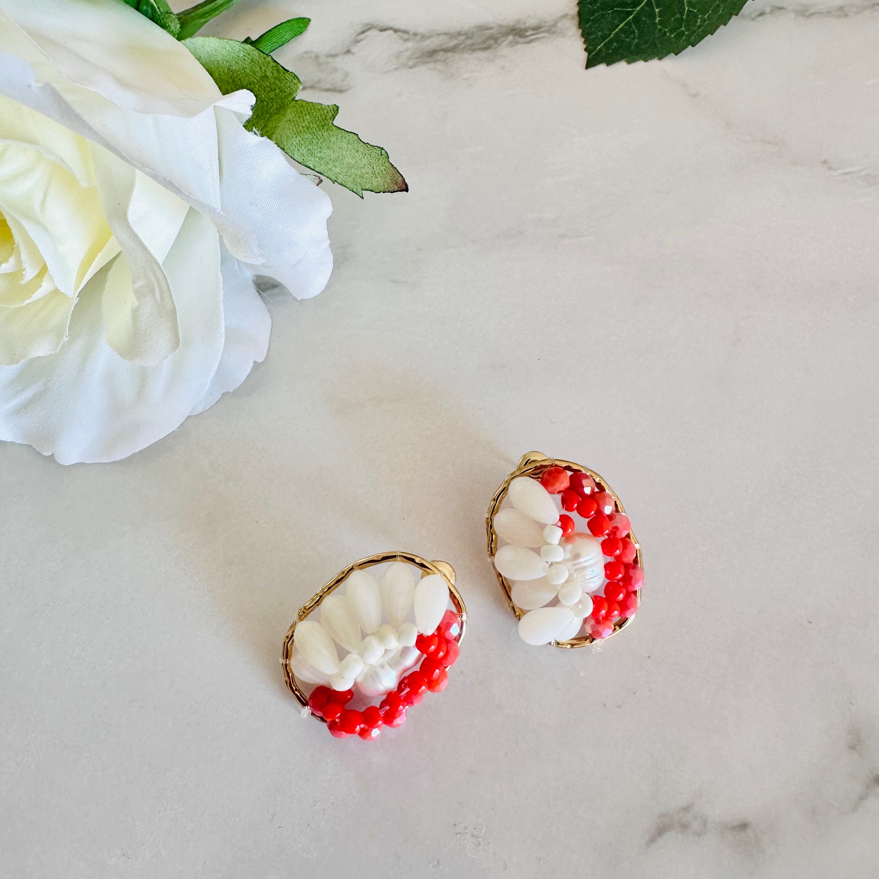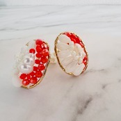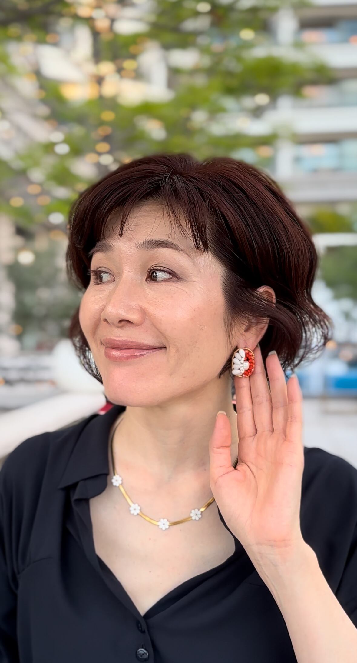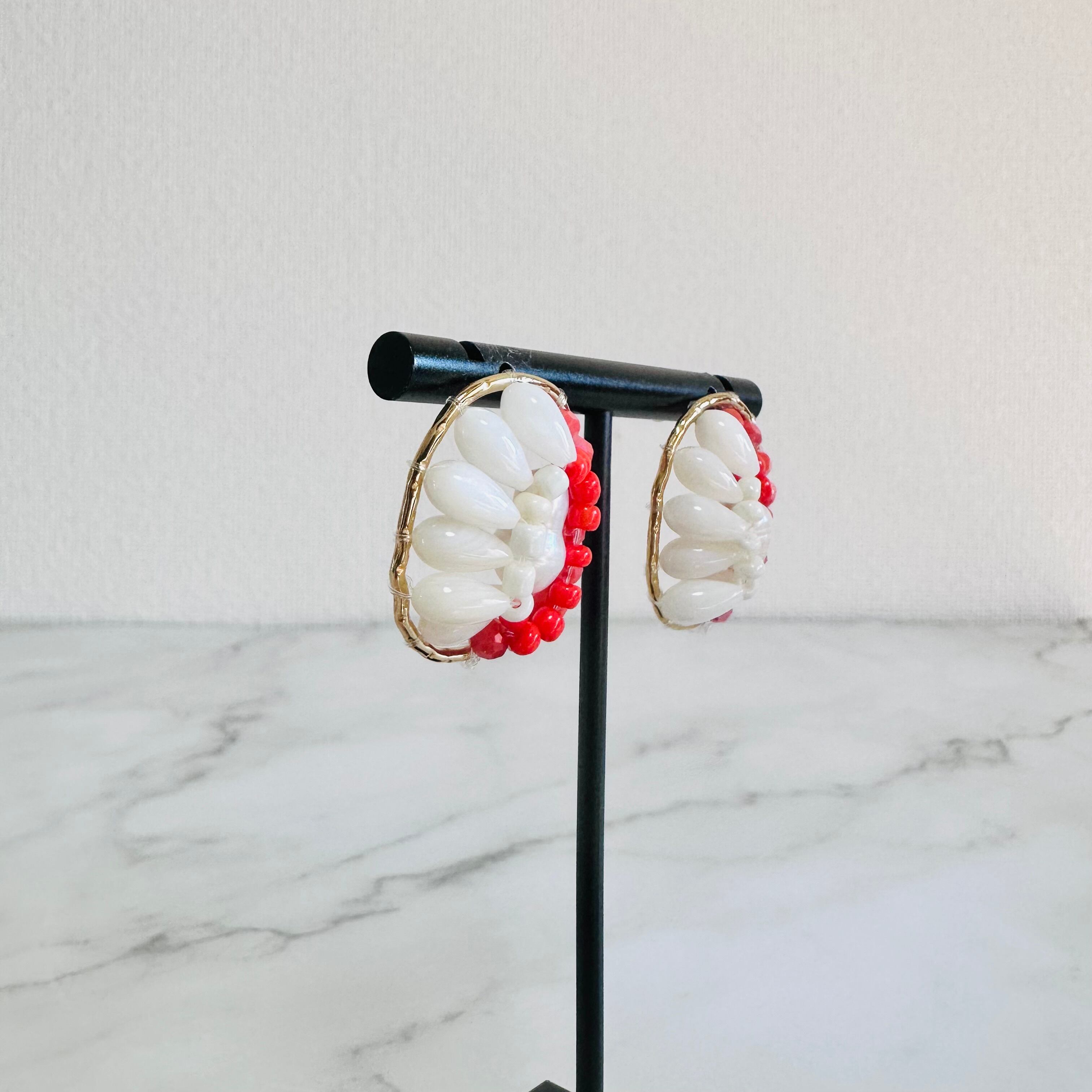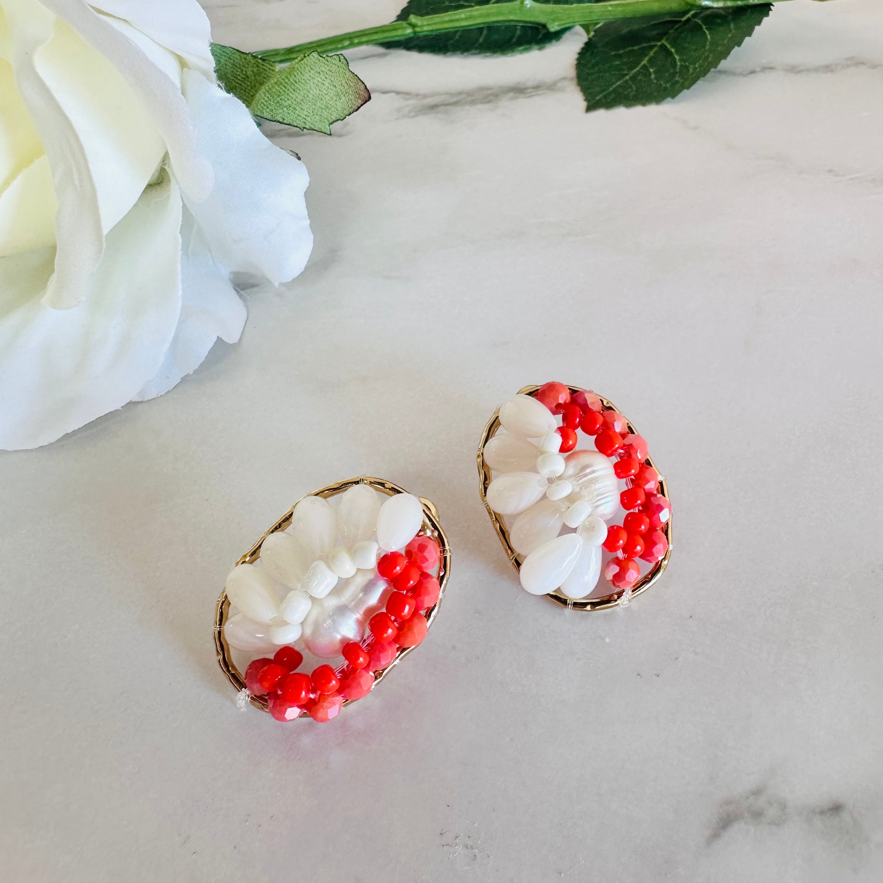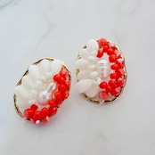 天然のシェルと淡水パールに鮮やかなカラーのクリスタルビーズを使用し、立体的なモチーフに仕上げたデザインです。