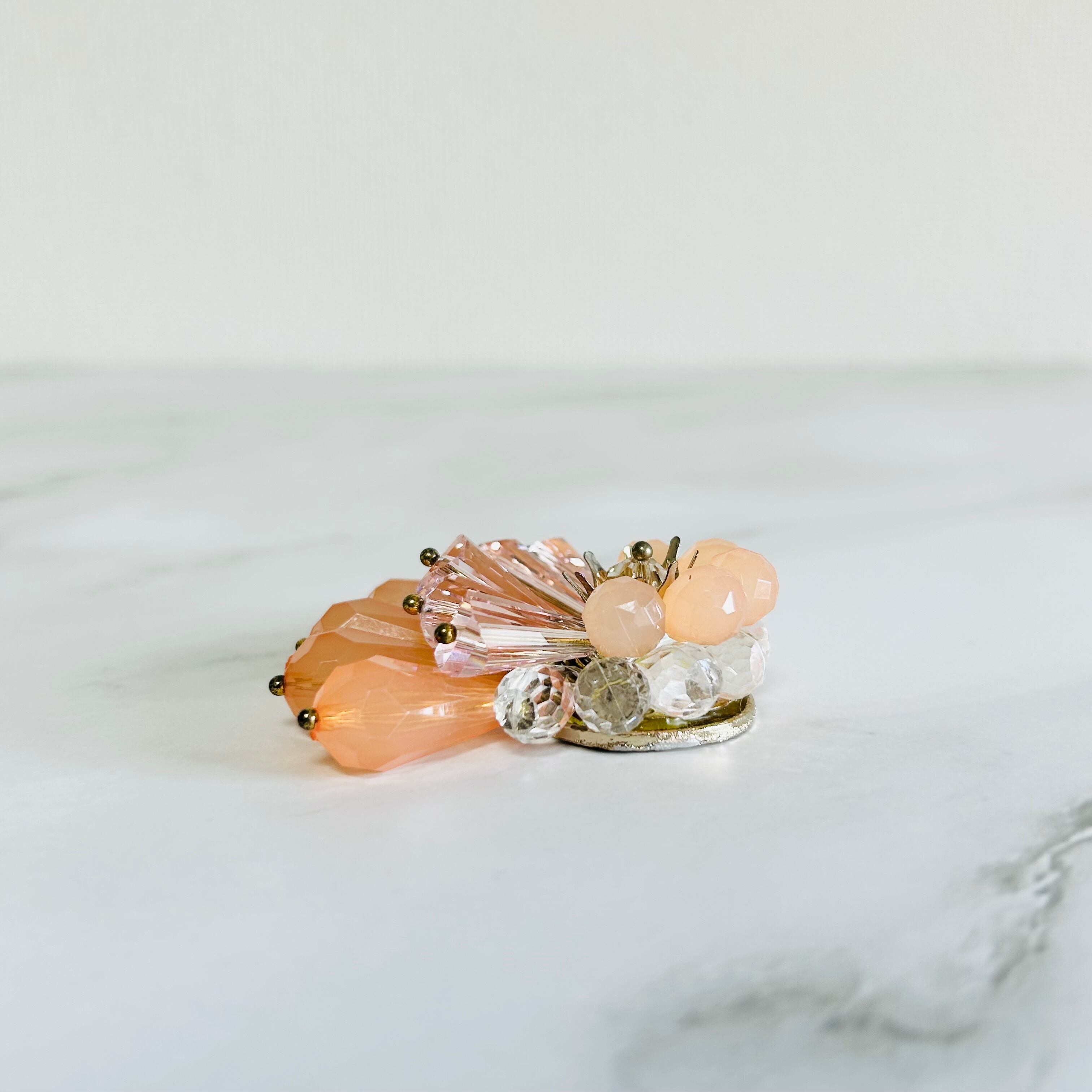 優しいミルキーなオレンジカラーと透明感のあるピンクのアクリルパーツで華やかなモチーフに型取りったデザインです。
