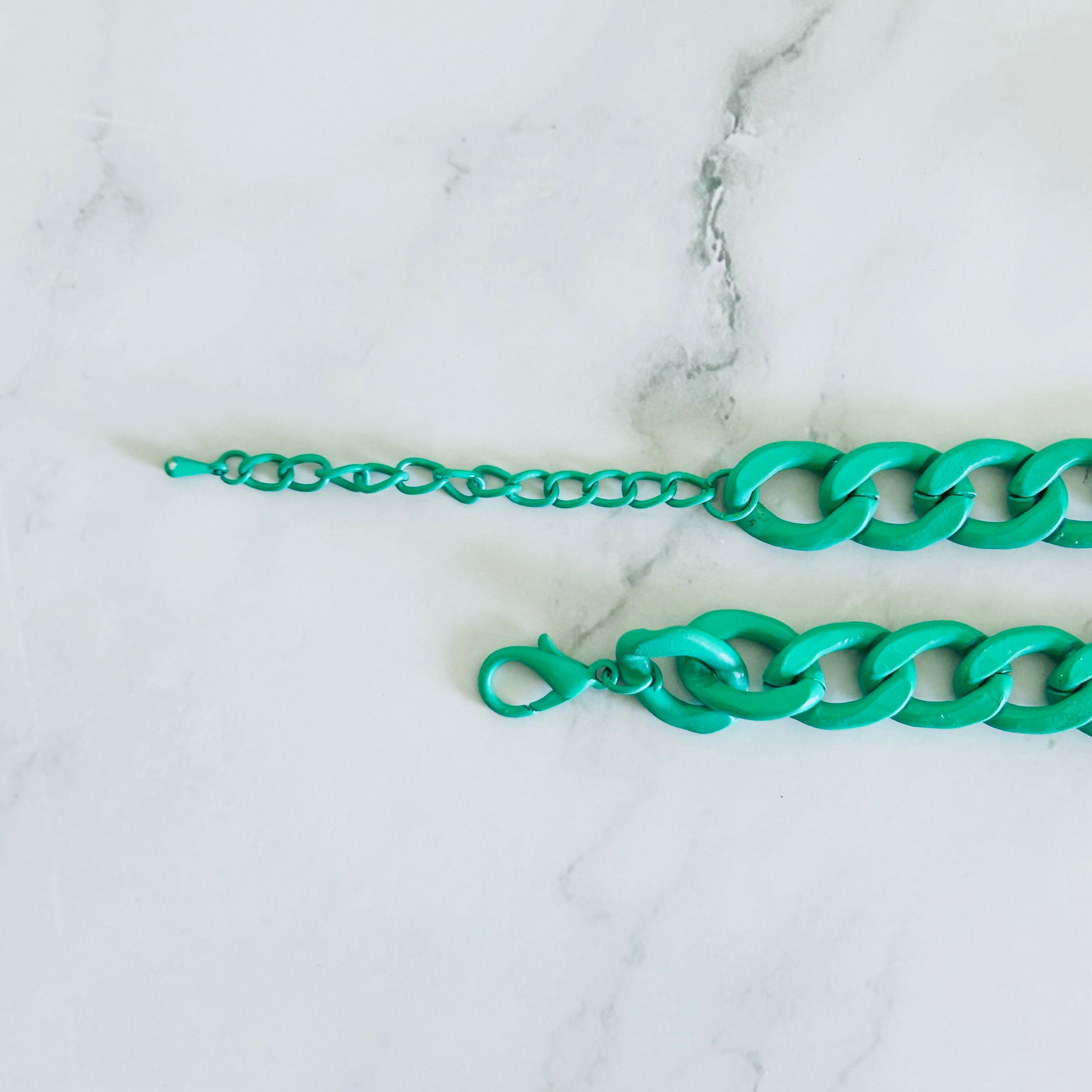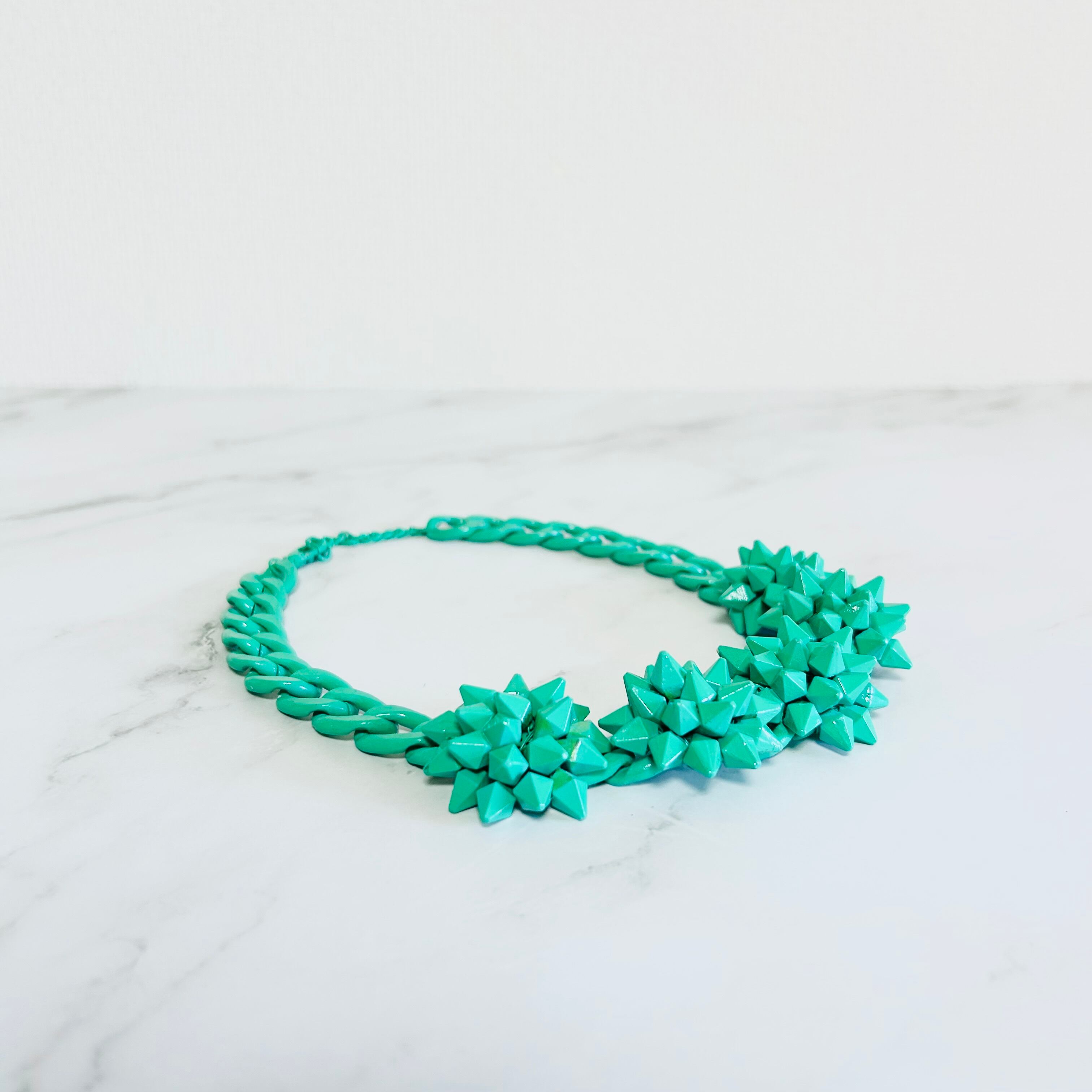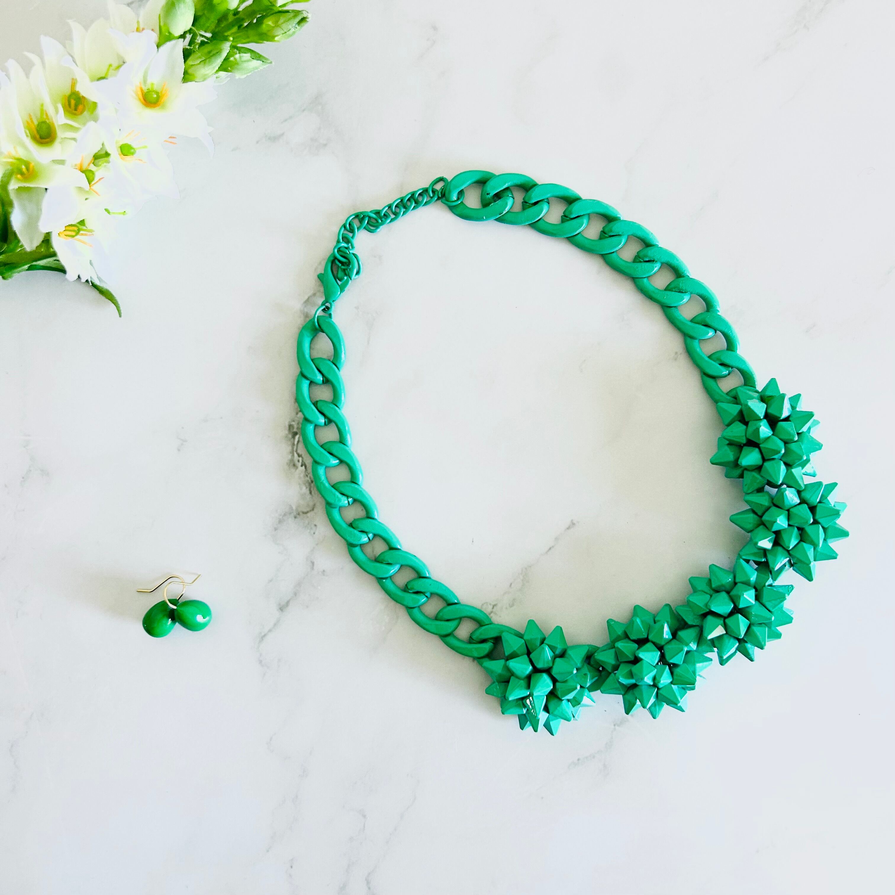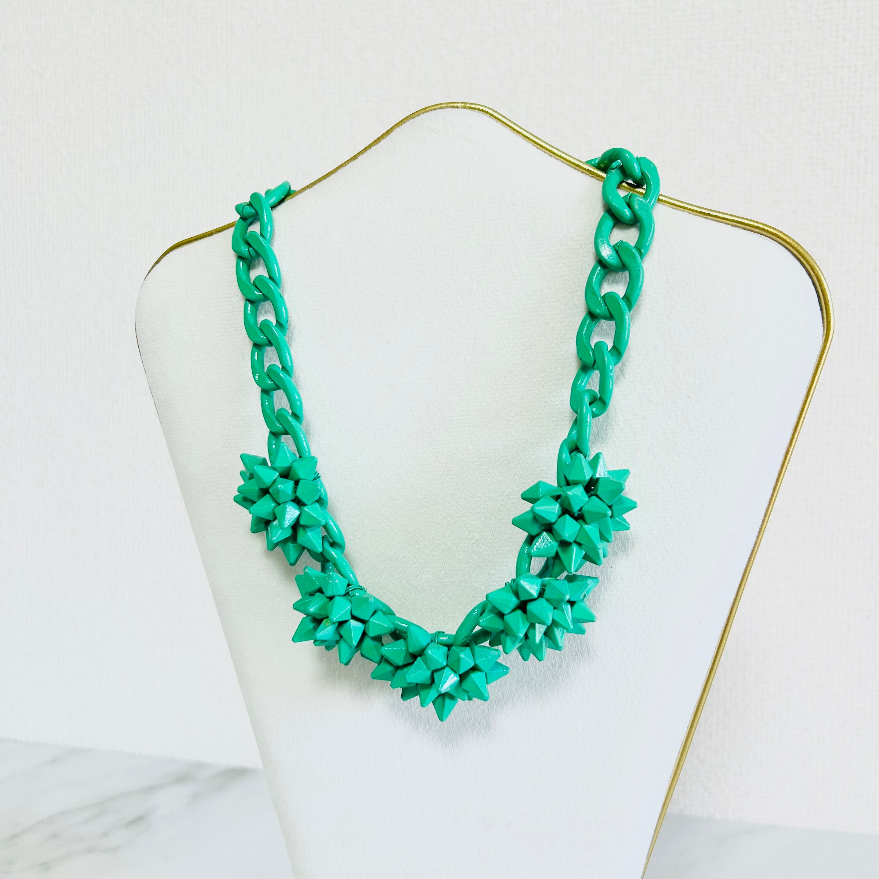 太め幅のチャンキーチェーンにユニークなフラワーモチーフを取り付け、全体をグリーンカラーで統一したデザインです✨