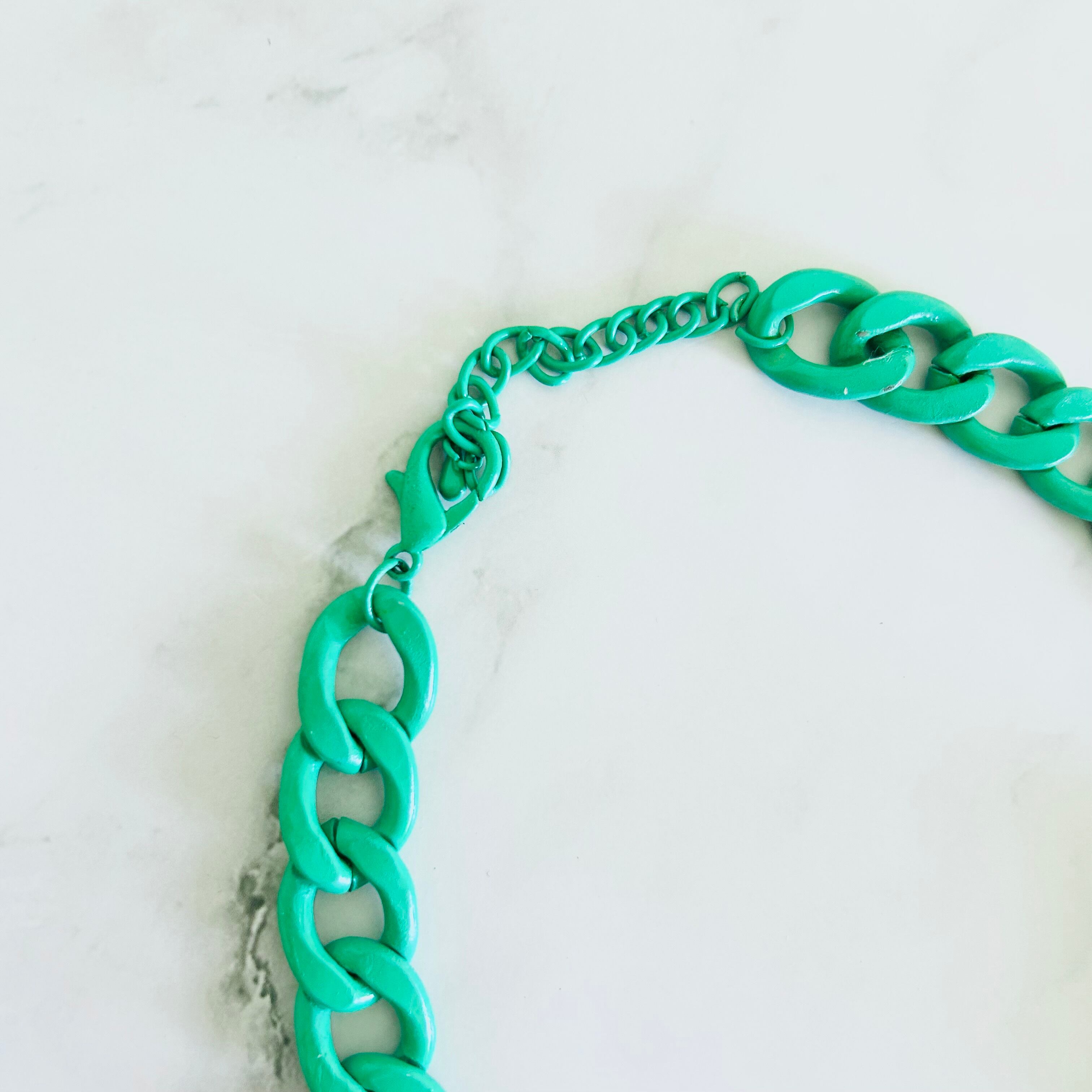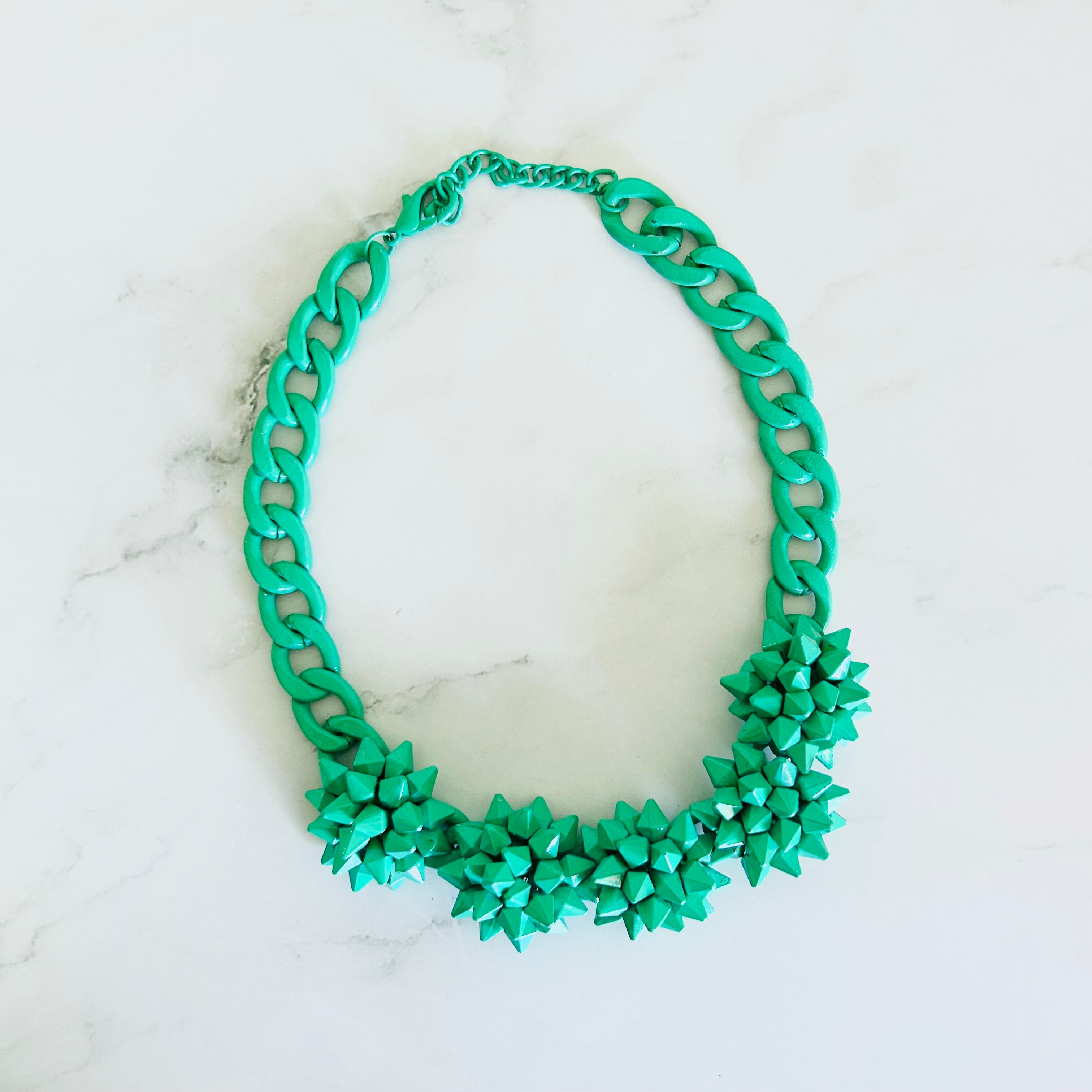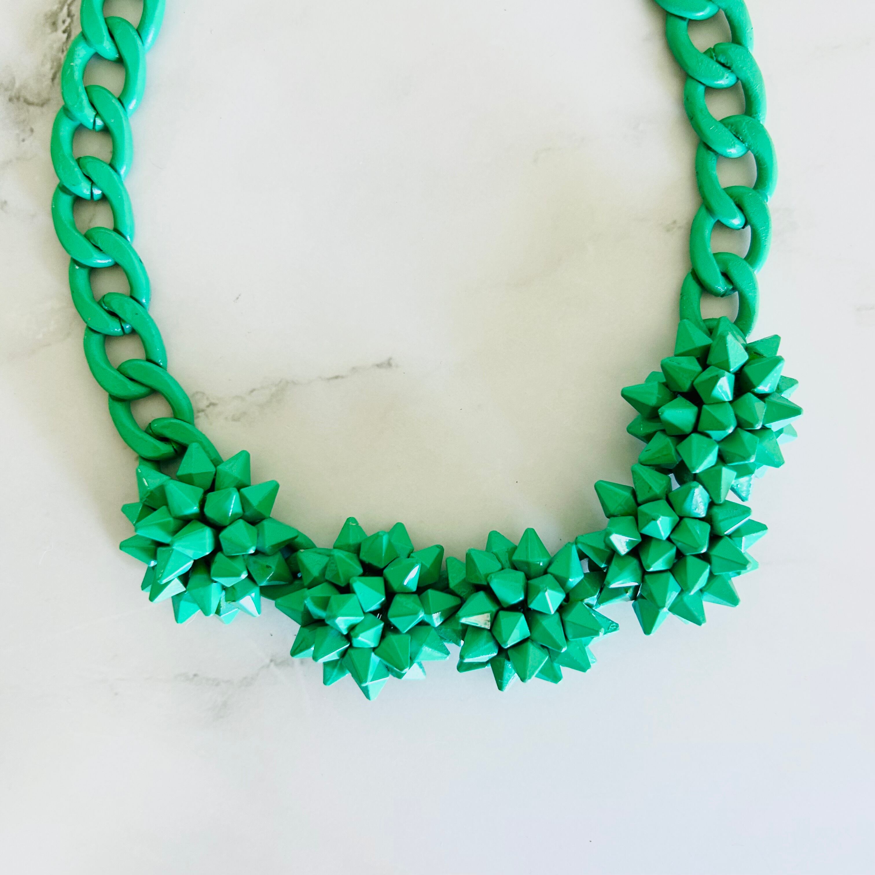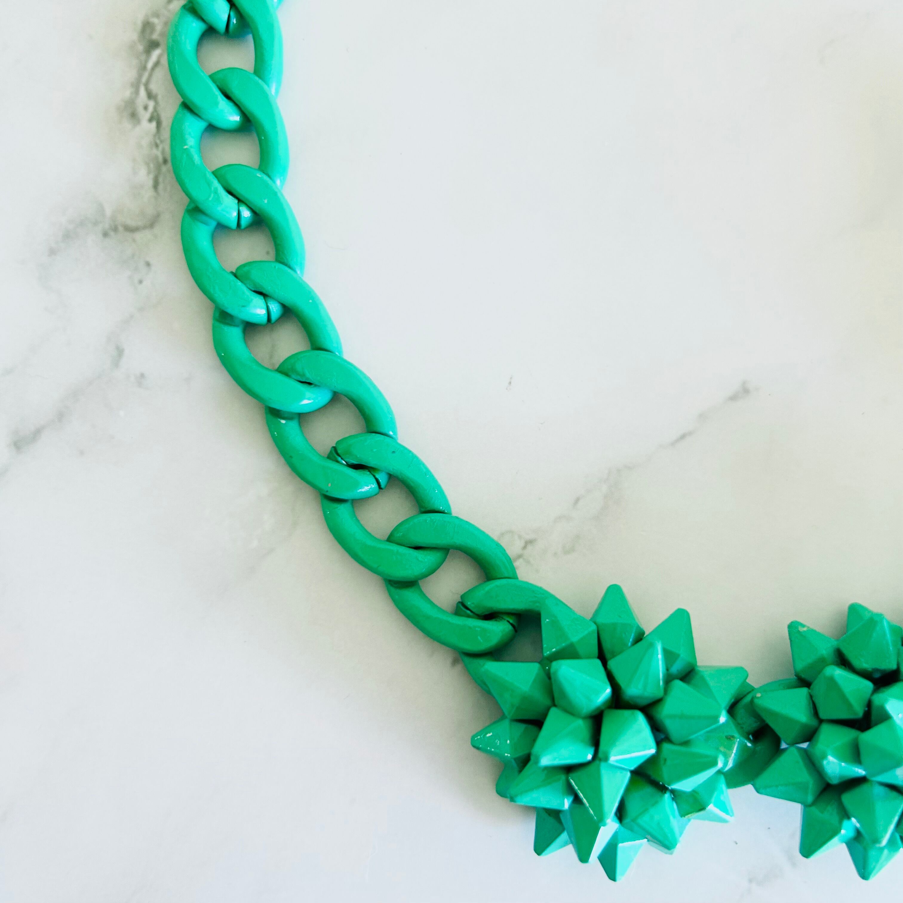 太め幅のチャンキーチェーンにユニークなフラワーモチーフを取り付け、全体をグリーンカラーで統一したデザインです✨
