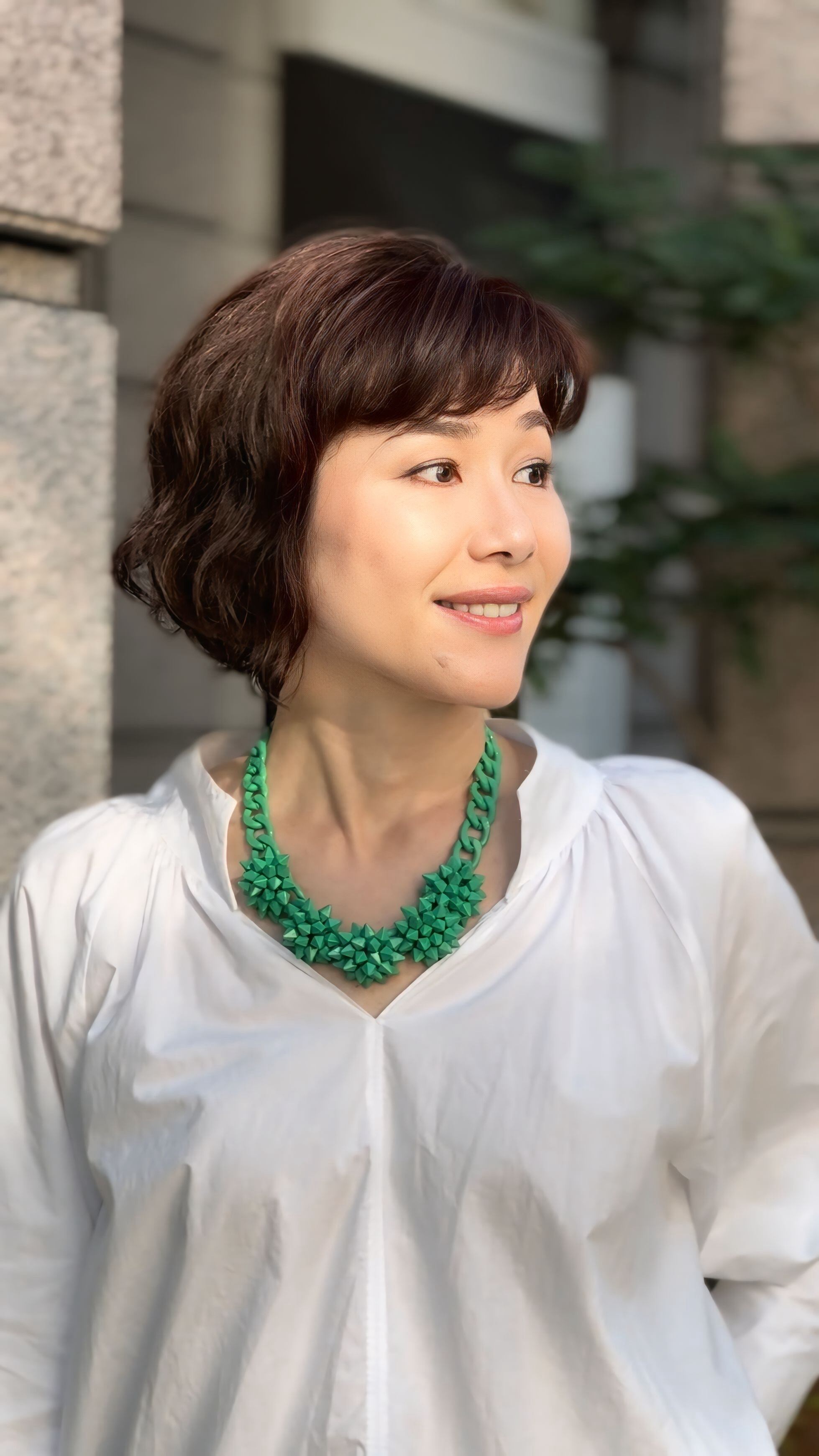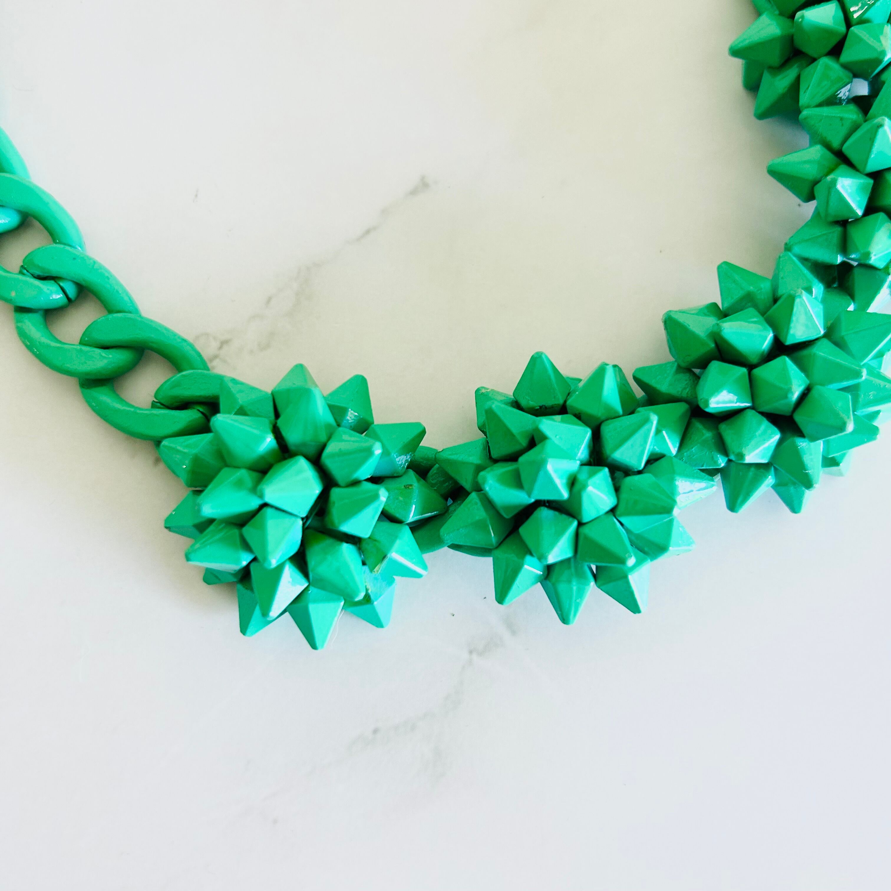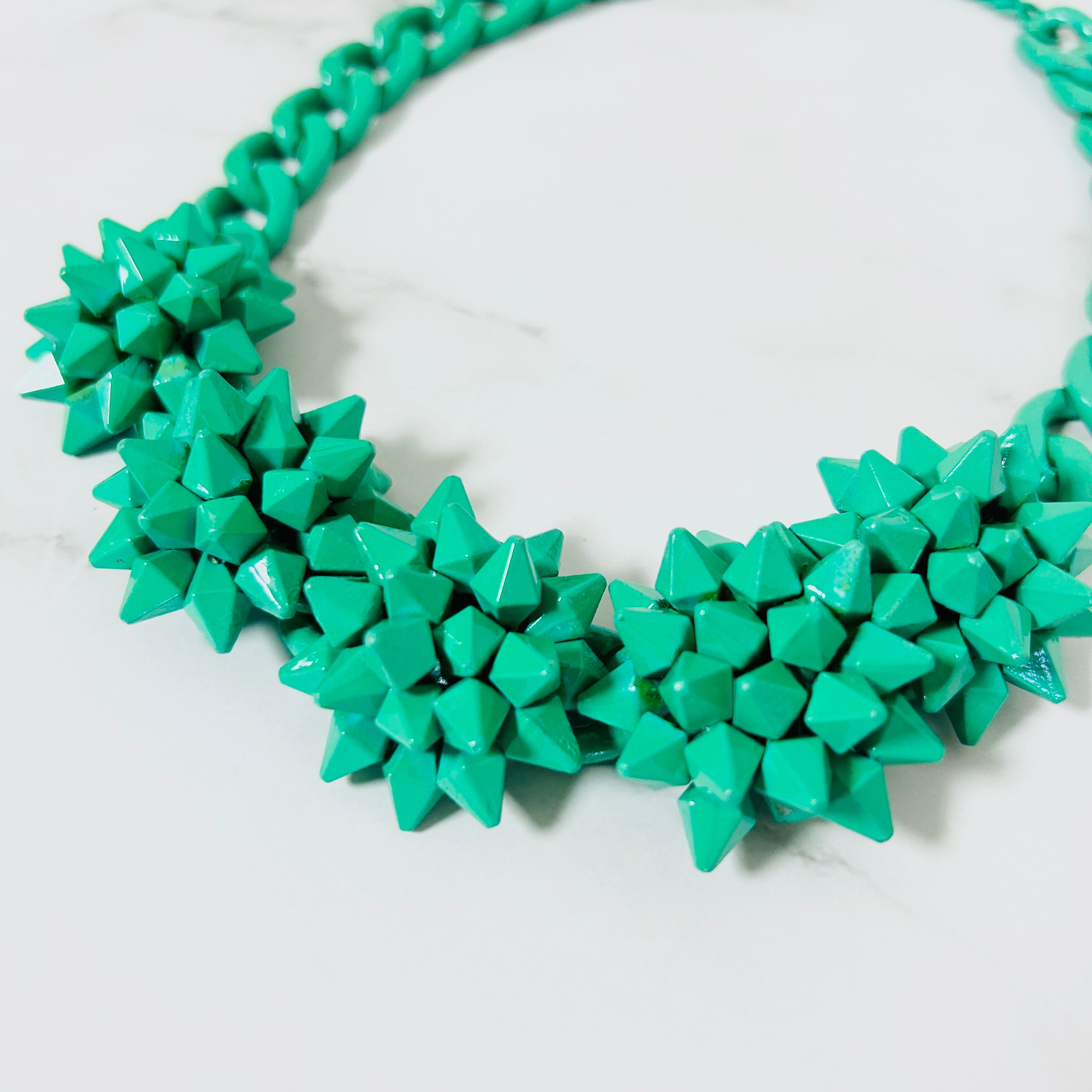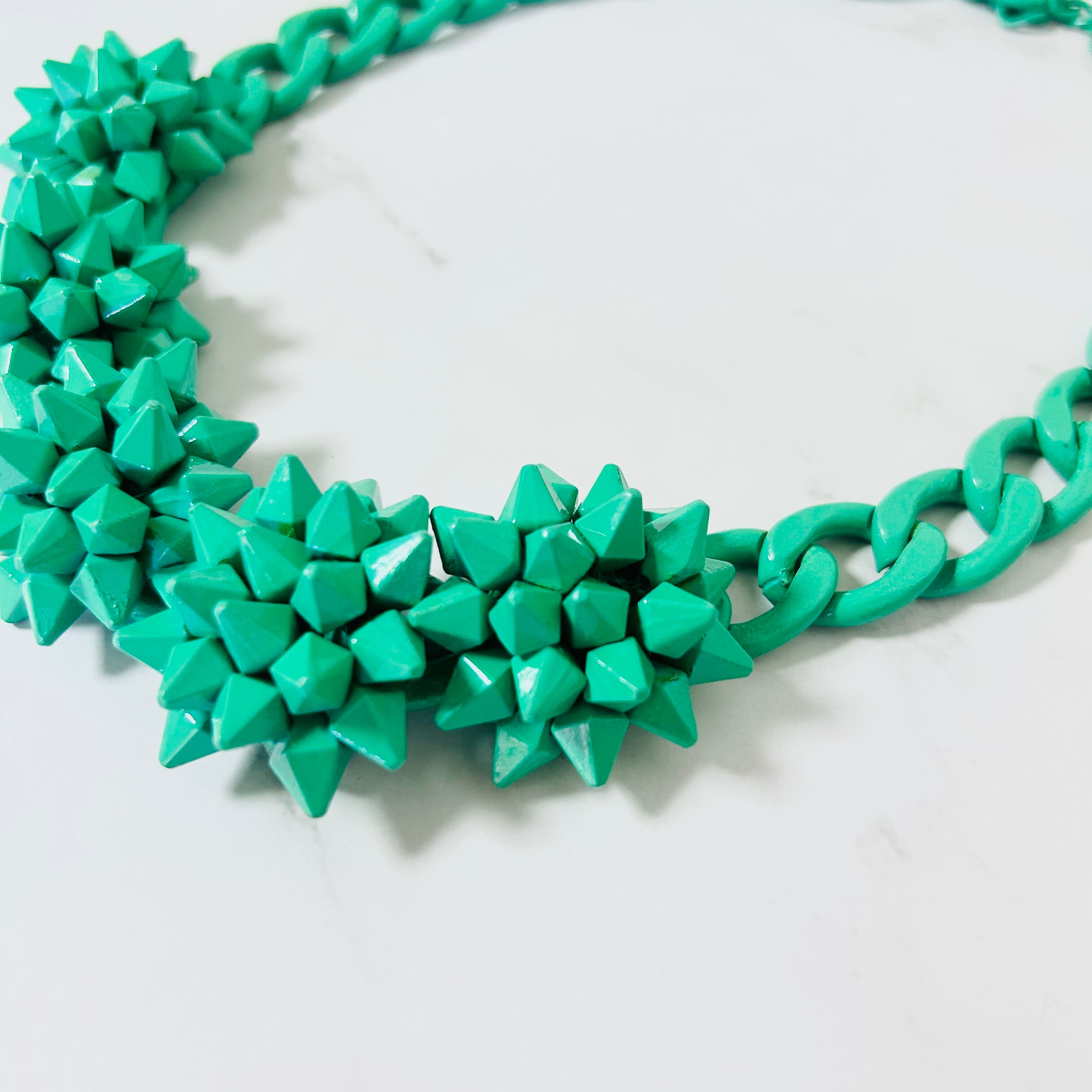 太め幅のチャンキーチェーンにユニークなフラワーモチーフを取り付け、全体をグリーンカラーで統一したデザインです✨