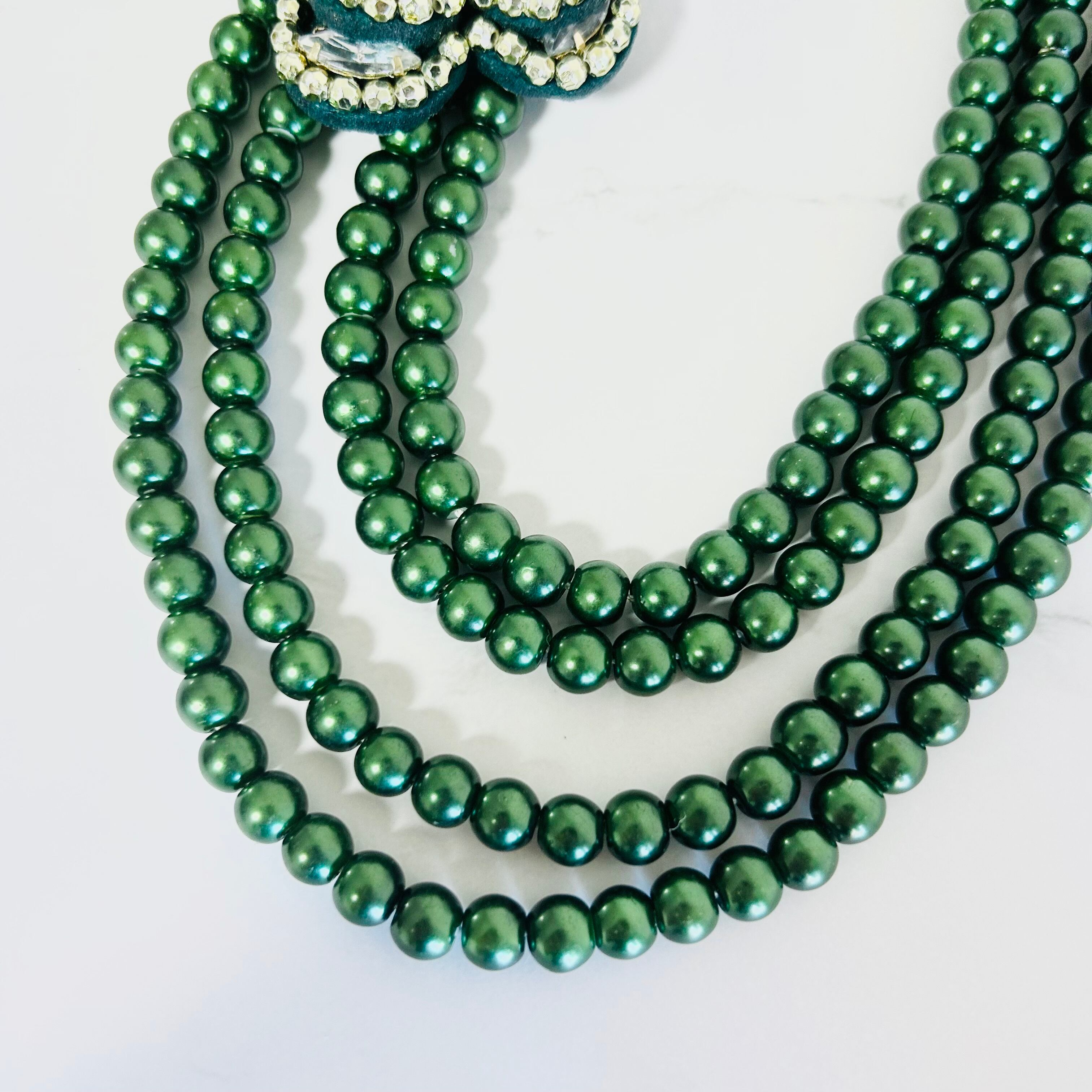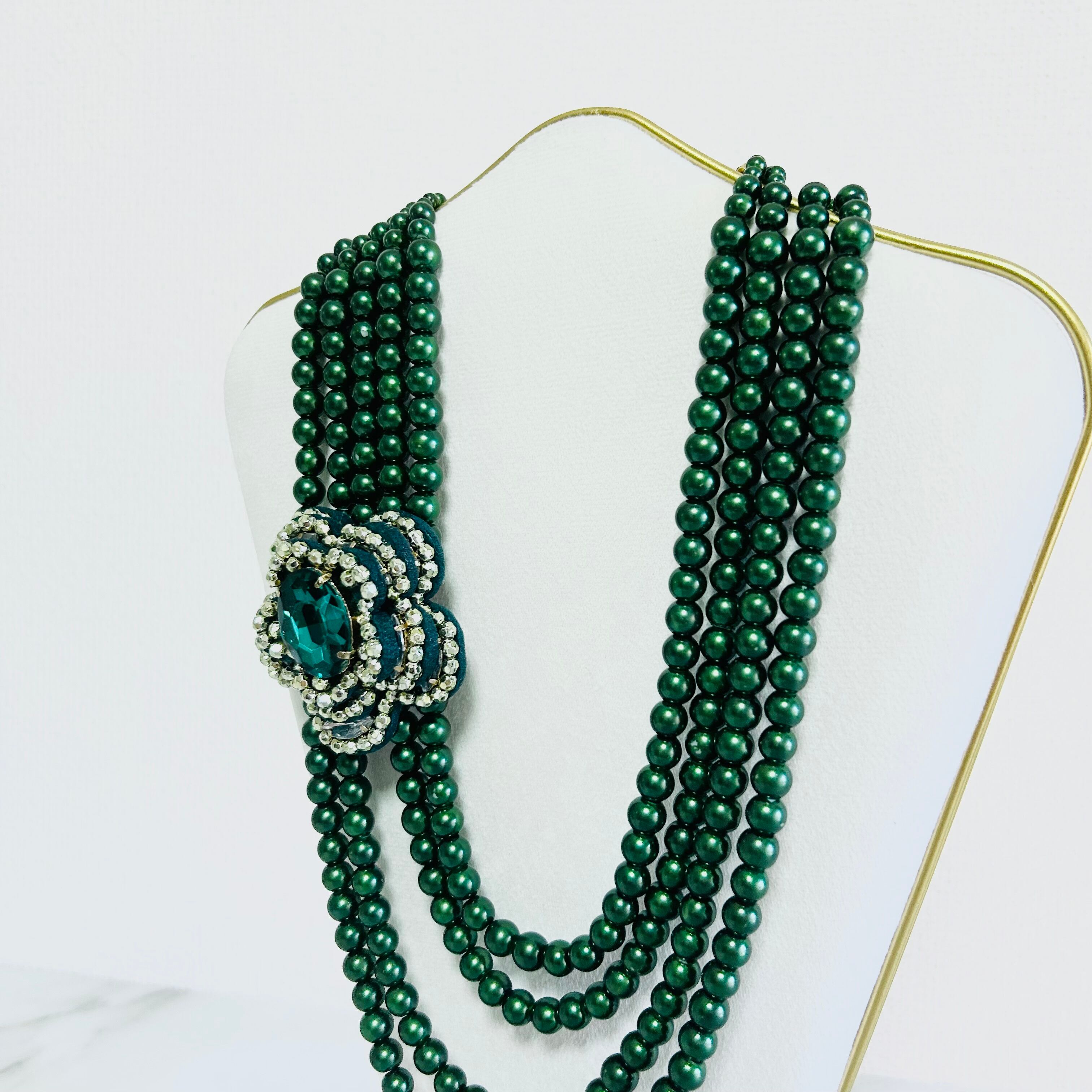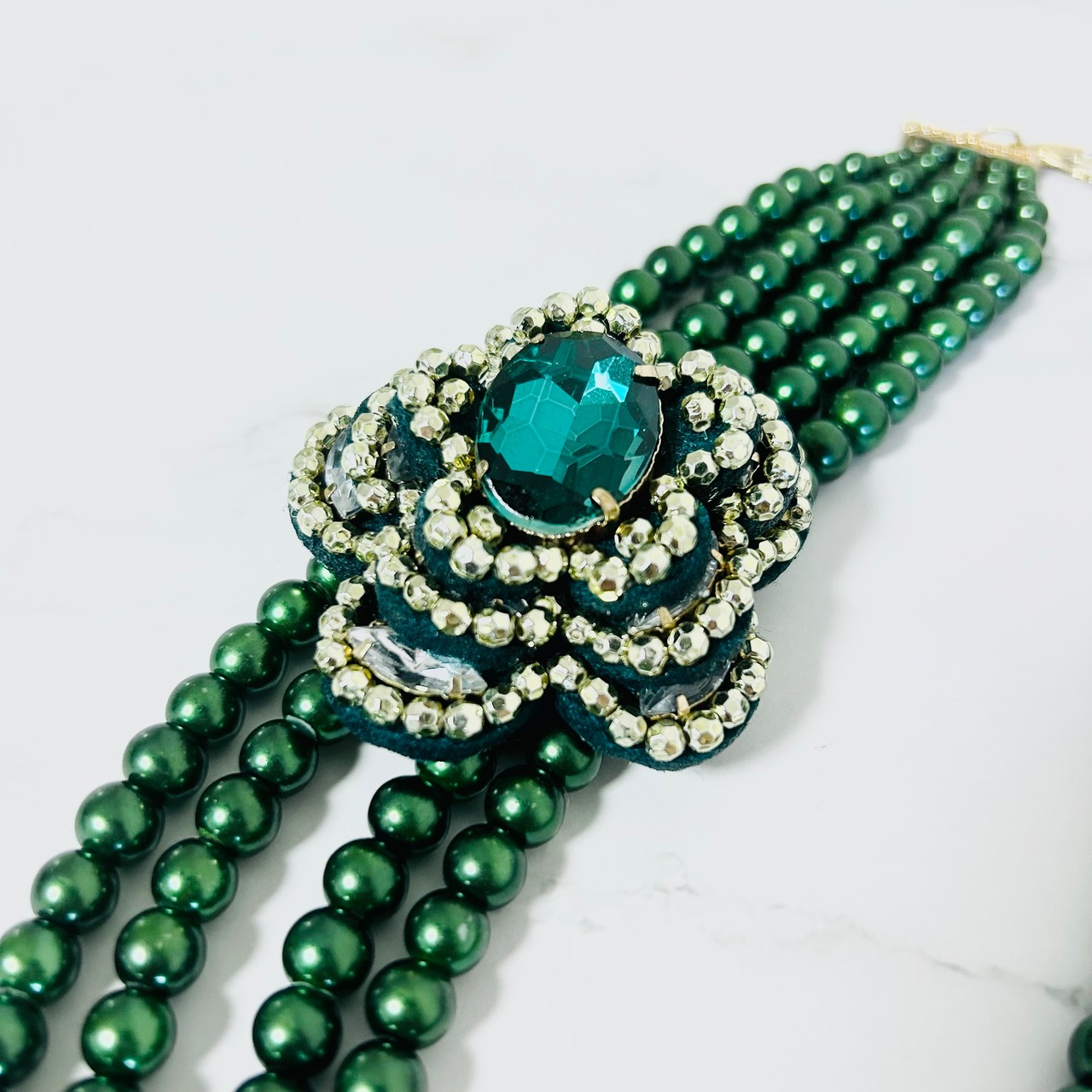 メタリック感のある光沢が美しいグリーンカラーよパールを使用し、大きなビジューが特徴的なフラワーモチーフをプラスした上品さと華やかさを兼ね備えたデザインです。
