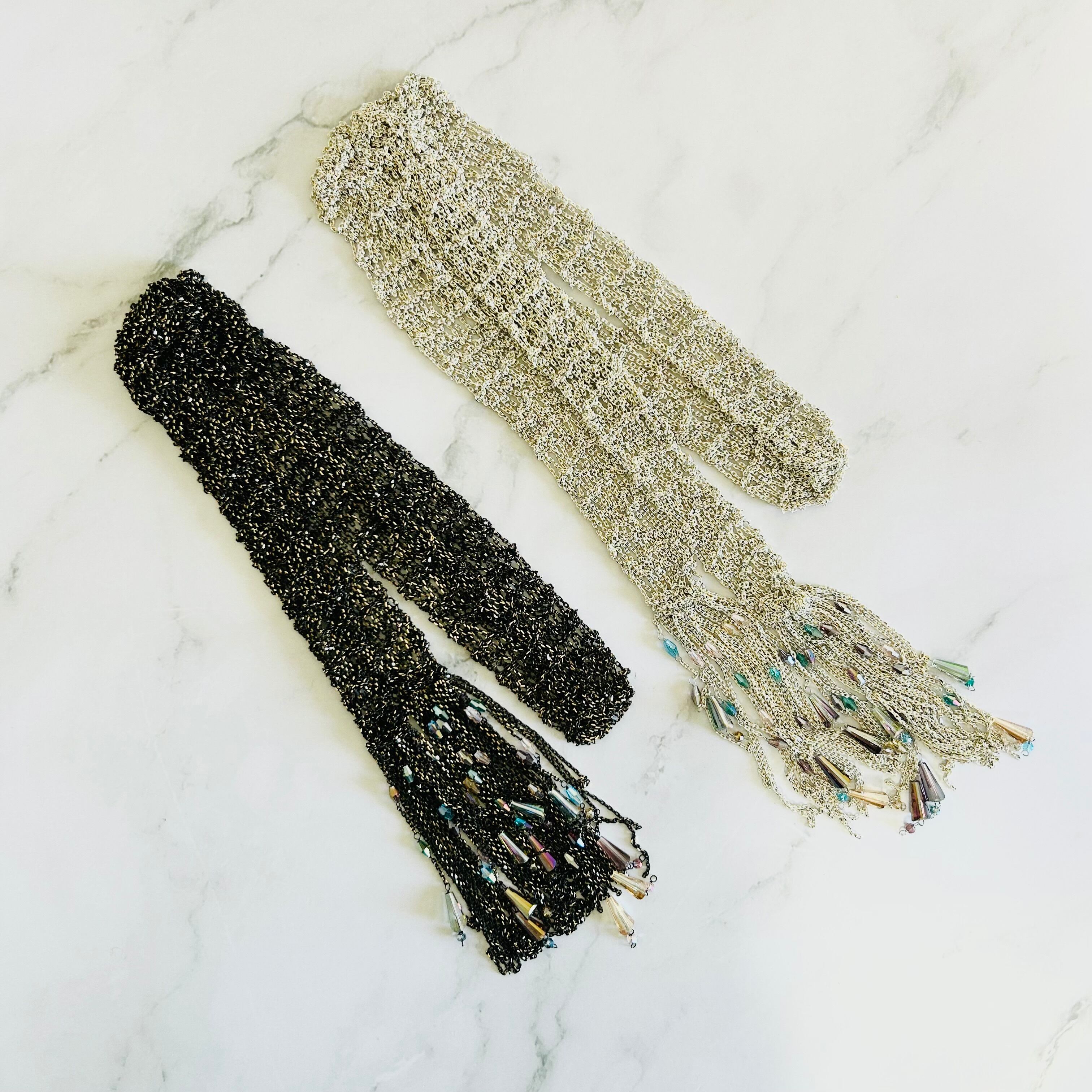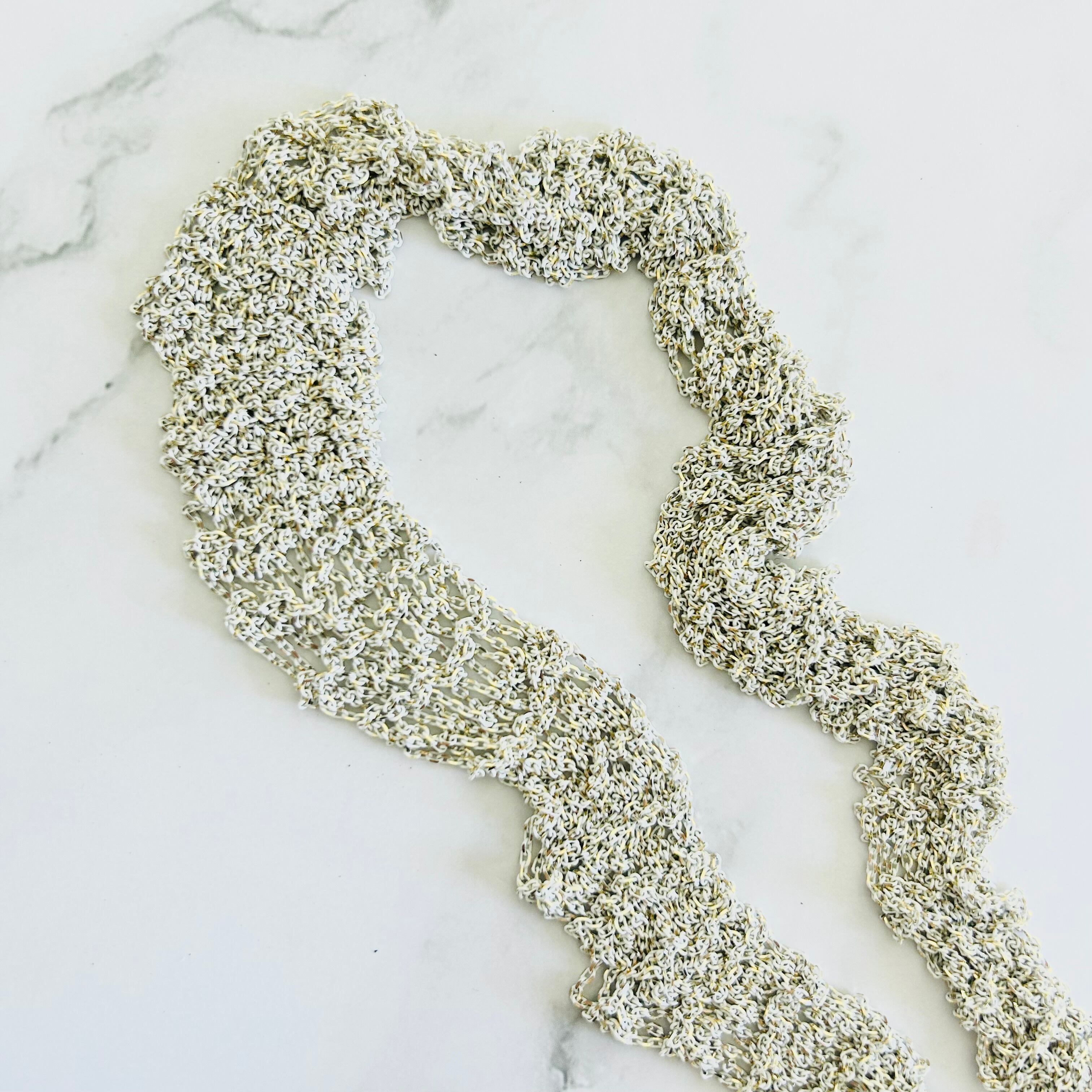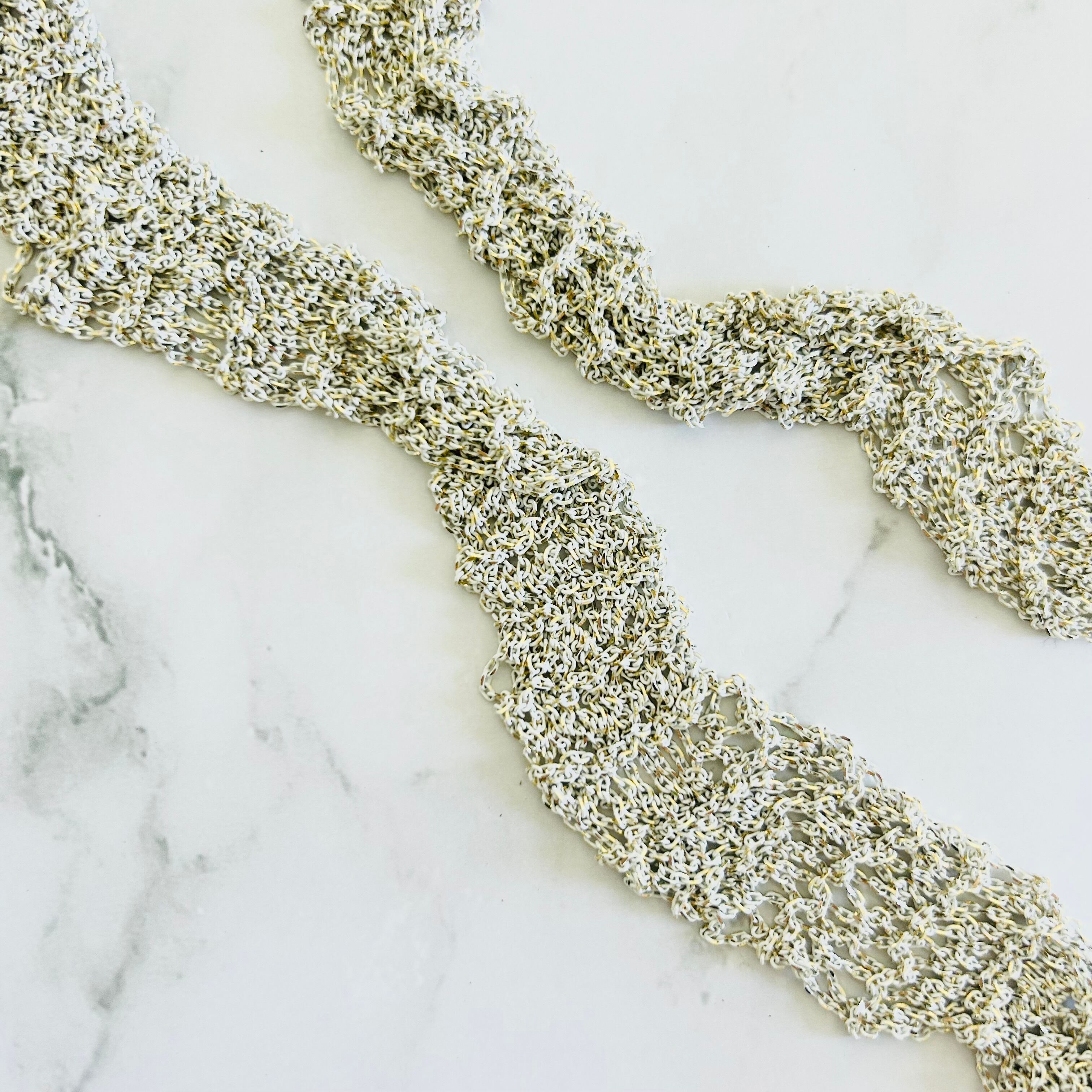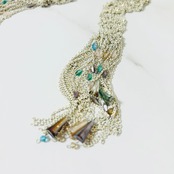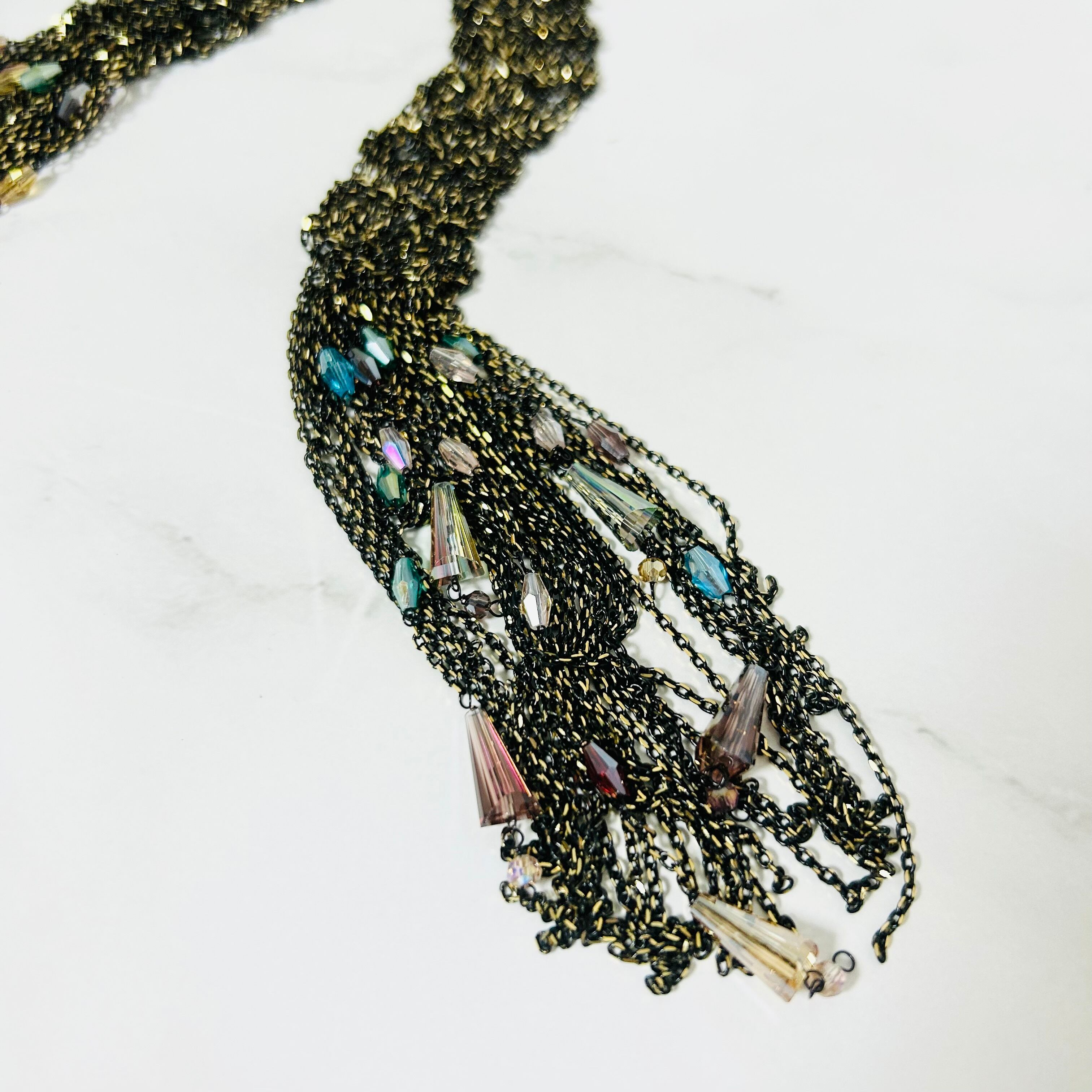 繊細なチェーンを織り交ぜ、先端付近にオーロラに輝くクリスタルビーズのパーツをあしらったフリンジデザインです。