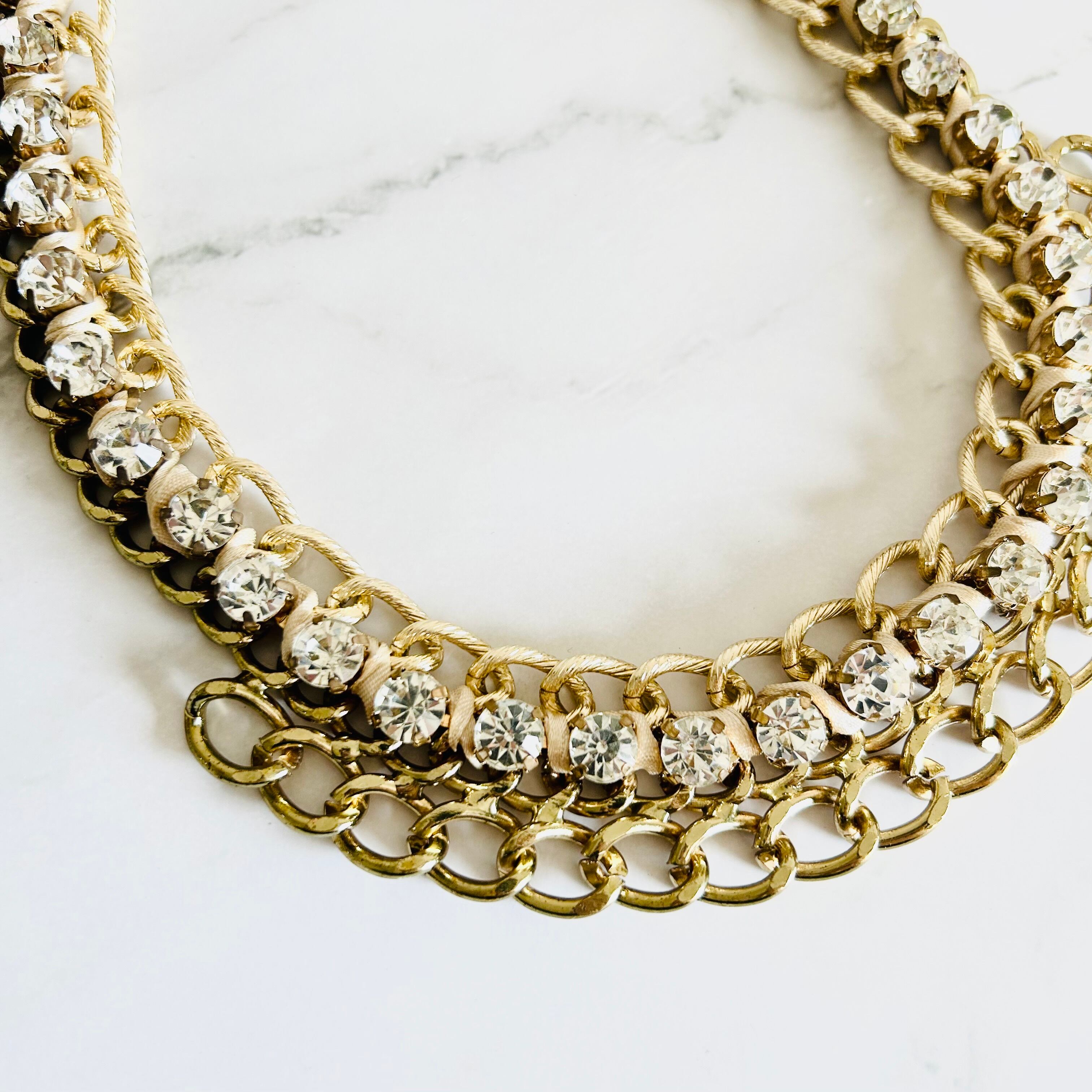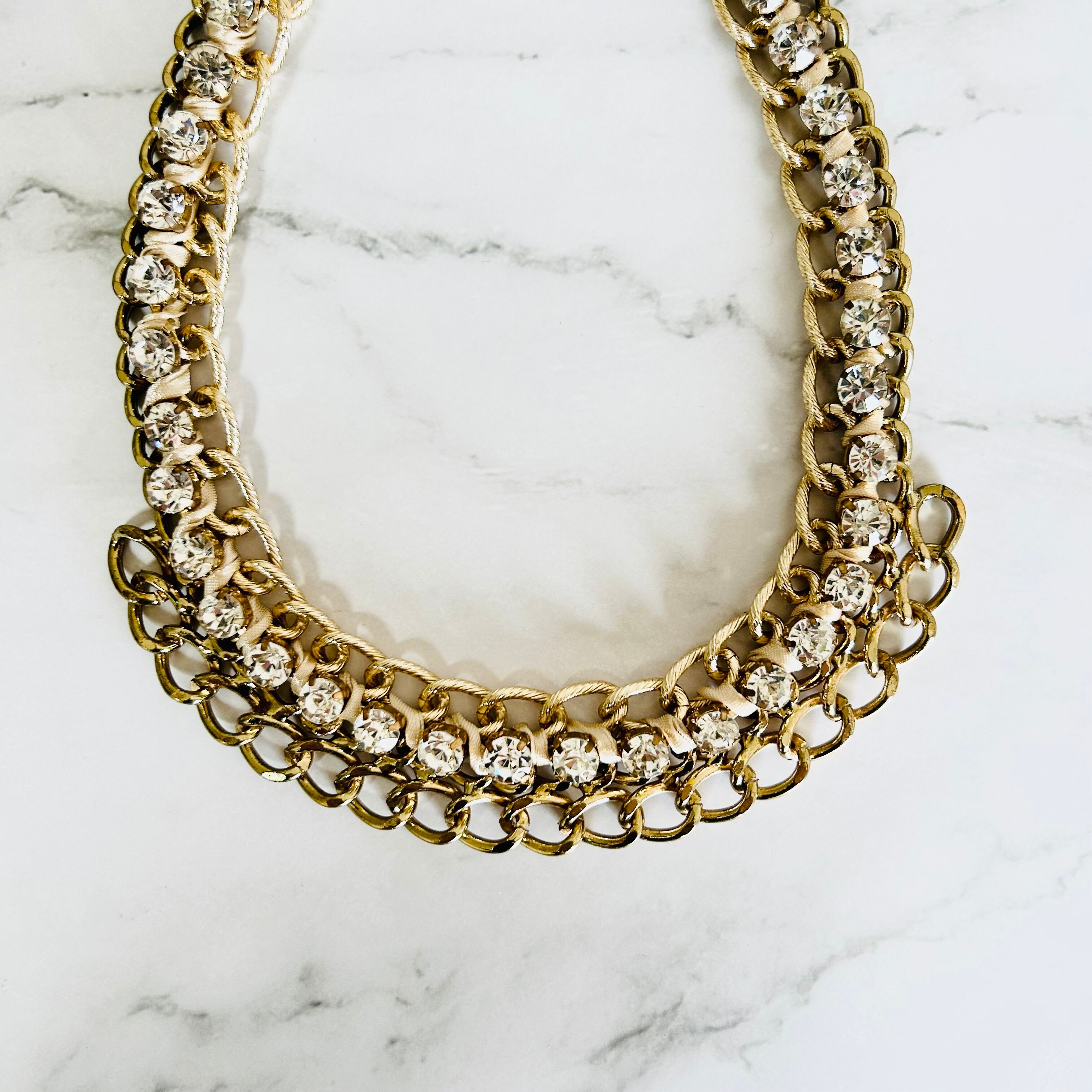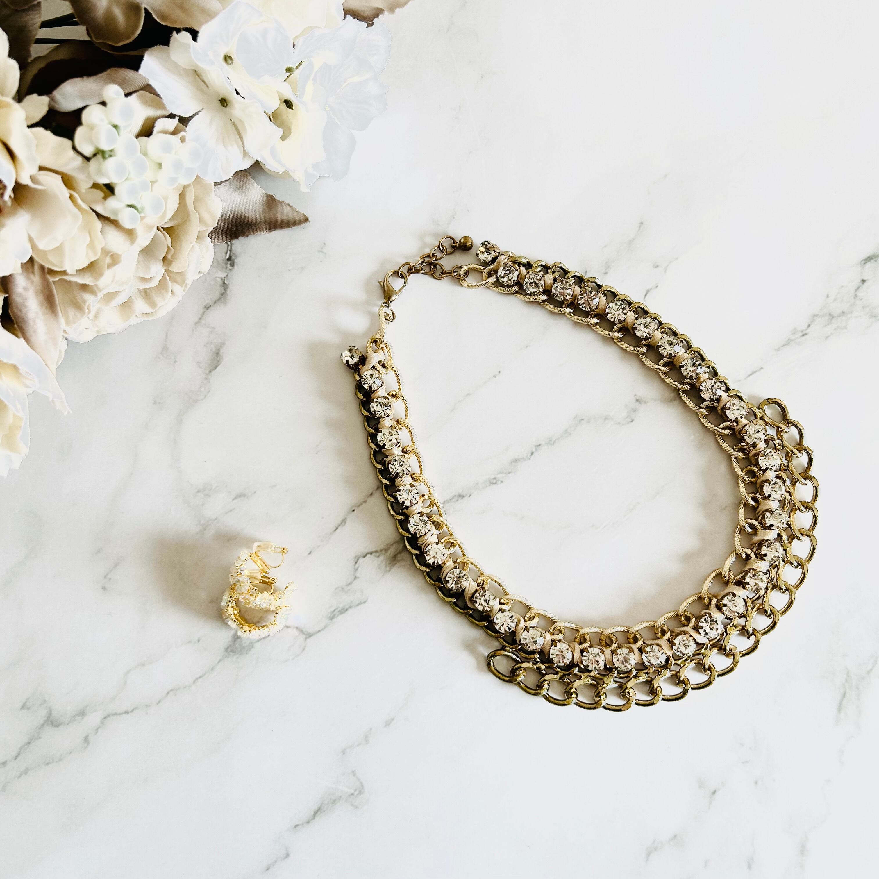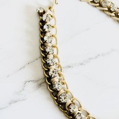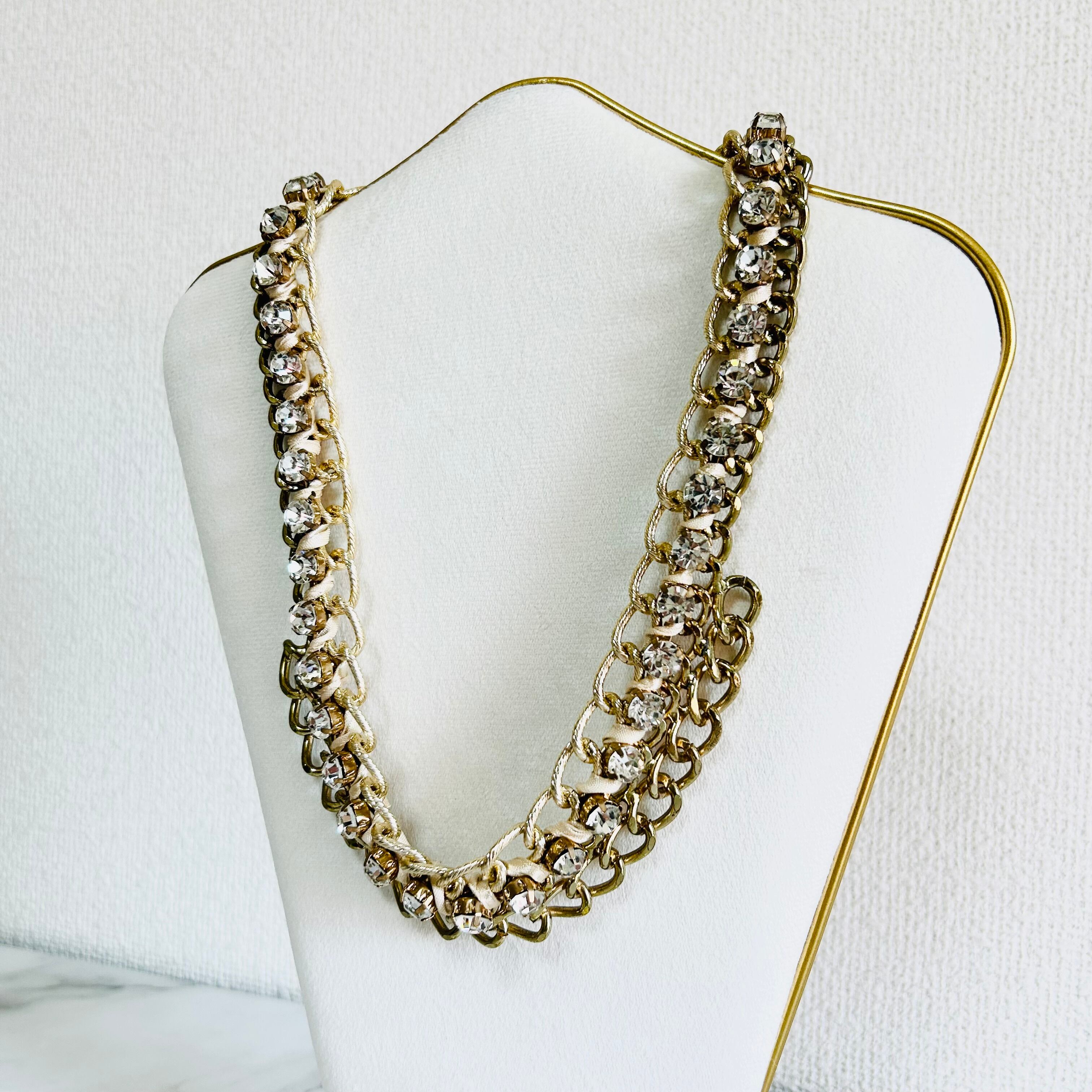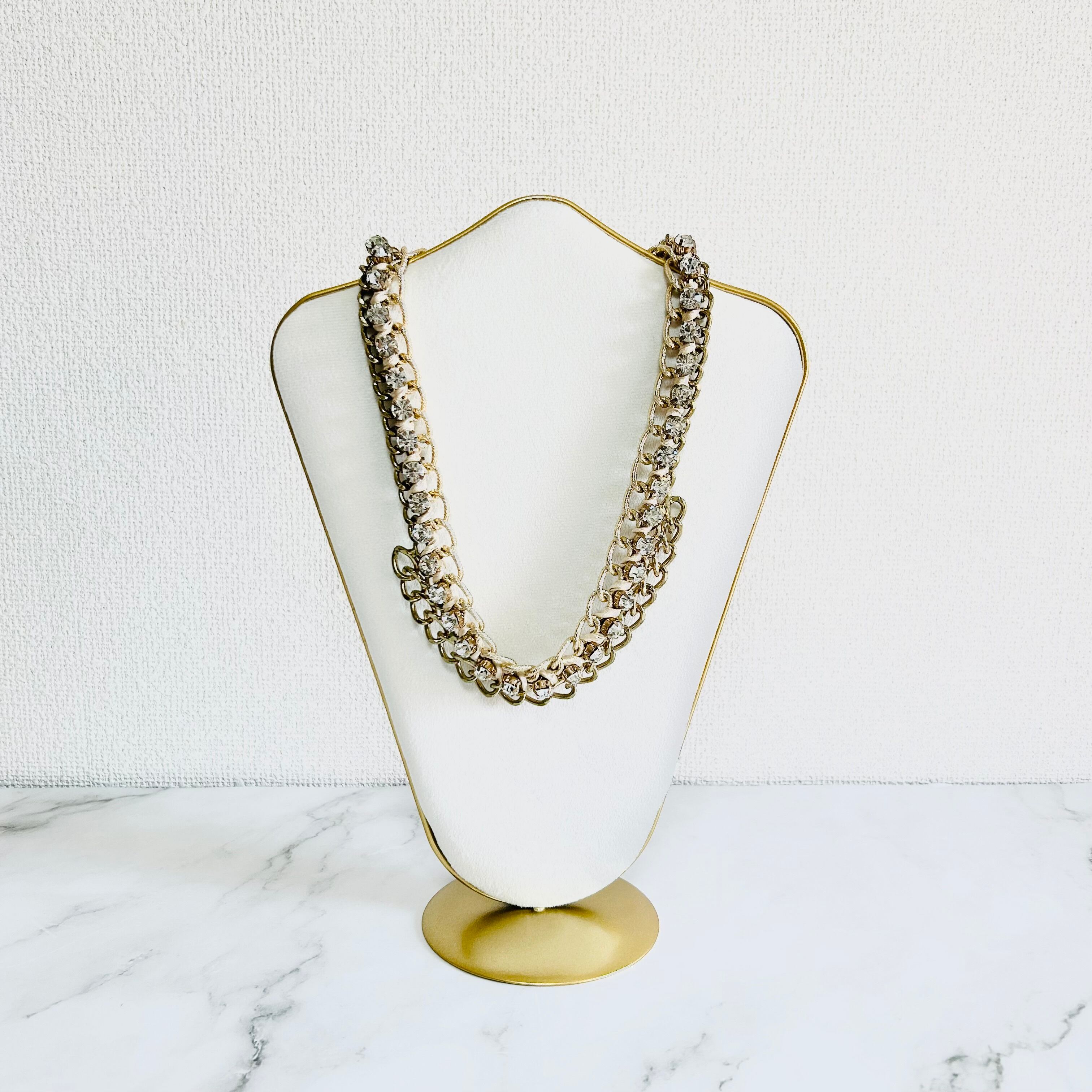 チャンキーチェーンにラインストーンを組み合わせ、アイボリーのコードをあしらった華やかなデザインです。