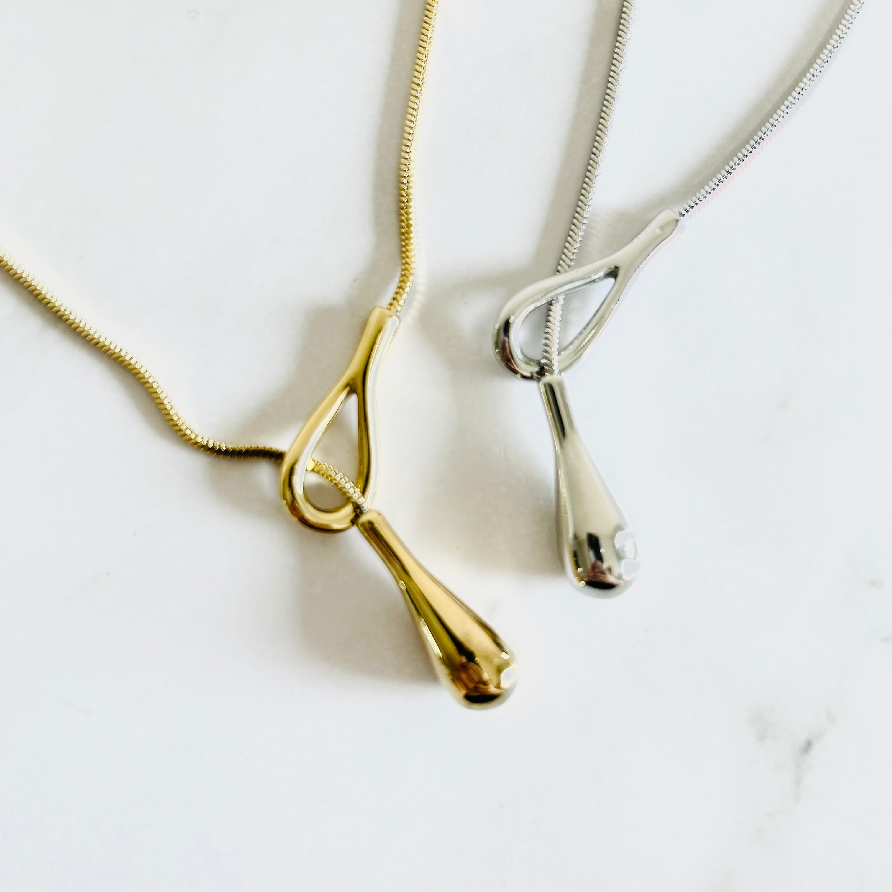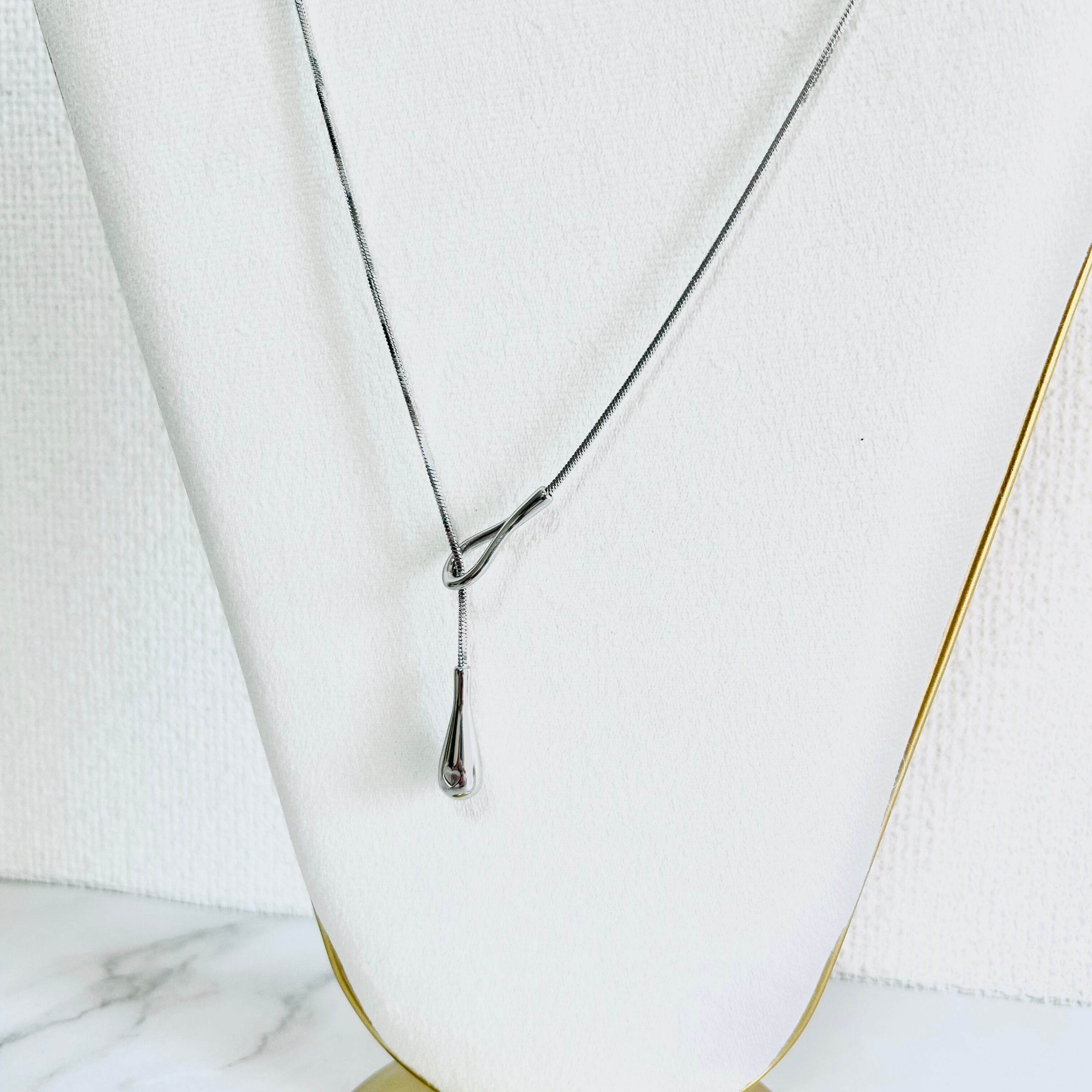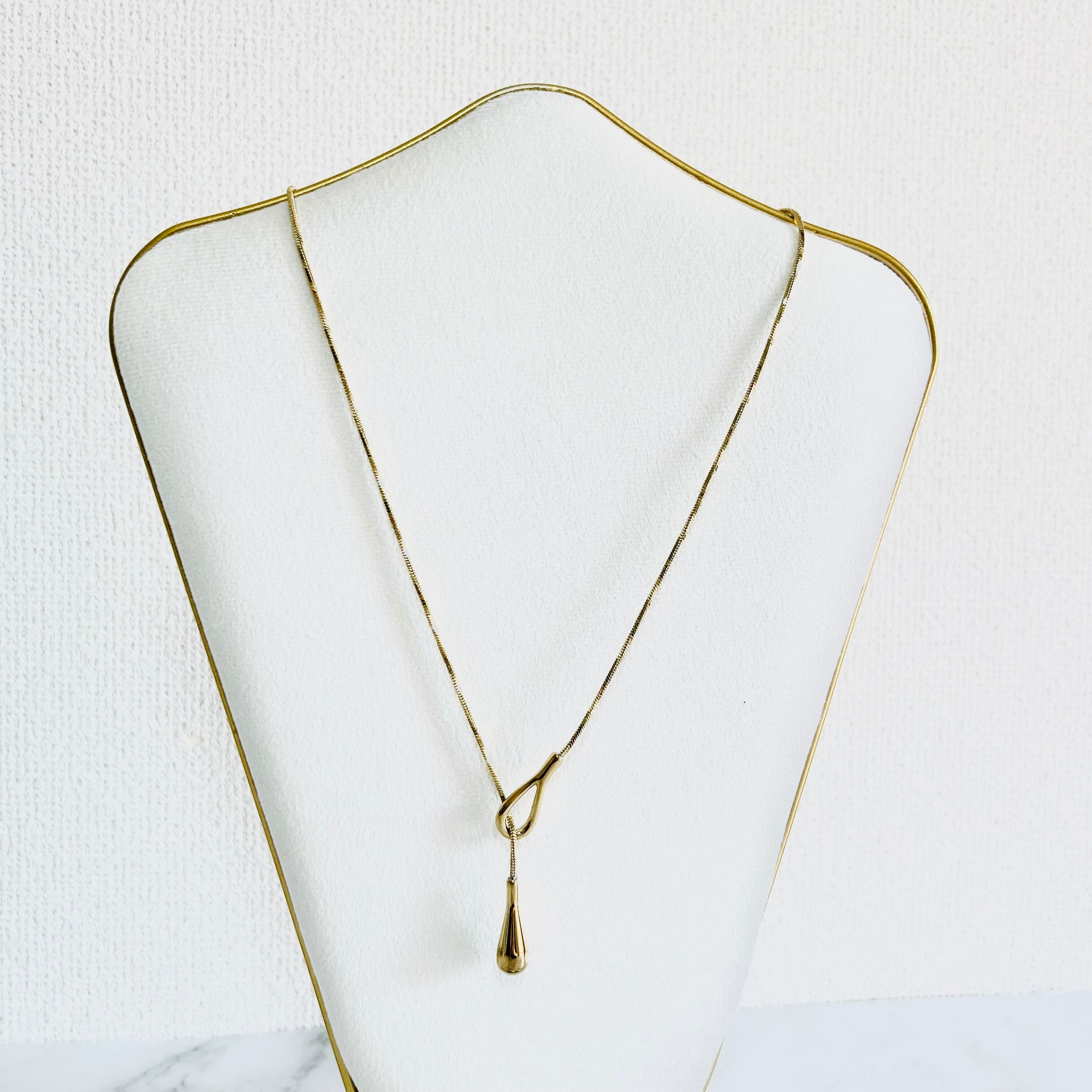 丸みのあるスネークチェーンとティアドロップのペンダントトップがデザインのポイントです。