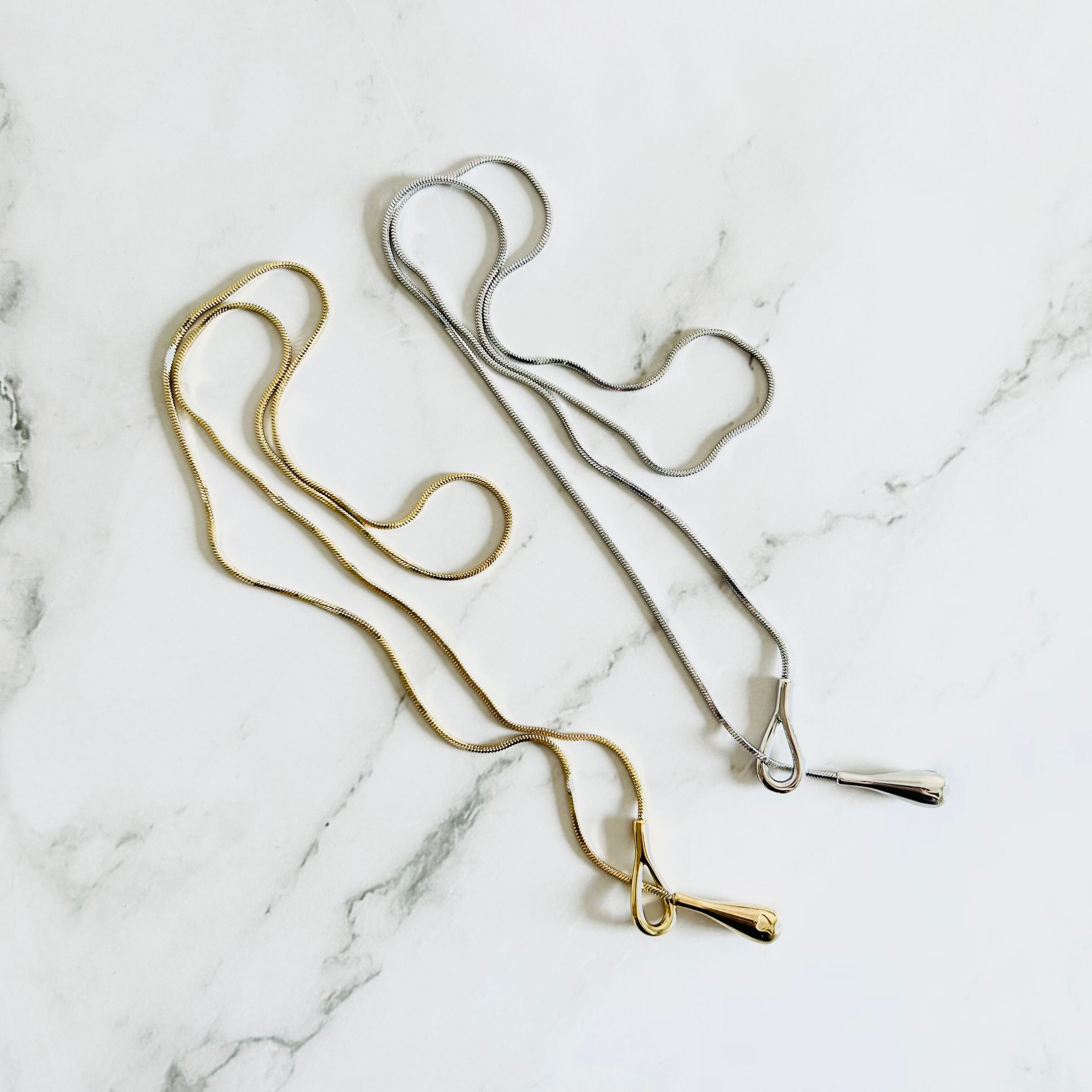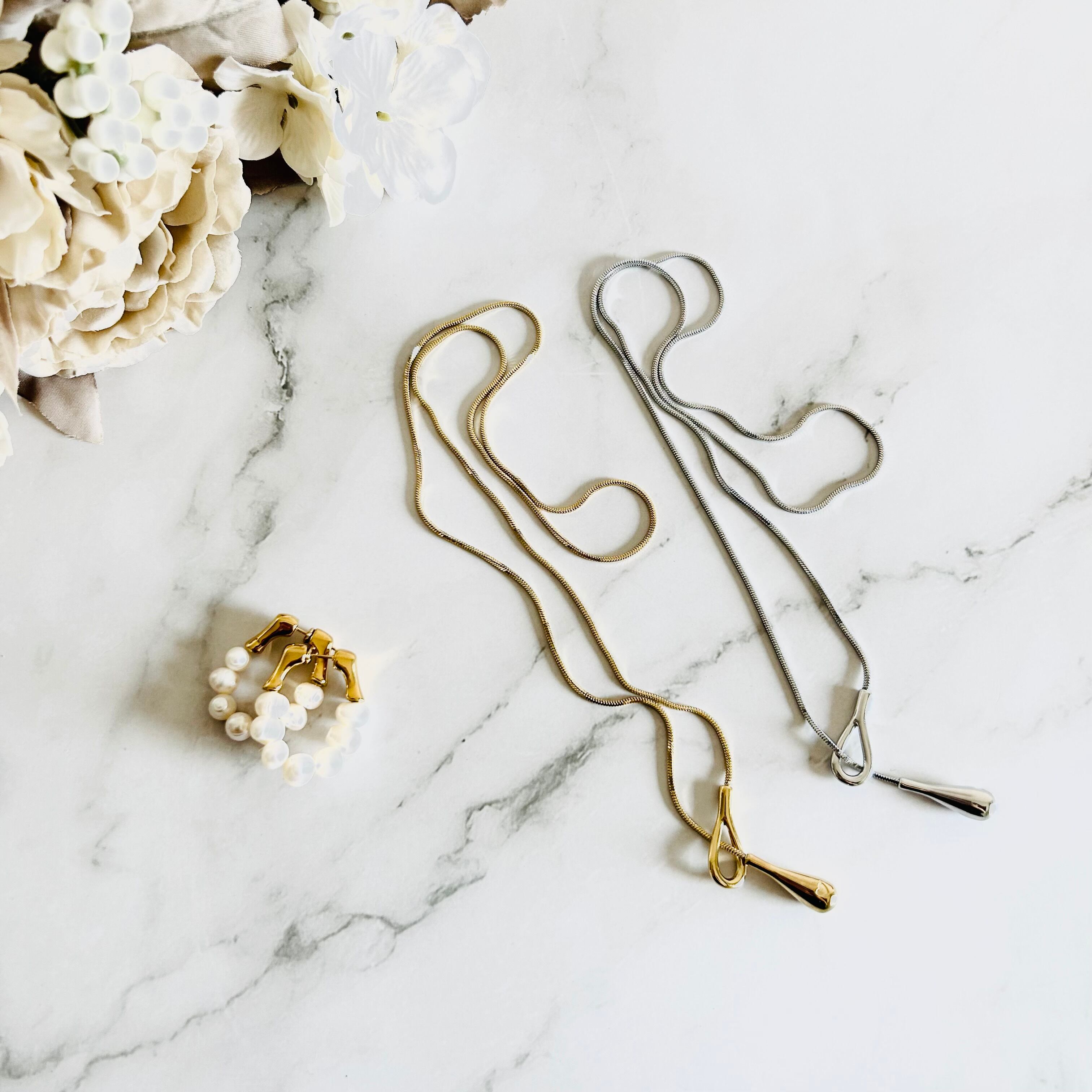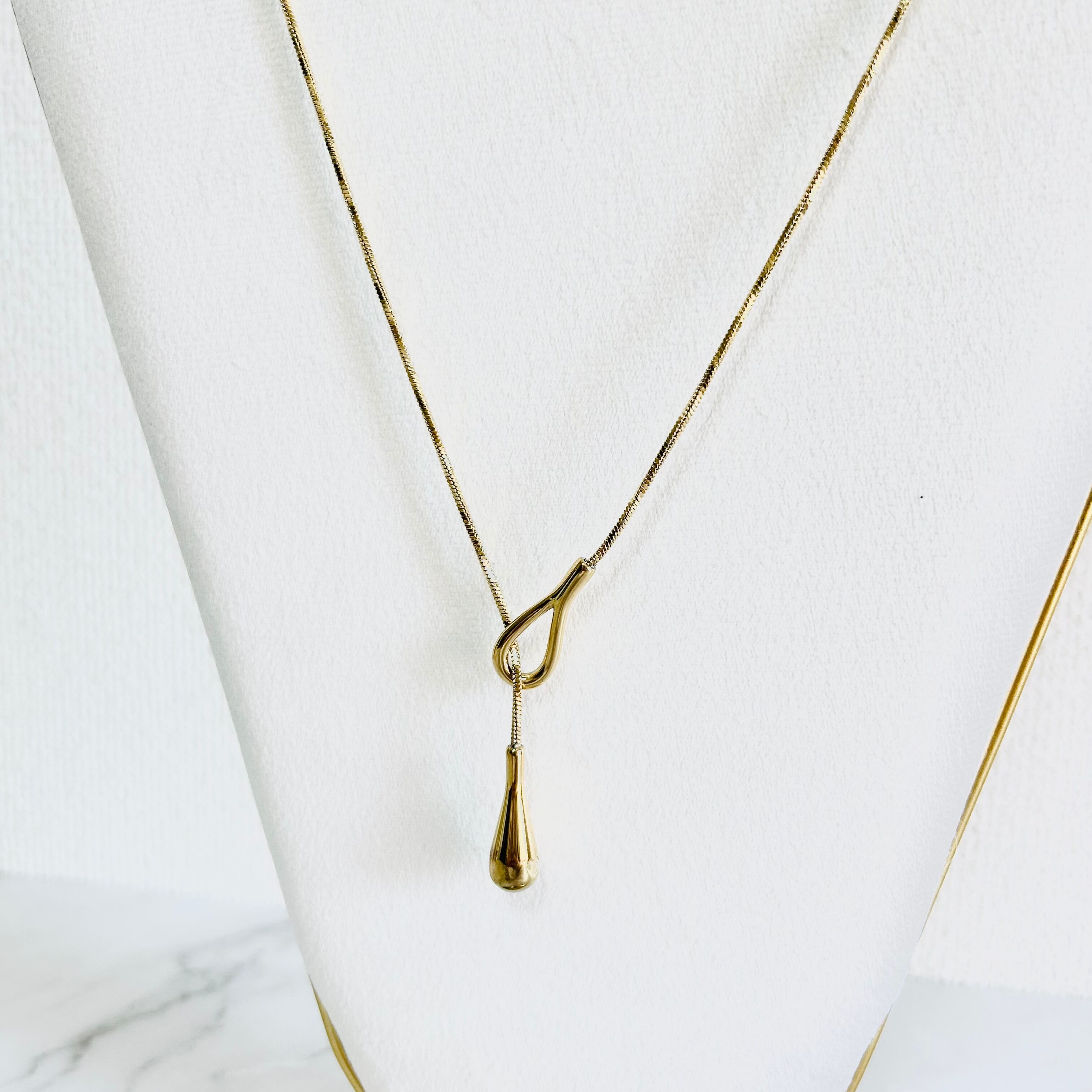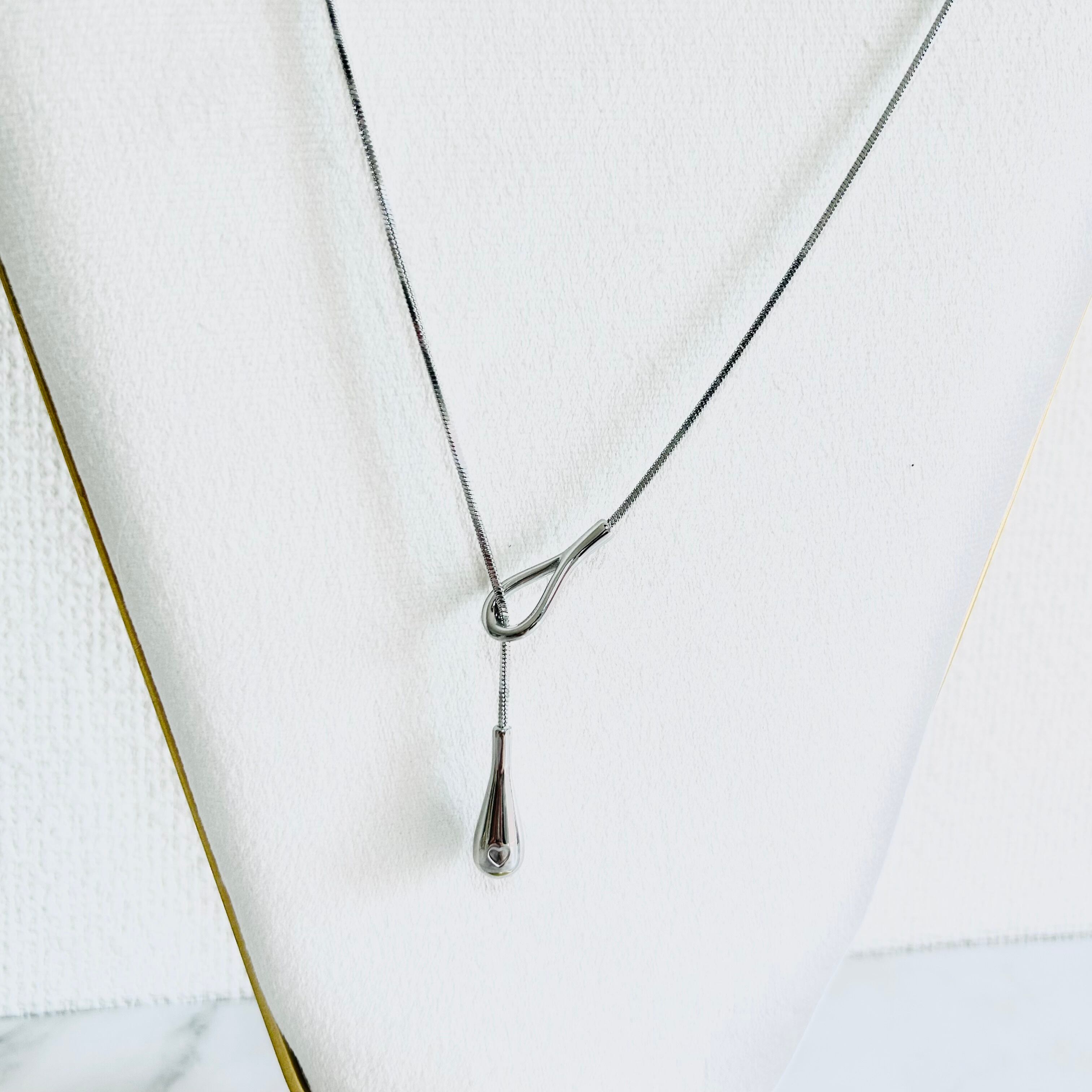 丸みのあるスネークチェーンとティアドロップのペンダントトップがデザインのポイントです。