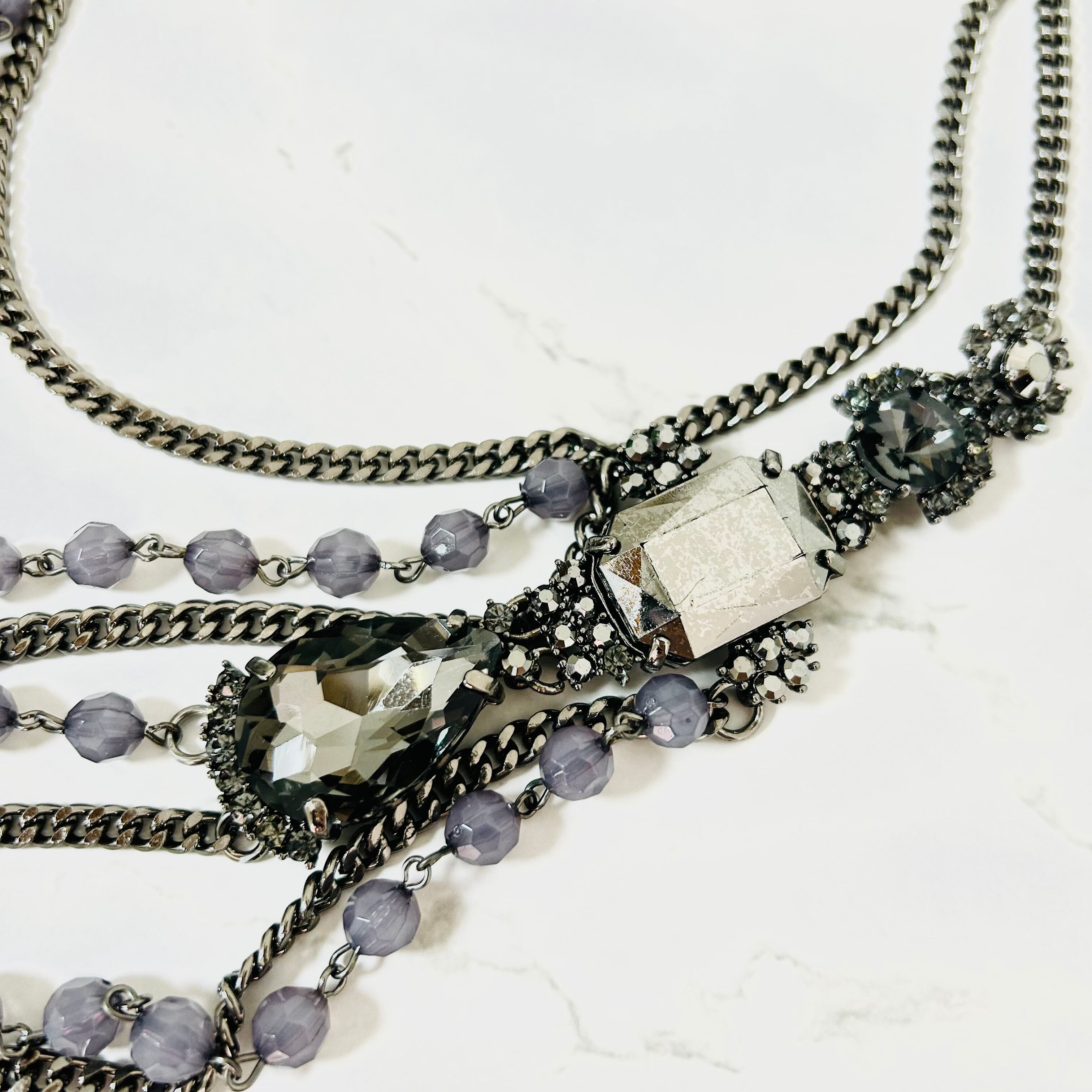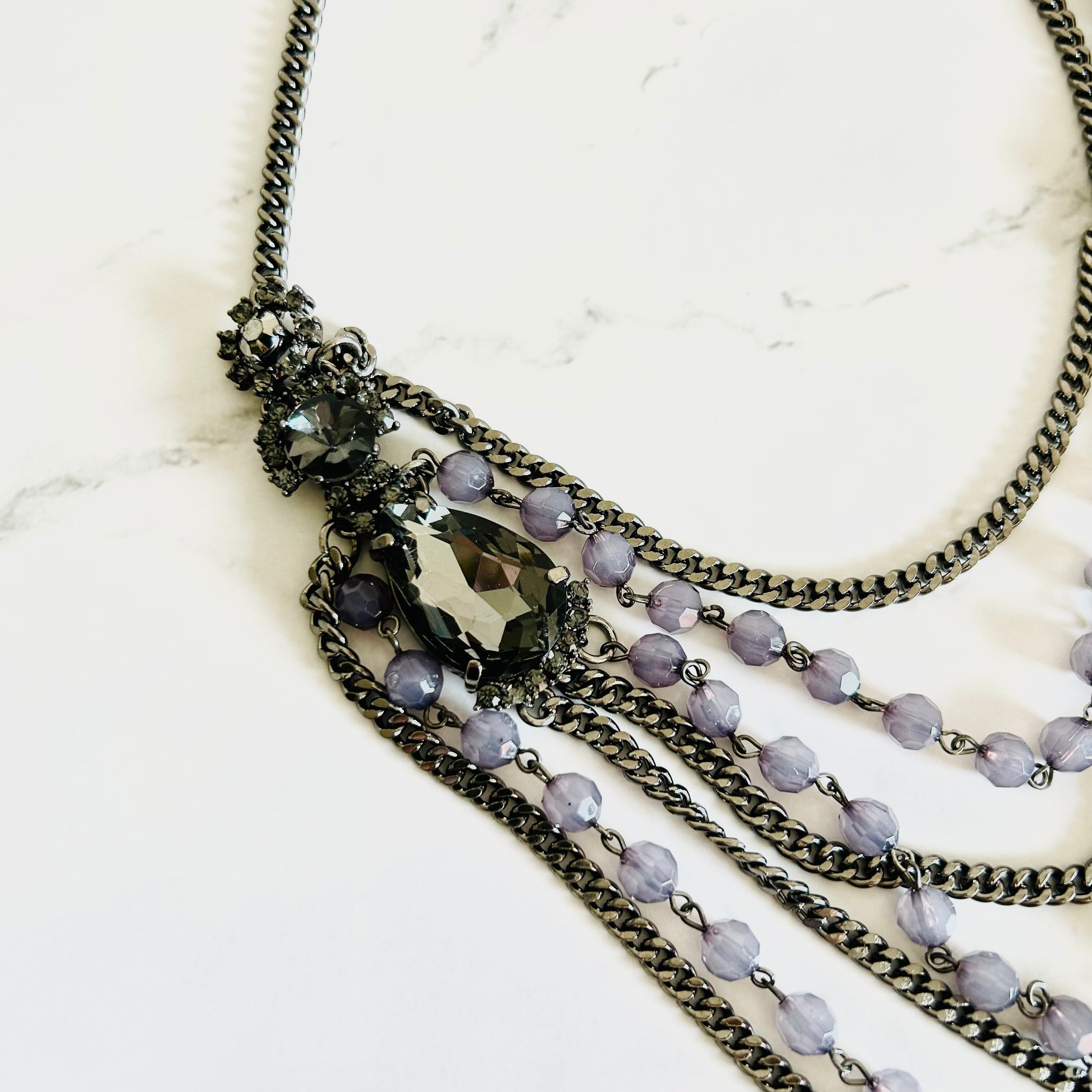 細めのチェーンと半透明でグレイッシュなパープルカラーのアクリルパーツを交互に7連組み合わせ、華やかななクリスタルストーンをプラスしたデザインです。