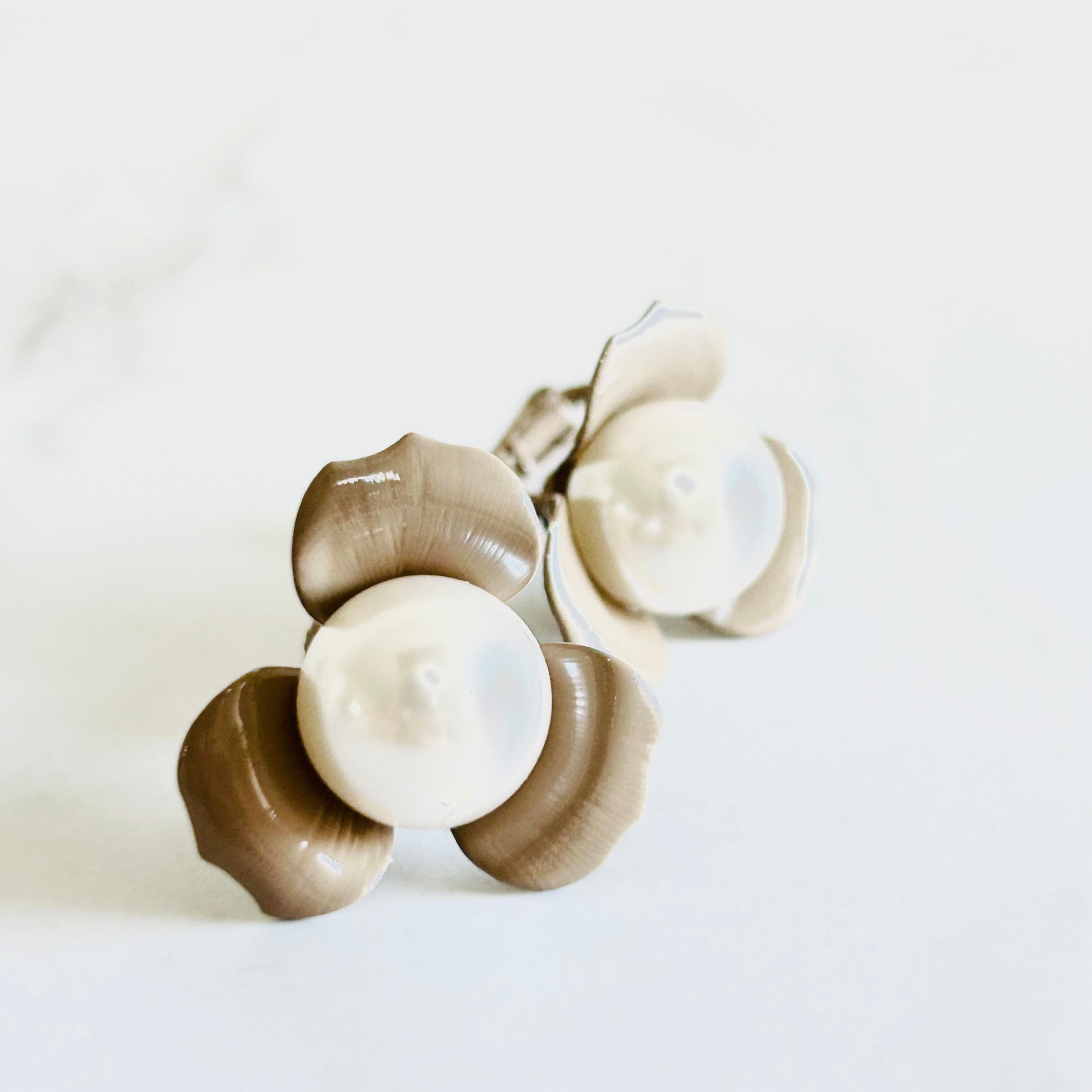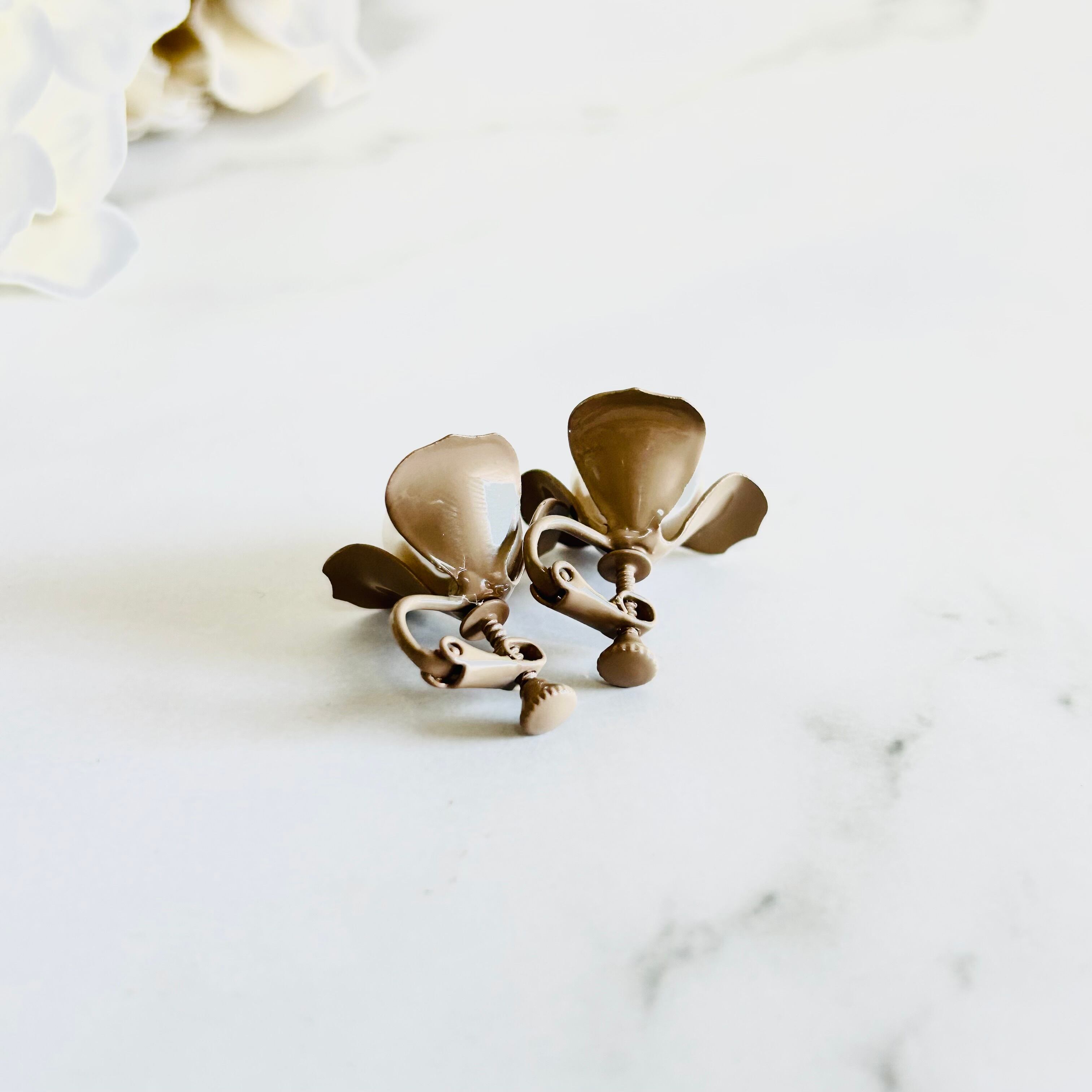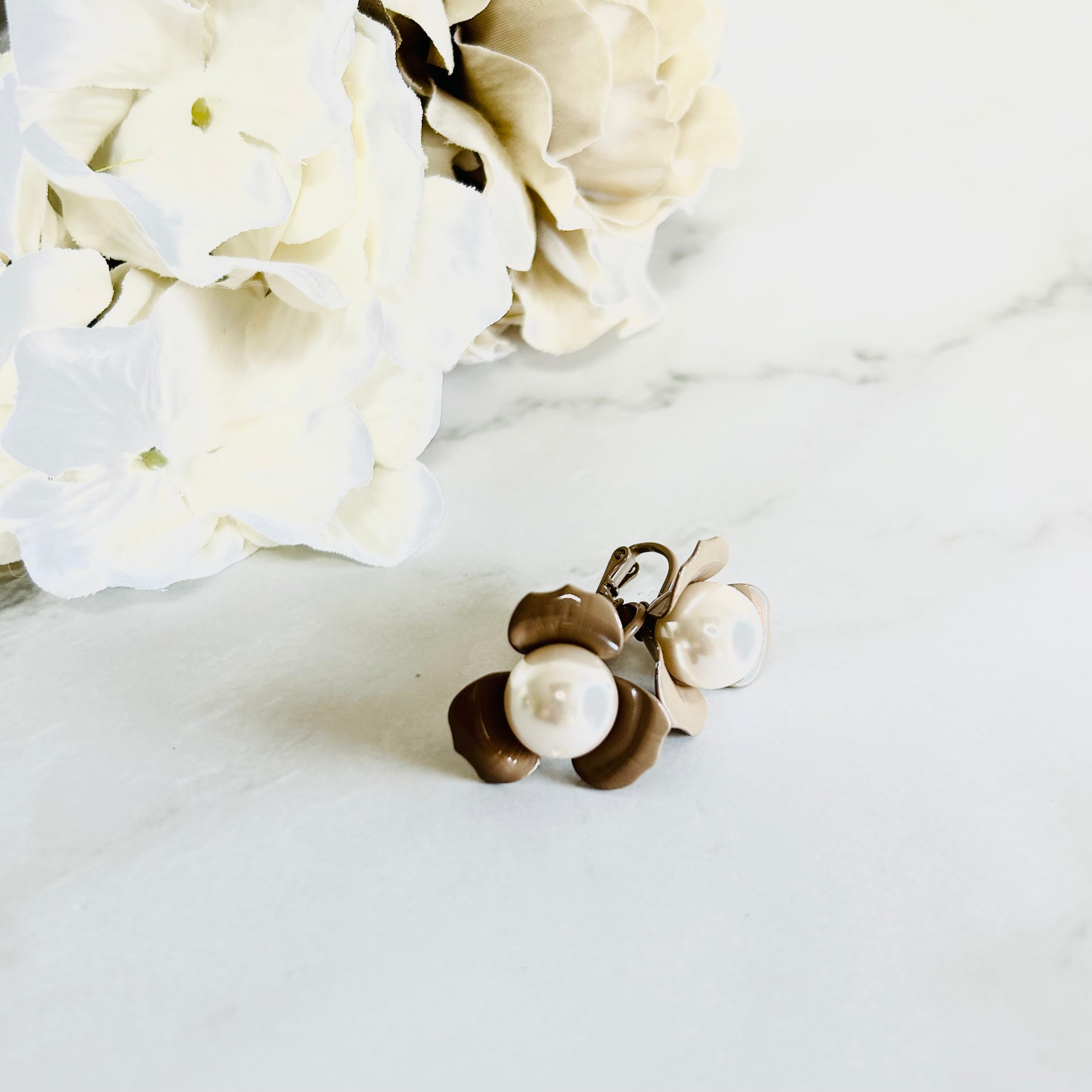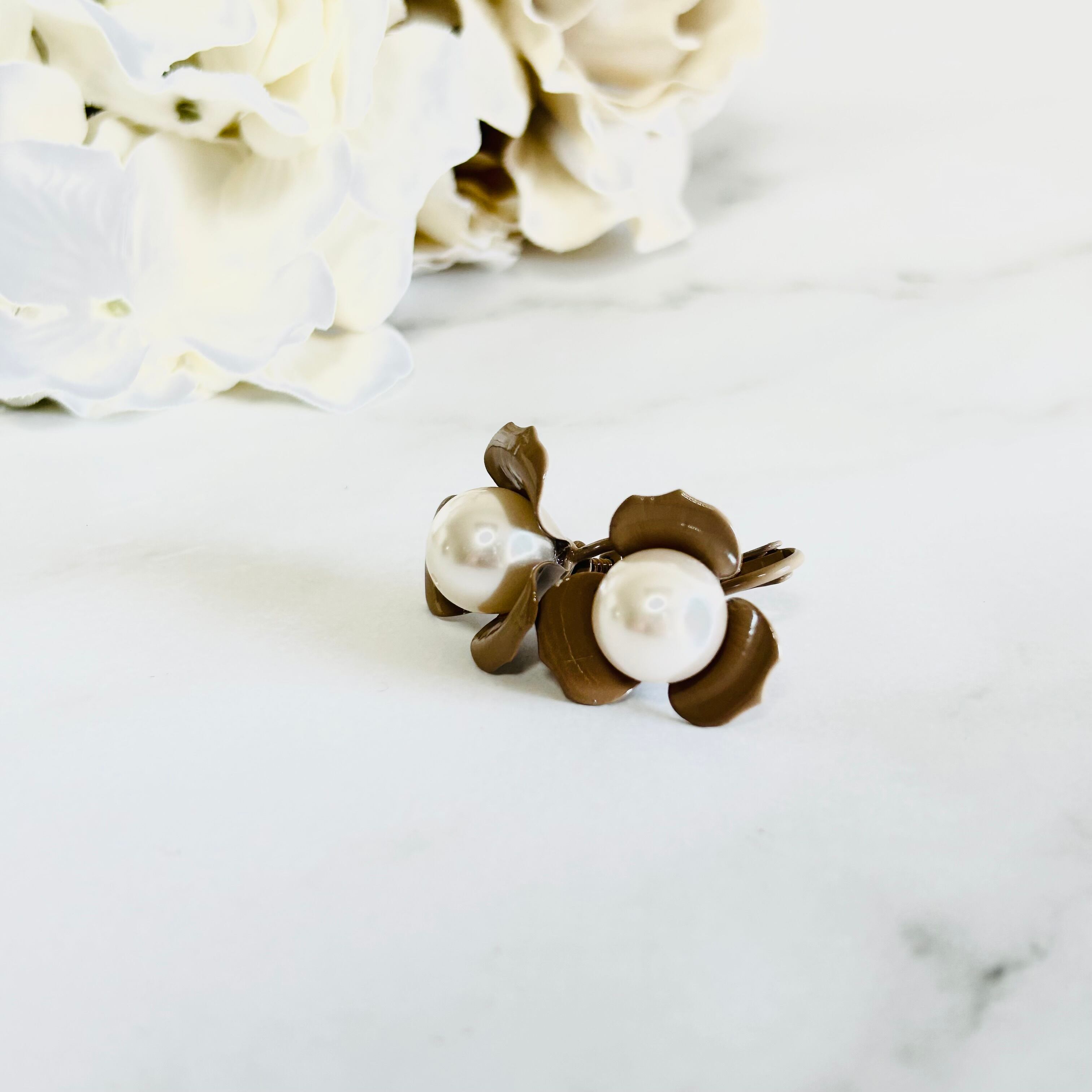 フラワーモチーフのパーツに大粒のパールをあしらった大人可愛いデザインです。