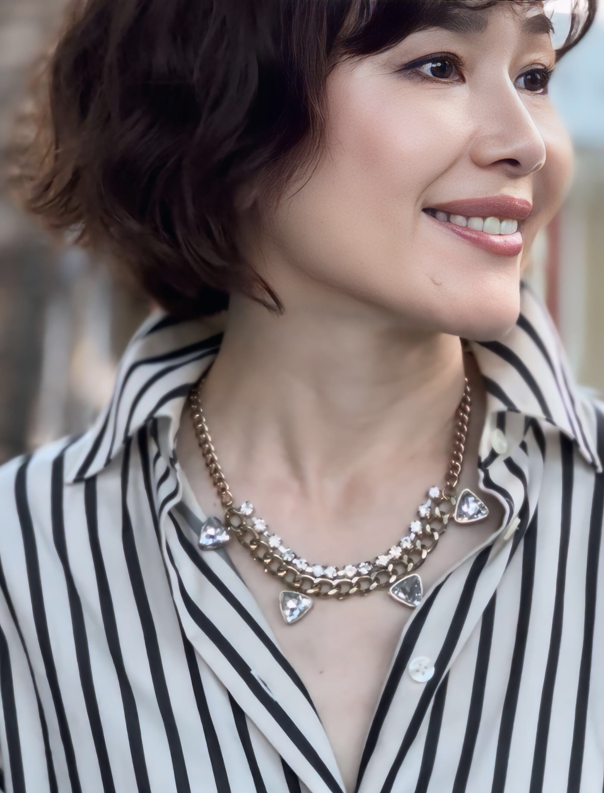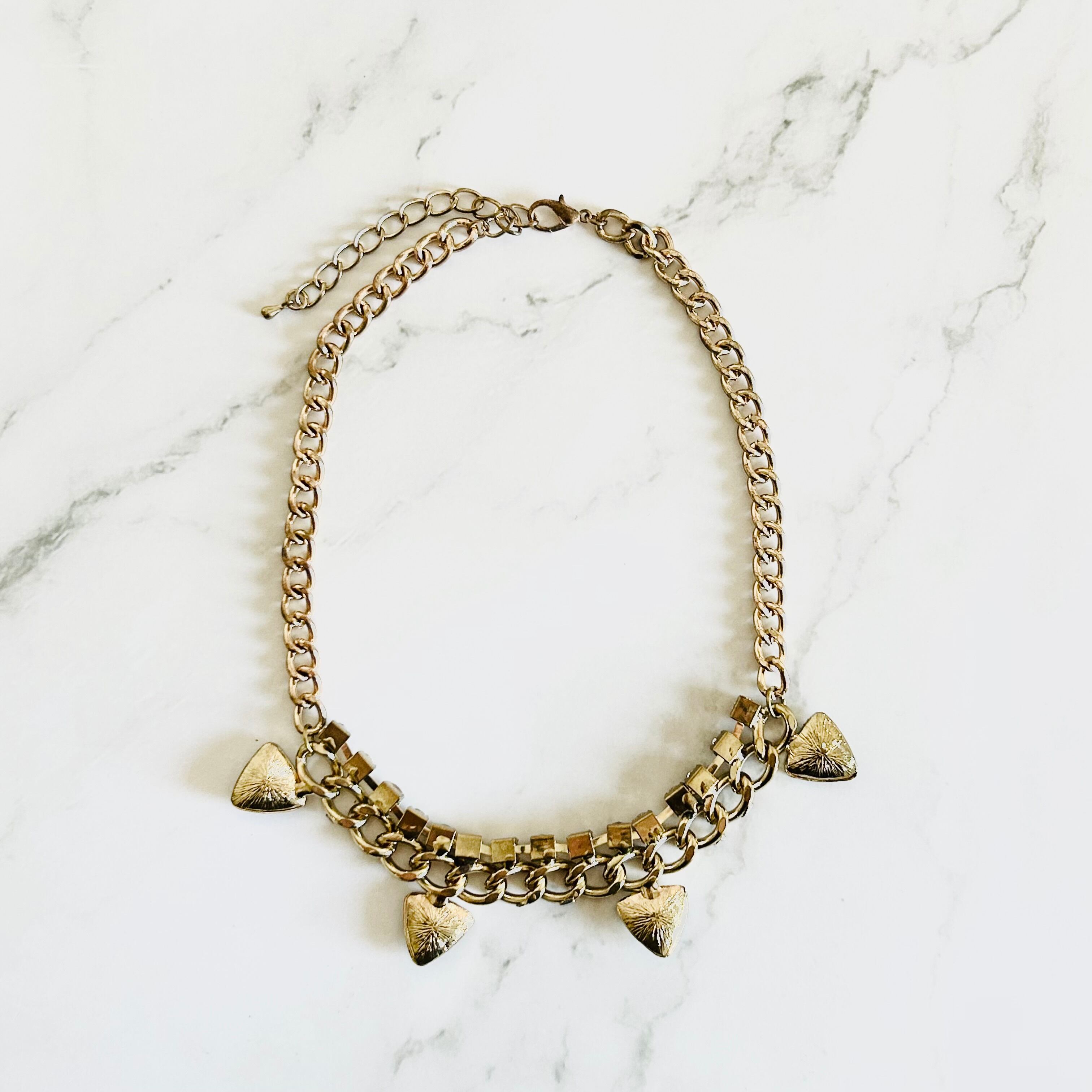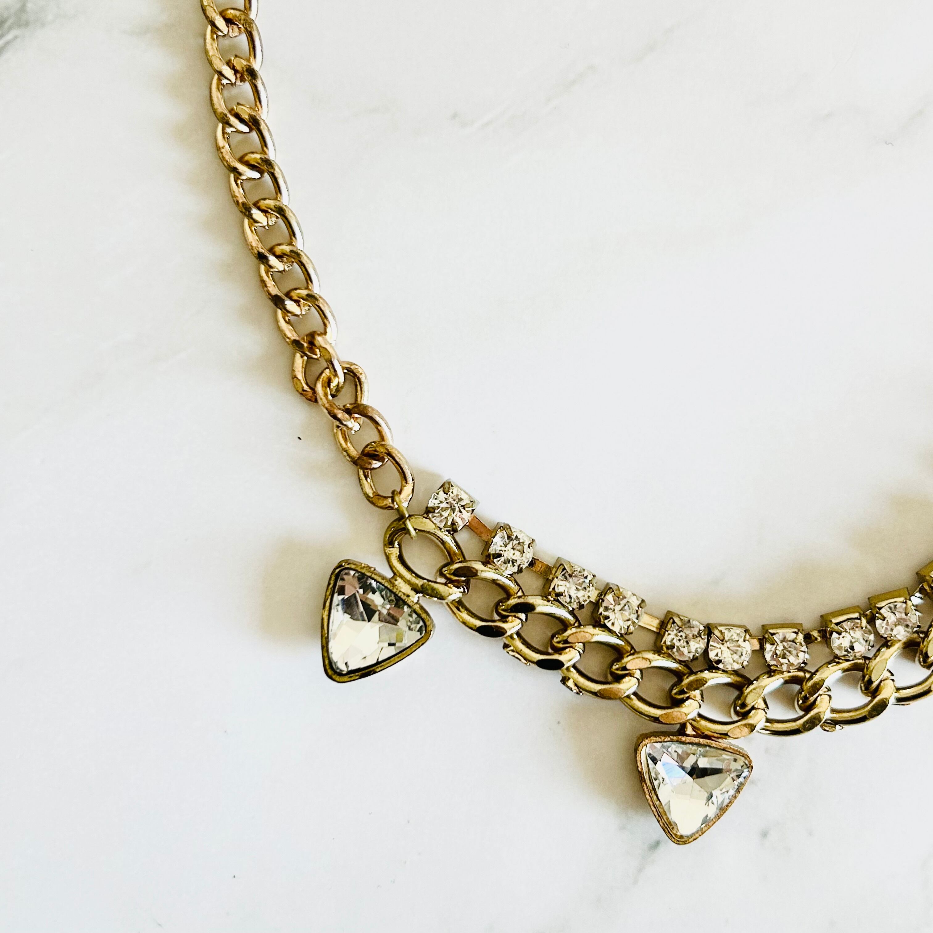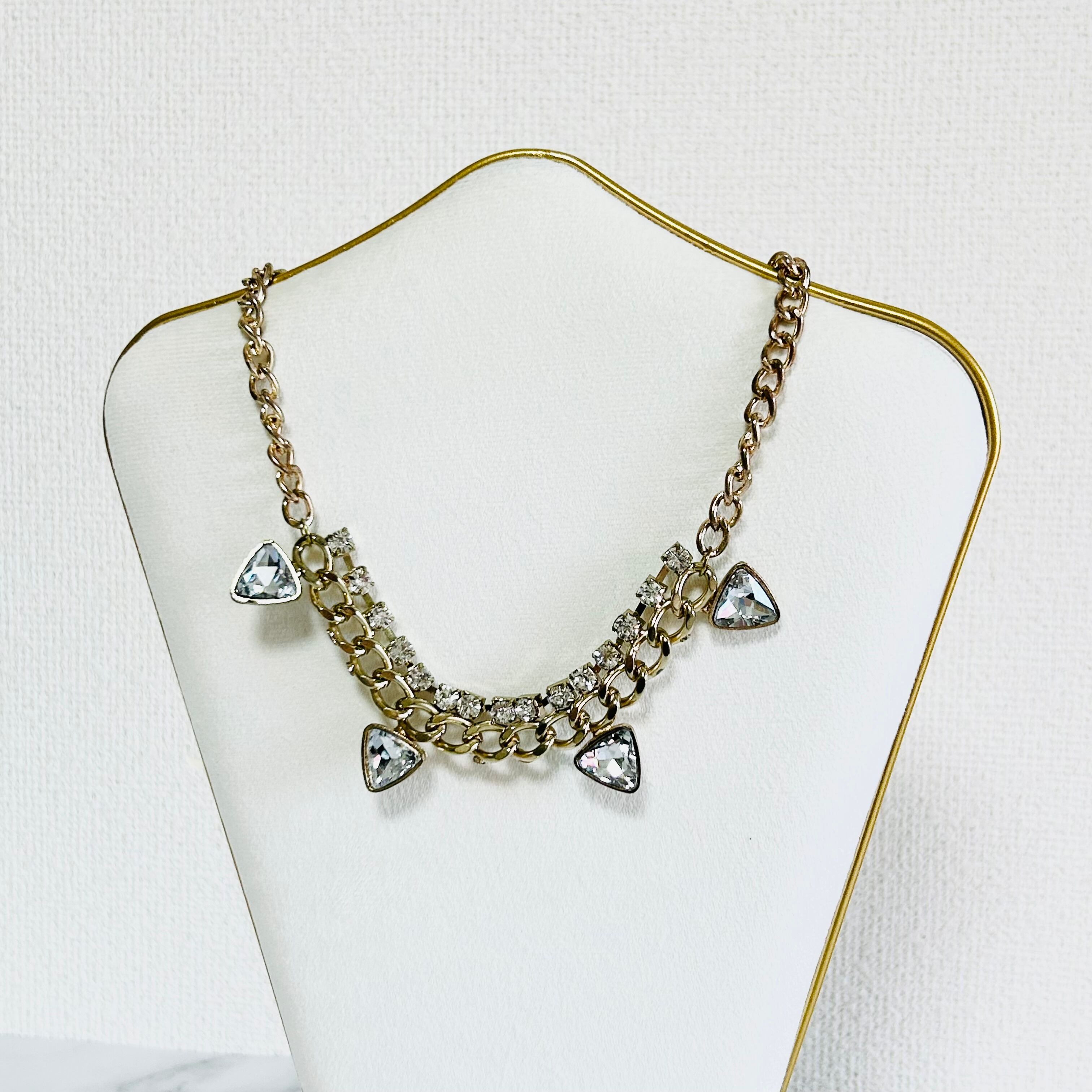 三角形のラインストーンとビジューチェーンをアンティークカラーのチャンキーチェーンに取り付け、大人可愛いデザインに仕上げました✨