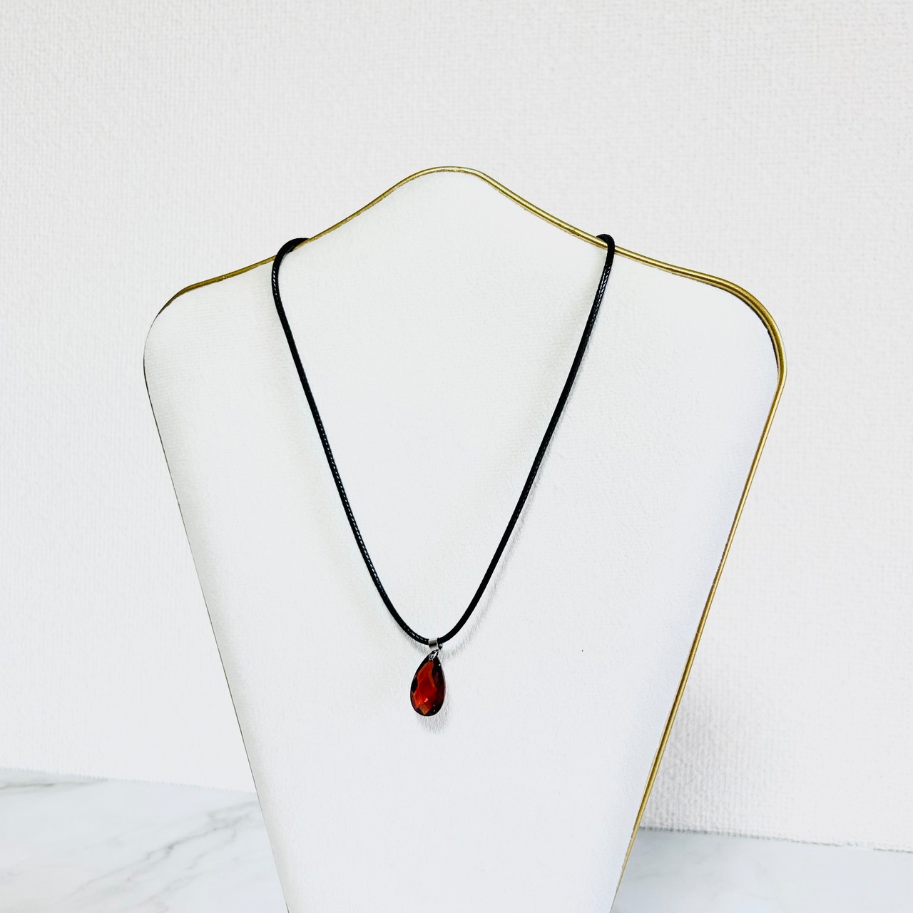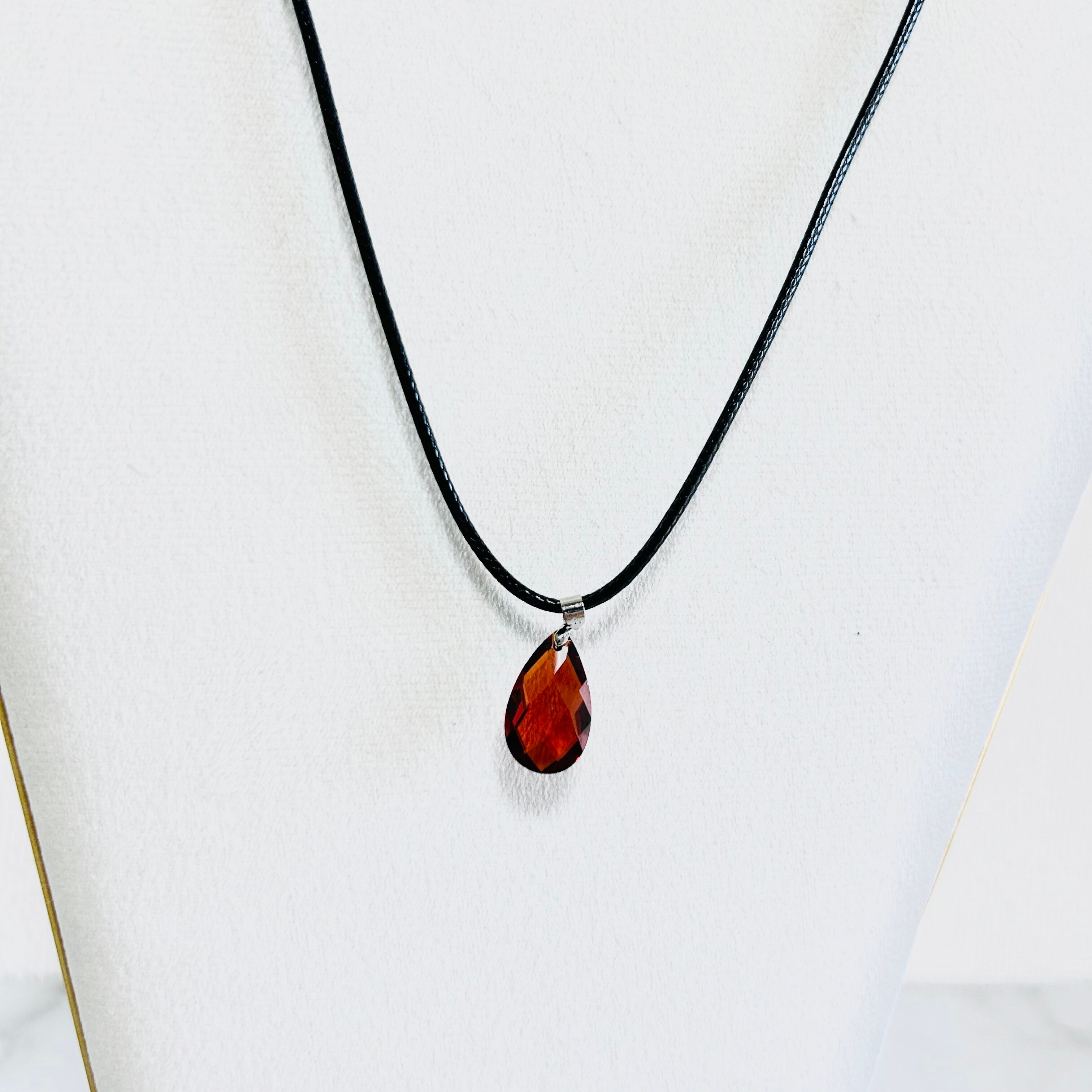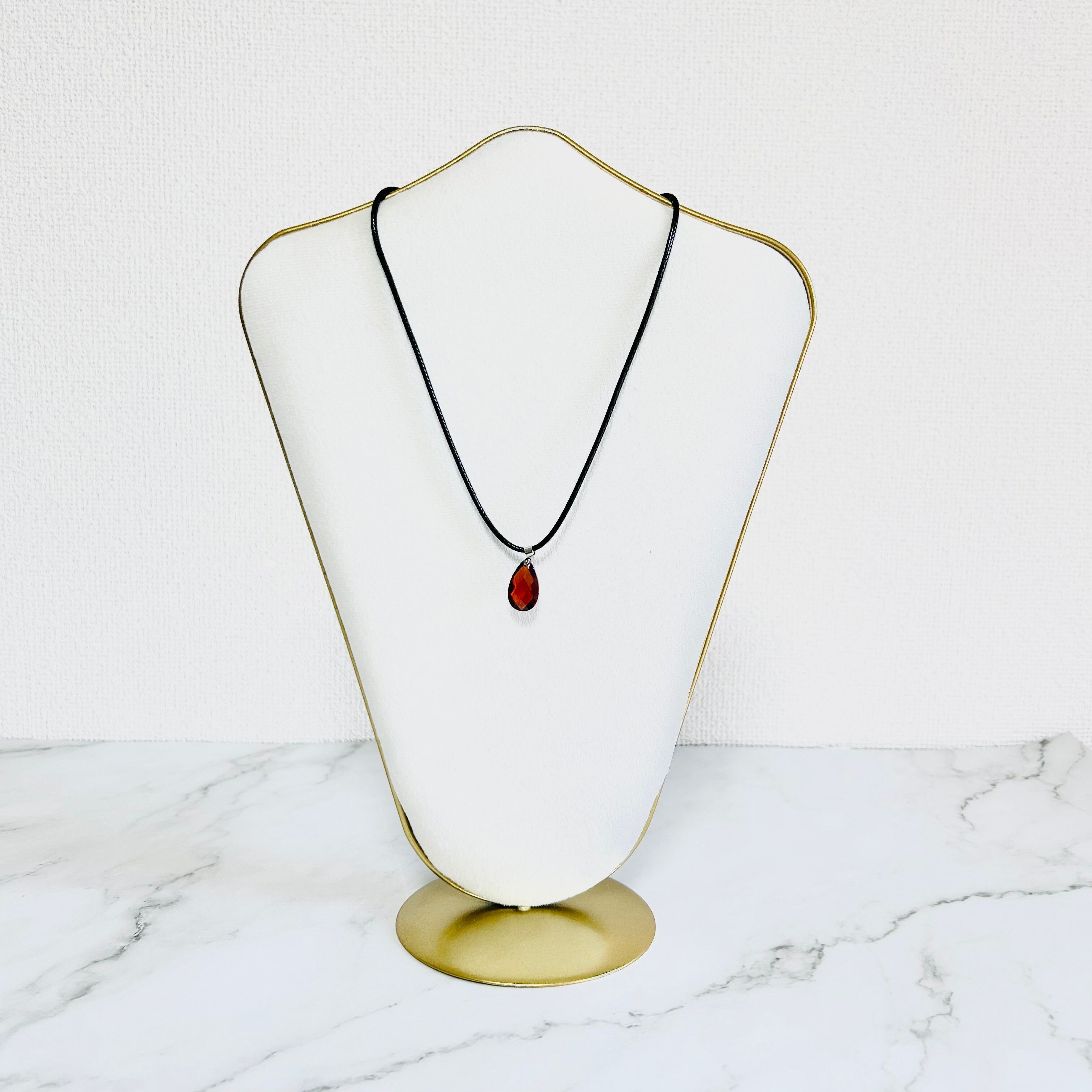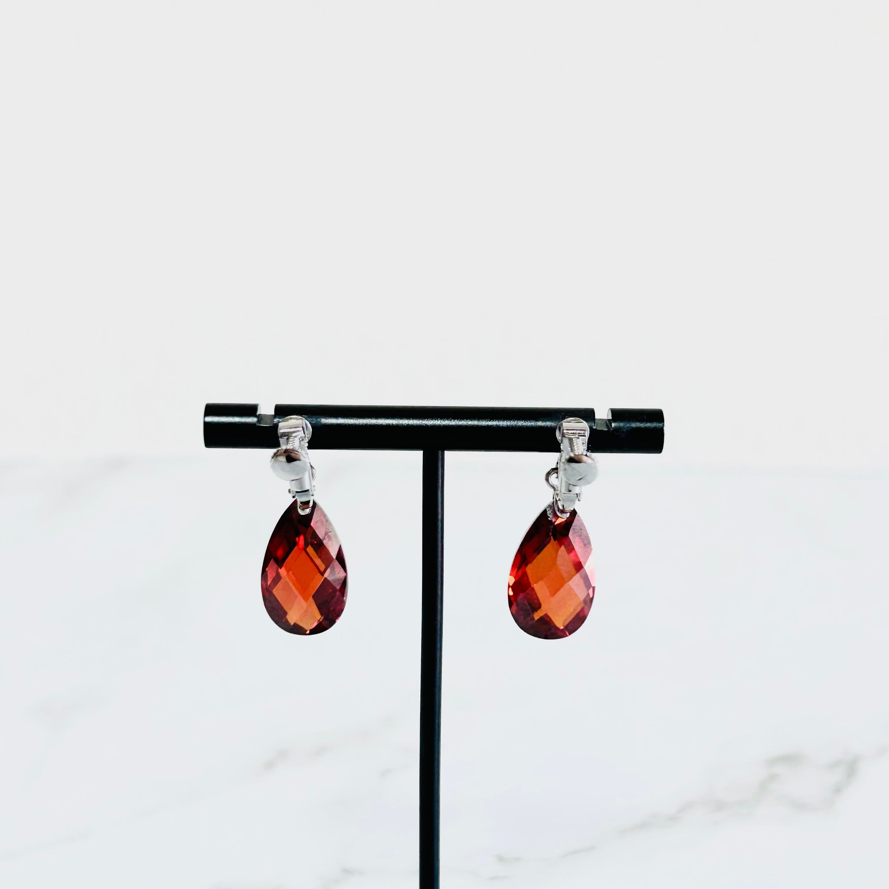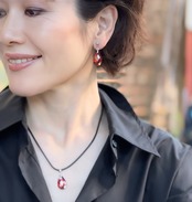 ややカッパーの色味がかった深みのあるレッドのラインストーンをワンポイントにした若々しいデザインのネックレスとシンプルなデザインのイヤリングのセットです。