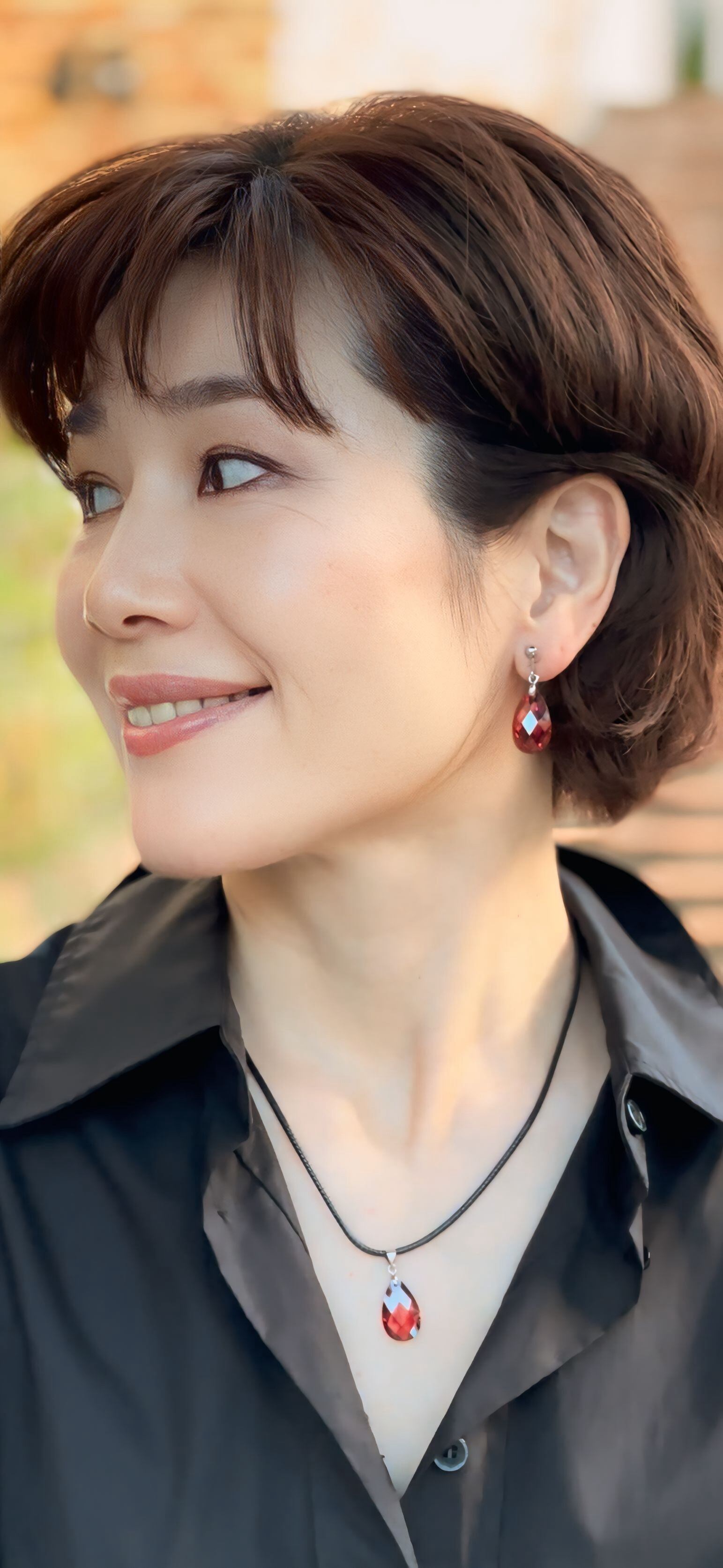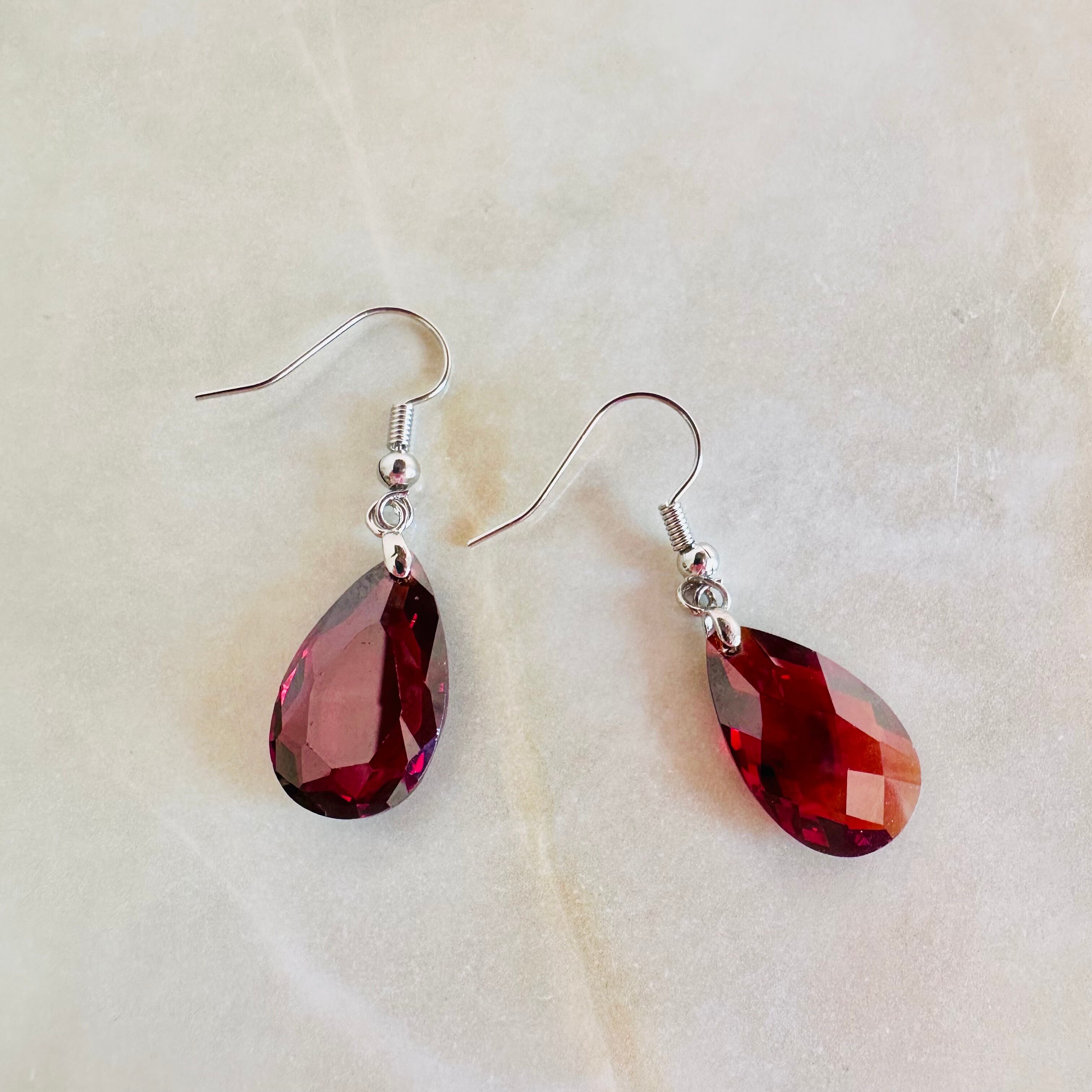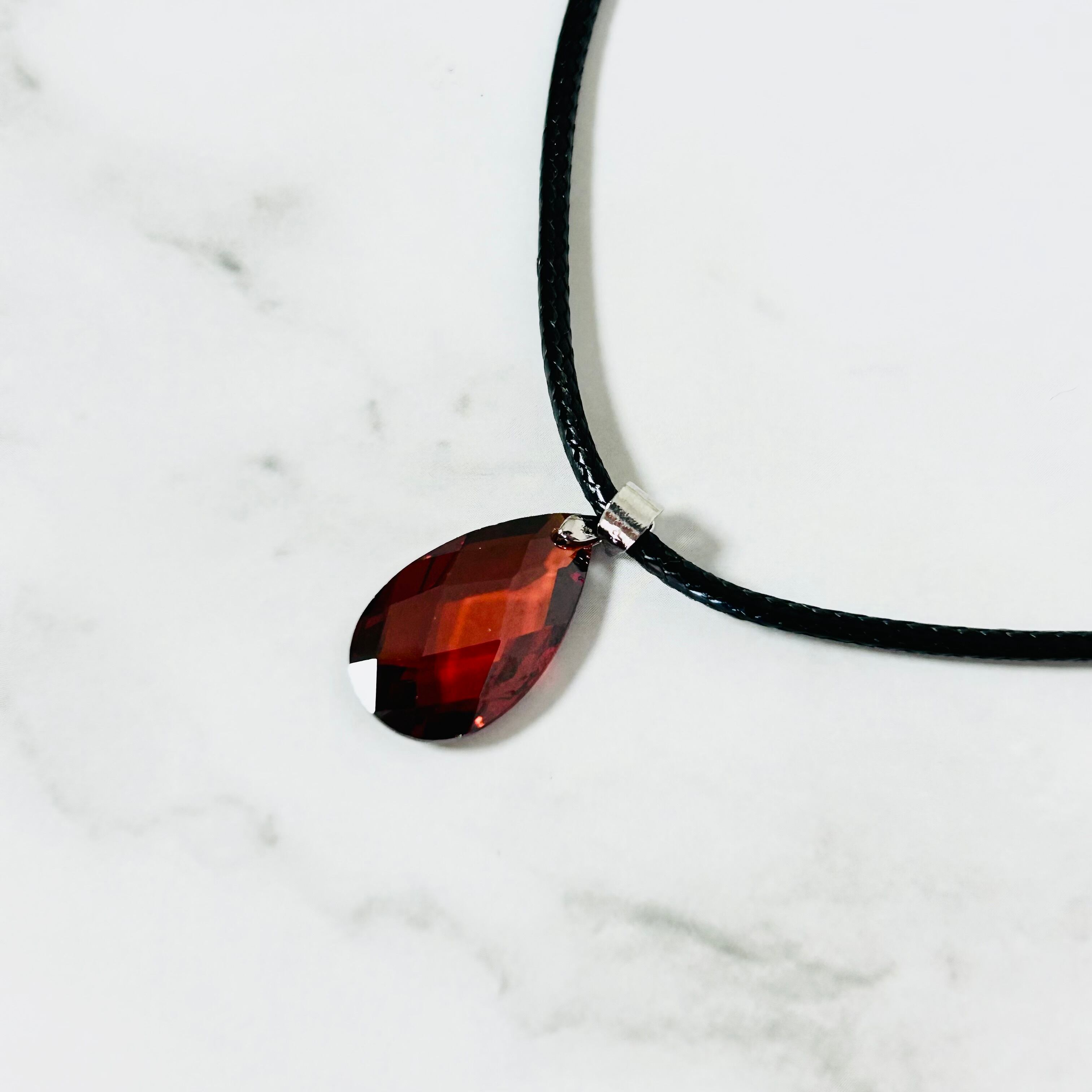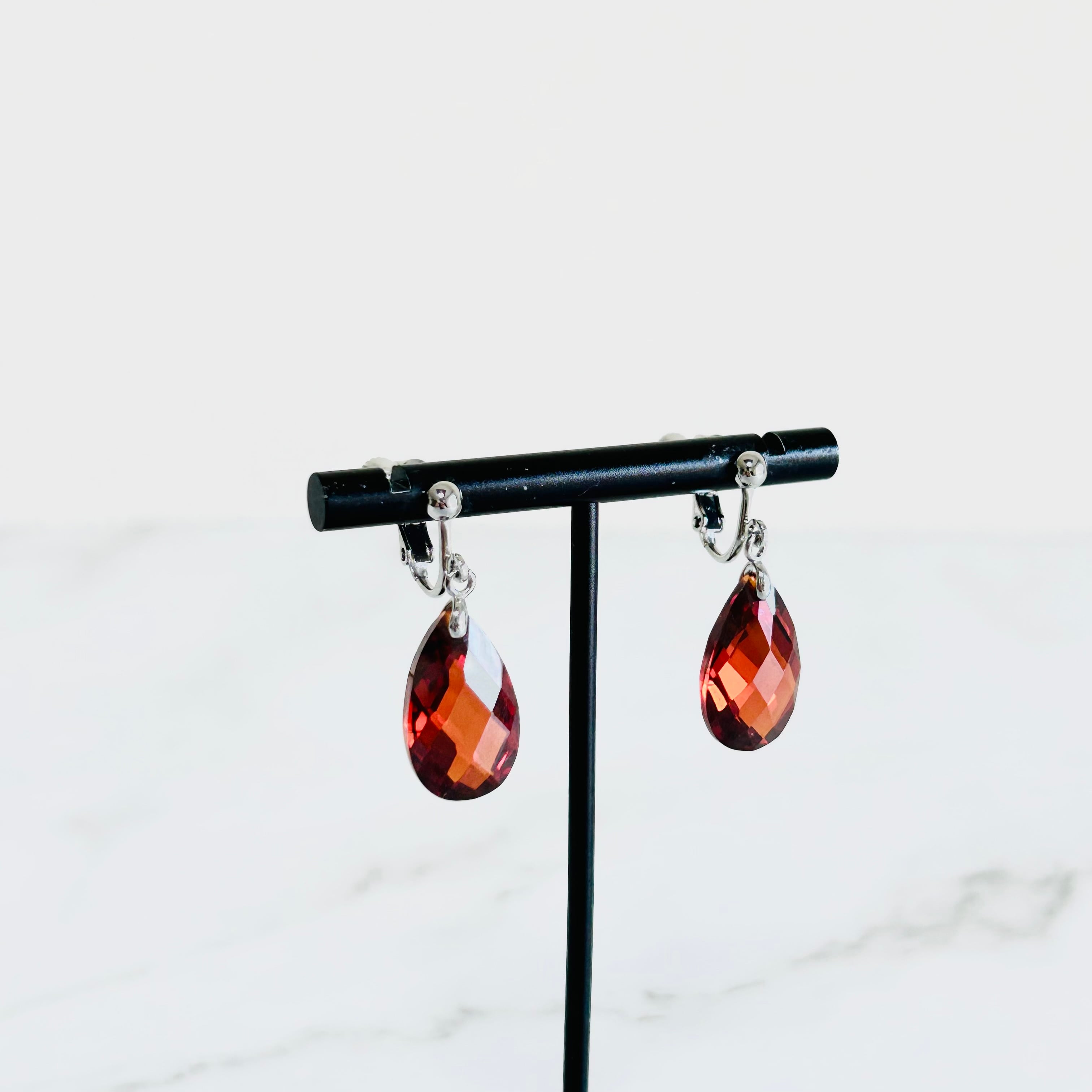 ややカッパーの色味がかった深みのあるレッドのラインストーンをワンポイントにした若々しいデザインのネックレスとシンプルなデザインのイヤリングのセットです。