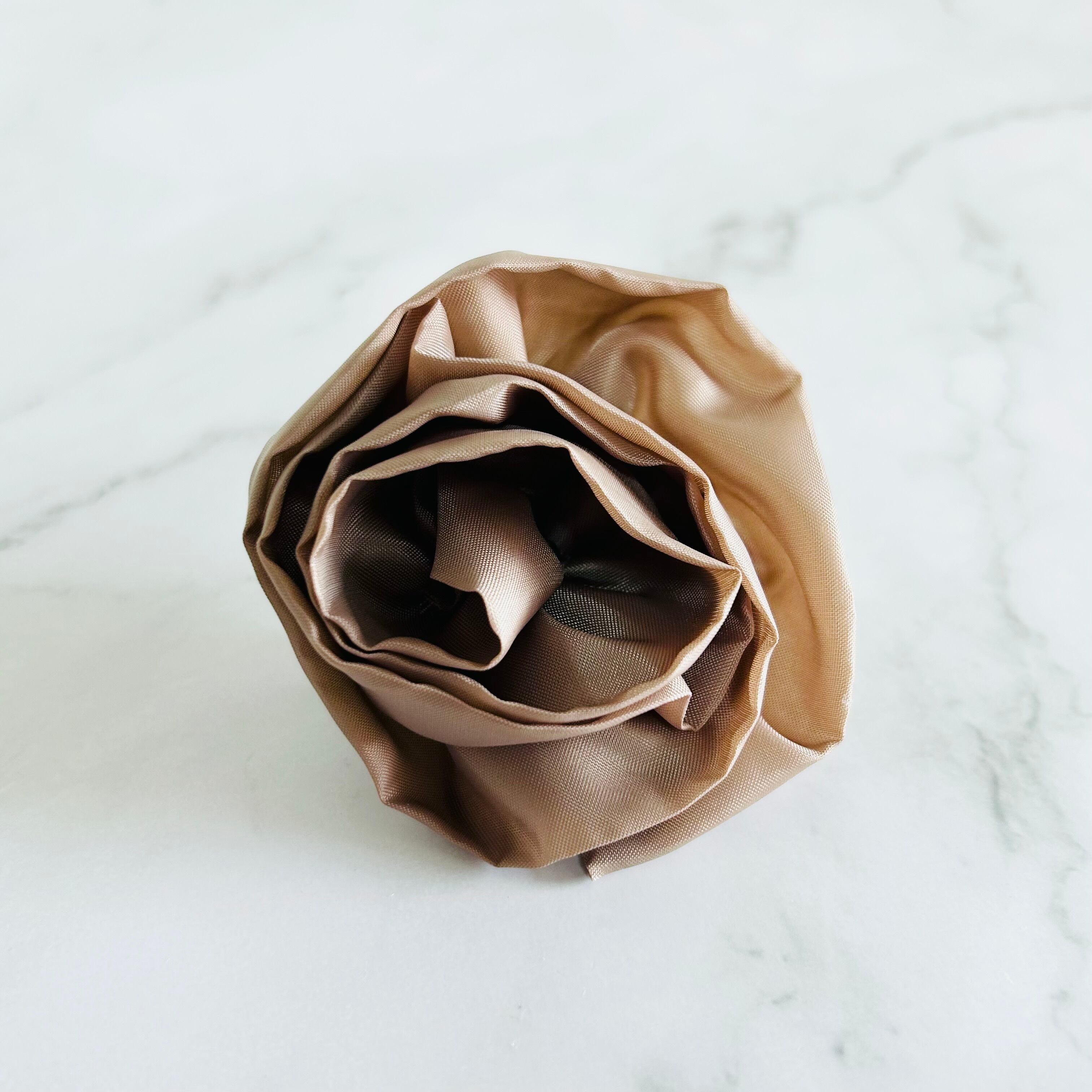 大玉パールをラメの布地で包み、フラワーブローチをプラスしたデザインです。
