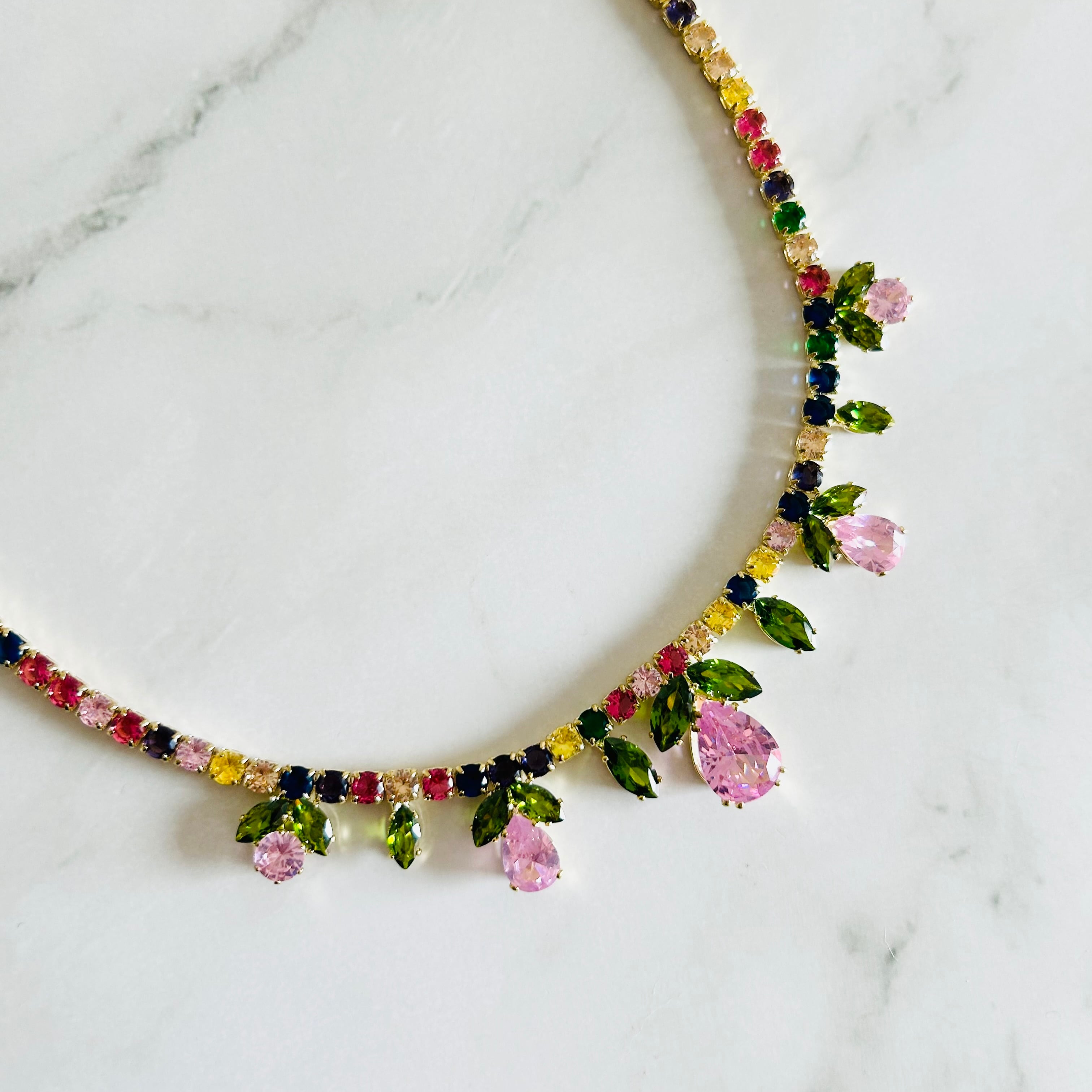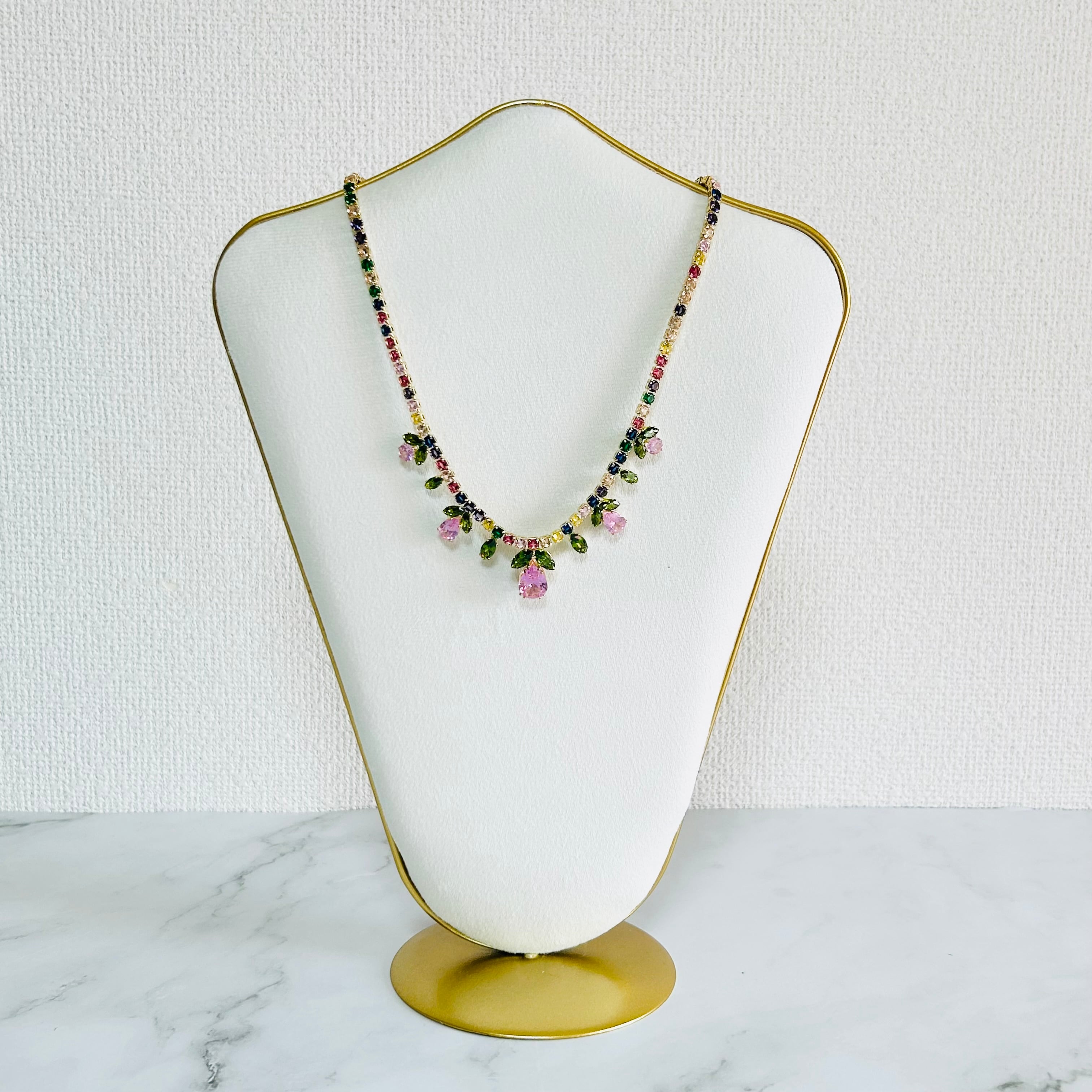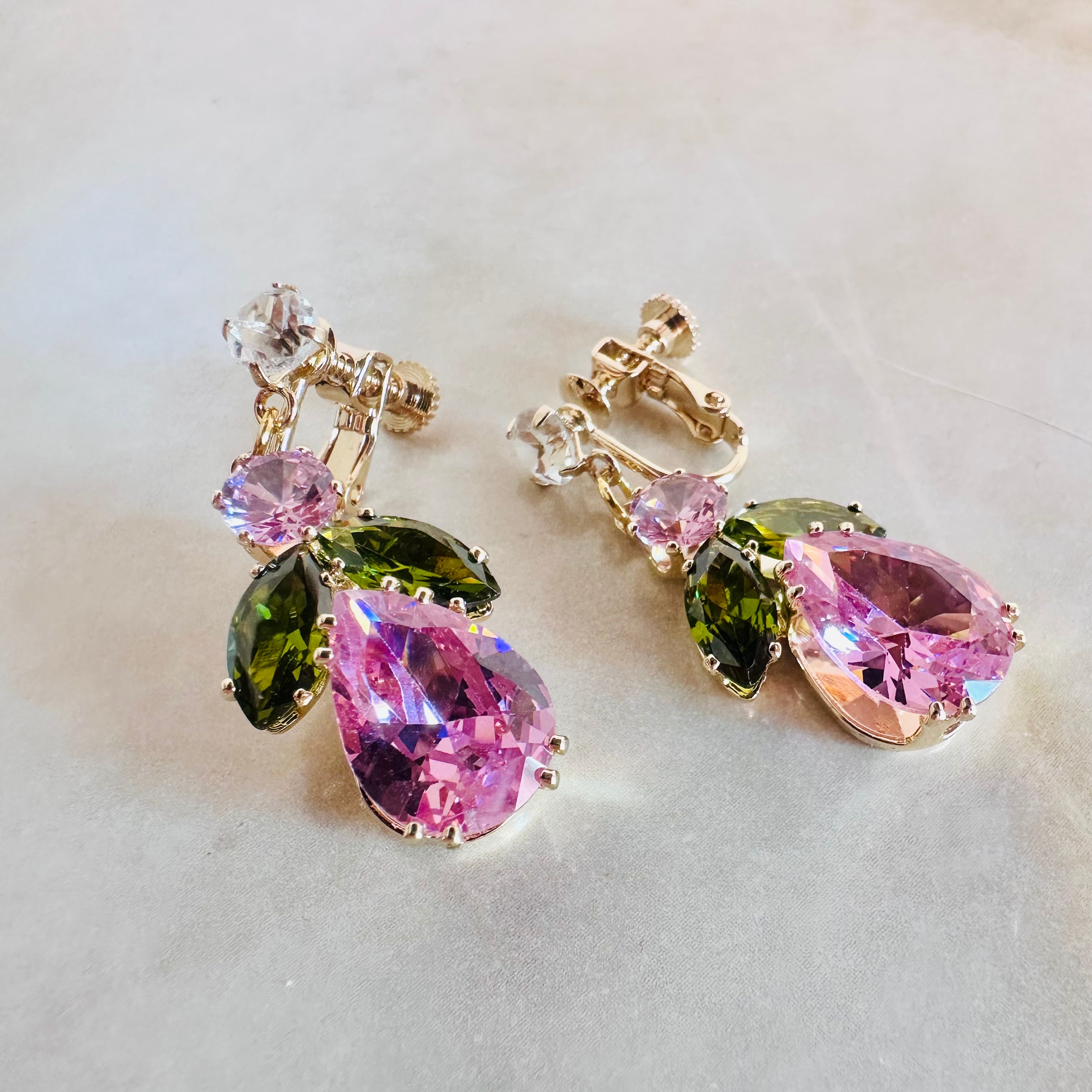カラフルなラインストーンをふんだんに使用し、キュートなフラワーモチーフをプラスしたピアスとのセット商品です。