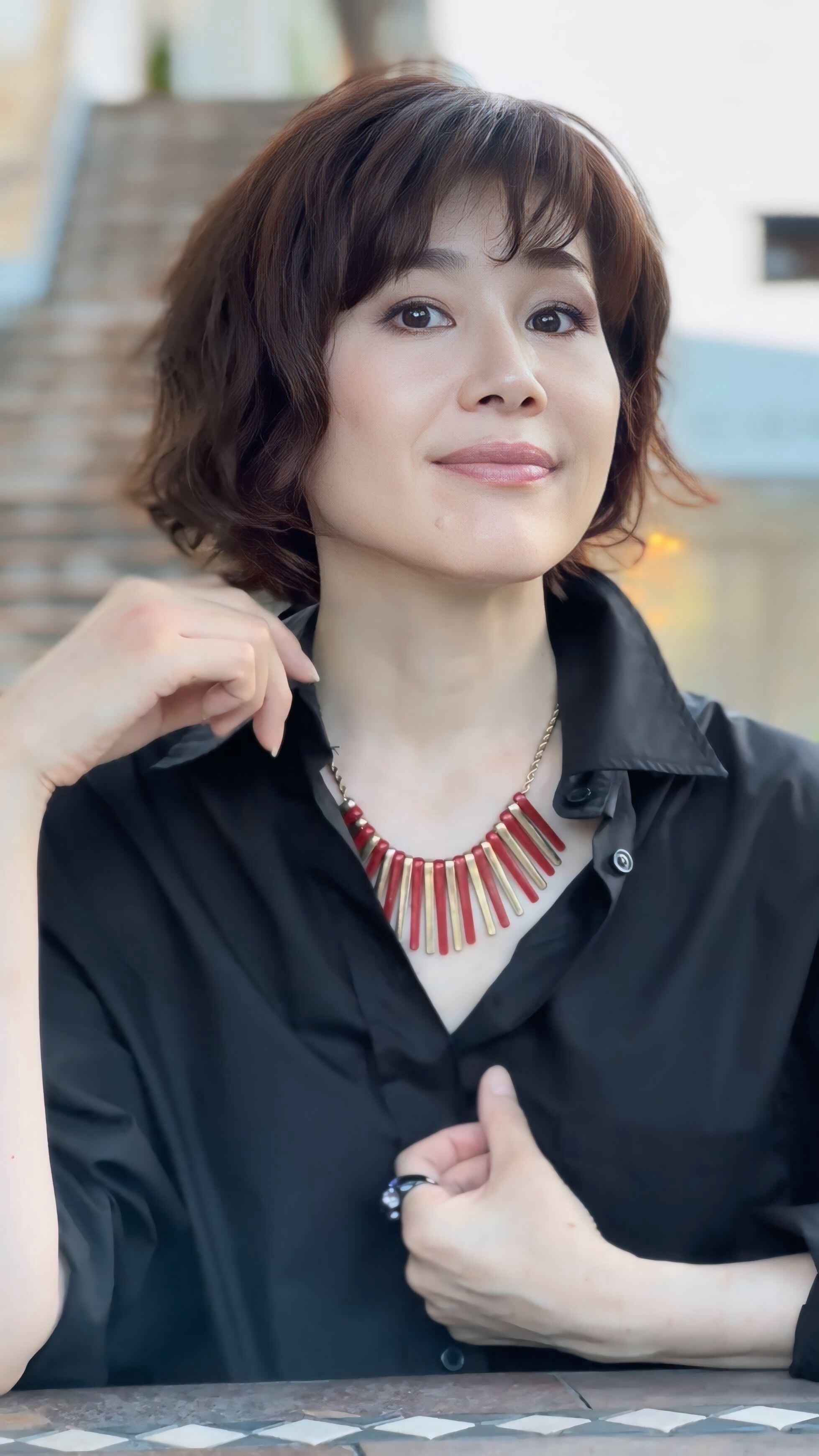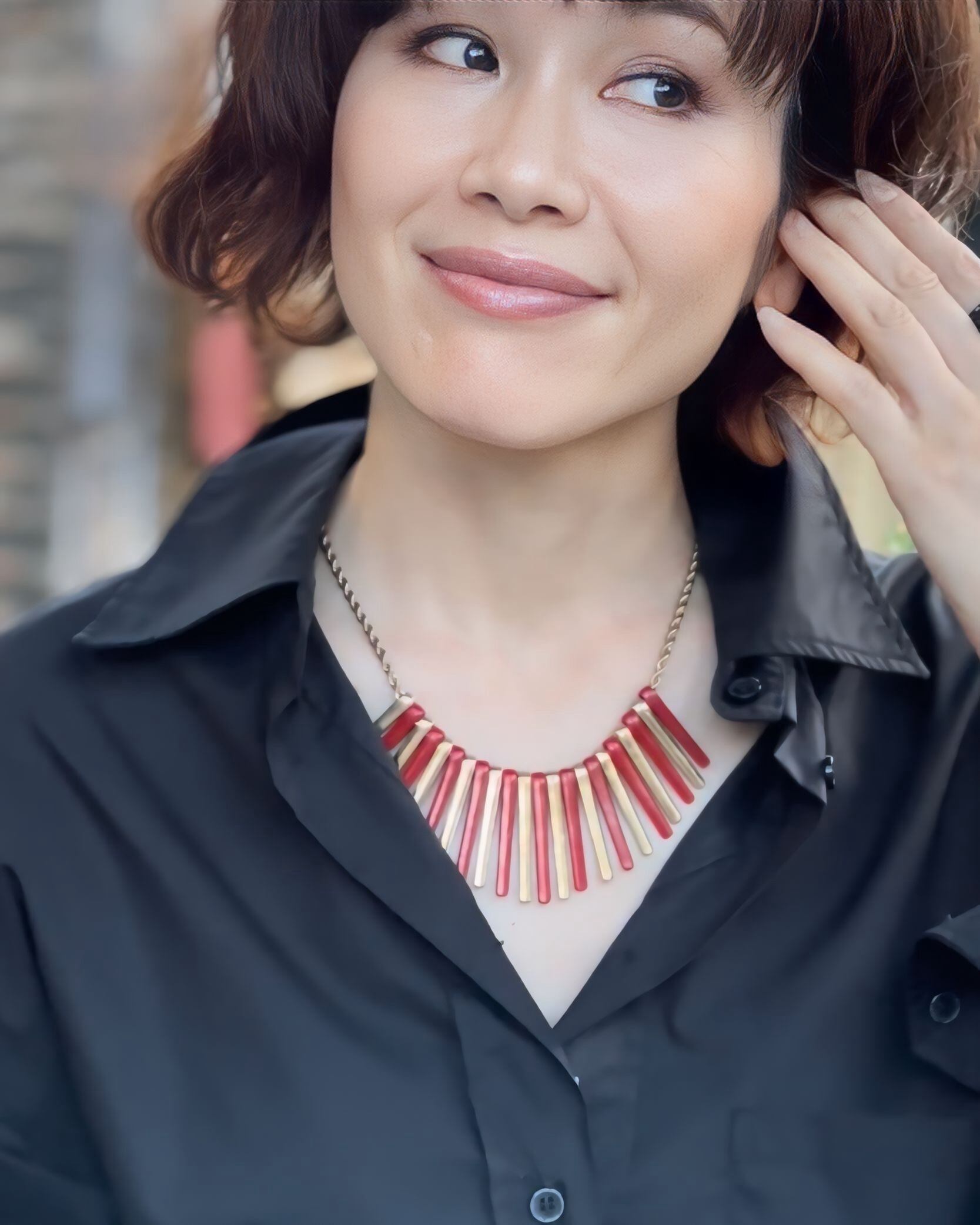 フリンジのように首元で綺麗に広がり、レッドとゴールドのコントラストがとても洗練された印象になります✨