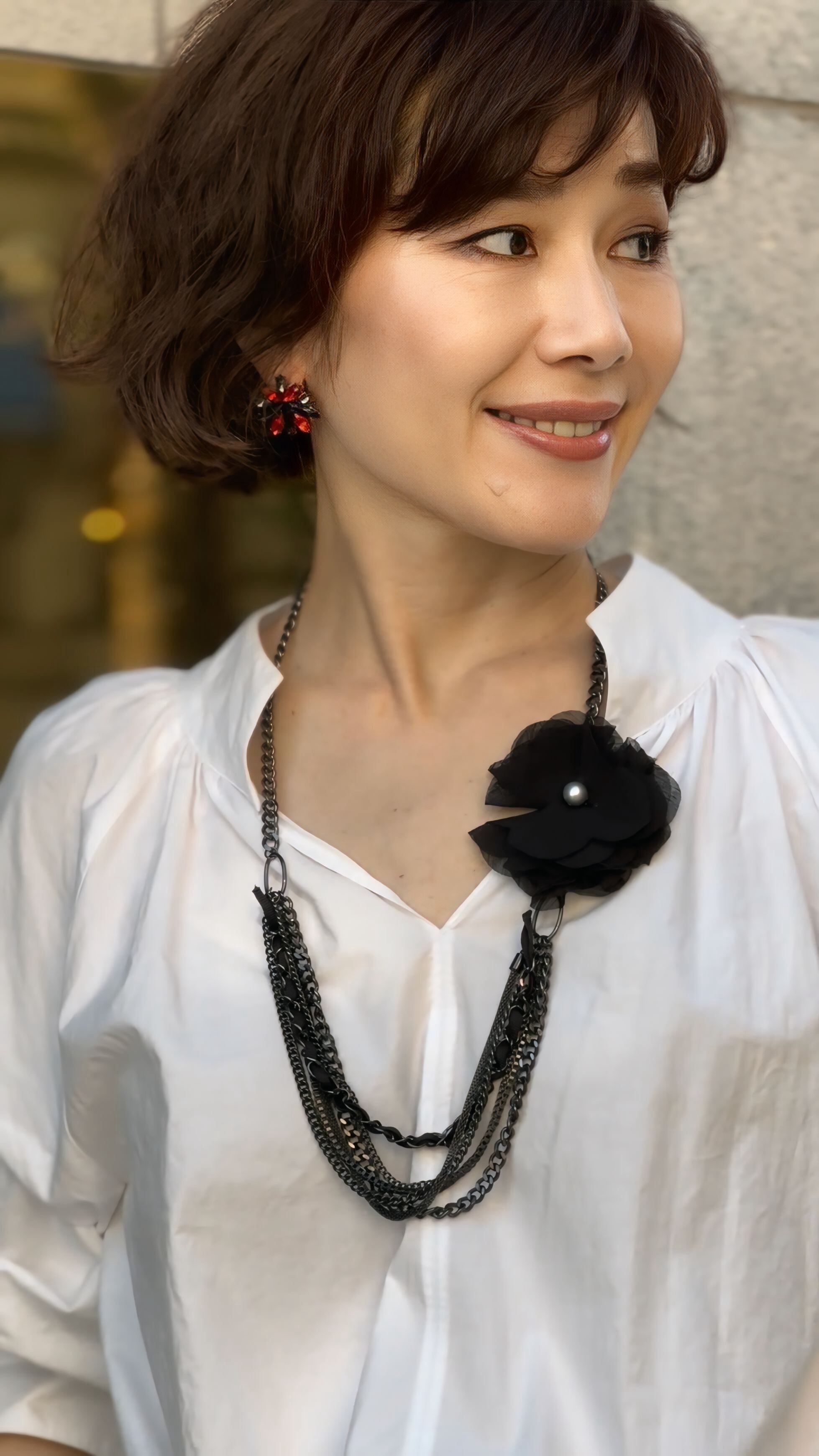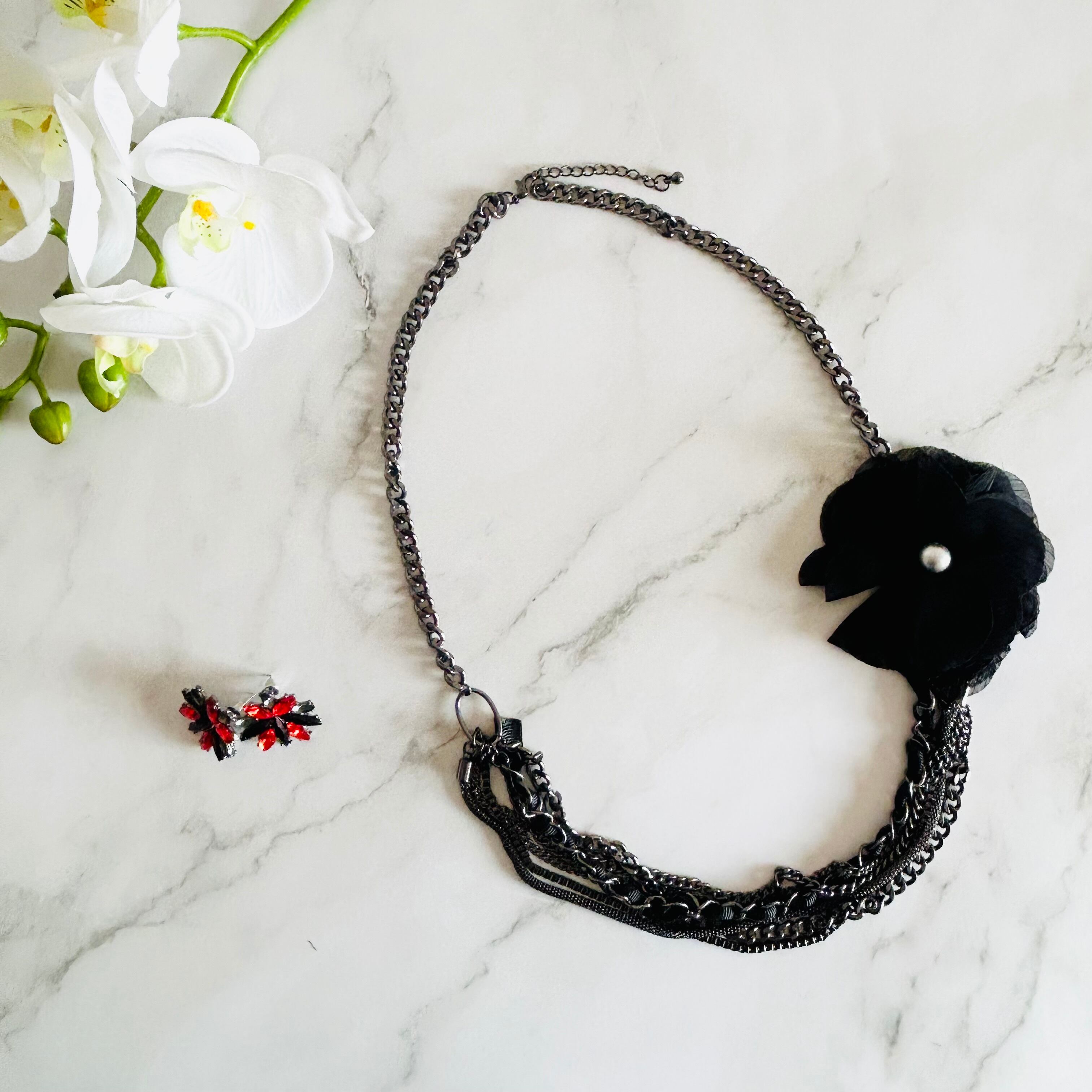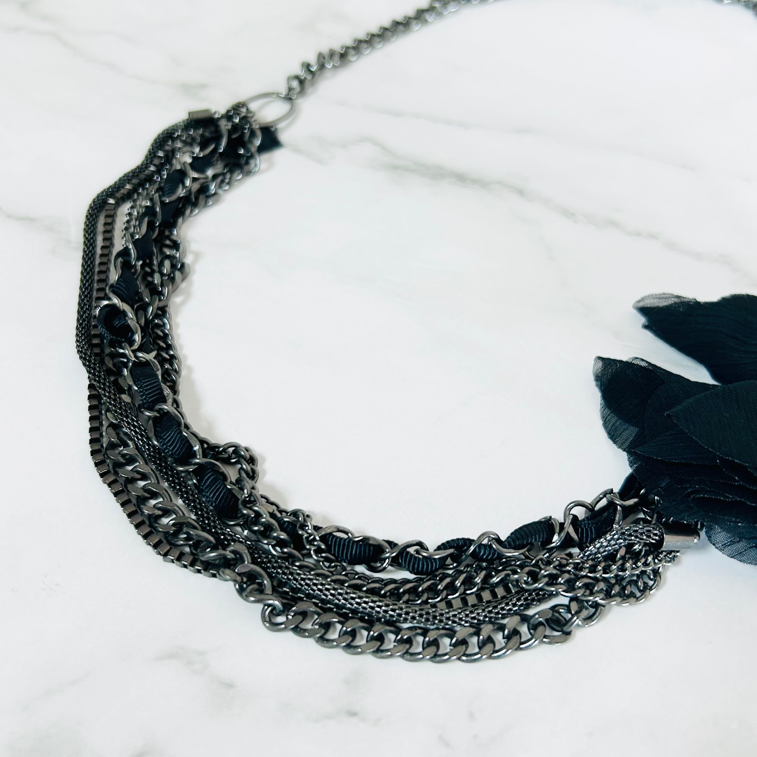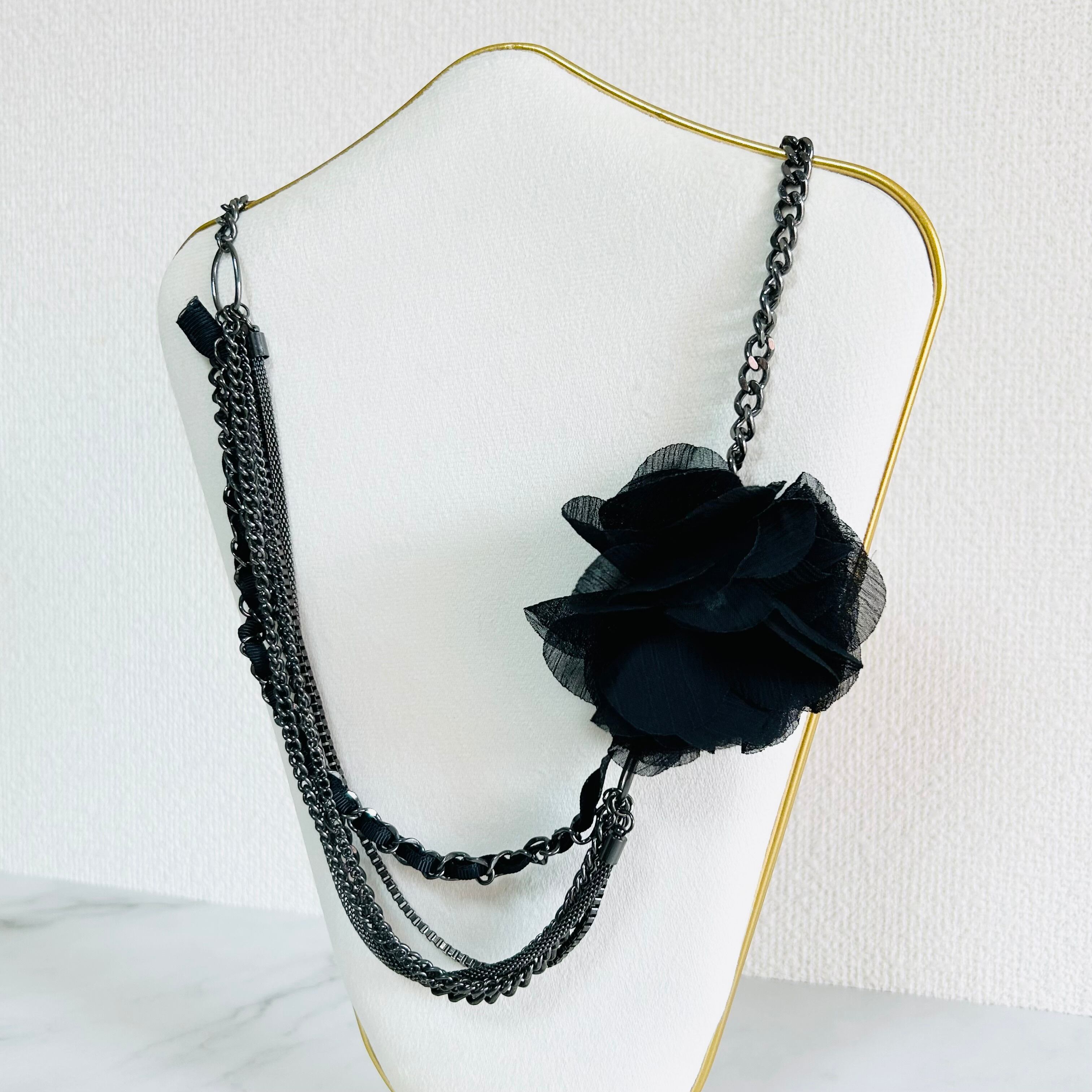 デザインの異なる5種類のチェーンを組み合わせ、ブラックのフラワーモチーフに繋げたアシンメトリーデザインです。