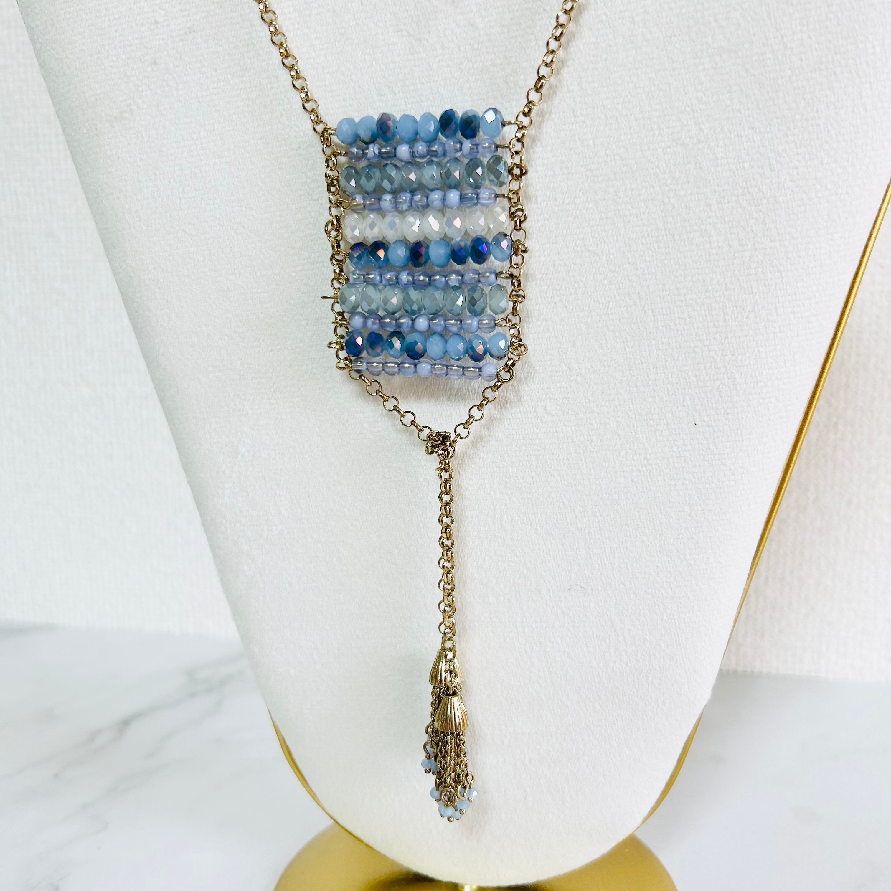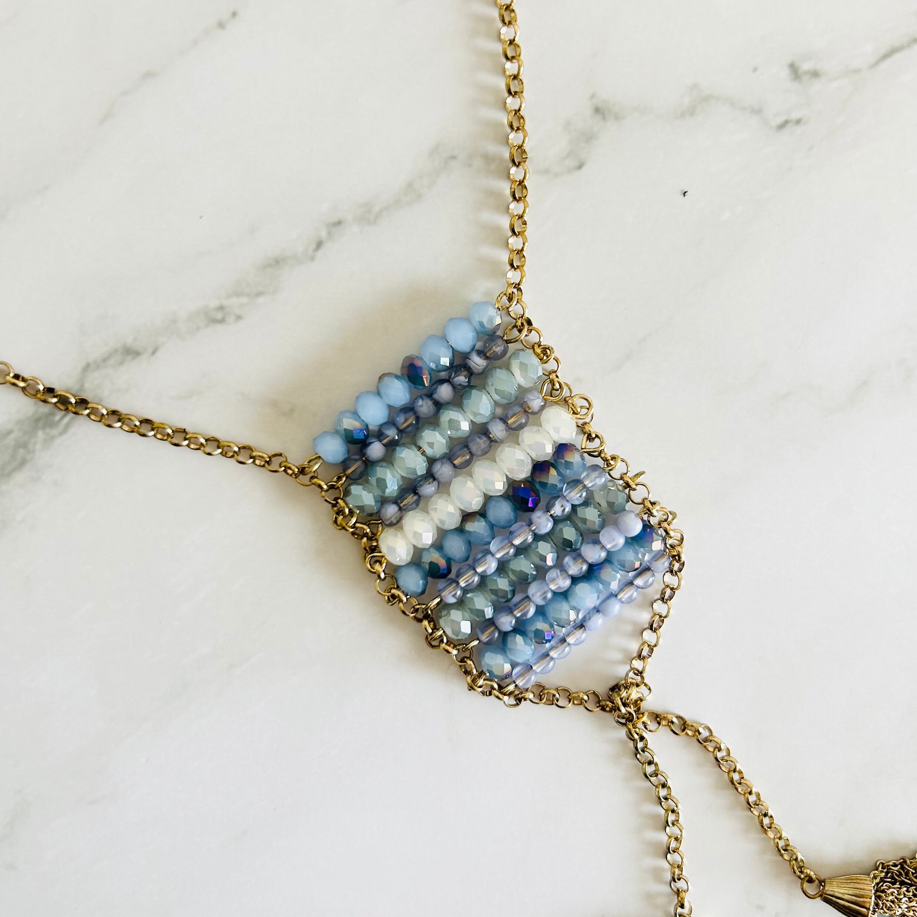 クリスタルビーズを使用しブルーのグラデーションで作られたモチーフにタッセルをプラスしたロングデザインです。