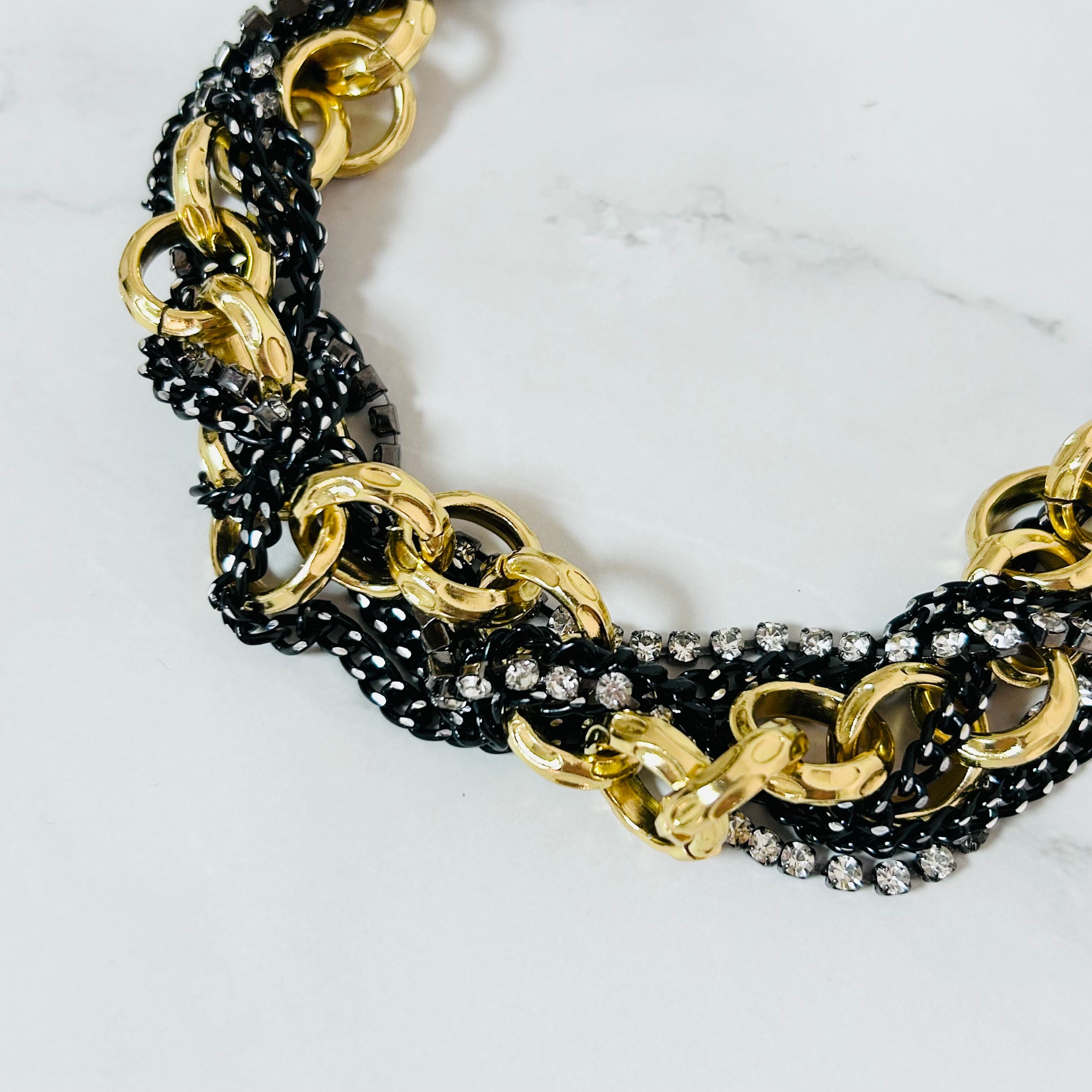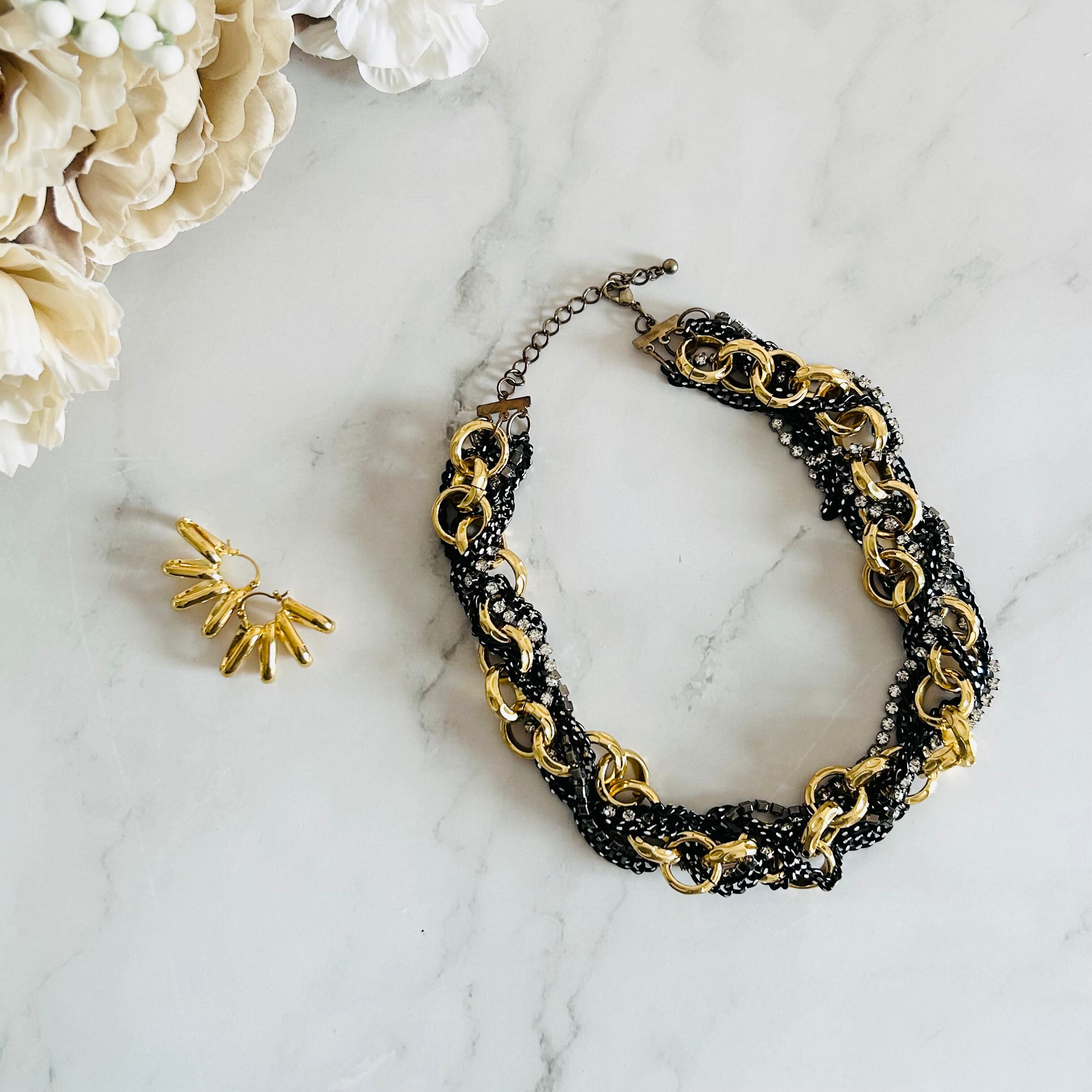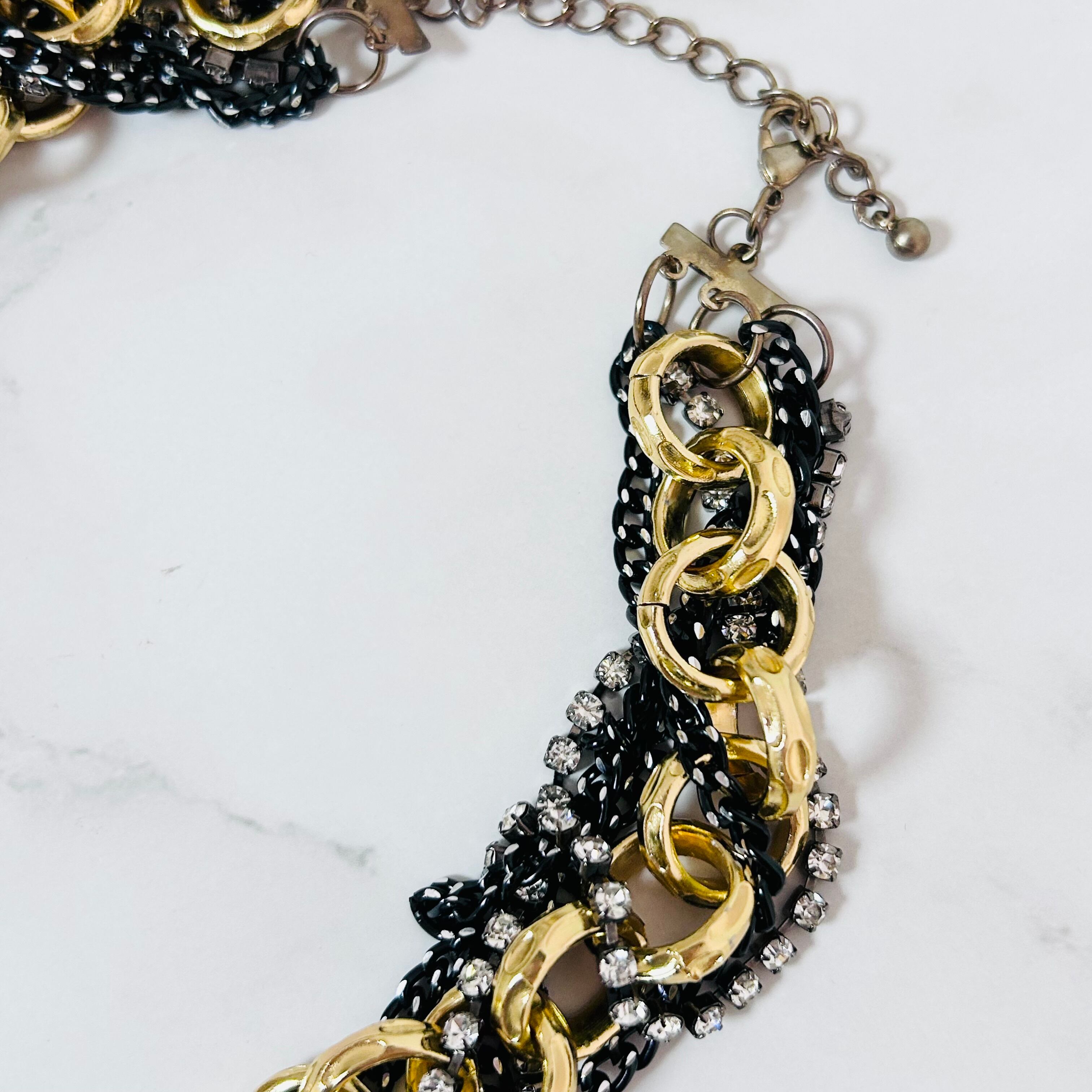 艶やかなブラック、美しく輝くラインストーン、ゴージャスなリングモチーフ、テイストの異なるさまざまなチェーンを組み合わせたデザインです。