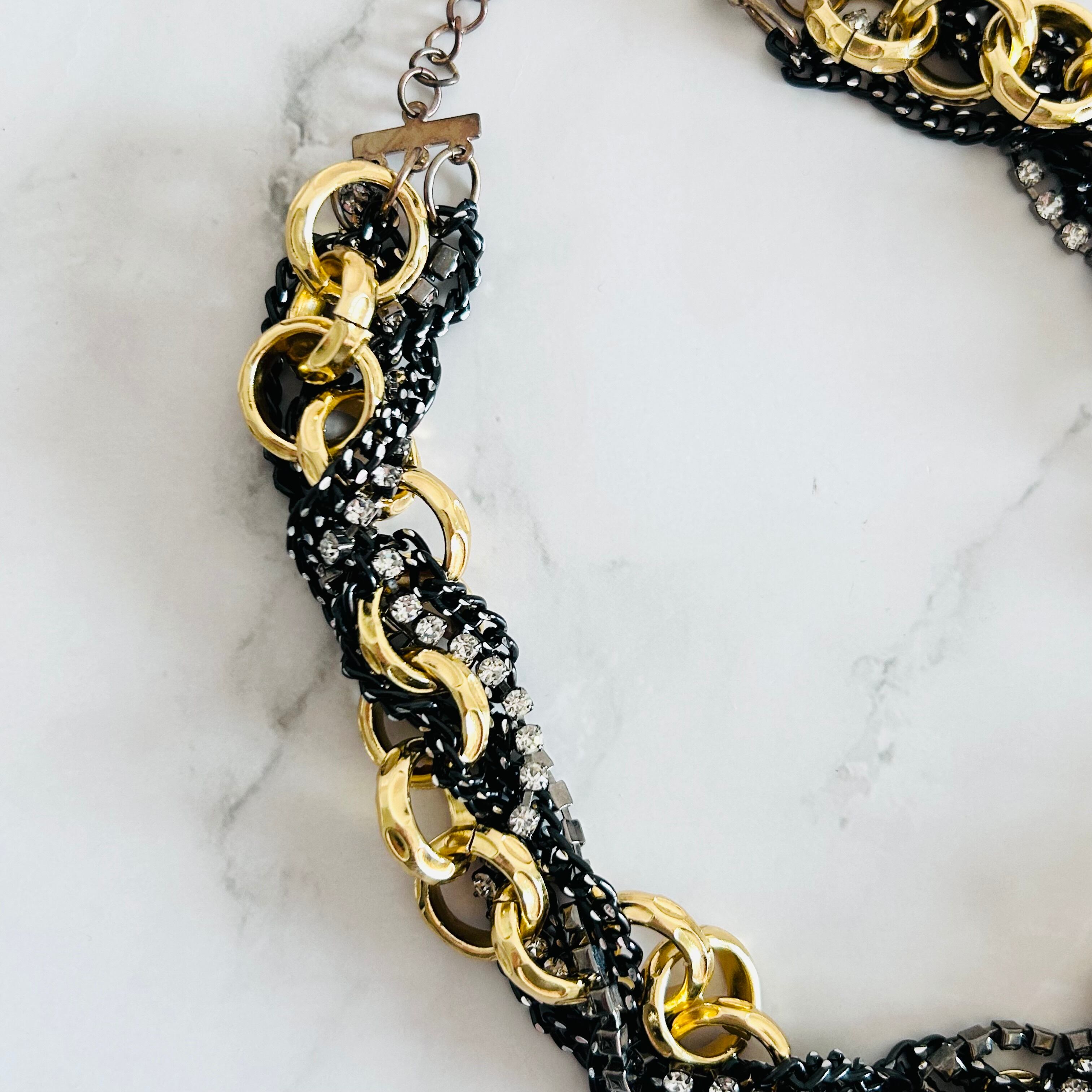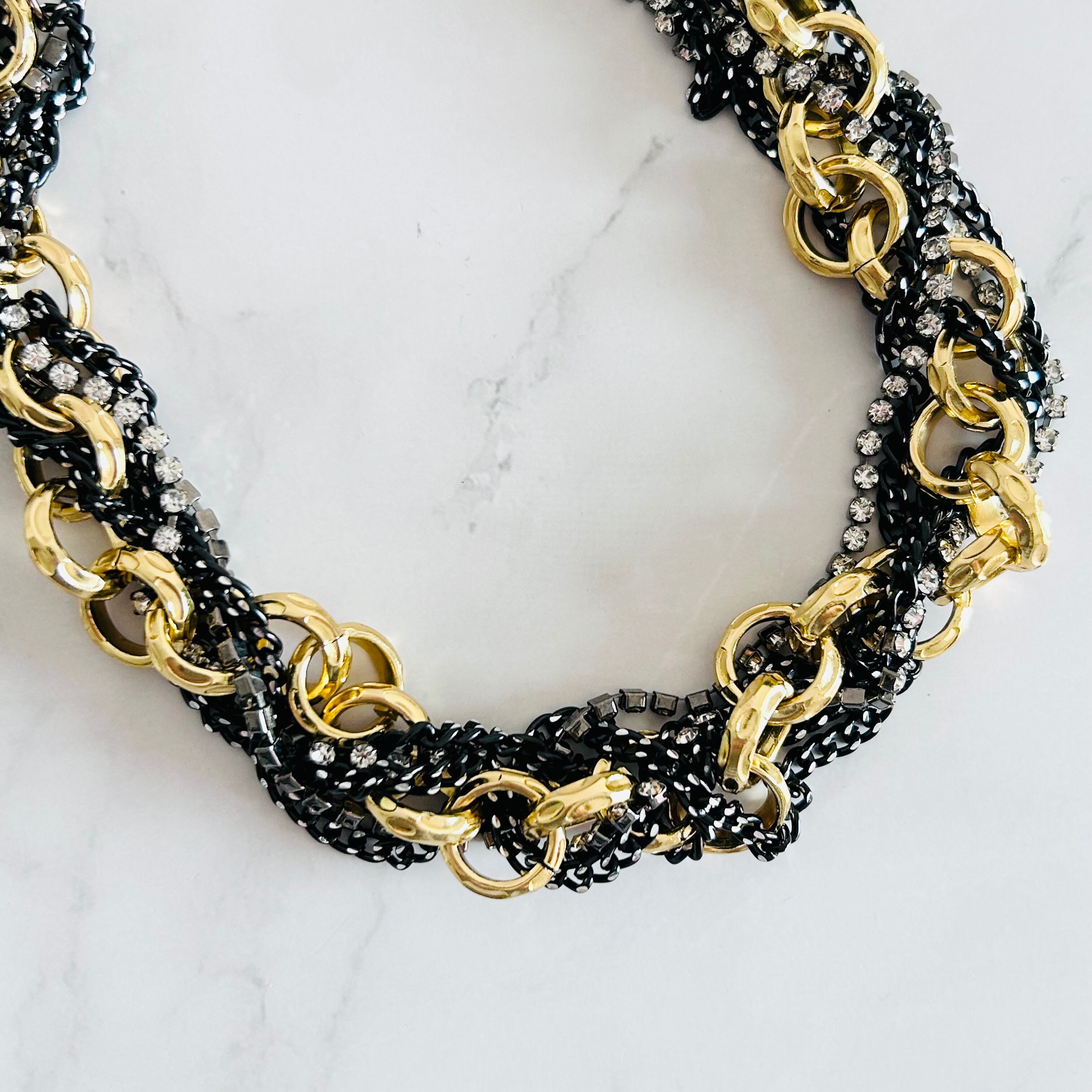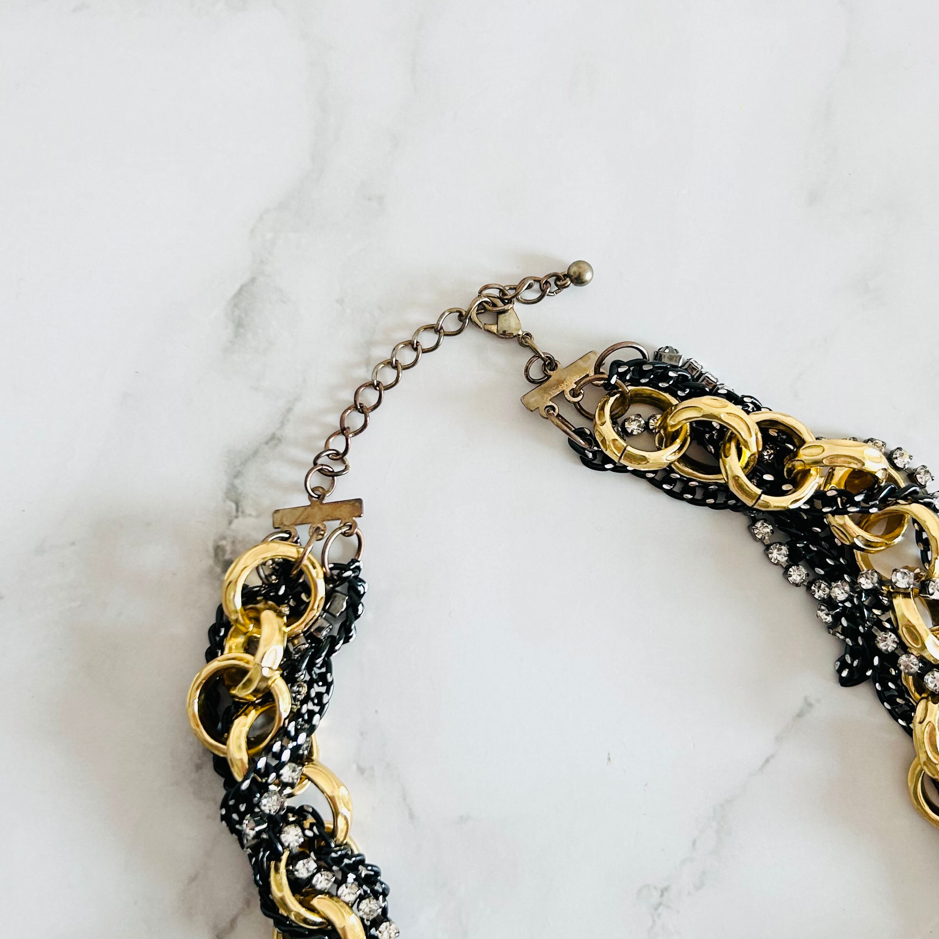 艶やかなブラック、美しく輝くラインストーン、ゴージャスなリングモチーフ、テイストの異なるさまざまなチェーンを組み合わせたデザインです。