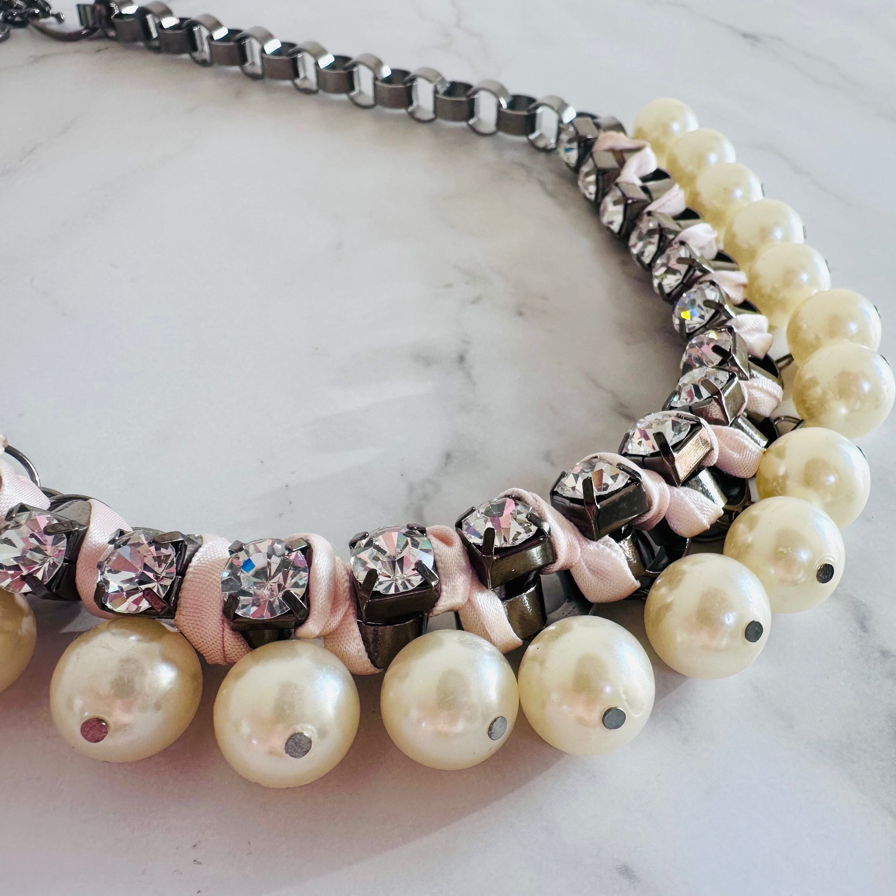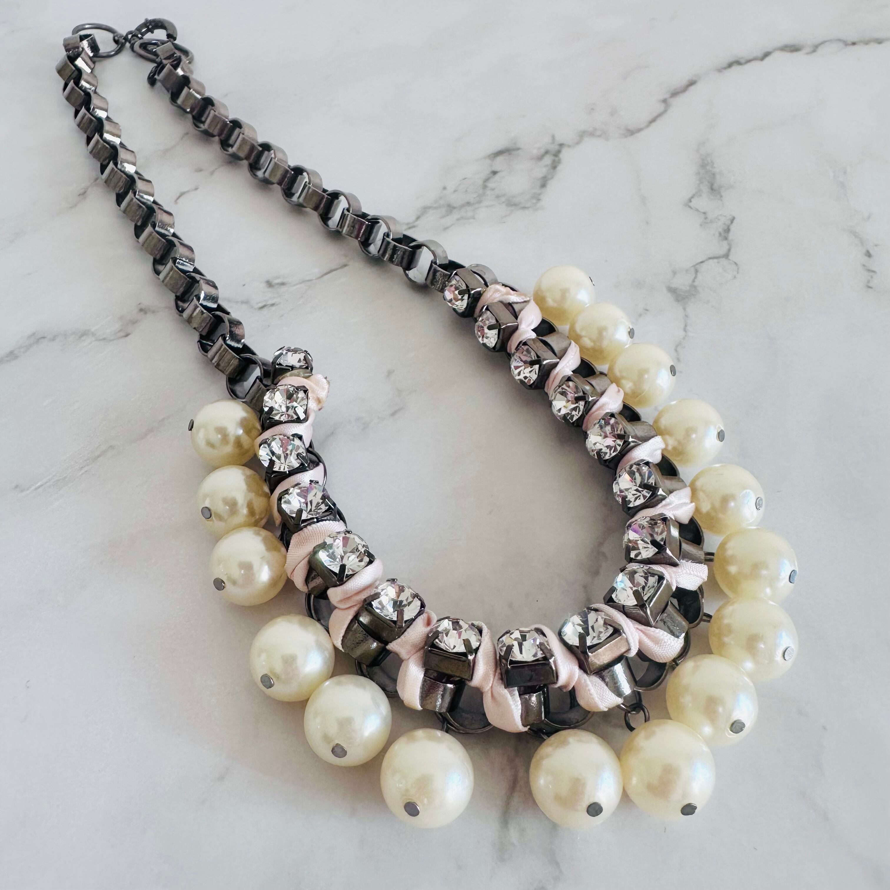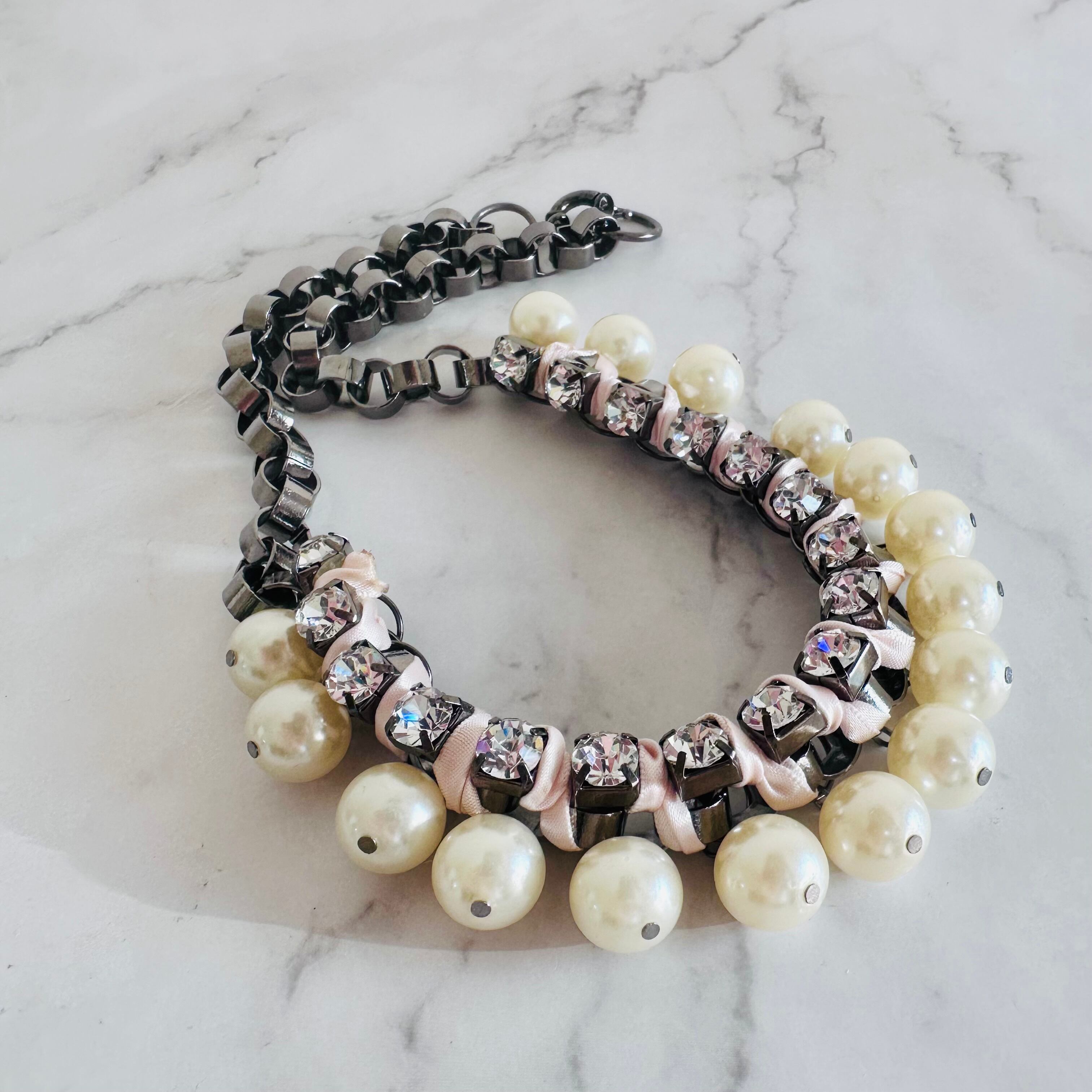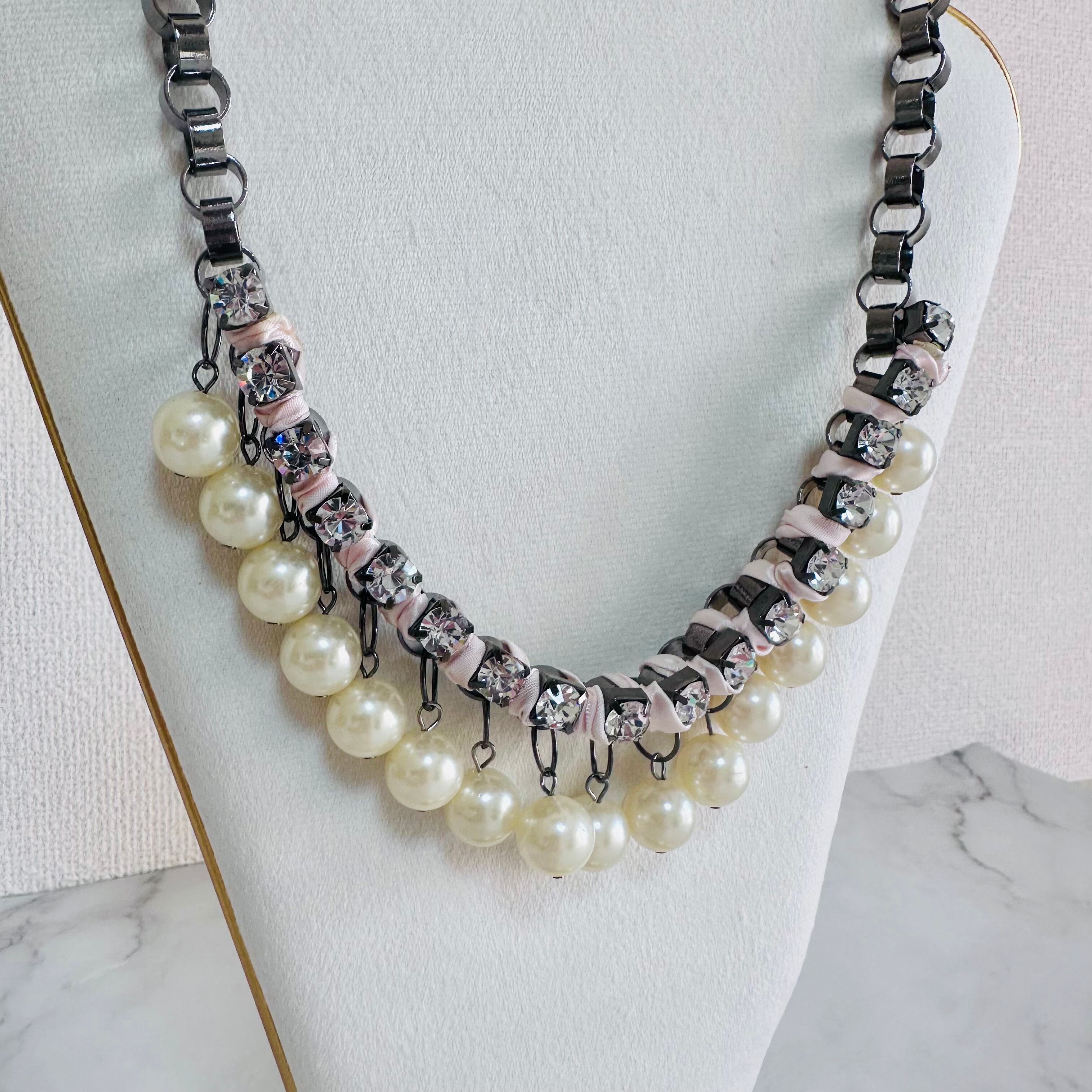 ブラックメタルチェーンに優雅な輝きを放つパールと華やかなラインストーンをプラスし、ライトピンクのリボンを編み込んだ手の凝ったデザインです。
