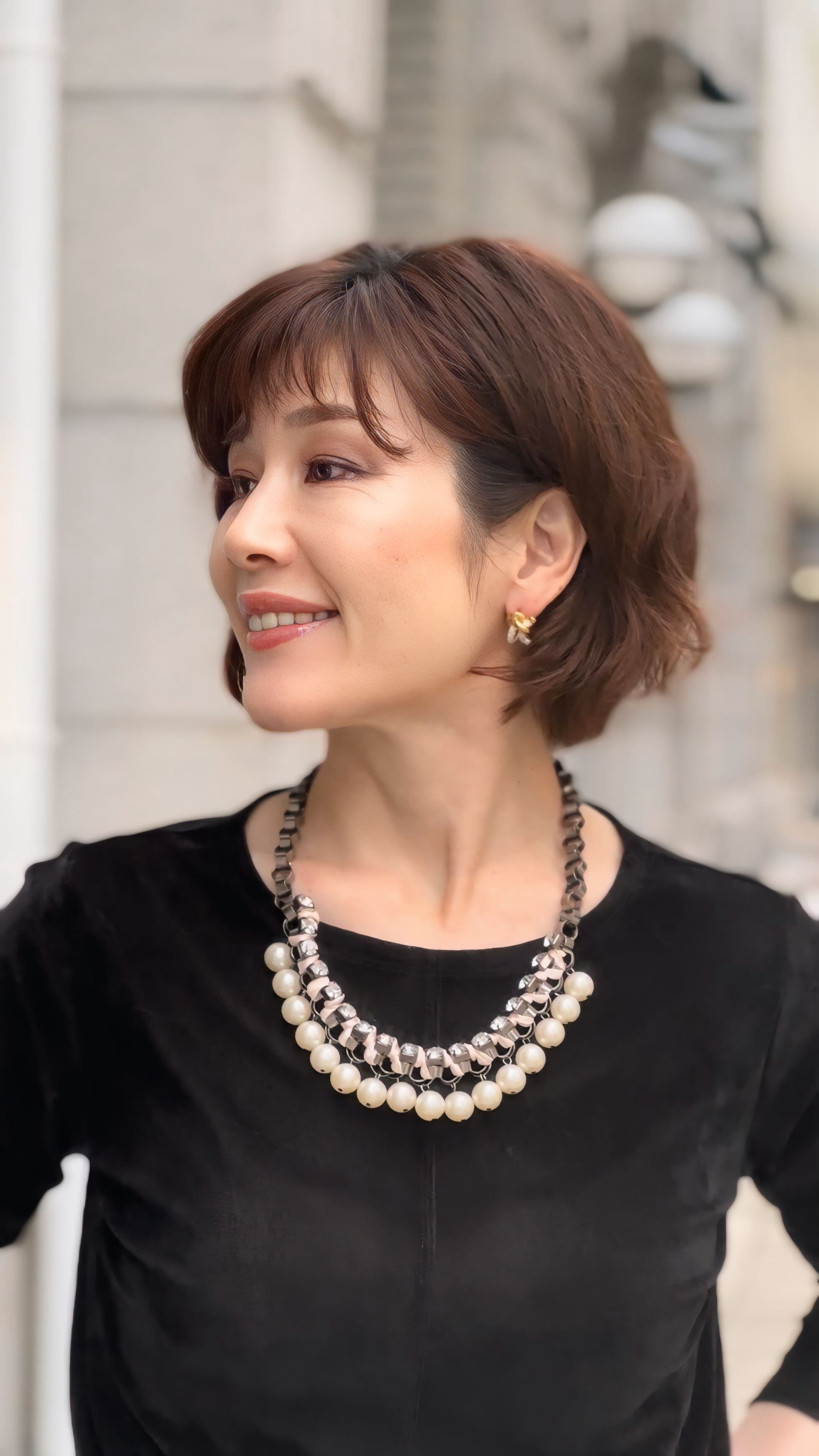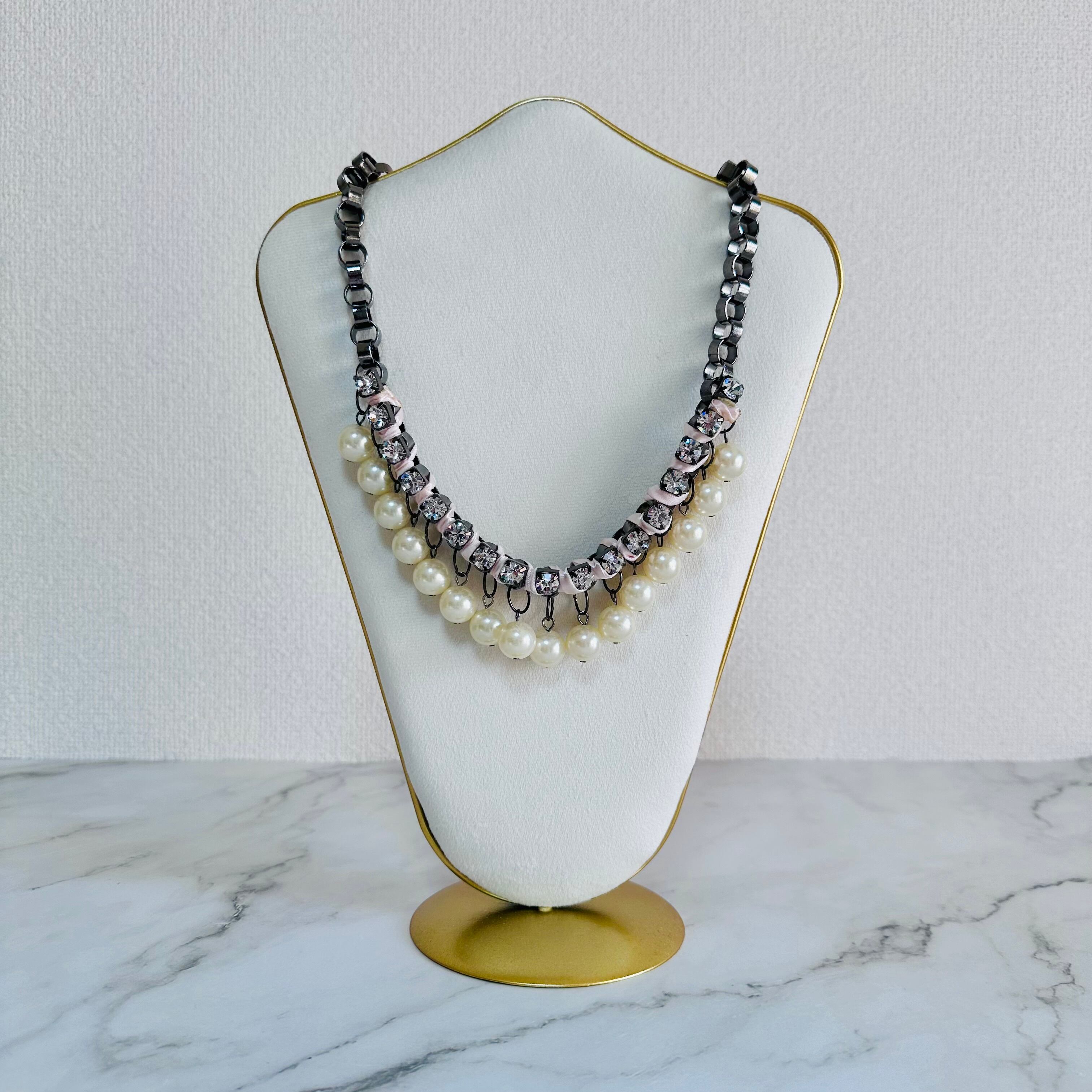 パールホワイト、ライトピンク、クリスタル✖️ブラックメタルカラーのネックレスです。