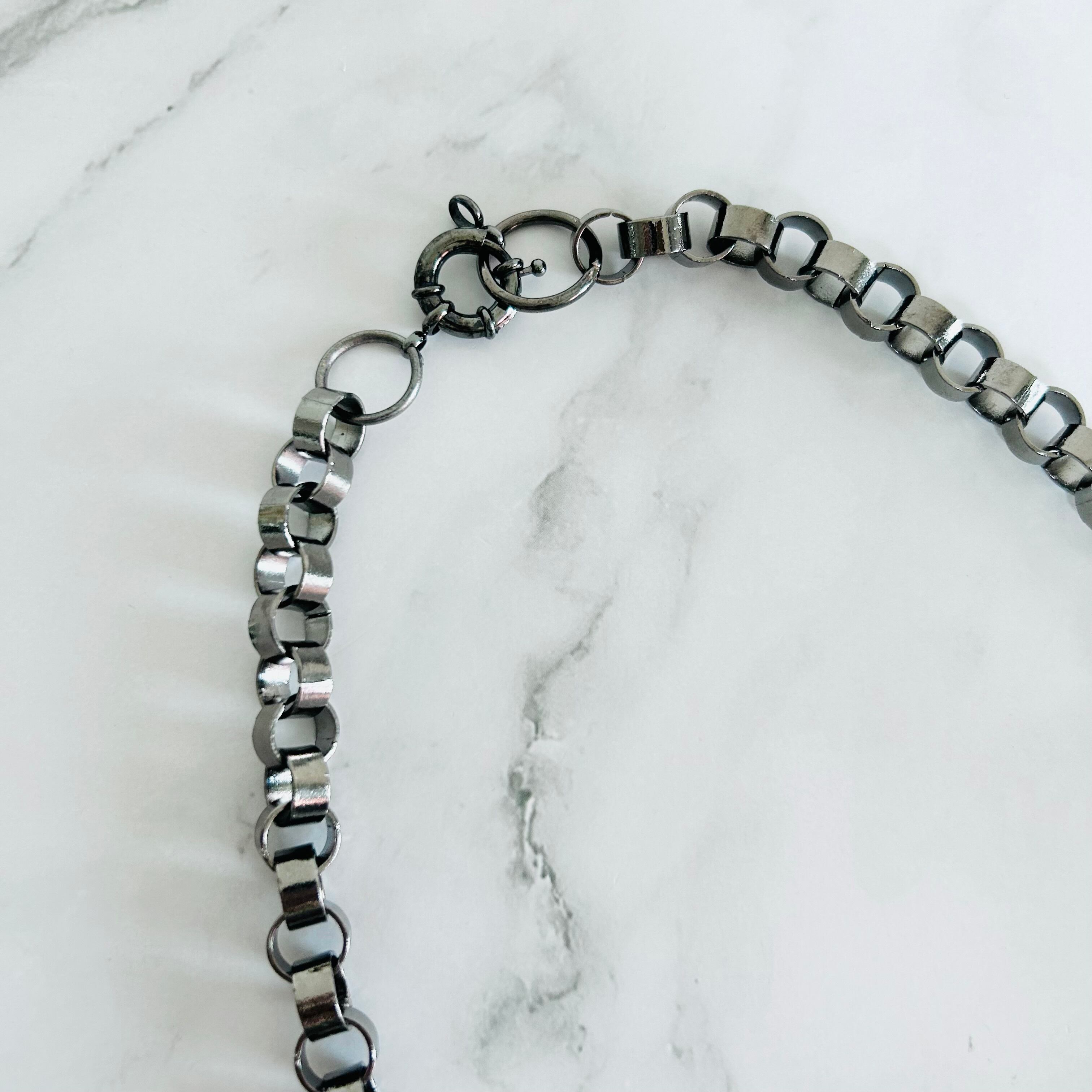 チェーンはあえてブラックメタルの輪っかチェーンを組み合わせ、全体の雰囲気が甘くなりすぎない「エレガント&クール」の絶妙なバランスに仕上げました♡
