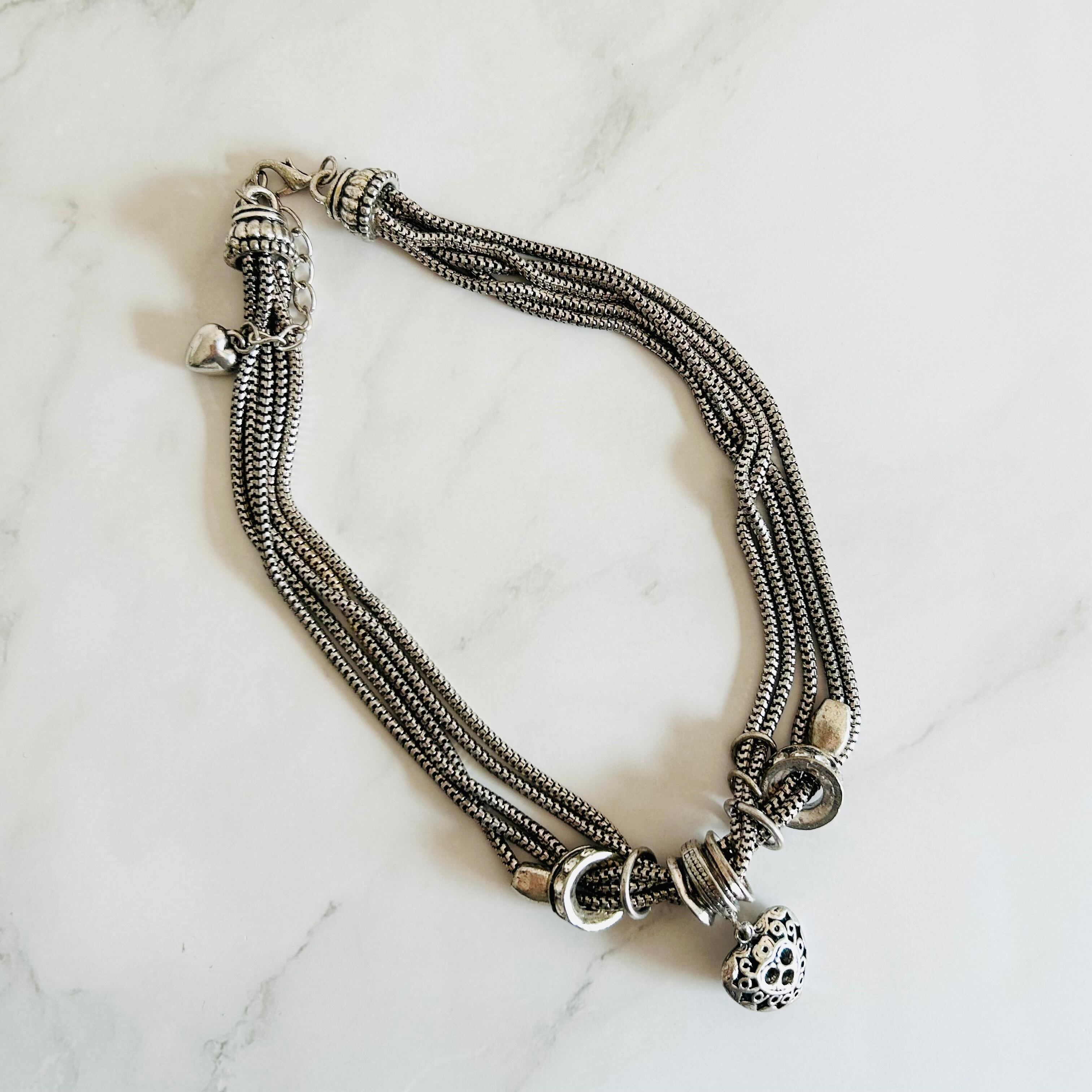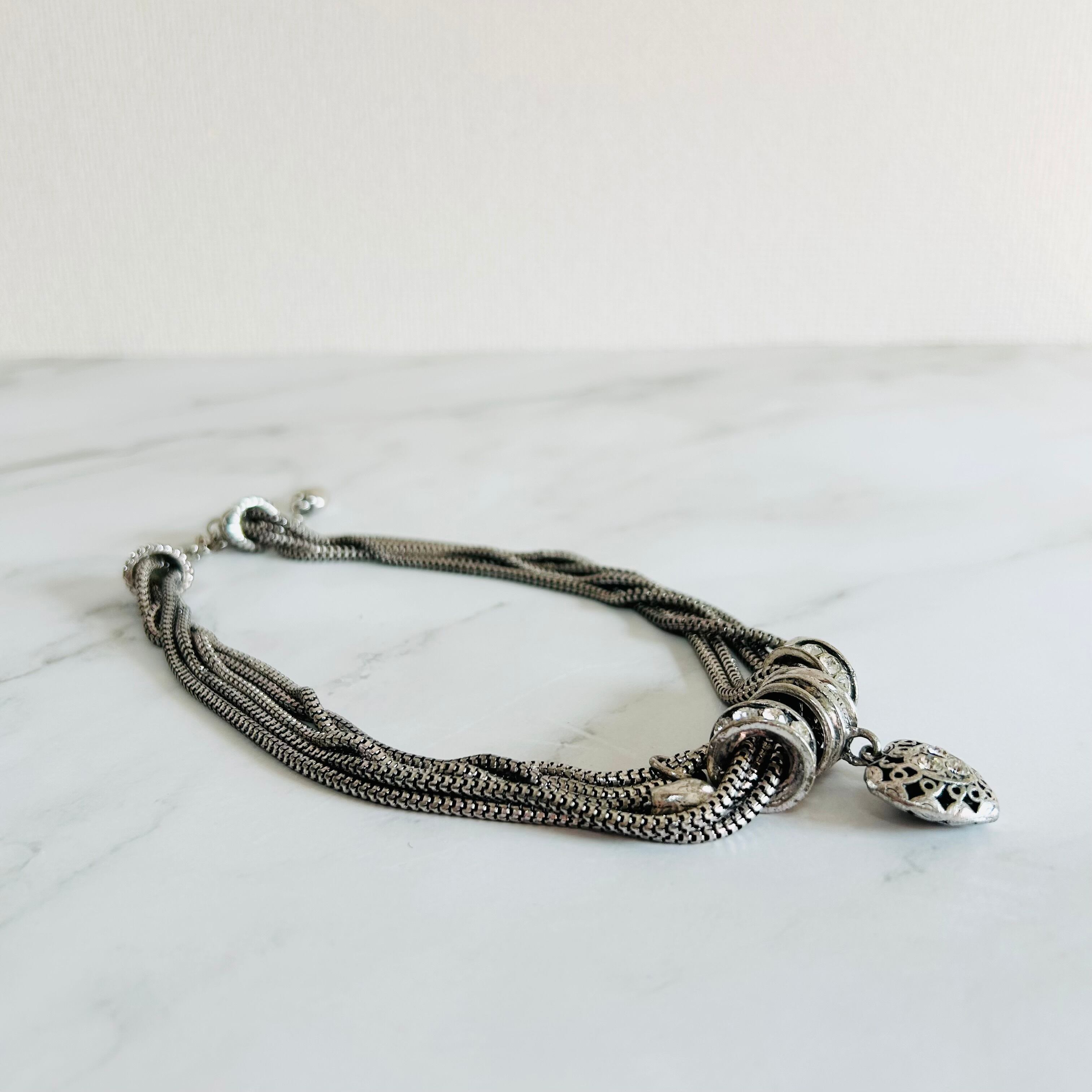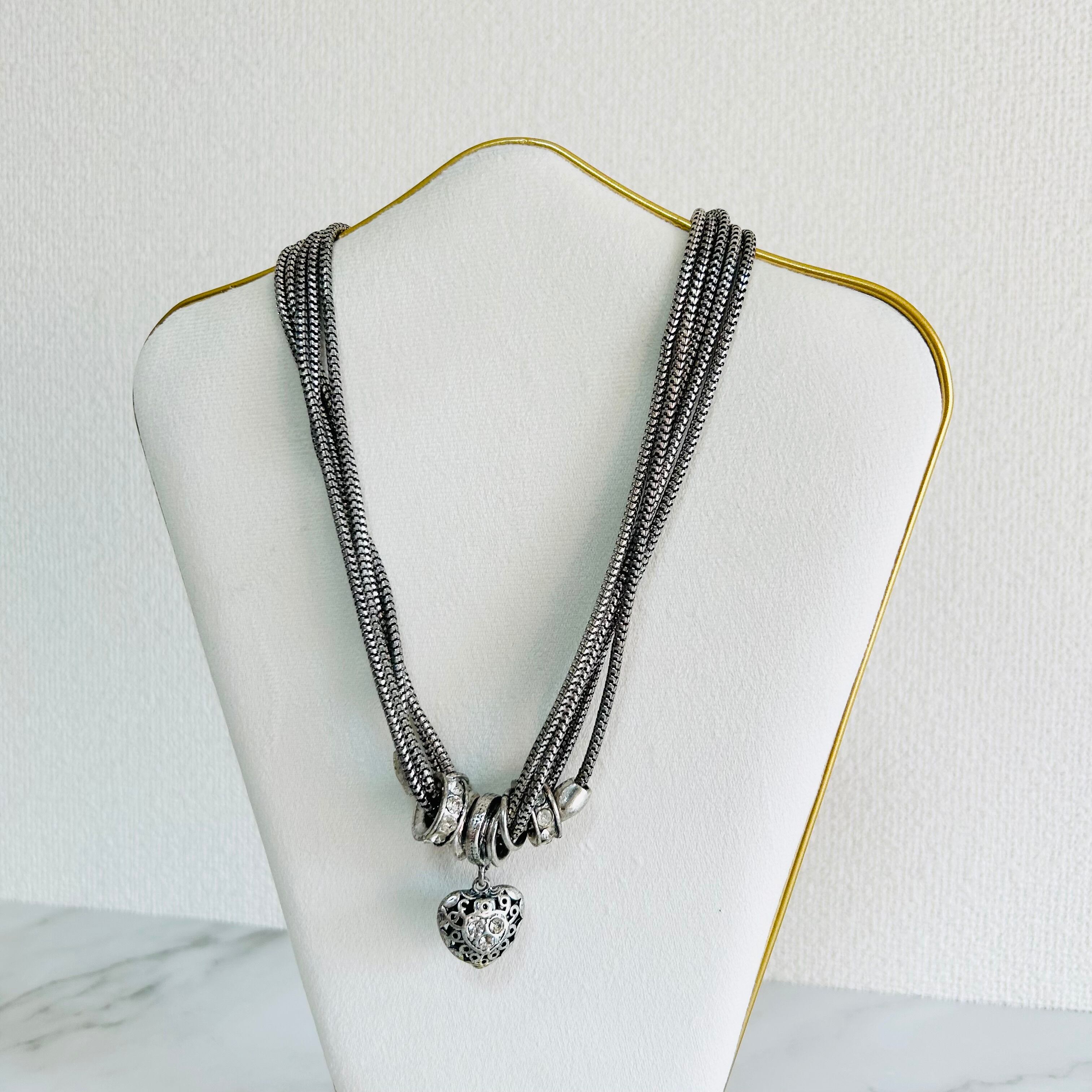 ヴィンテージ調の燻したシルバーチェーンに、ハート型のチャーム、リングパーツなどを取り付けたデザインです。