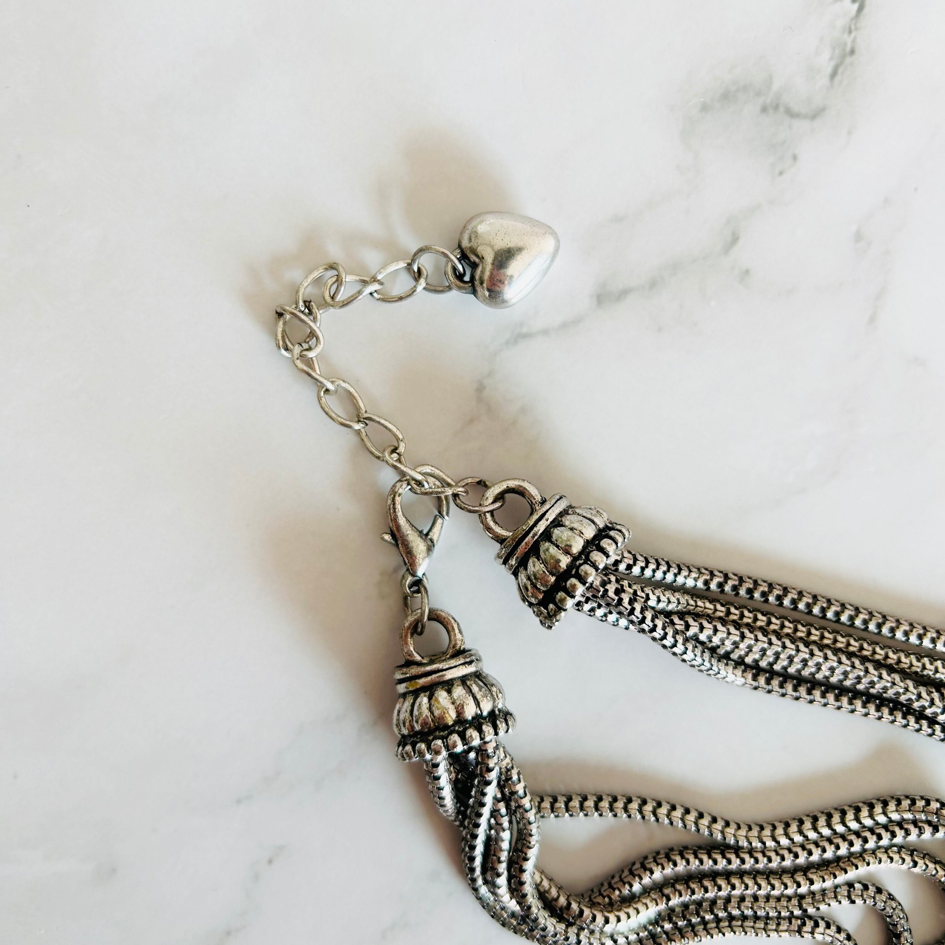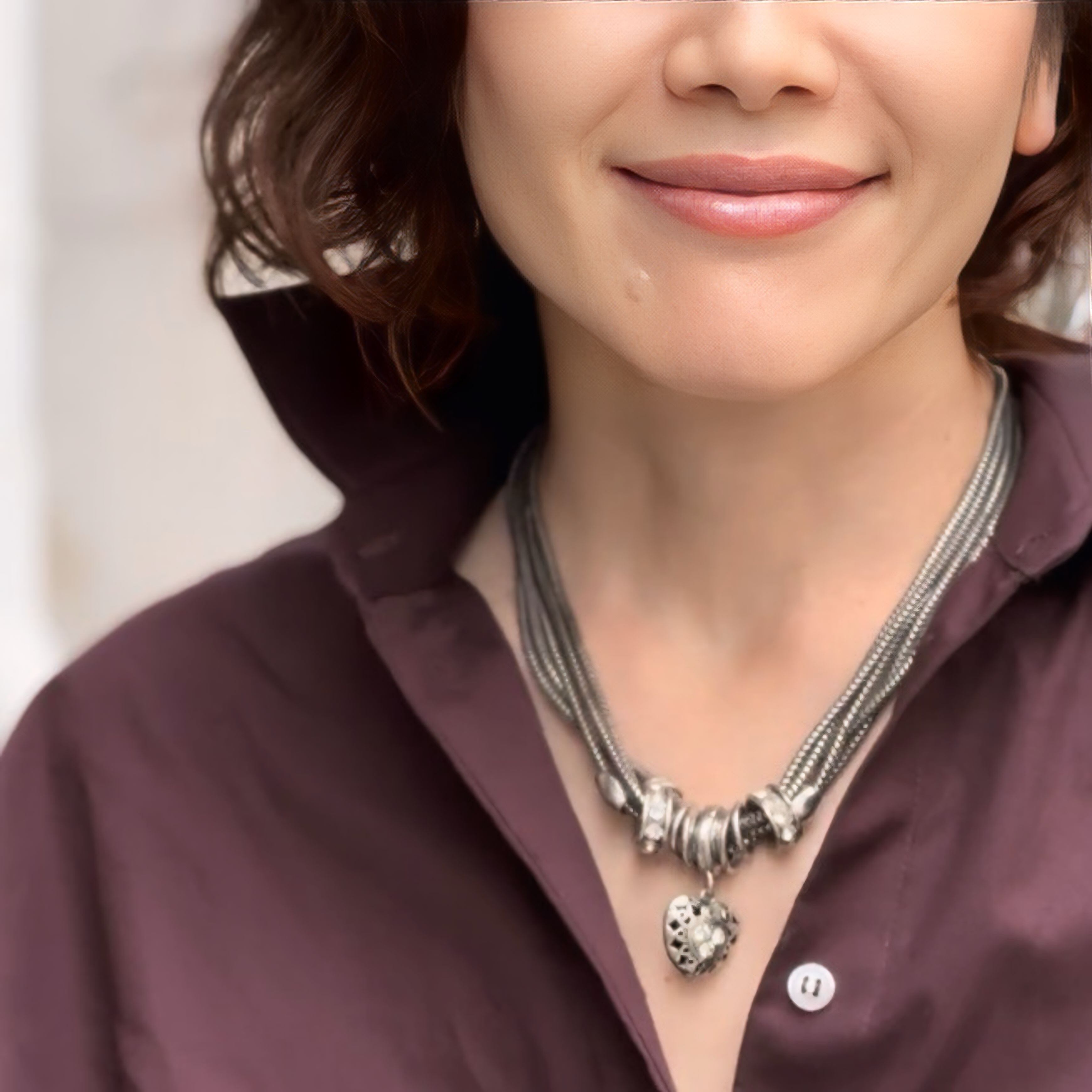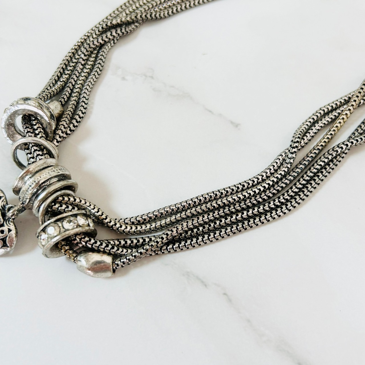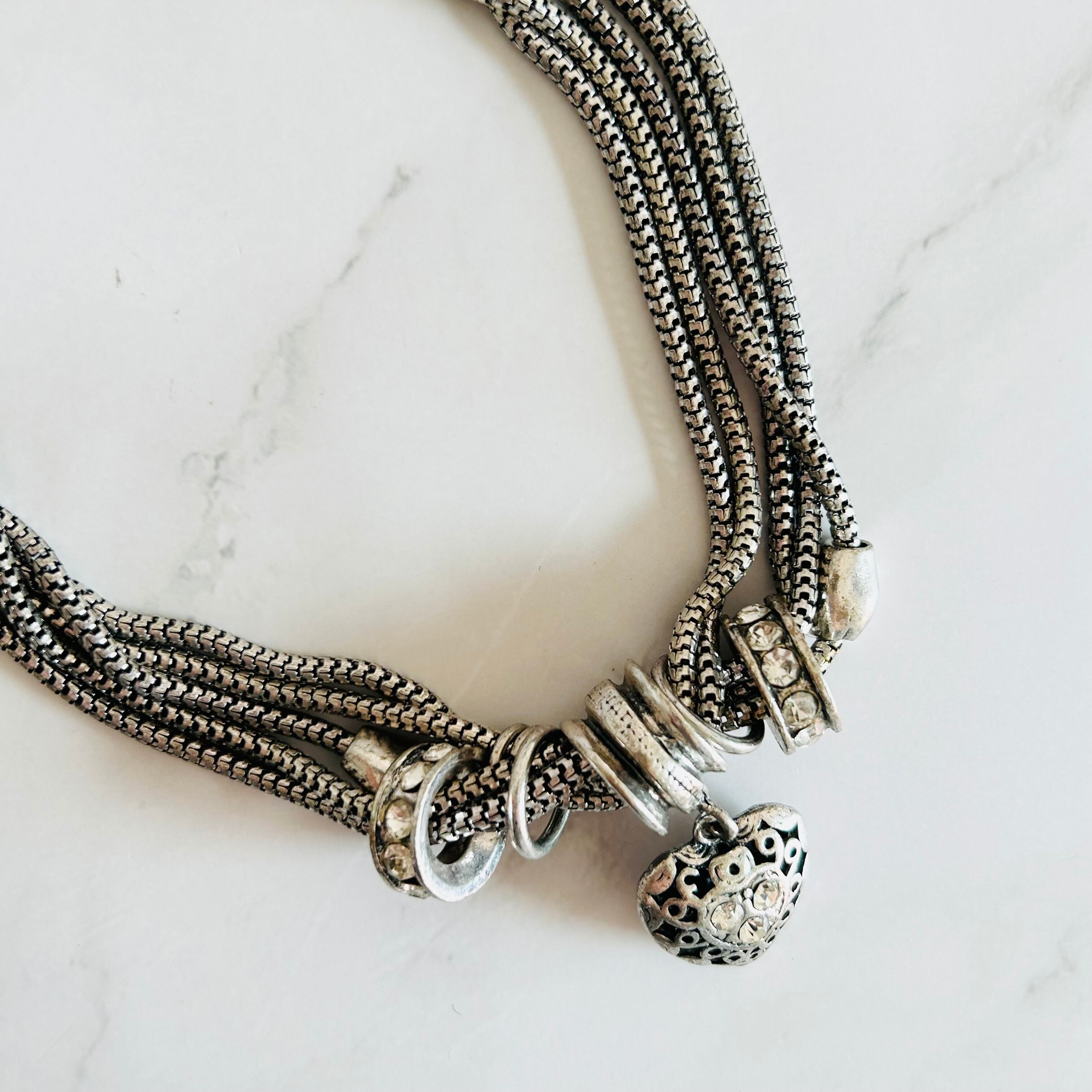 ヴィンテージ調の燻したシルバーチェーンに、ハート型のチャーム、リングパーツなどを取り付けたデザインです。