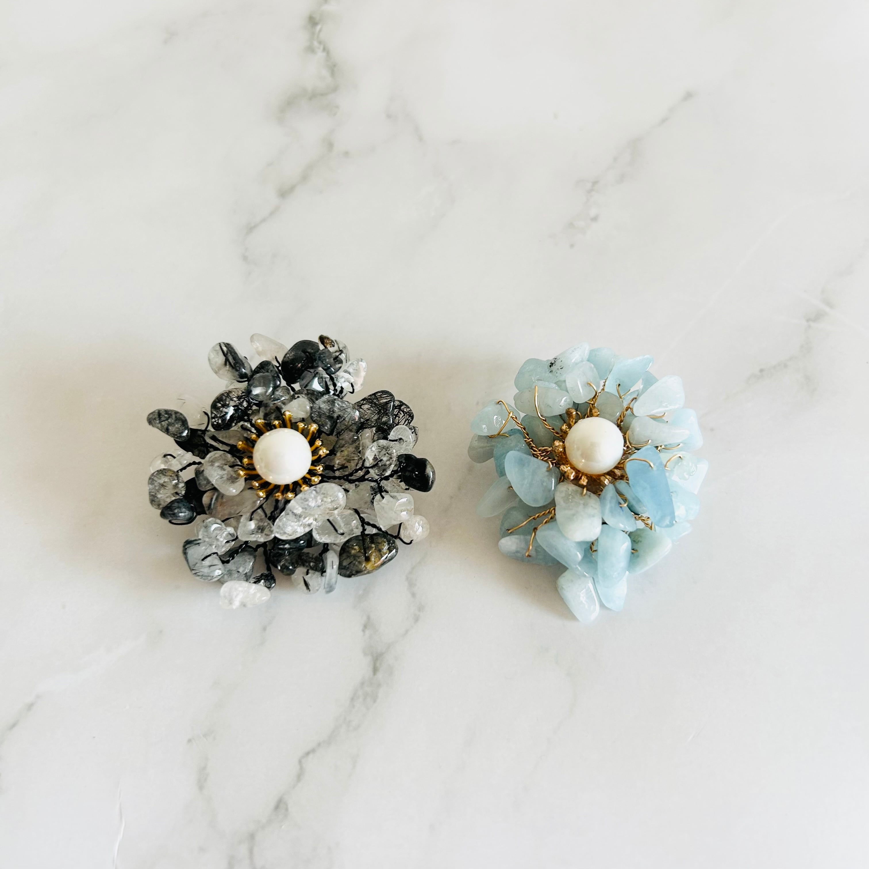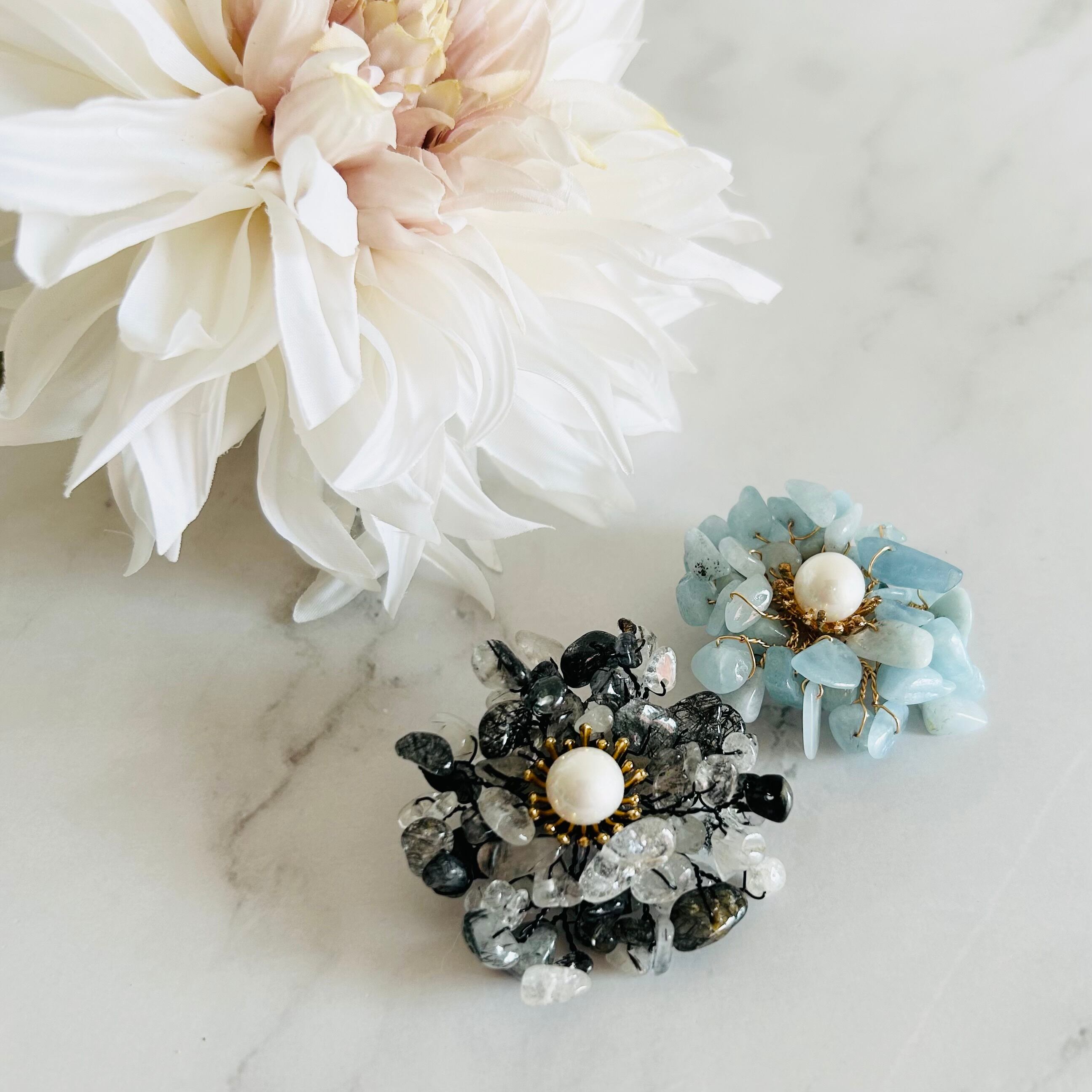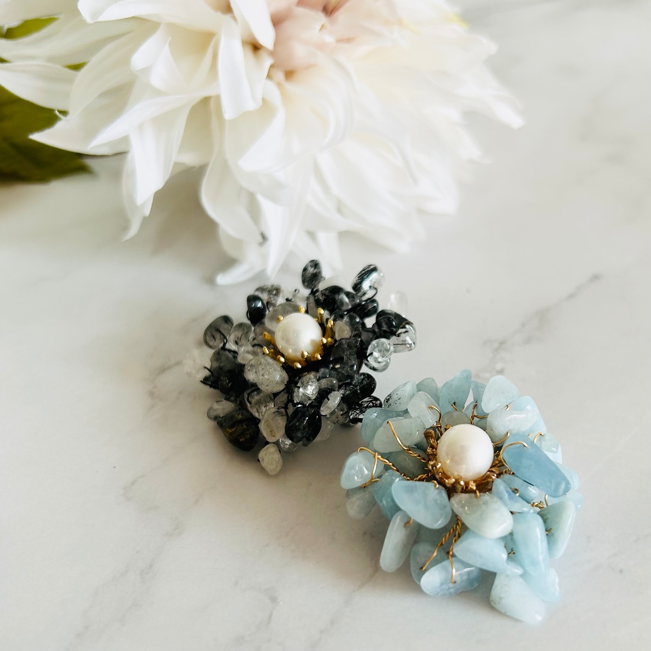 透明感のある天然石を使用し、ワイヤーで華やかなフラワーモチーフにしたデザインです。