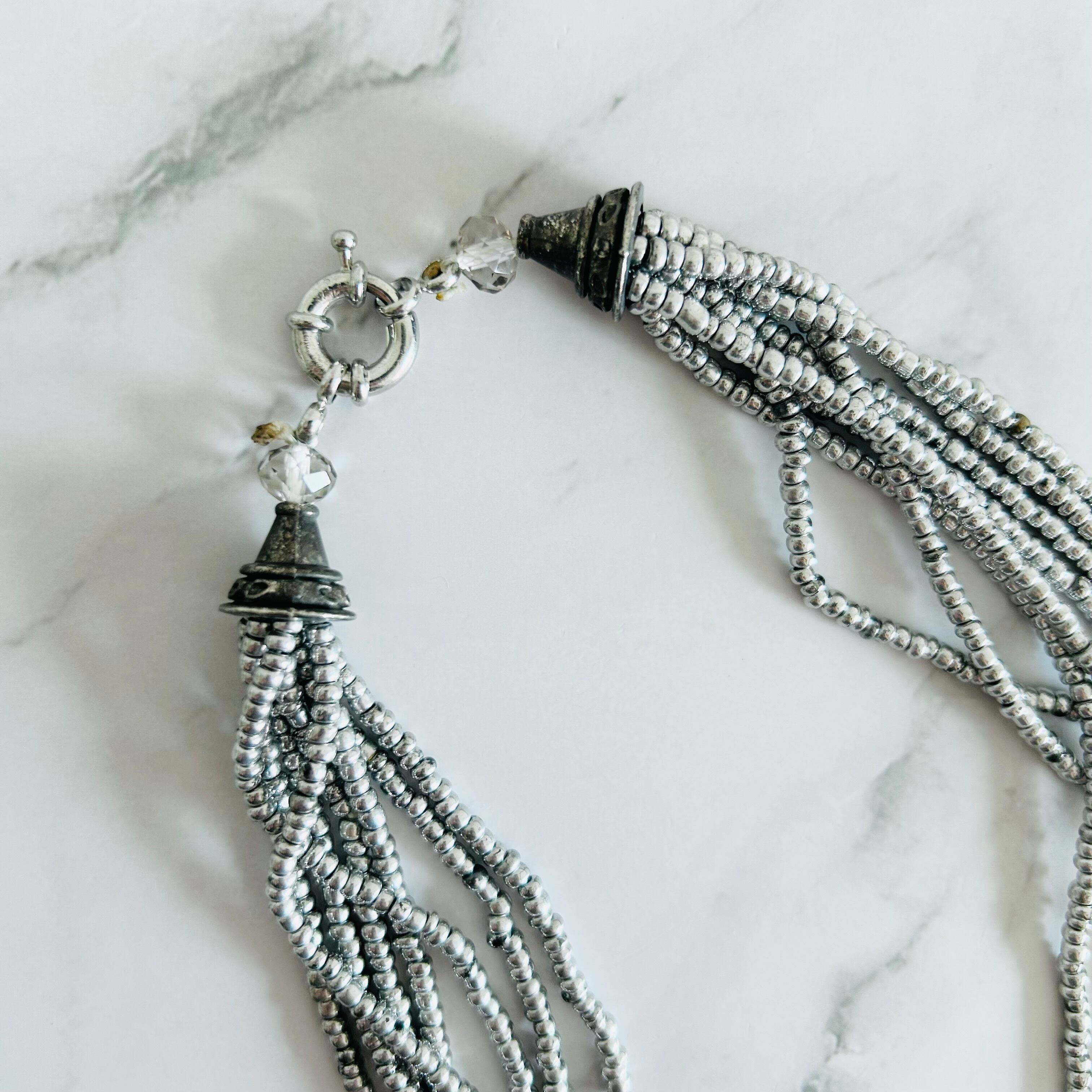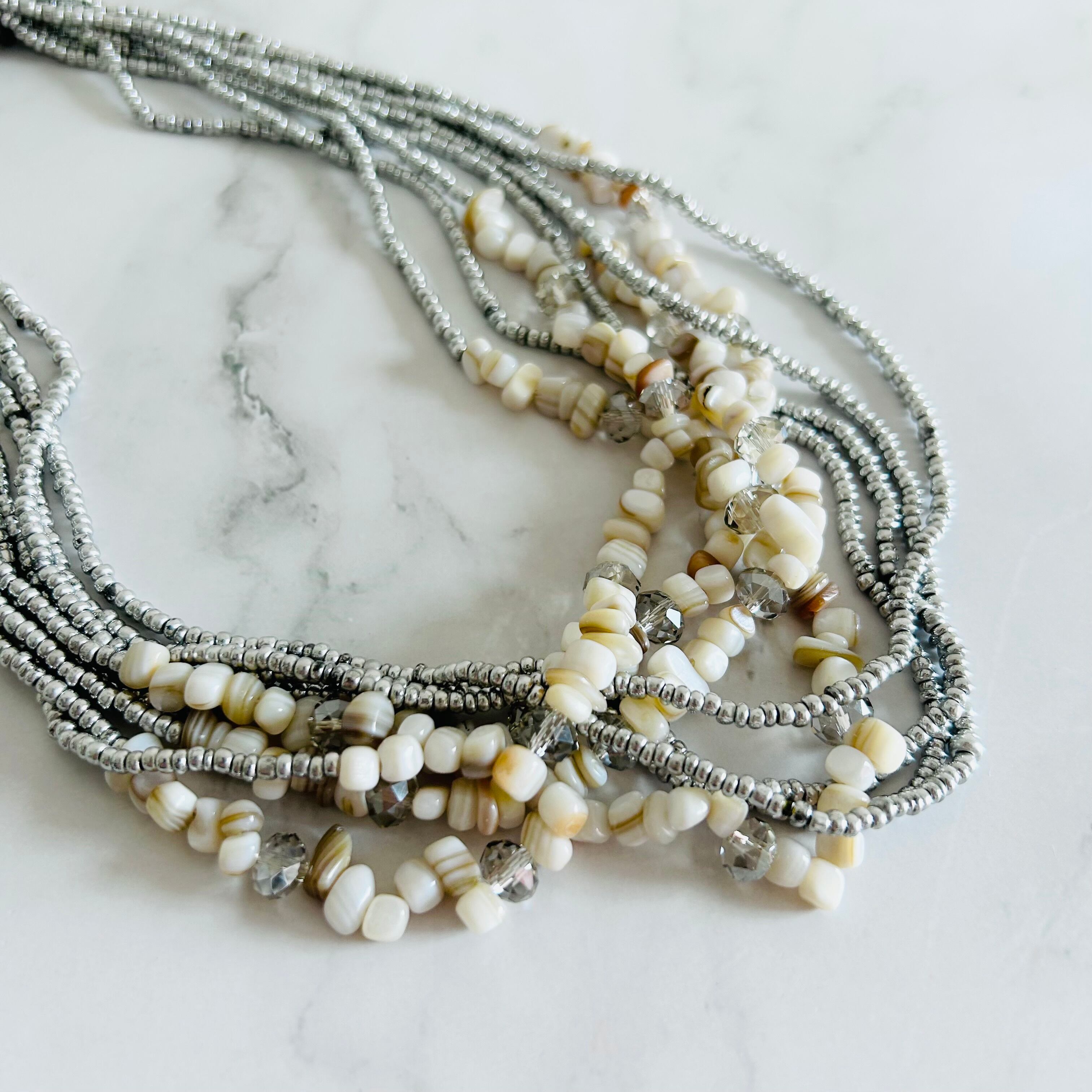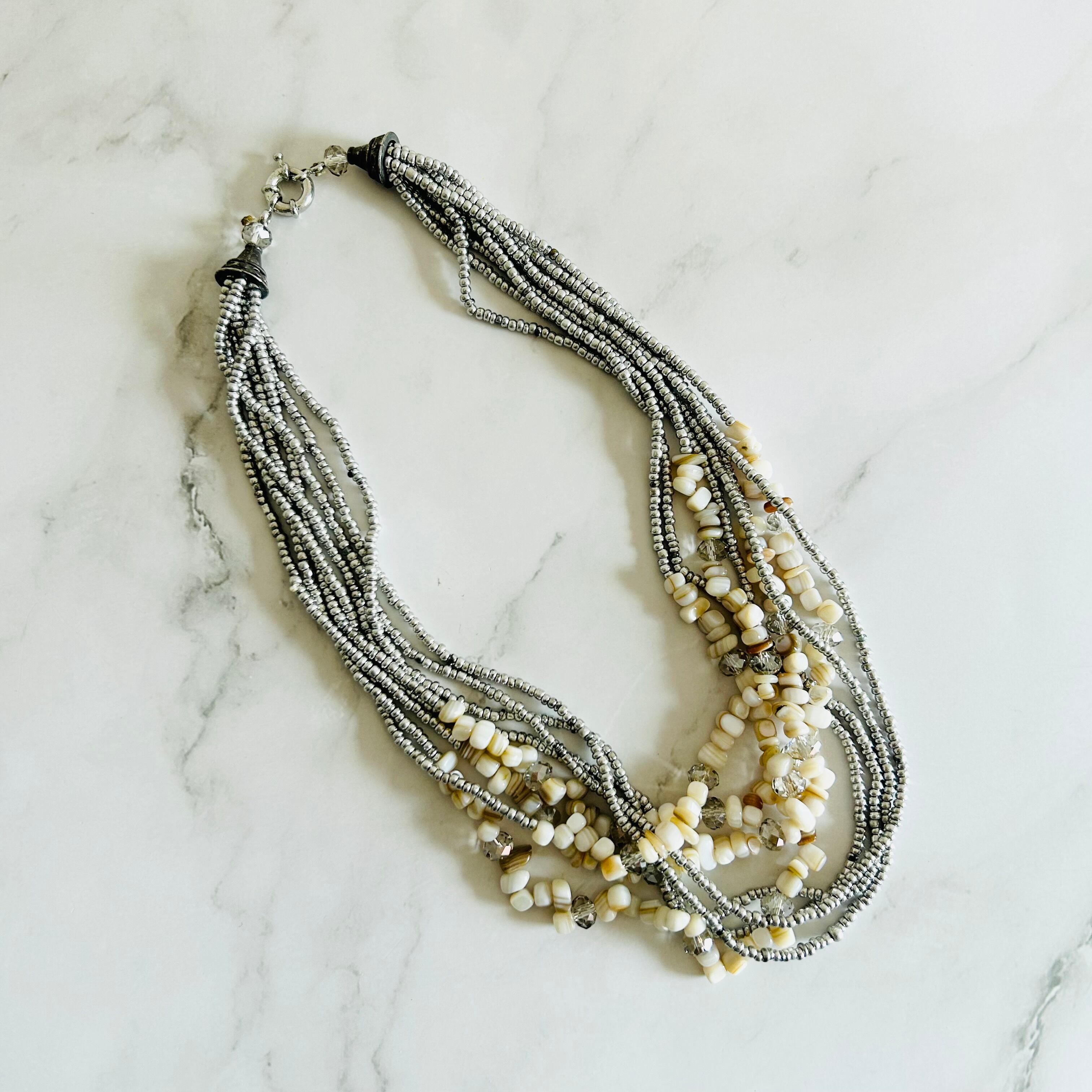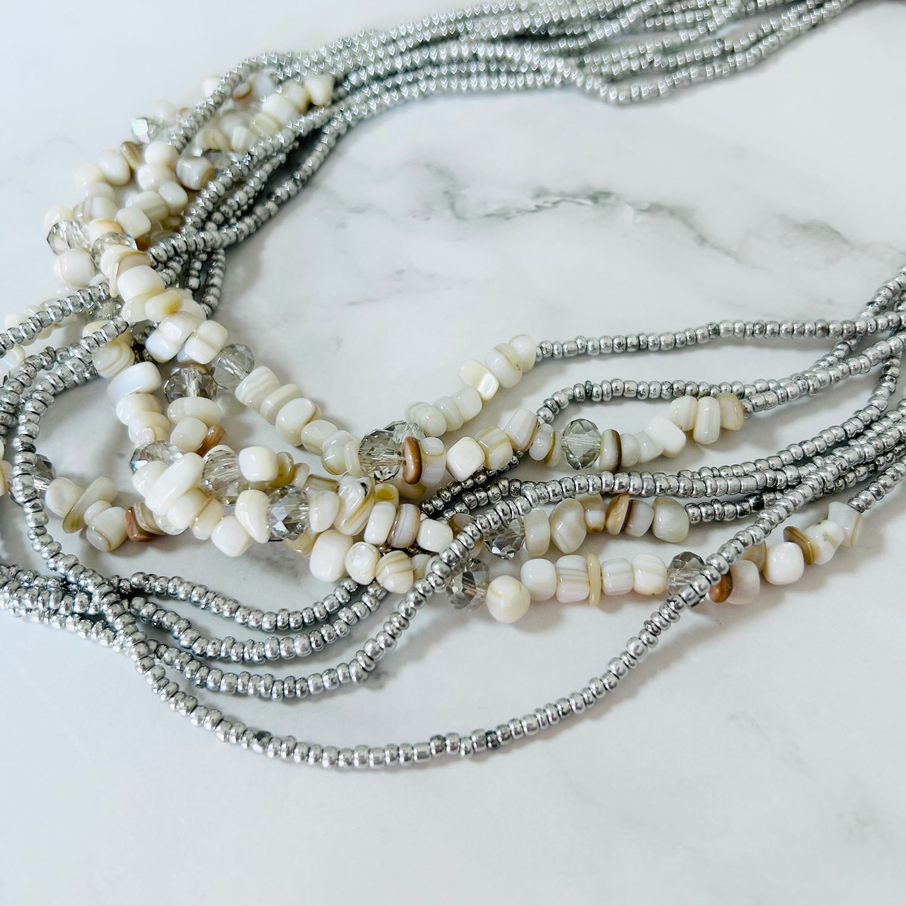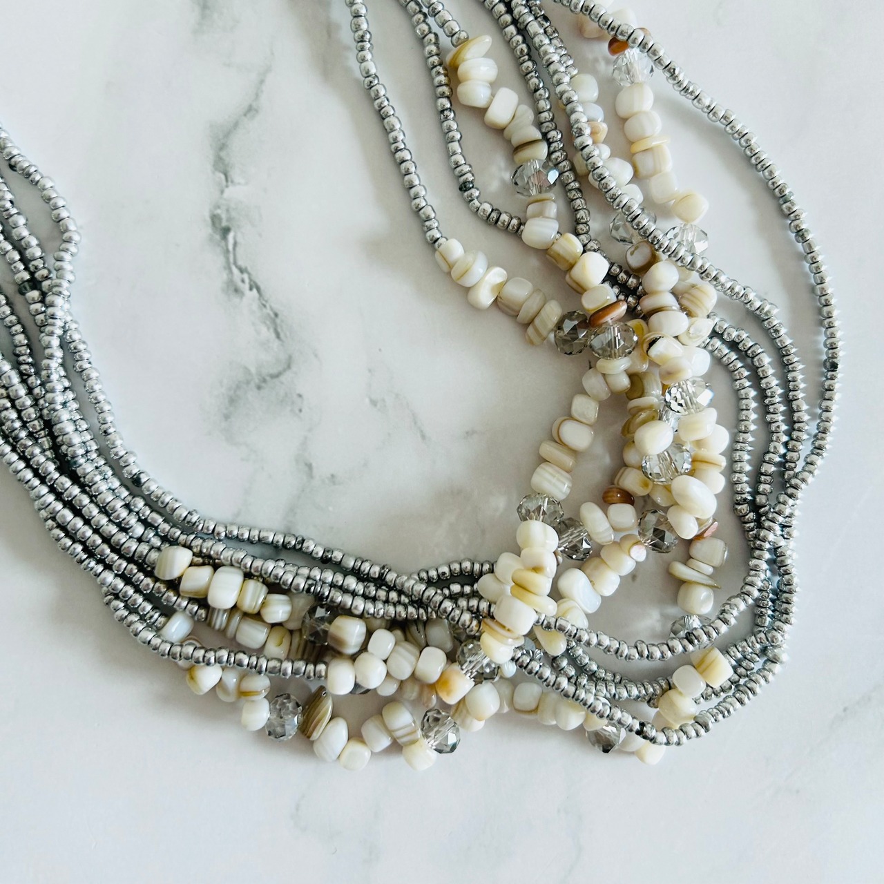 ナチュラルホワイト、メタリックシルバーカラー✖️アンティークシルバーカラーのネックレスです。