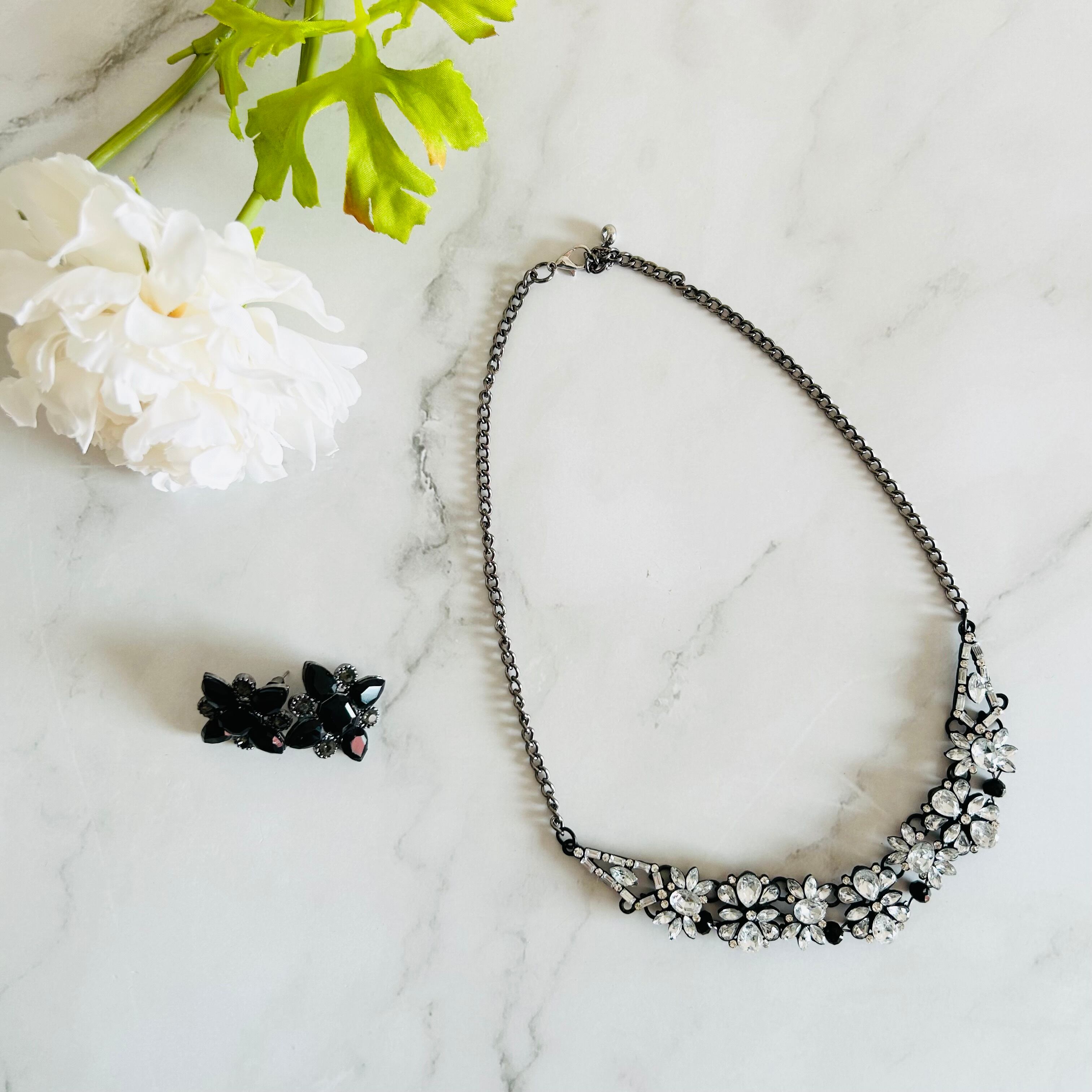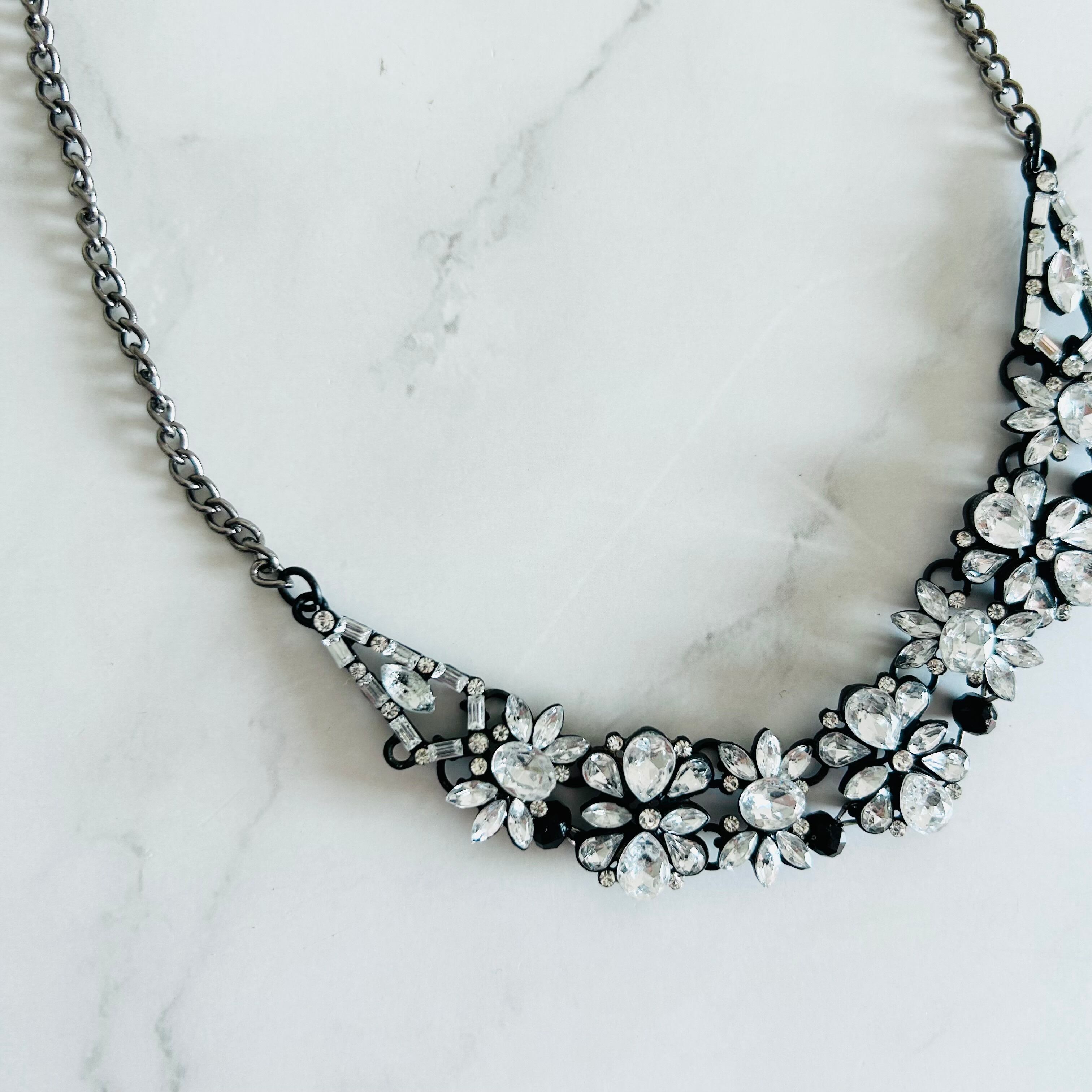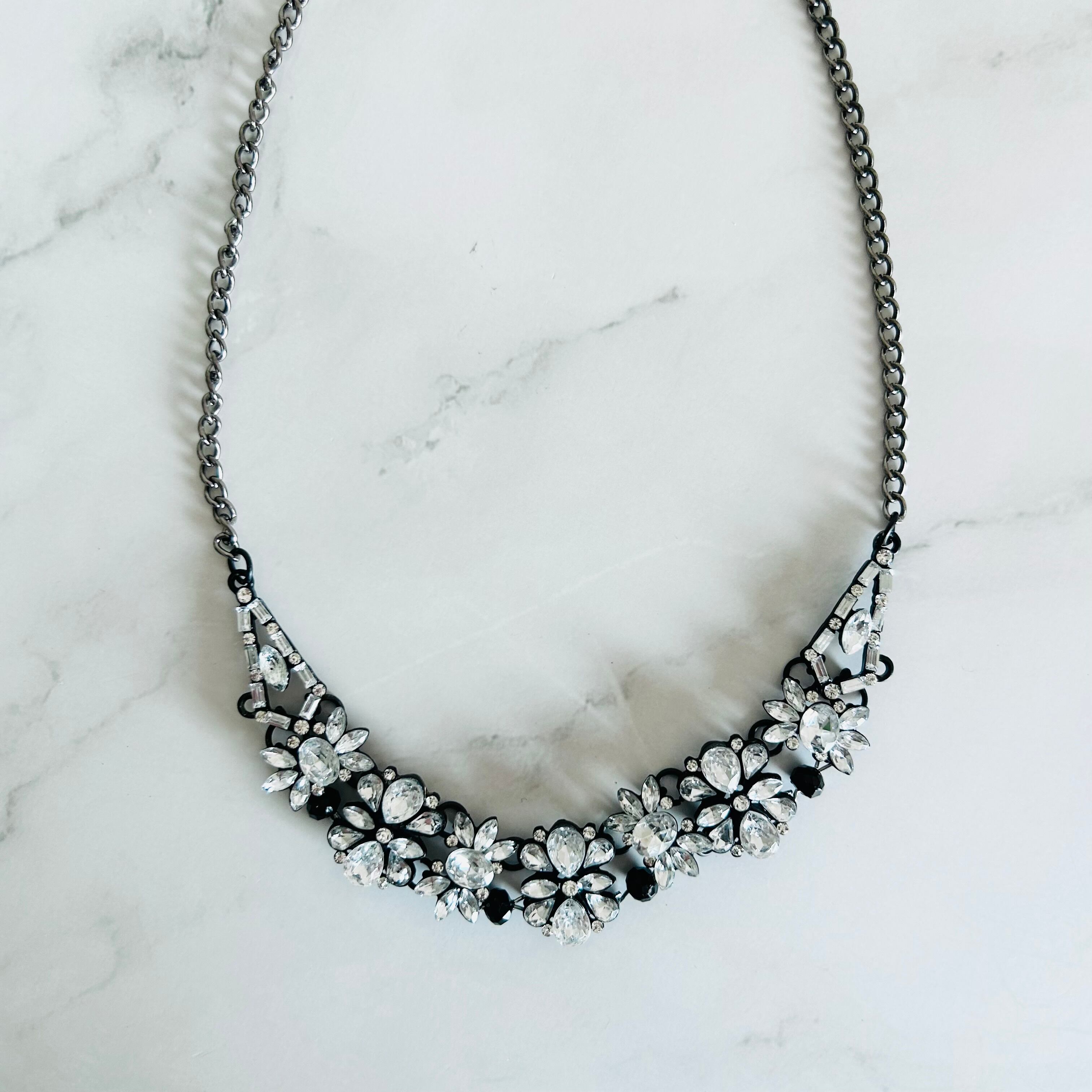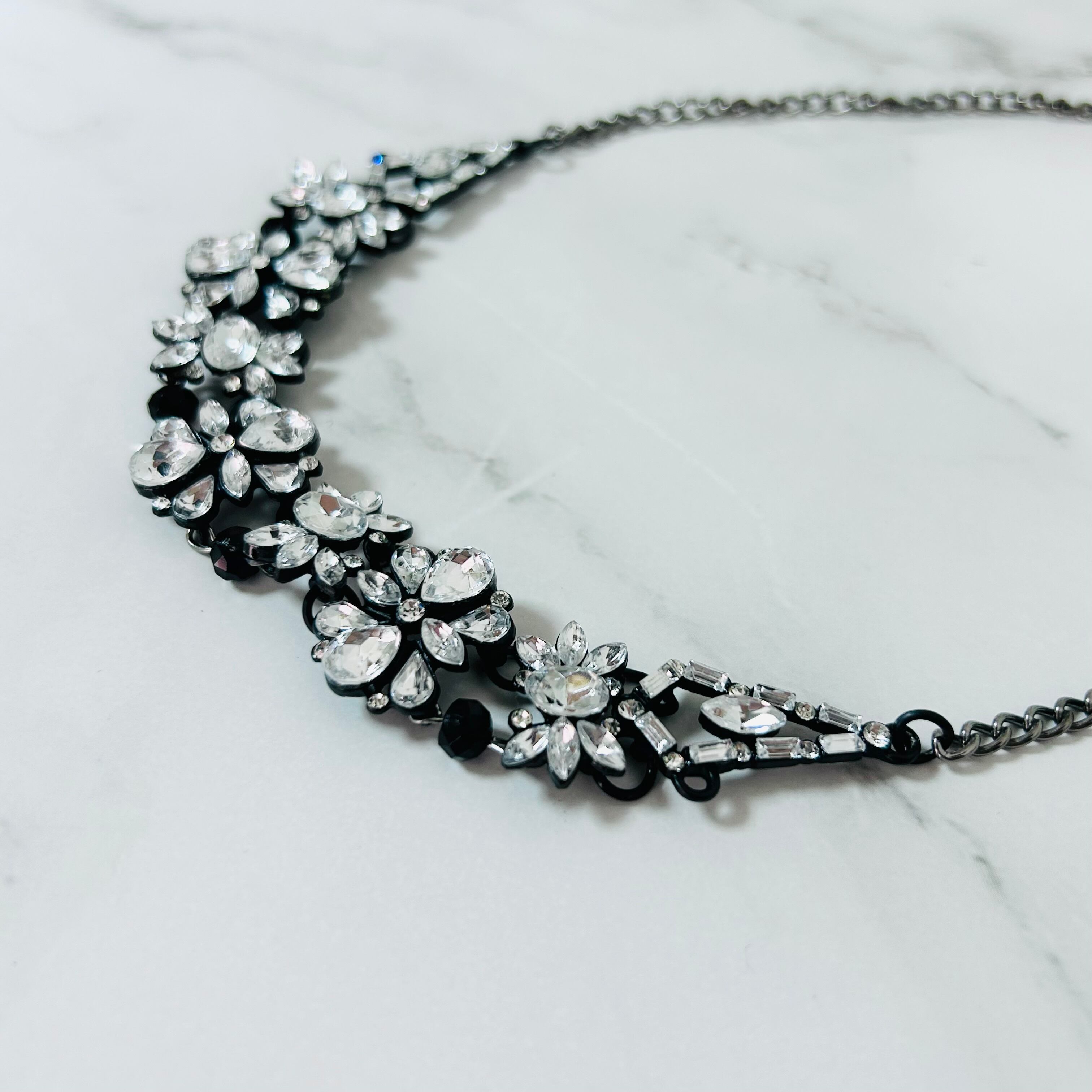 アクリル素材の華やかなクリスタルカラーのビジューで作られたフラワーモチーフのパーツをブラックのチェーンで組み合わせ、コントラストをつけたデザインです。