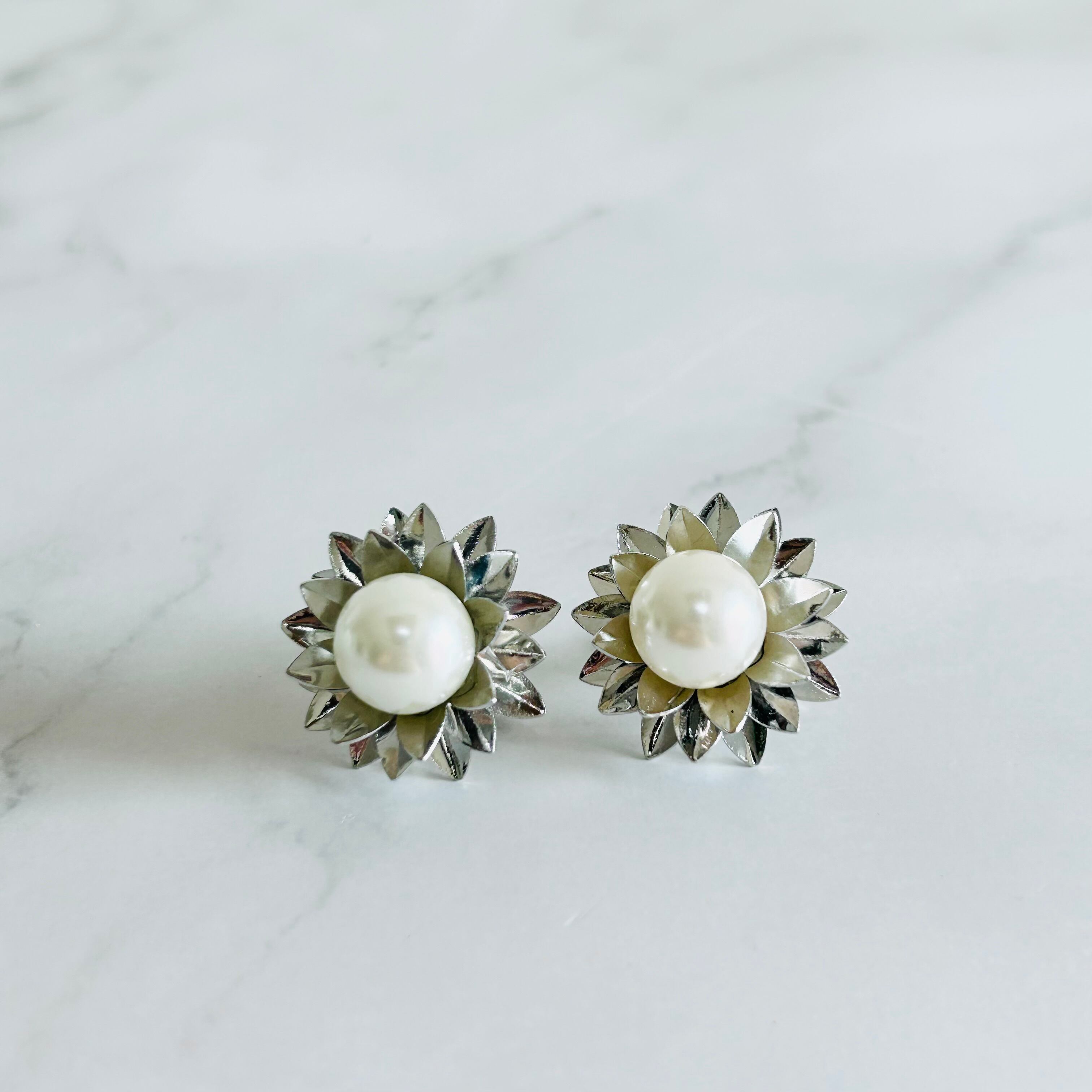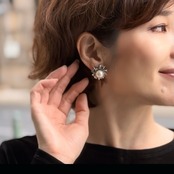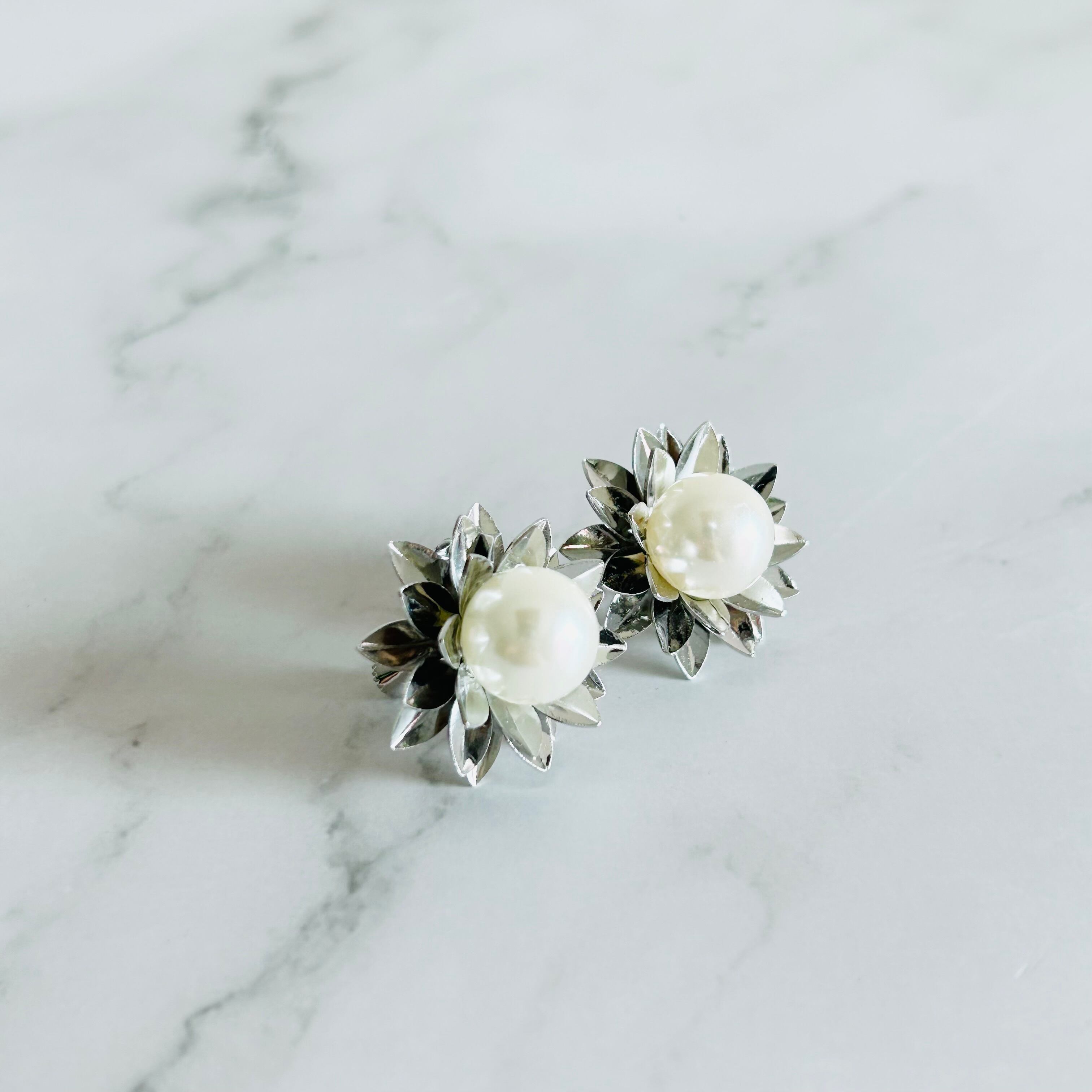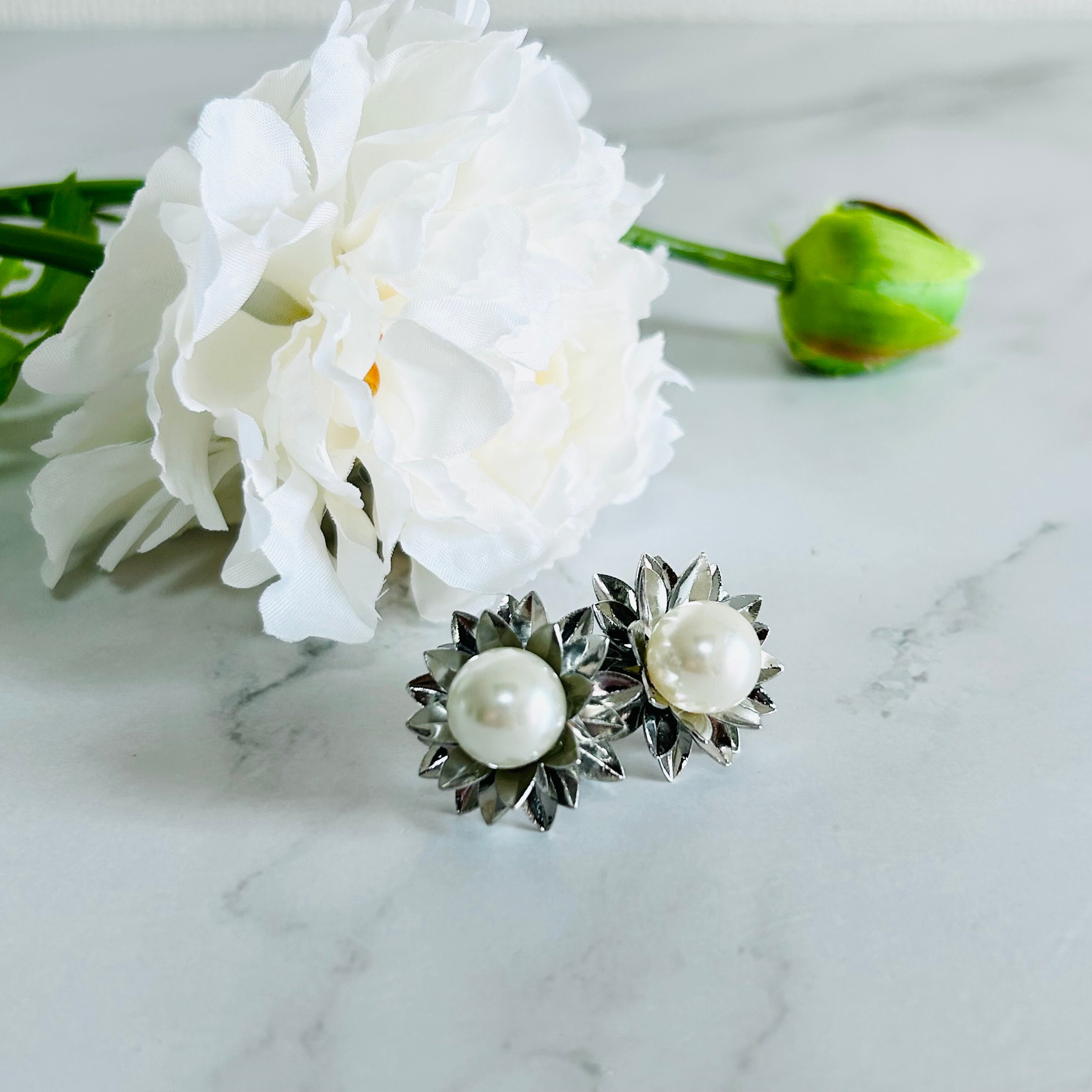 フラワーモチーフのパーツに大粒のパールをあしらった大人可愛いデザインです。