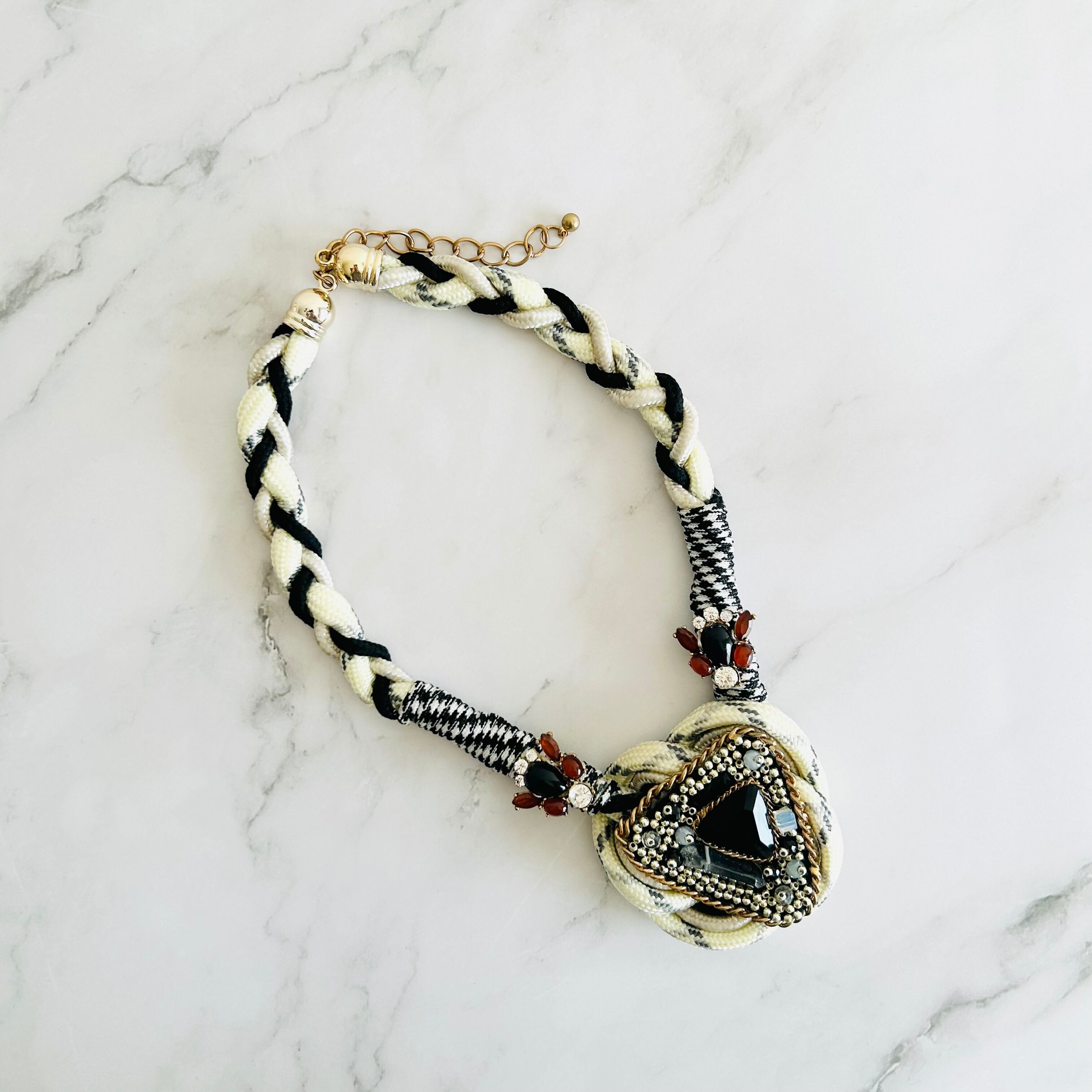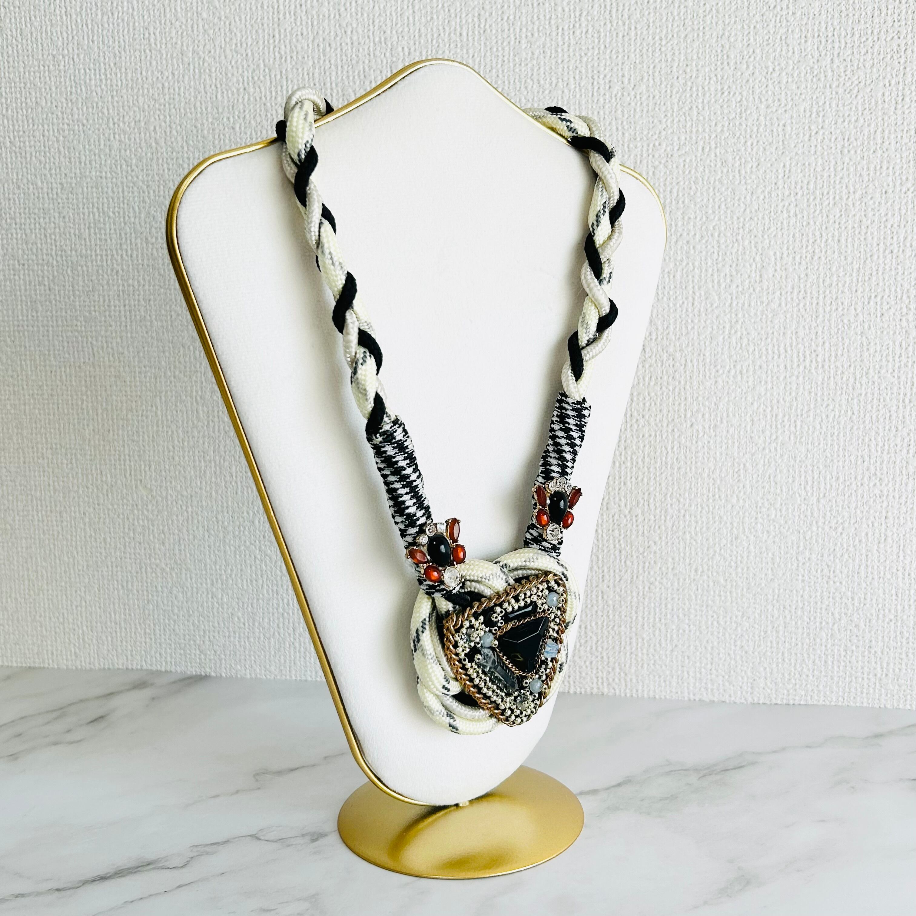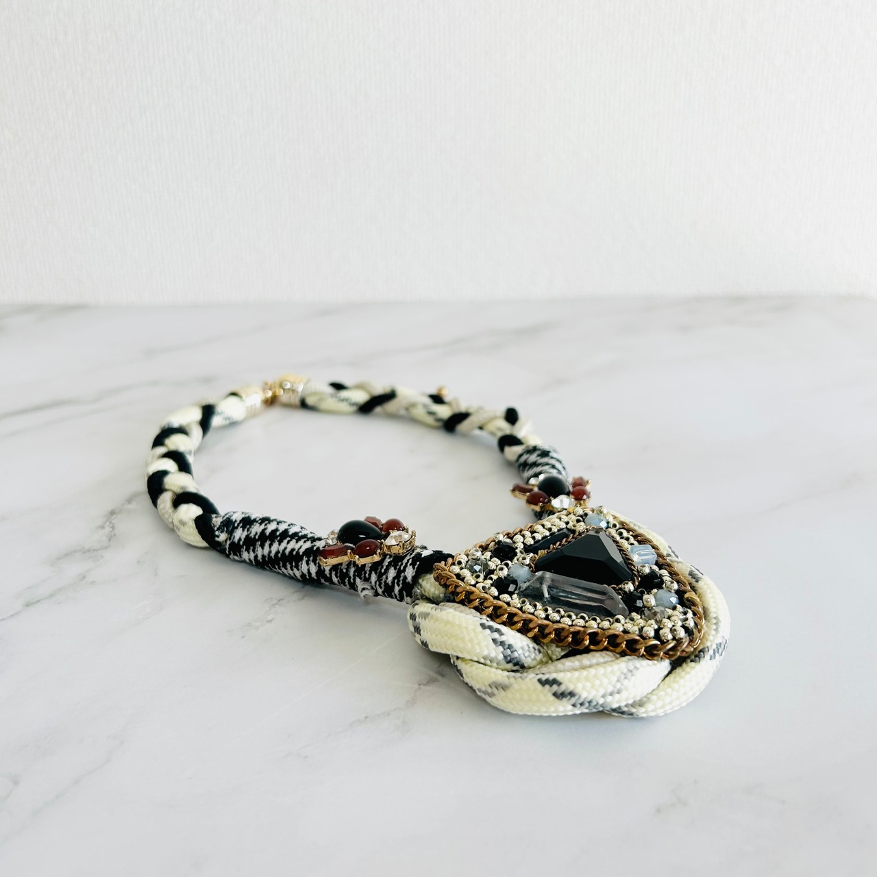 モノトーンカラーのコードを編みこみ、ユニークなモチーフをプラスした目を惹くデザインです。